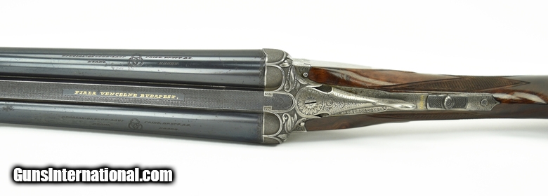 Description: Fiala Arms Side by Side 16 Gauge shotgun. Very fine Hungarian made box lock ejector gun marked “Fiala Vencelne Budapest”. Has 30” full/modified barrels with 2 ¾” chambers. Excellent bores. The scalloped receiver is finely engraved with rose and scroll and has a coin finish, the trigger guard has a gold inlaid monogram. The gun has double triggers, auto ejectors and side clips. The straight stock and splinter forend are of deluxe figured walnut, expertly refinished. LOP is 14 ½” over a thin pad. A light sleek bird gun in near excellent condition. SOLD |