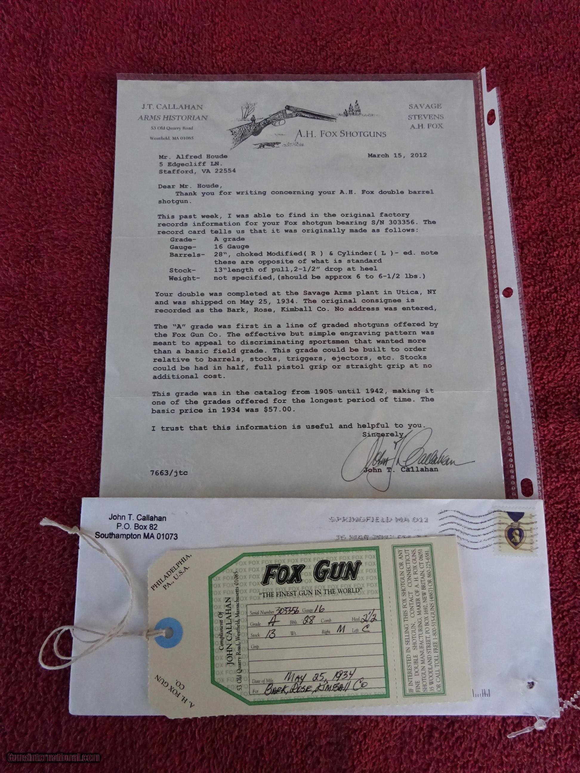 A H FOX A GRADE 16 GAUGE - WITH INTERESTING LETTER