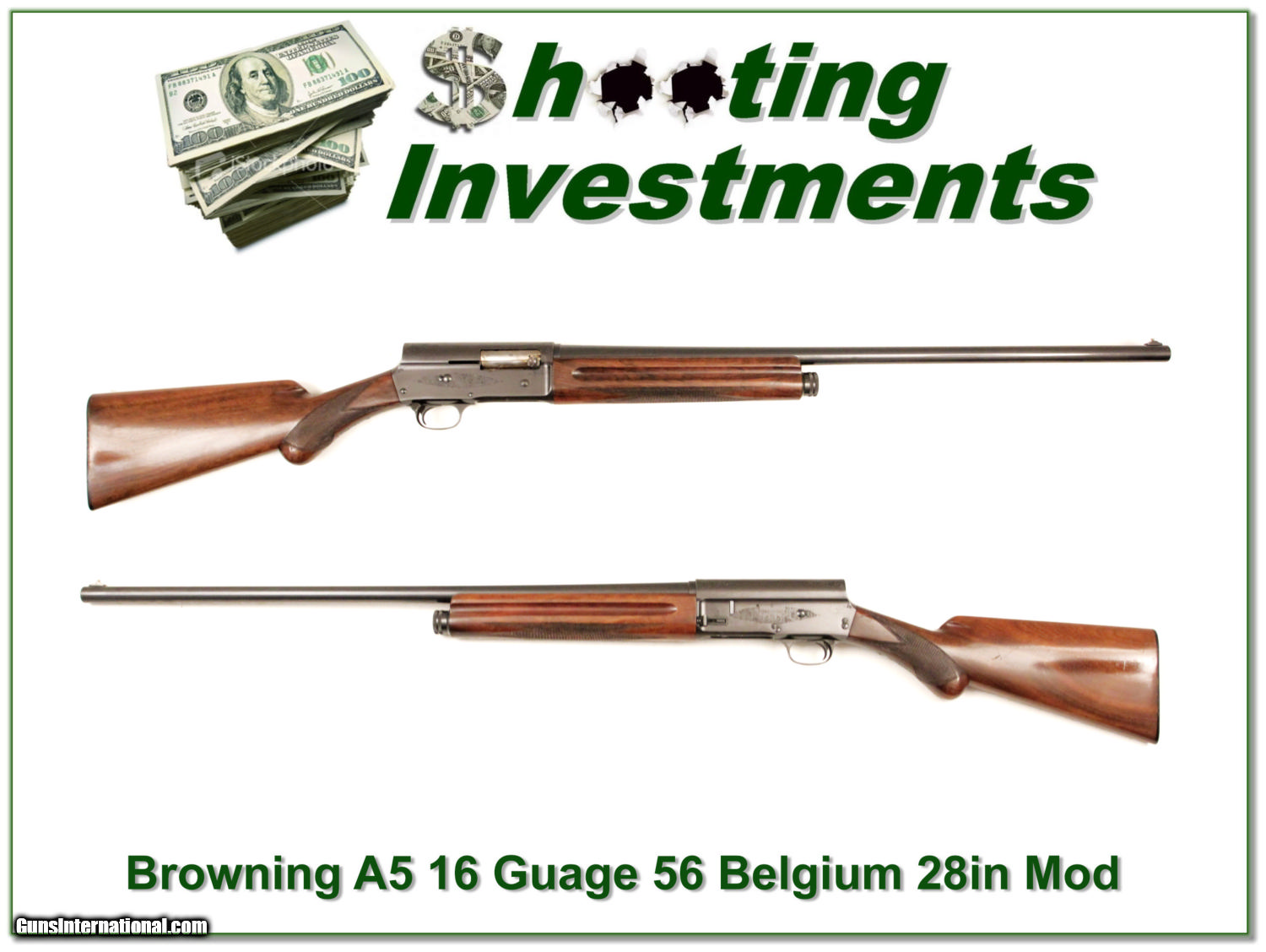 Description: This is Browning A5 16 Gauge. It was made in Belgium in 1956 and is in excellent condition with only light use. The barrel is a 28in Modified. This is one you can use yet still expect to increase in value over time. That makes it a real Shooting Investment. Shipping and insurance is $35 and only $15 more if you want it shipped in a new Plano hard case. (I now consign quality firearms only 10%! Let me know if you have any you would like to sell!) [15-1218] Payment: Payment is by Money Order, Cashiers Check or Personal Check. I can now also accept MasterCard and Visa with a 3% convenience fee. PayPal can be used for some items but never firearms. Please let us know if you would like to pay via PayPal. Shipping: The shipping charge will be listed in each description. It is $35 for most guns. Some heavy guns or those insured for over $2000 will be higher. Shipments to Alaska and Hawaii are higher because air shipment is required. Most firearms are shipped within 5 days of receipt of payment. We prefer shipping at the beginning of the week to avoid firearms in transit over weekends. We package all shipments carefully and insure them for the full purchase price, rounded up to the next $100. In the unlikely event that damage occurs, it is important that you save all packaging material for the claims process. Optics are shipped Priority Mail and most other non-firearm shipments are shipped First Class. Returns: Our return policy is simple. If for any reason you are not pleased with your purchase, you may return your item for a refund. The only exception is ammunition, it cannot be returned. It is important to us that you are happy. Guns cannot be fired or dissembled before returning them and must be returned in the same condition as received. Notification of a return must occur with-in 3 days of receipt at your dealer. Shipping, convenience and dealer fees are not refundable and are the responsibility of the buyer. Lay-a-way: If needed, we offer a 60 day lay-a-way option on most firearms. It is 1/3 now, 1/3 in 30 days and 1/3 in 60 days. Lay-a-way firearm sales are final. Consigning your firearms with Shooting Investments: We will help you get top dollar for your firearms. While most local guns shops charge 20% or more, our fee is only 10% with a minimum of $50. At your local gun shop it might take months to sell. Selling on-line provides instant access to thousands of interested buyers. You won’t find any other on-line dealer willing to sell your firearms for only 10% or listing every gun on 4 separate s. Selling through an House typically costs the seller 15% and the buyer an addition 15% (so 30%) and you have to wait several months to sell and longer to receive funds. If properly priced, we will sell your firearms in a week or two. Send us an email or give us a call and we’ll explain how easy it is for you to get top dollar. Trading: We collect guns and usually just trade for guns we want to add to our collections. We often sell guns for others wanting to purchase one of ours. We find this the most fair to both of us. Our Commission is only 10% and we hold the gun you want until yours sells. Please contact us if you want to sell one of yours to buy one of ours. Help for California Buyers: We are happy to ship to California. It is the buyer’s responsibility to make sure any item you buy is legal in your state. We are also happy to help with your purchase of a firearm from someone other than us. If you see a gun you would like to buy but the seller can’t or won’t ship to California we can help. You buy the gun and have it shipped to us. We’ll then ship it to your California dealer. The cost for this service is only $30 + shipping. Let me know if we can help! SOLD |