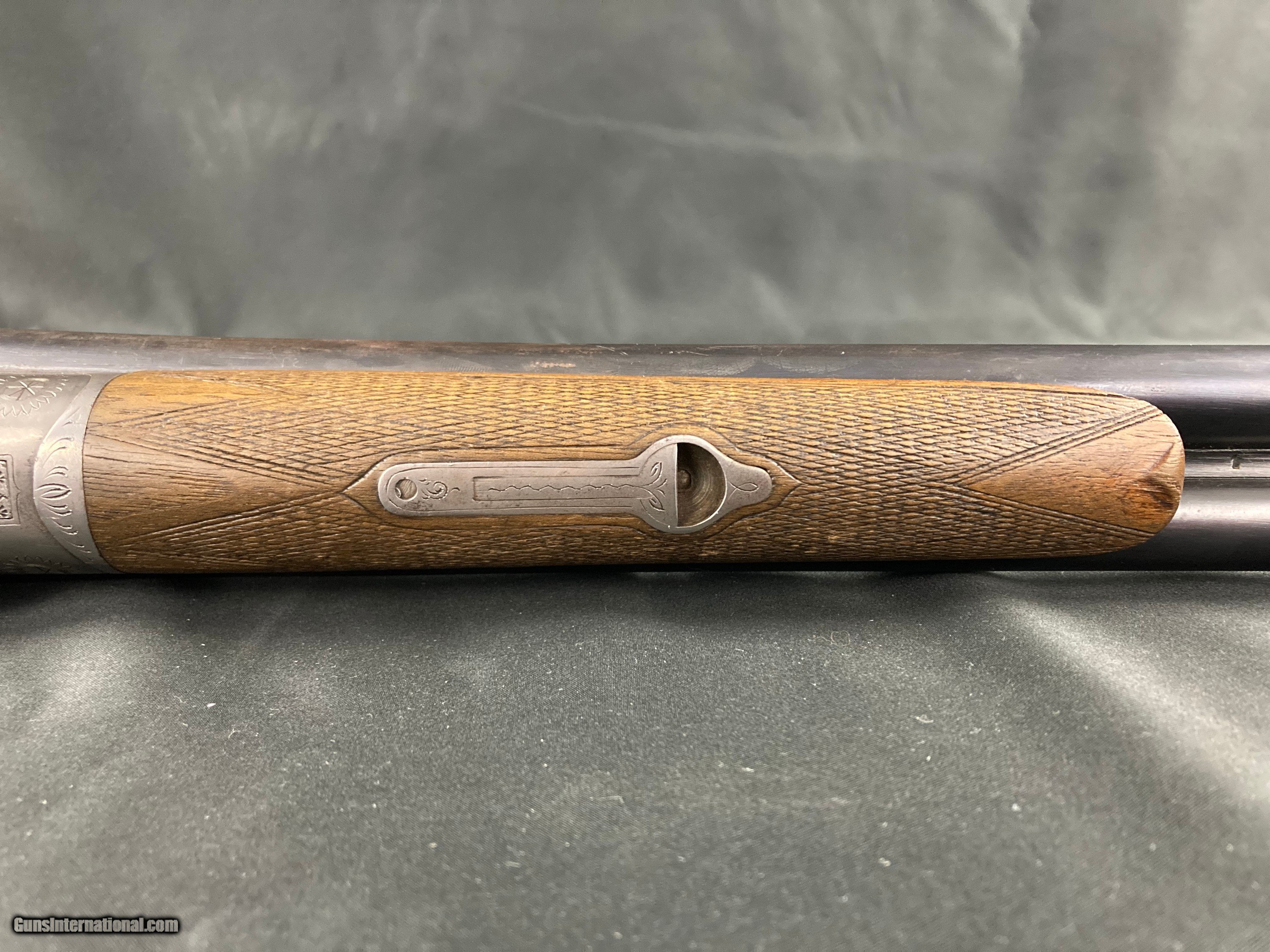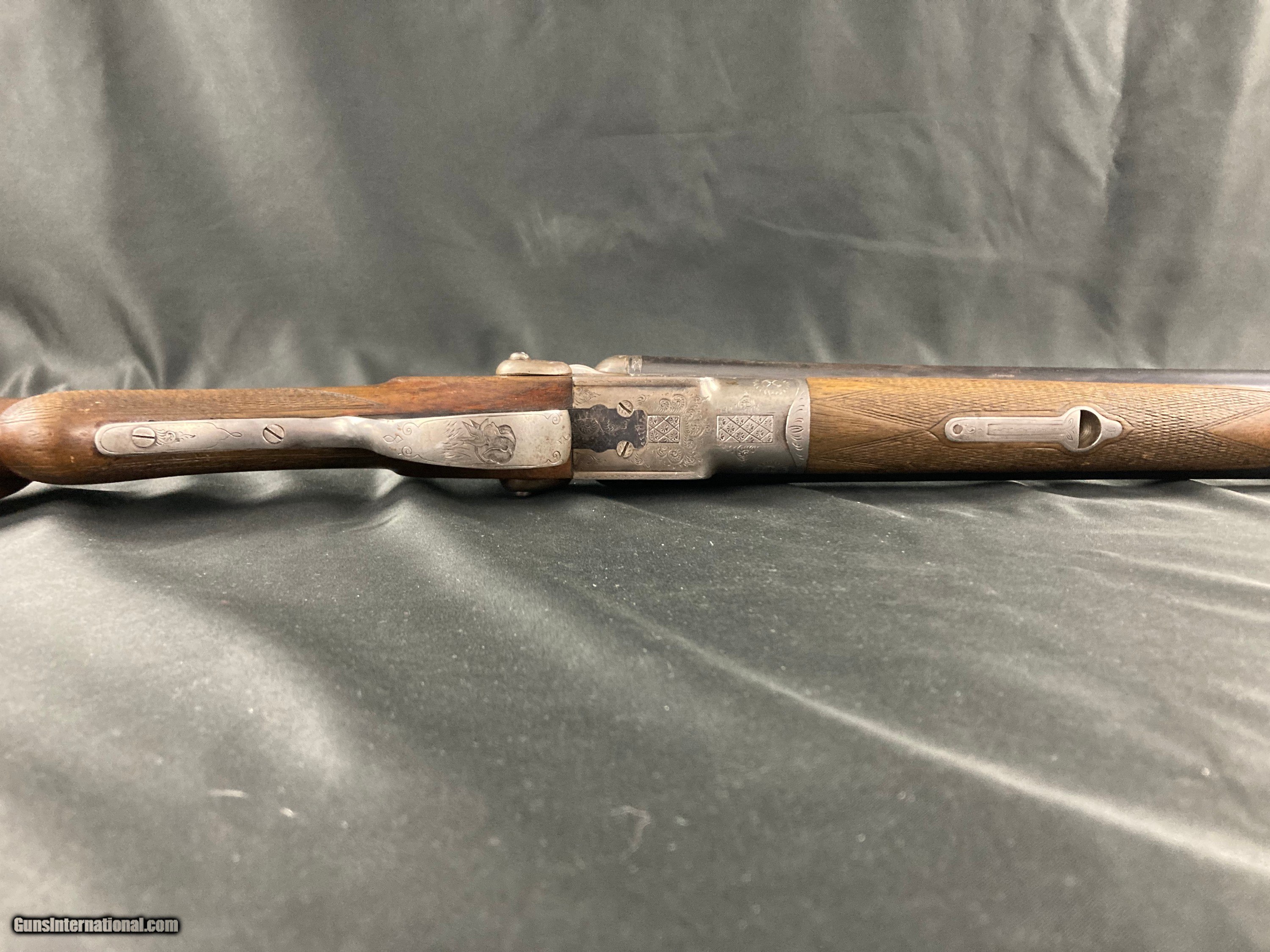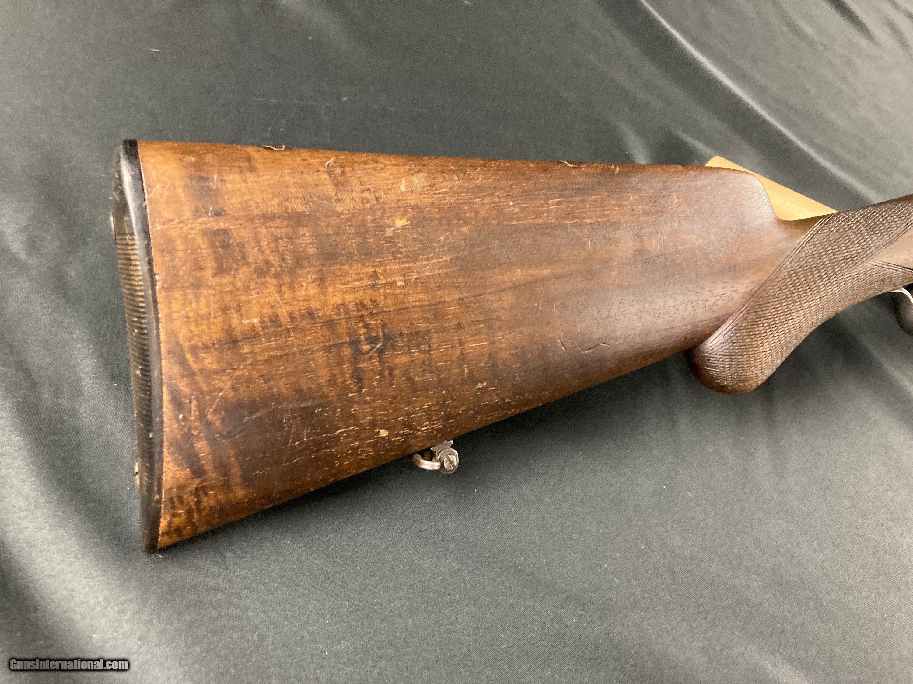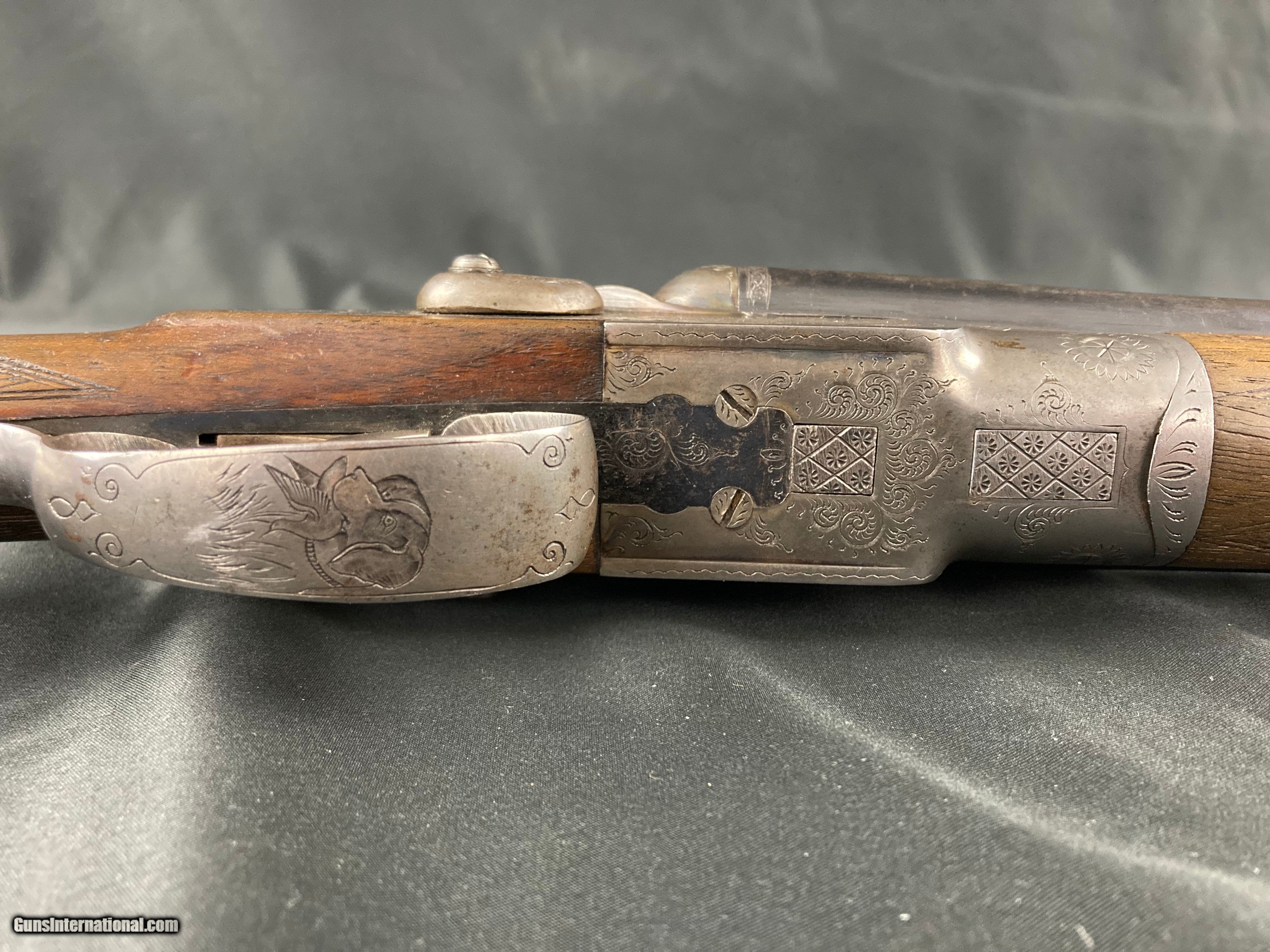 Description: Short chambers, hammers, Fluid steel barrels have been cut to 27”, double tiggers, extractors, cheekpiece for right hand shooter, original buttplate, 14” length of pull, original swivels, tight action, excellent wood around the sideplates, engraving with game scenes, matching numbers, a ding in the left barrel, the stock comb has been professionally added ($25 shipping) SOLD Shotgun Gauge: 16 Gauge |