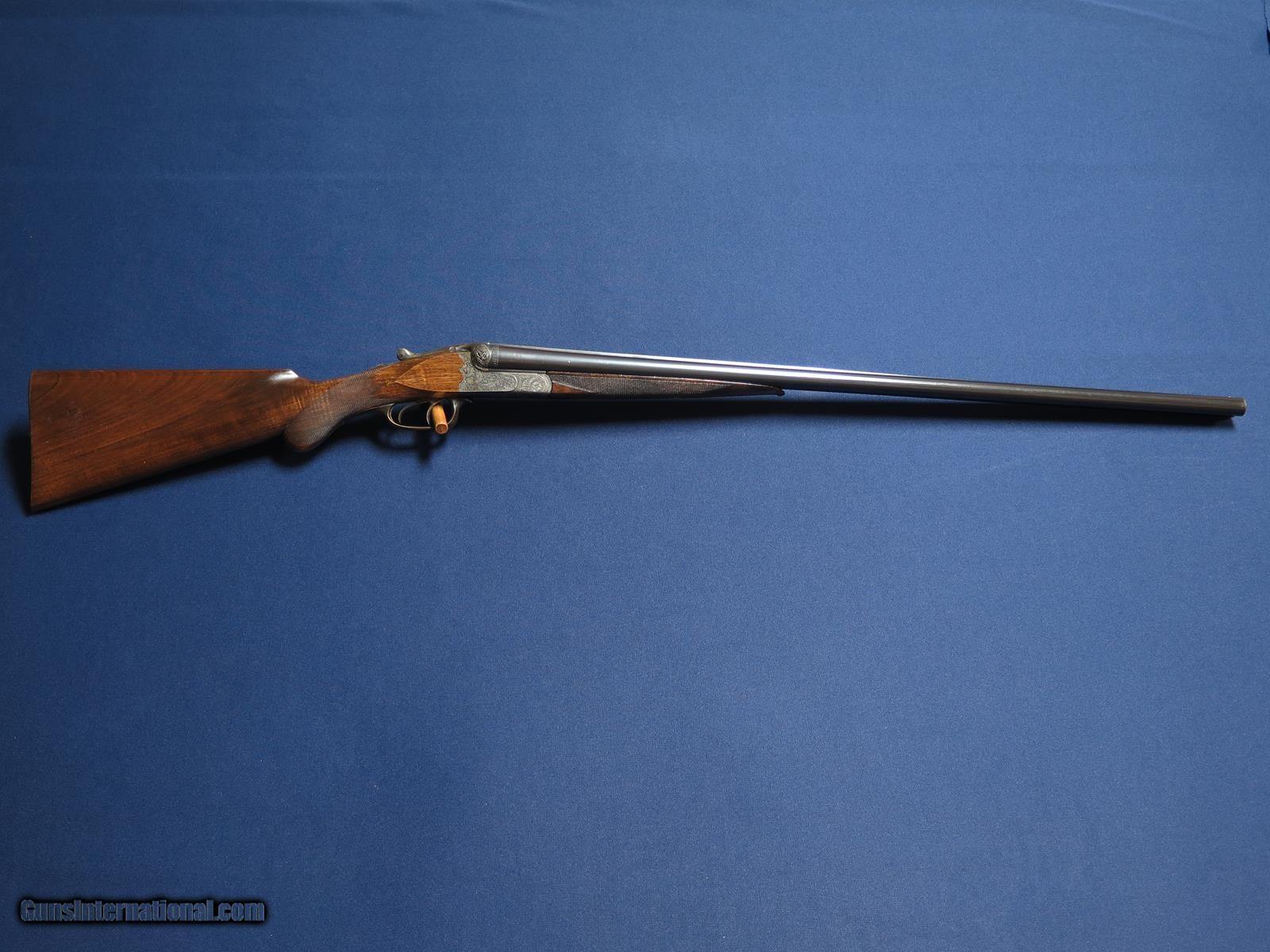 Description: German SXS game scene engraved 16ga. Scalloped boxlock. 30 inch Imp Mod and extra full. .028 & .040. Double triggers. Automatic ejectors. Horn trigger guard. 2 9/16 chambers. 14 3/4 LOP checkered butt. Excellent bore and condition. SOLD |