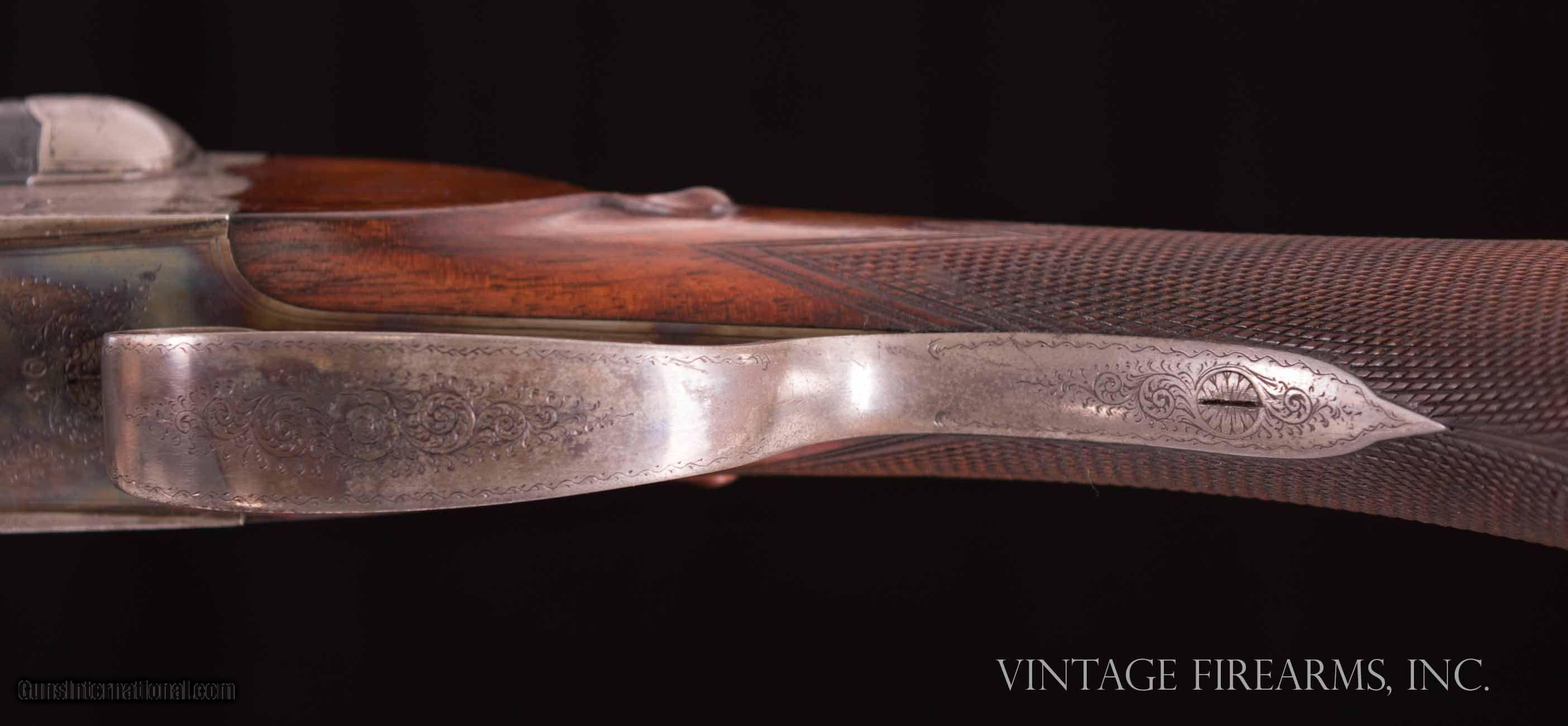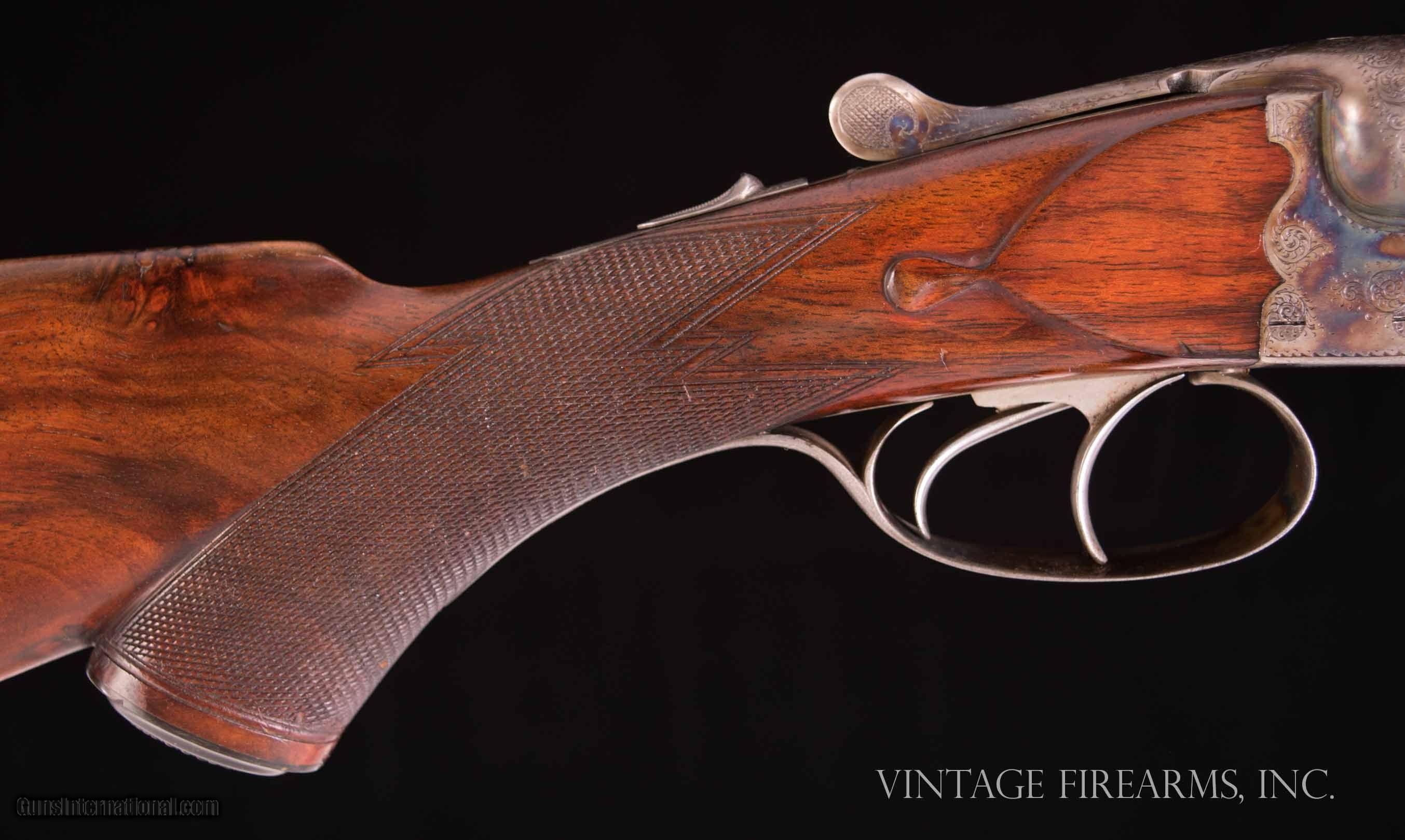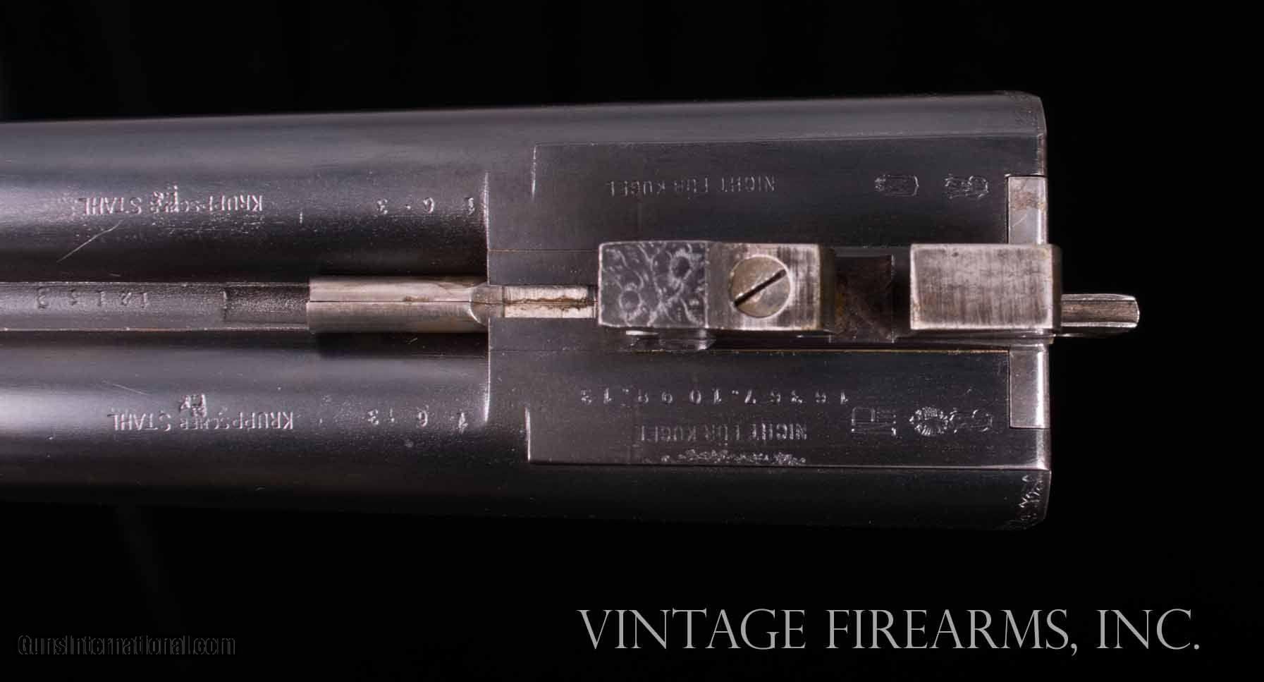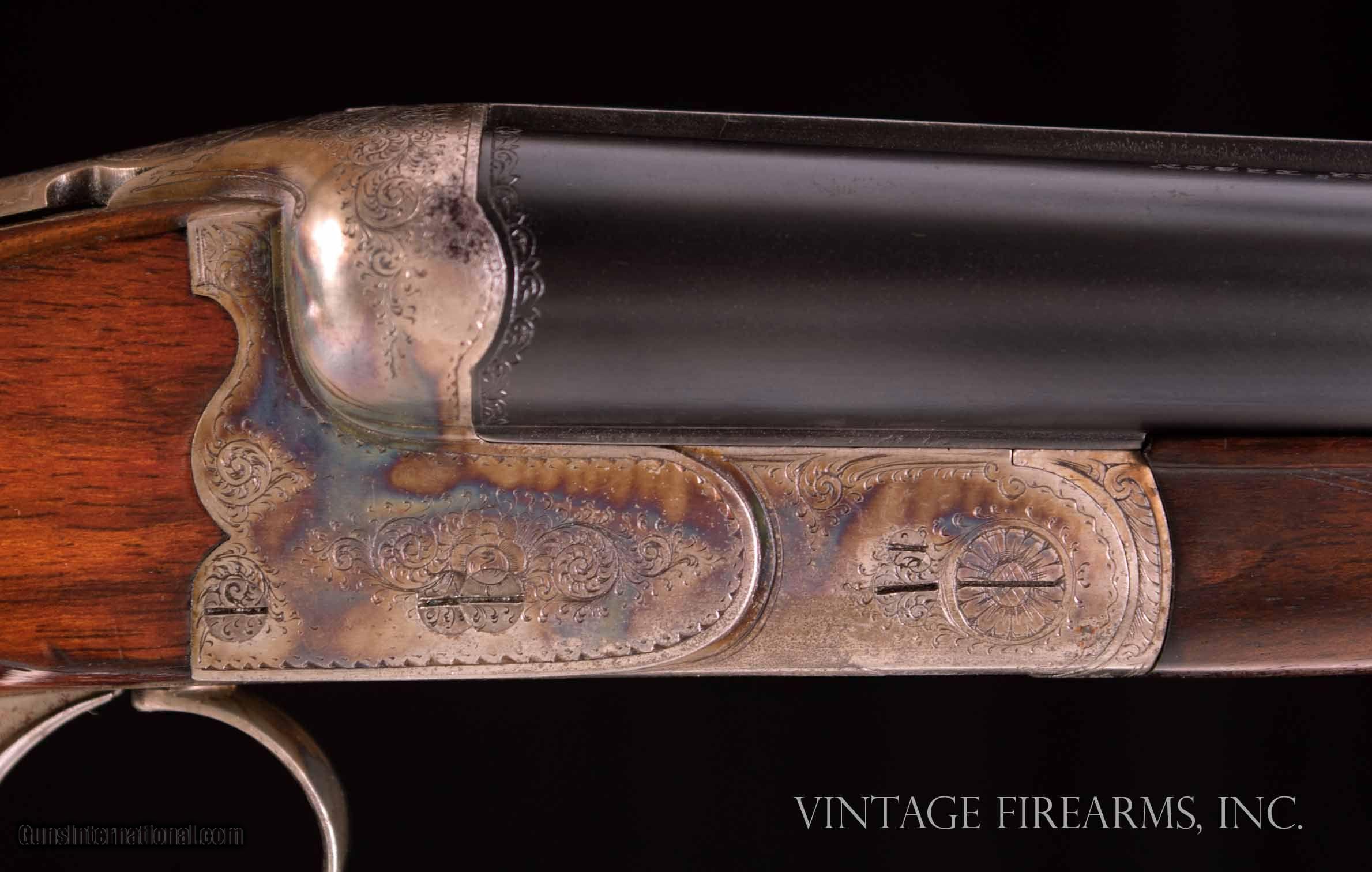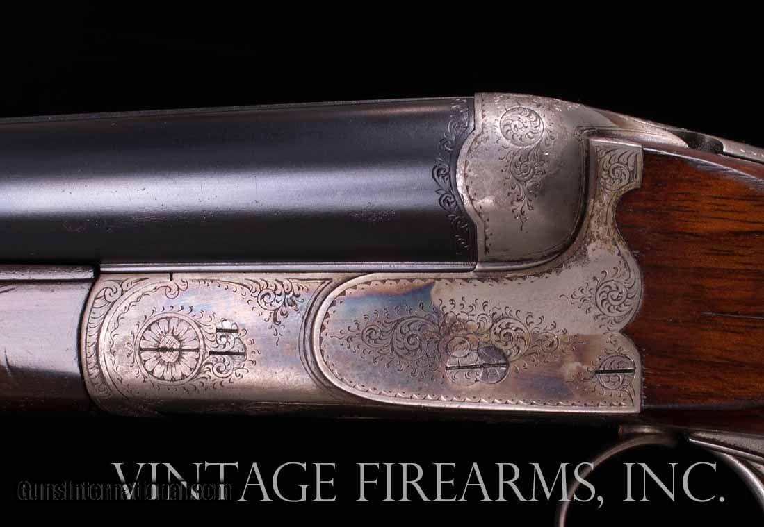 Description: Johann Springer 16 Bore Side by Side FINEST OF AUSTRIAN SHOTGUNS, 5LBS. 11OZ., GORGEOUS! **REDUCED PRICE*** General Specs: Johann Springer, Year 1913, 16 Gauge, 5lbs 11oz, SxS Serial Number: 1098.13 Joh. Springer is one of the finest names in Continental sporting arms creating their masterpieces in Austria's famed gun center near Vienna since 1855. Purveyors of their fine firearms to the Emperor of Austria, the royal families of Monaco, Archduke Ferdinand, and many other elite sporting figures throughout Europe and Russia, the rifles and shotguns produced by Springer had no equals. This fine, delicate boxlock ejector gun, sn1098.13 built in 1913, is a gorgeous little European double with all the finest features and tons of original case color and condition. The action has a fancy scalloped back side, rebated frame to hold the head of the stock in place, finely sculpted reinforcing bolsters on the bottom of the frame, fine English style rose and scroll engraving, near perfect screws, 85% vivid case colors, crisp double triggers, strong well-timed ejectors, everything in perfect mechanical order. This action is overbuilt to perfection, with 5 locking mechanisms- Greener style cross-bolt, double underlug bolts, sideclips, and barrel lug protruding through the action bottom. Each one of these mechanisms prevents movement of the barrel flats and breech face on the receiver, minimizing wear and costly future repairs. The barrels are tight on the hinge pin and breech face like a new gun, with the lever centered. The long, graceful, 29” Krupp steel barrels are in perfect condition, with mirror shiny bores, no dents or dings, choked LM/M with nice wall thicknesses and 99% blue. The wood is supremely inletted to the stock, with all the graceful curves, sharp drop points, and finely cut checkering. There are no splits or repairs. Just look at the inletting around the forend tip and the action and realize there are few humans alive today that can perform this kind of workmanship. Weighing just 5lbs. 11oz. it is a delight in hand and moves with little effort. This is an extraordinary upland gun that will do well as you practice on clay targets as well. Priced to sell, this is a lot of gun for the money from a preeminent Austrian gunmaker built in the heyday of the side x side shotgun. Thanks for looking! Barrels Barrel Length: 29" Chokes: .014/.018 LM/M Bores: mirror Bore Diameter: .660/.662 Wall Thickness: .022/.023 % Blue: 99% Chambers: 2 3/4" Ribs: tight Sights: single Action Action: tight Ejectors or Extractors: ejectors, well timed Case Color: 90% Screws: excellent Engraving: fine english rose and scroll; 50% coverage Trigger Type: double, crisp Trigger Guard Color: 85% case color Stock Type: capped pistol grip/splinter forend/cheek piece LOP: 13 3/4" LOP To End Of Wood: 13" DAH: 2 1/2" DAC: 1 1/2" Cast: 0 Checkering Condition: excellent Butt Treatment: solid red pad There are more photos upon request. We offer a 30 day mechanical warranty on this fine shotgun. Call us for full details. PLEASE SEE MY OTHER FINE VINTAGE FIREARMS. Just open one of my ads and click on the line that says “see all items from this seller” and a very nice list of fine sporting and collectible arms will appear. I have many more fine sxs shotguns not yet listed. Thanks for looking! We employ a full time gunsmith on premises and can perform alterations to suit your needs within a few weeks of purchase. Payment Methods: Money Order, Certified Check, Personal Check, Wire Transfer Inspection Period / Return Policy: Three Days from the date the item was received. Sales Tax: 6% Michigan Only Shipping & Insurance: Ground $45.00 We ship internationally! Item Condition: Used Requires FFL?: Yes If you have any questions about this item or payment, please email or call us directly, at #616-292-6240. Thanks! Vintage Firearms Inc We employ a full time gunsmith on premises and can perform alterations to suit your needs within a few weeks of purchase. Common requests are: -stock bending to suit your particular requirements -addition of any specified butt pad to increase length of pull -alteration of chokes to suit your shooting preferences -lengthening of chambers and forcing cones -darkening stock color with penetrating stains -restoring any part of the gun including rust blue, charcoal blue, bone and charcoal case color, wood restoration and checkering recuts. If you like one our guns but it needs "tweaked", let us know and we can quote you a time and price. Some enthusiasts like the guns "as found" and others want them "just so". We often list guns as found and let the particular buyer choose how they want their gun to fit or look. SOLD Curio/Relic: Yes |
