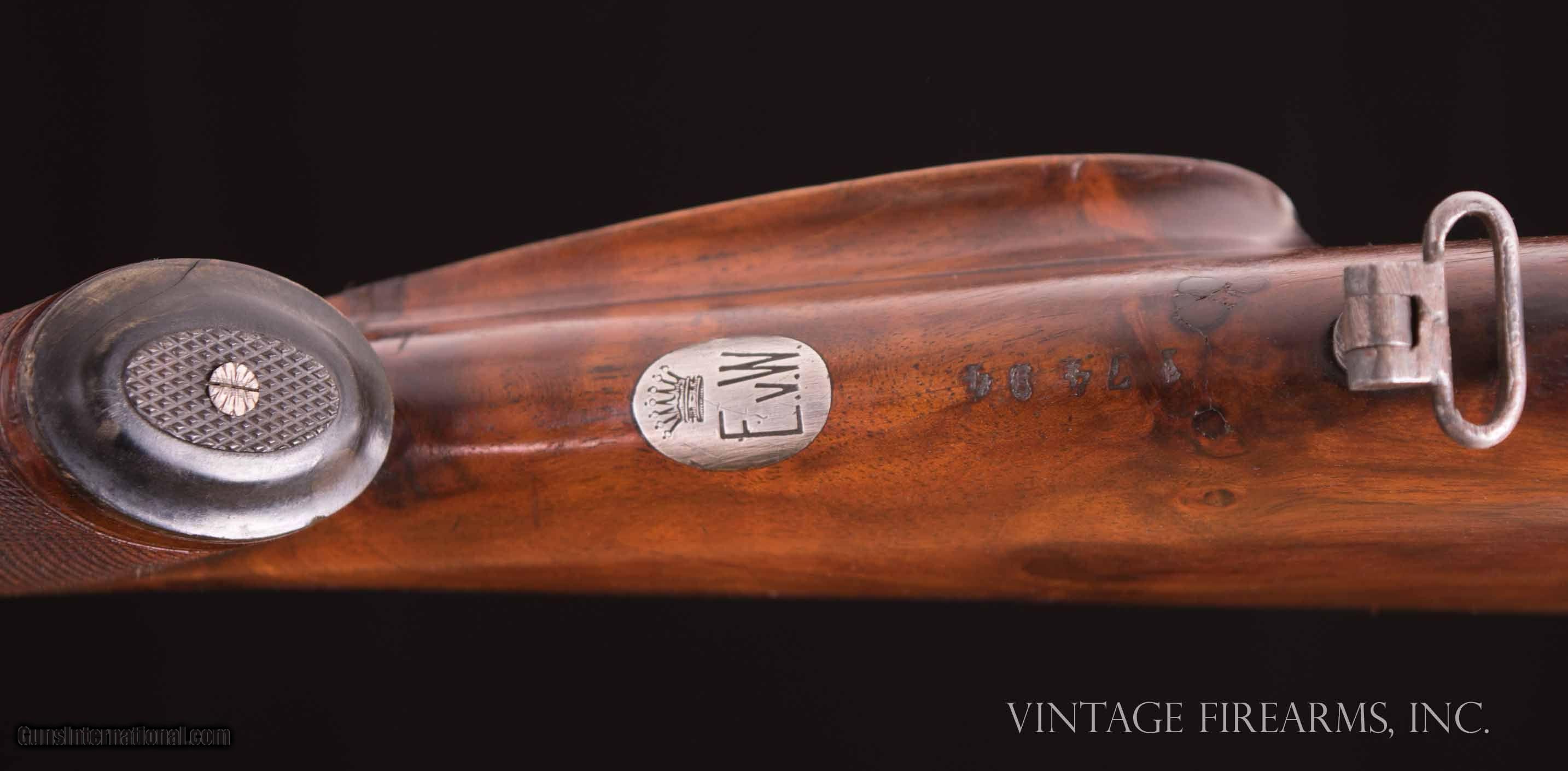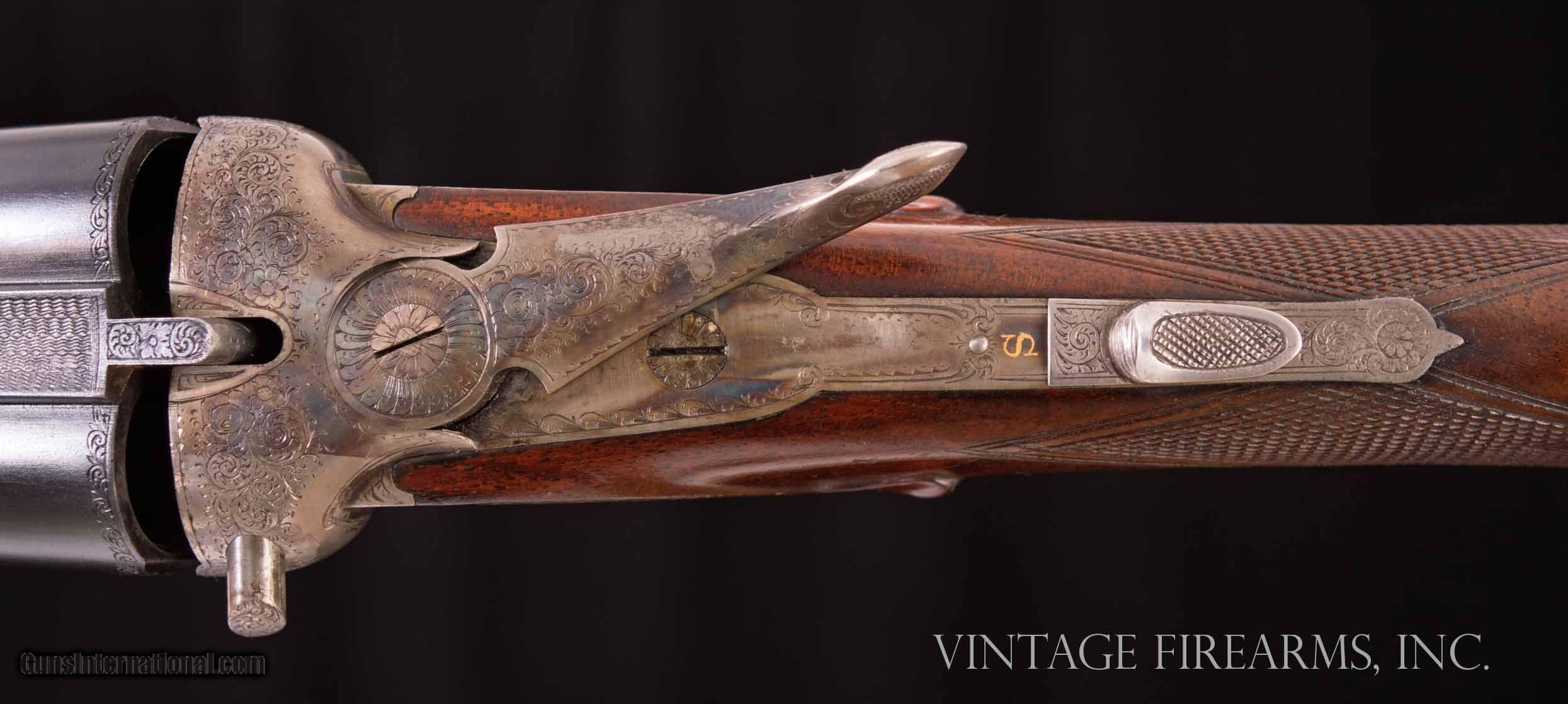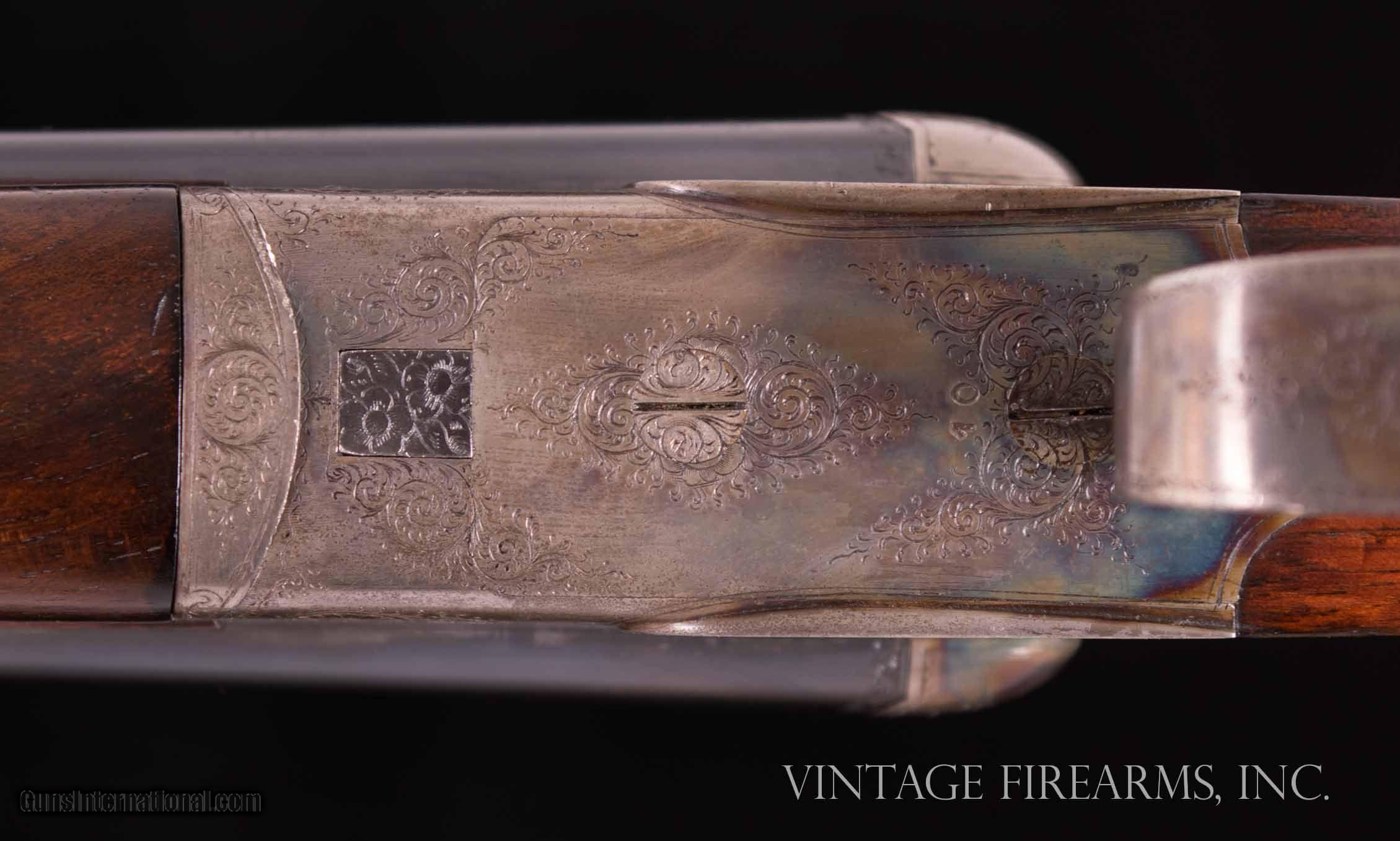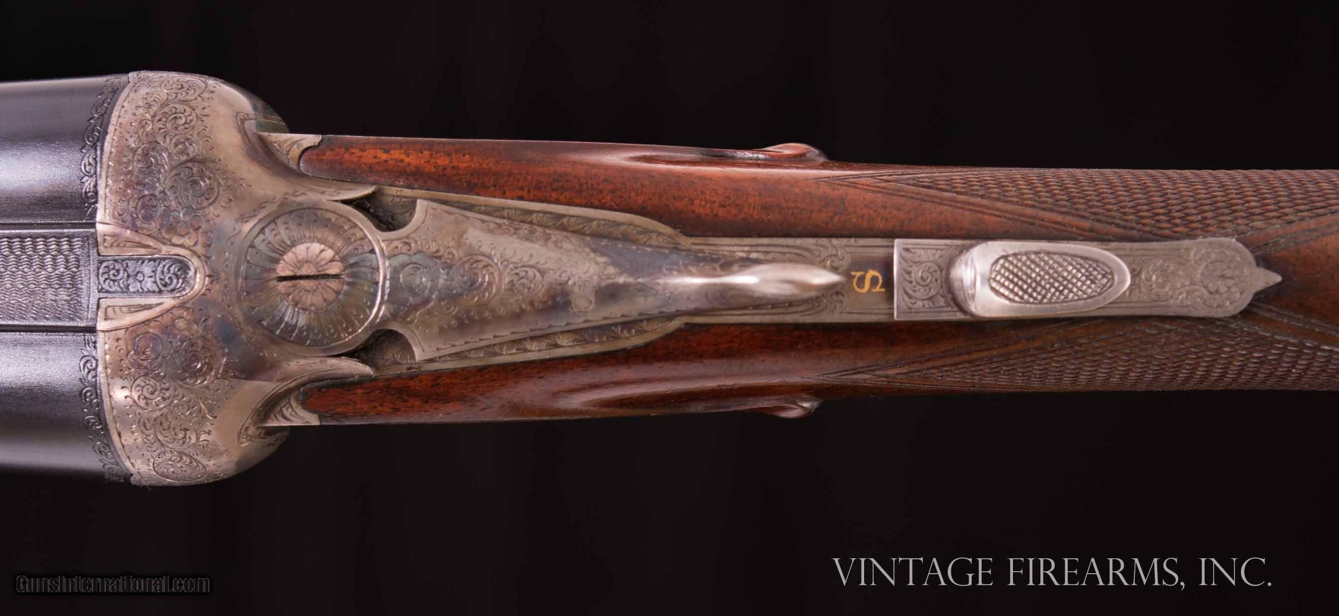 Description: Johann Springer 16 Bore Side by Side FINEST OF AUSTRIAN SHOTGUNS, 5LBS. 11OZ., GORGEOUS! **REDUCED PRICE*** General Specs: Johann Springer, Year 1913, 16 Gauge, 5lbs 11oz, SxS Serial Number: 1098.13 Joh. Springer is one of the finest names in Continental sporting arms creating their masterpieces in Austria's famed gun center near Vienna since 1855. Purveyors of their fine firearms to the Emperor of Austria, the royal families of Monaco, Archduke Ferdinand, and many other elite sporting figures throughout Europe and Russia, the rifles and shotguns produced by Springer had no equals. This fine, delicate boxlock ejector gun, sn1098.13 built in 1913, is a gorgeous little European double with all the finest features and tons of original case color and condition. The action has a fancy scalloped back side, rebated frame to hold the head of the stock in place, finely sculpted reinforcing bolsters on the bottom of the frame, fine English style rose and scroll engraving, near perfect screws, 85% vivid case colors, crisp double triggers, strong well-timed ejectors, everything in perfect mechanical order. This action is overbuilt to perfection, with 5 locking mechanisms- Greener style cross-bolt, double underlug bolts, sideclips, and barrel lug protruding through the action bottom. Each one of these mechanisms prevents movement of the barrel flats and breech face on the receiver, minimizing wear and costly future repairs. The barrels are tight on the hinge pin and breech face like a new gun, with the lever centered. The long, graceful, 29” Krupp steel barrels are in perfect condition, with mirror shiny bores, no dents or dings, choked LM/M with nice wall thicknesses and 99% blue. The wood is supremely inletted to the stock, with all the graceful curves, sharp drop points, and finely cut checkering. There are no splits or repairs. Just look at the inletting around the forend tip and the action and realize there are few humans alive today that can perform this kind of workmanship. Weighing just 5lbs. 11oz. it is a delight in hand and moves with little effort. This is an extraordinary upland gun that will do well as you practice on clay targets as well. Priced to sell, this is a lot of gun for the money from a preeminent Austrian gunmaker built in the heyday of the side x side shotgun. Thanks for looking! Barrels Barrel Length: 29" Chokes: .014/.018 LM/M Bores: mirror Bore Diameter: .660/.662 Wall Thickness: .022/.023 % Blue: 99% Chambers: 2 3/4" Ribs: tight Sights: single Action Action: tight Ejectors or Extractors: ejectors, well timed Case Color: 90% Screws: excellent Engraving: fine english rose and scroll; 50% coverage Trigger Type: double, crisp Trigger Guard Color: 85% case color Stock Type: capped pistol grip/splinter forend/cheek piece LOP: 13 3/4" LOP To End Of Wood: 13" DAH: 2 1/2" DAC: 1 1/2" Cast: 0 Checkering Condition: excellent Butt Treatment: solid red pad There are more photos upon request. We offer a 30 day mechanical warranty on this fine shotgun. Call us for full details. PLEASE SEE MY OTHER FINE VINTAGE FIREARMS. Just open one of my ads and click on the line that says “see all items from this seller” and a very nice list of fine sporting and collectible arms will appear. I have many more fine sxs shotguns not yet listed. Thanks for looking! We employ a full time gunsmith on premises and can perform alterations to suit your needs within a few weeks of purchase. Payment Methods: Money Order, Certified Check, Personal Check, Wire Transfer Inspection Period / Return Policy: Three Days from the date the item was received. Sales Tax: 6% Michigan Only Shipping & Insurance: Ground $45.00 We ship internationally! Item Condition: Used Requires FFL?: Yes If you have any questions about this item or payment, please email or call us directly, at #616-292-6240. Thanks! Vintage Firearms Inc We employ a full time gunsmith on premises and can perform alterations to suit your needs within a few weeks of purchase. Common requests are: -stock bending to suit your particular requirements -addition of any specified butt pad to increase length of pull -alteration of chokes to suit your shooting preferences -lengthening of chambers and forcing cones -darkening stock color with penetrating stains -restoring any part of the gun including rust blue, charcoal blue, bone and charcoal case color, wood restoration and checkering recuts. If you like one our guns but it needs "tweaked", let us know and we can quote you a time and price. Some enthusiasts like the guns "as found" and others want them "just so". We often list guns as found and let the particular buyer choose how they want their gun to fit or look. SOLD Curio/Relic: Yes |