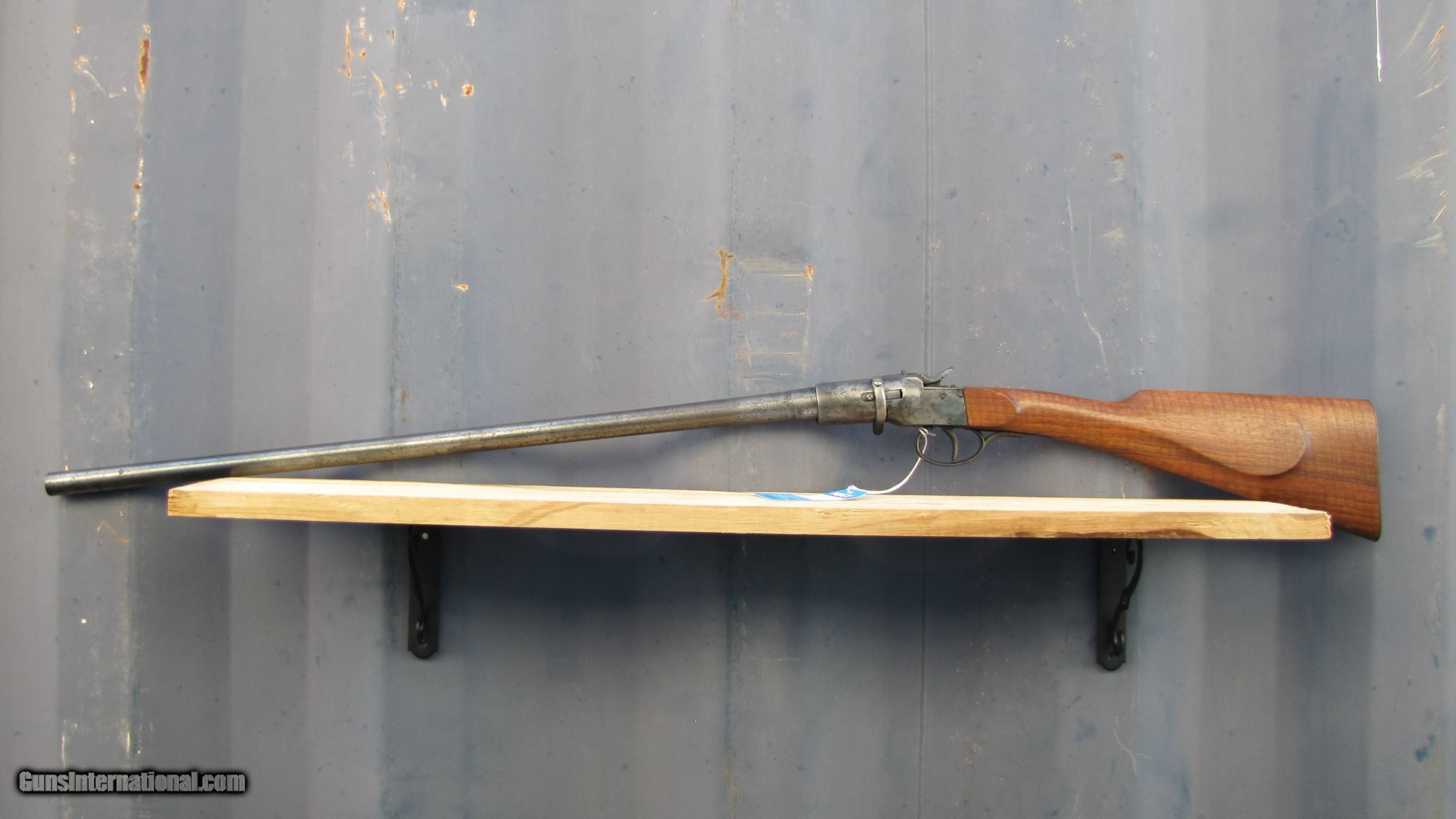 Description: Here is one of the most interesting and unique, as well as simply shotguns I have ever seen. I think it is German (crown over U proof as well as an imperial looking eagle proof) and the only markings we can find are KABA 6906 on the side of the action and 16 on the chamber. This is a very simple action that twists to unlock and then the barrel is pulled forward out of the receiver and a shell can be loaded or unloaded. Then the barrel is inserted back into the receiver and twisted to lock it back in place. These are refered to as poachers guns and are really simple and light. This one weighs onlt 3 lbs 11 oz despite the 27.5" barrel. The chamber is 2-3/4" and gthe choke is MOD on my gauge. The action appears to be functional though we have not test fired it. FREE SHIPPING! We are required to charge 8.25% for Texas residents. There is a 3.5% fee if paying by credit card. SOLD Shotgun Gauge: 16 Gauge Manufacturer: KABA Model: Single Shot Serial Number: 6906 Barrel Length: 27.5 Bore: Dirty, pitted Chambers: 2-3/4 Condition: Fair Metal Condition: Fair Wood Condition: Good Bore Condition: Poor Chokes: Fixed MOD |