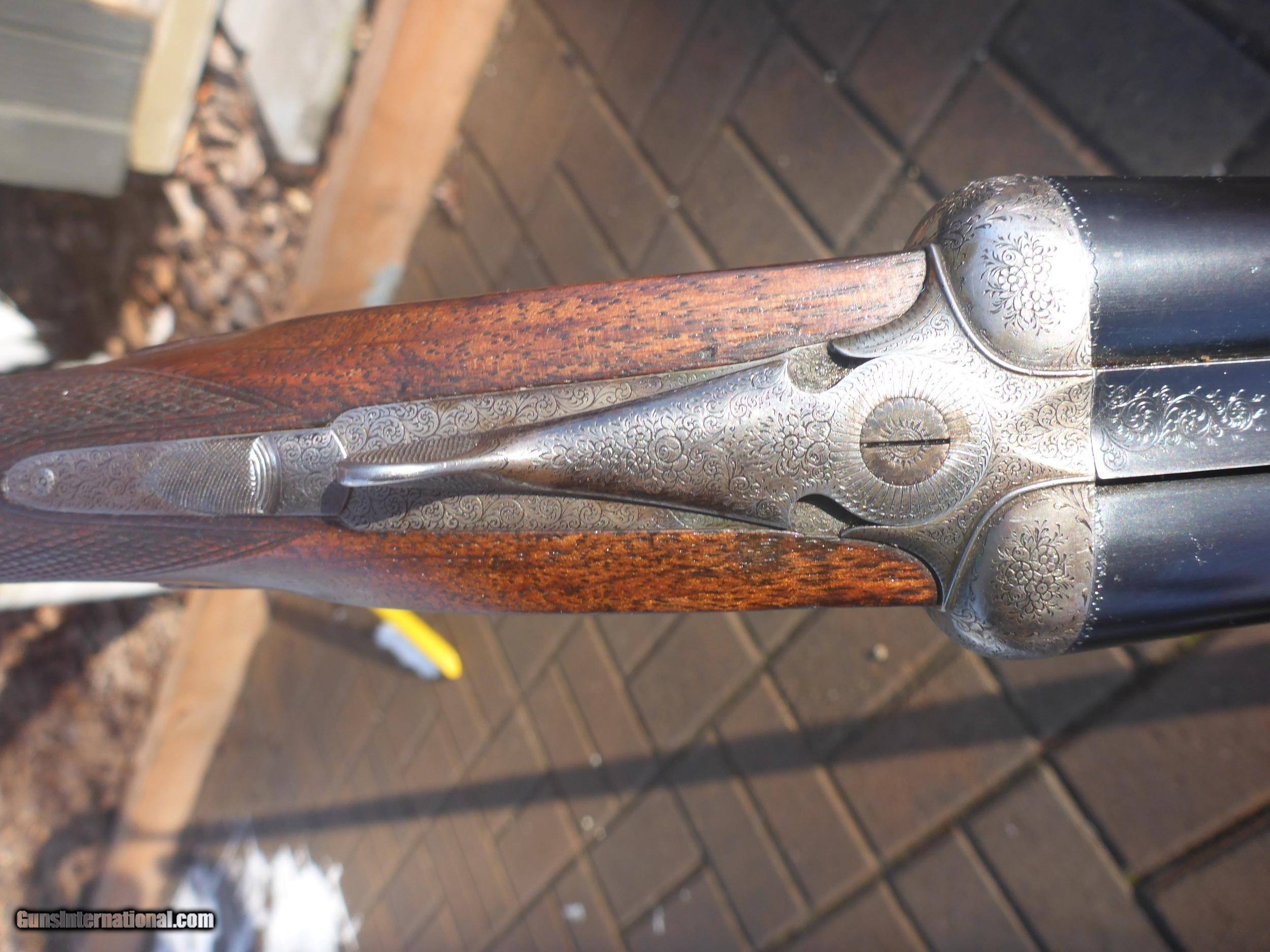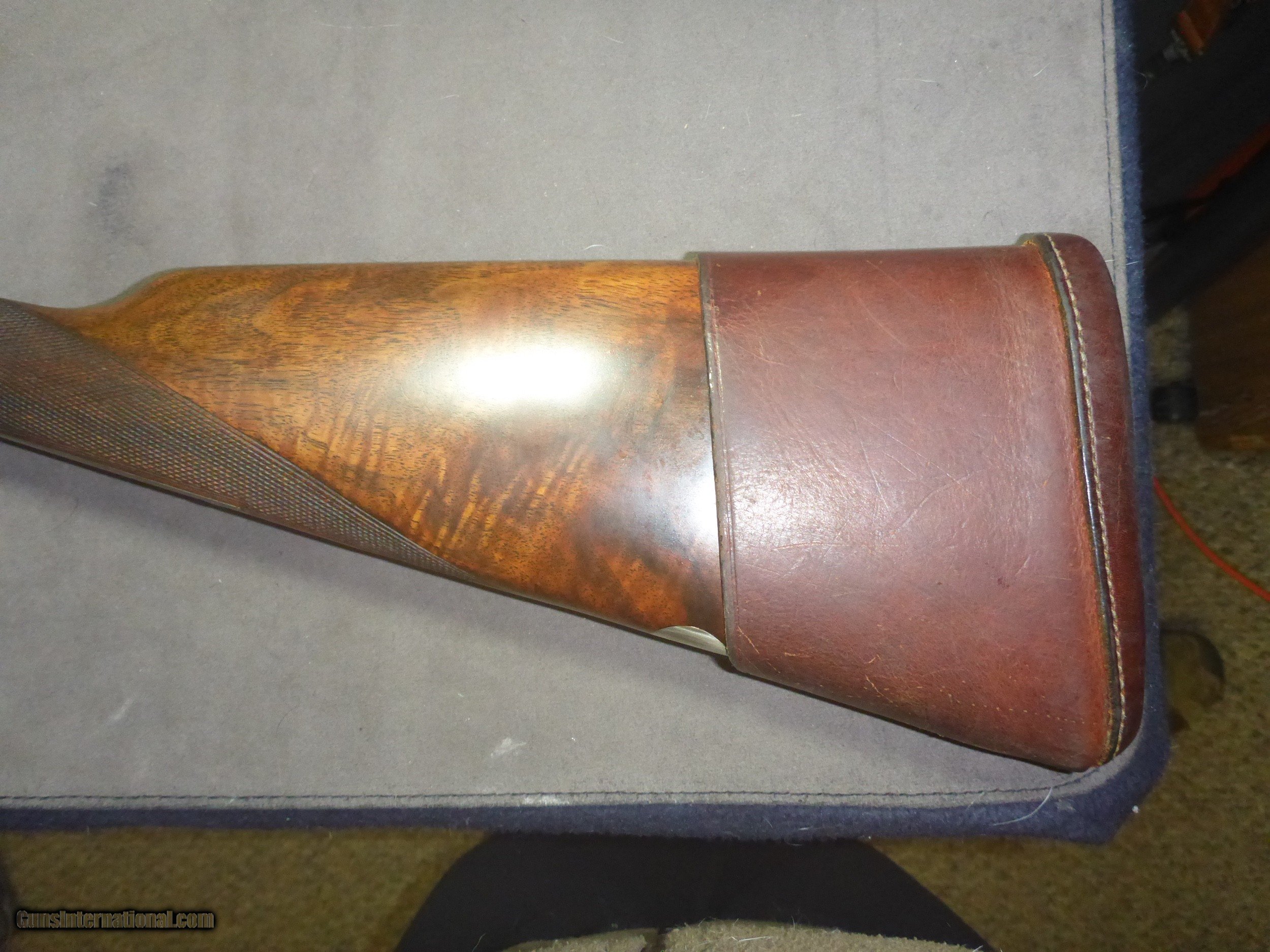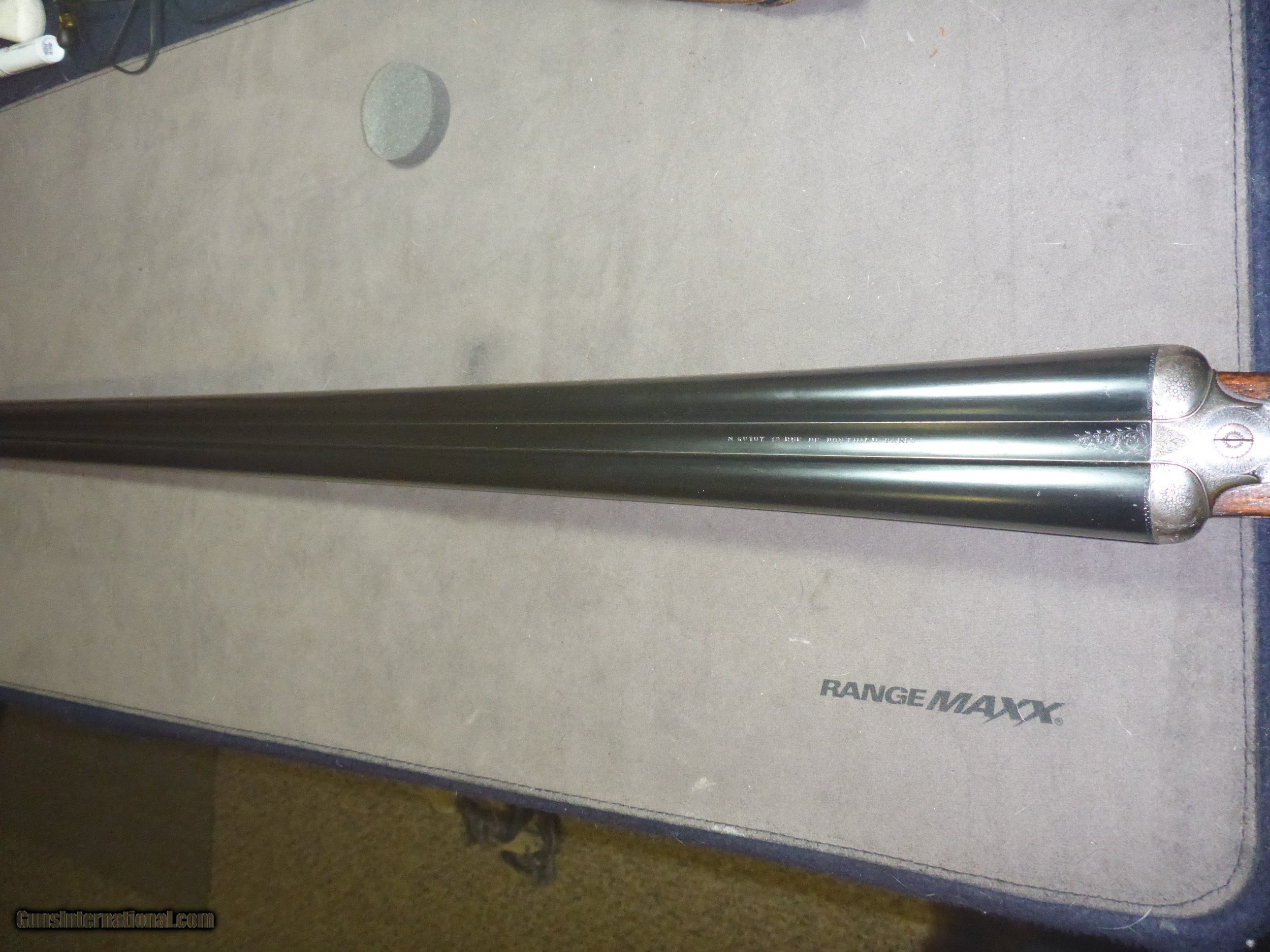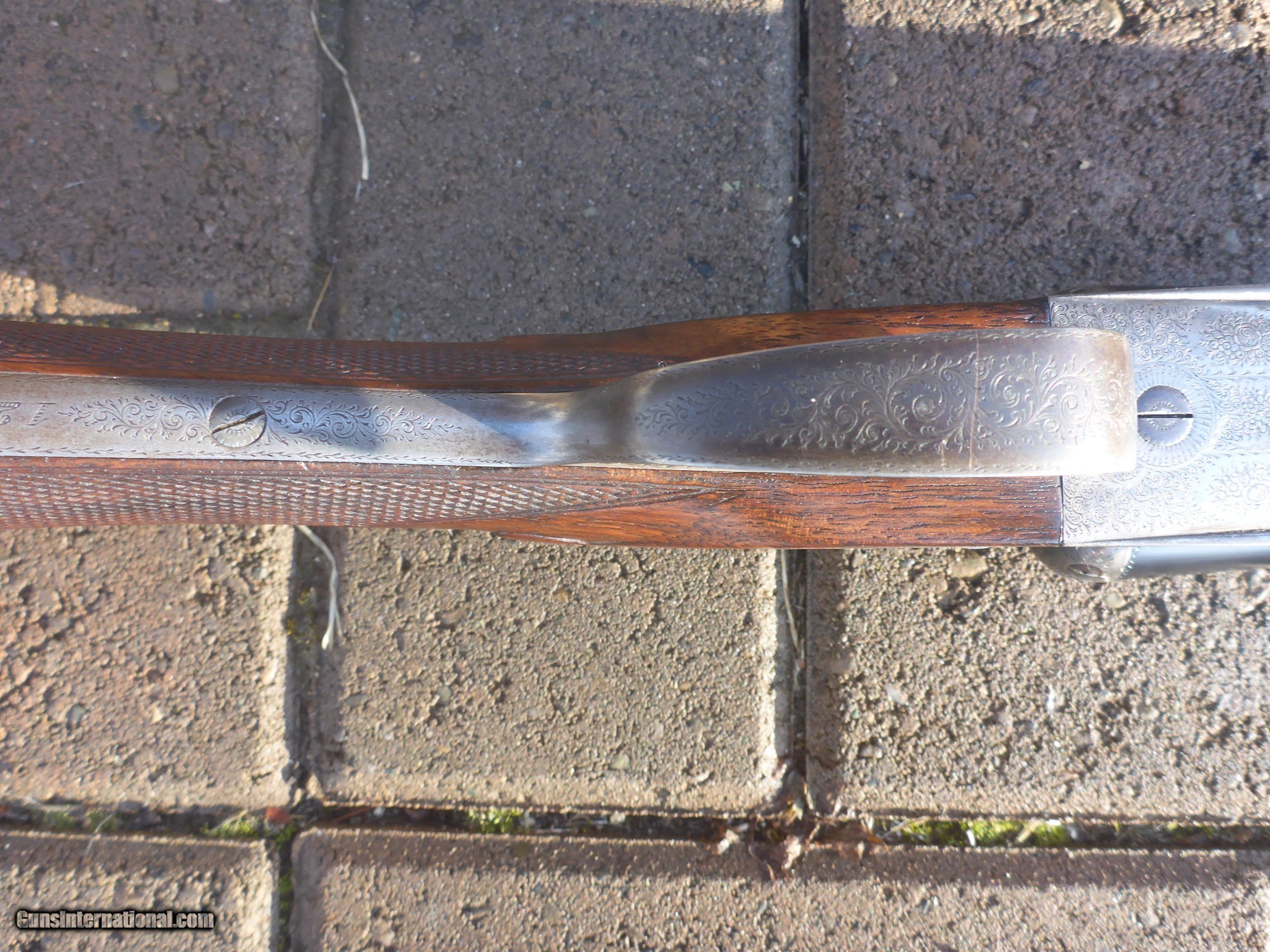 Description: N Guyot 16 gauge often called "The Purdey of Paris" . This is a very high quality gun that would sell for 2-3x if it had a London name ! It has a front articulated trigger . .Stock is nicely firgured French walnut with a 1 1/8" extention (this guns ONLY drawback!!)Barrels are Nitro Proofed for 2 3/4" shells and are in very good condition with 85% original bluing. They have good Wall thicknesses and are choked IC/MOD .Engraving is Purdey Style Rose & Scroll and is sharp except for trigger tang which is slightly worn as one would expect for a gun of this age (around 75 years old) I will include a $75 Galco slip-on recoil pad which will cover extention and give you a LOP of 15" if desired. There is another on GI in 12 Gauge just like this one for more than twice my price making this one a real bargain . Why would you pay 4K + for a Spanish gun that is engraved by a machine ? This 16 gauge would make a wonderfull Upland Gun ...don't let it get away !! Shipping $50 to your FFL. SOLD Shotgun Gauge: 16 Gauge Manufacturer: N Guyot Model: Sidelock Serial Number: 11296 Barrel Length: 27 1/2 Chambers: 2 3/4 Ejectors: Yes Condition: Very Good Metal Condition: Very Good Wood Condition: Very Good Bore Condition: Spotless Barrel Type: Double Action: Sidelock Triggers: Double Stock: French Walnut Stock Comb: 1 3/8 Stock Heel: 2 3/16 Stock Cast: 1/4" cast-off Fore End: Splinter Butt Pad: No LOP: 14 1/4 Rib: Game Rib Finish: Oil Weight: 5 lb 14 oz Sights: Single Brass bead Manufacture Date: Approx 1929 Choke Left: Lt Mod .012 Choke Right: IC .008 Engraving: Purdey Rose & Scroll Case: No Item Location: Montana Proof:Nitro: Yes Minimum Wall Thickness Left: .024 Minimum Wall Thickness Right: .021 |