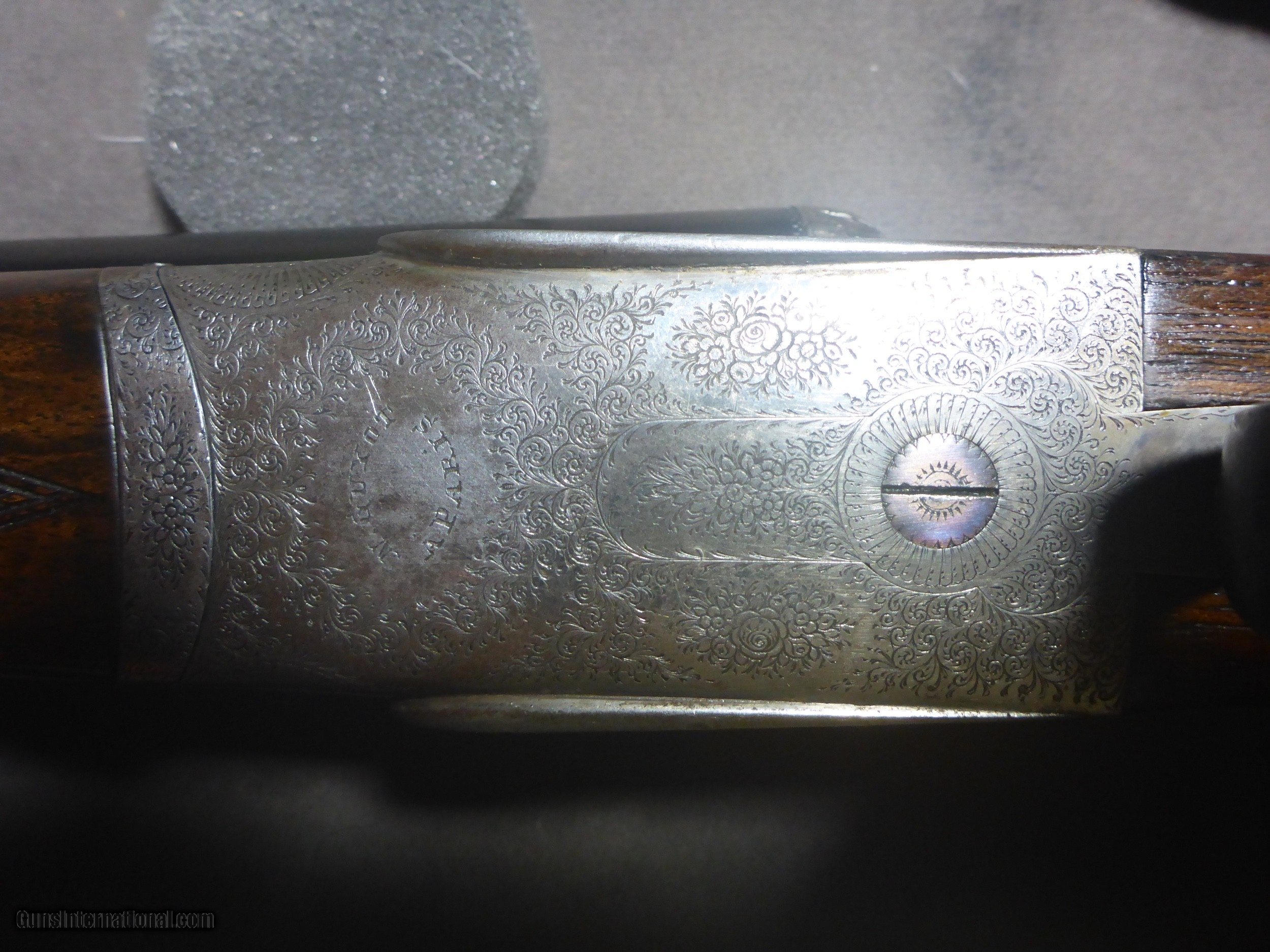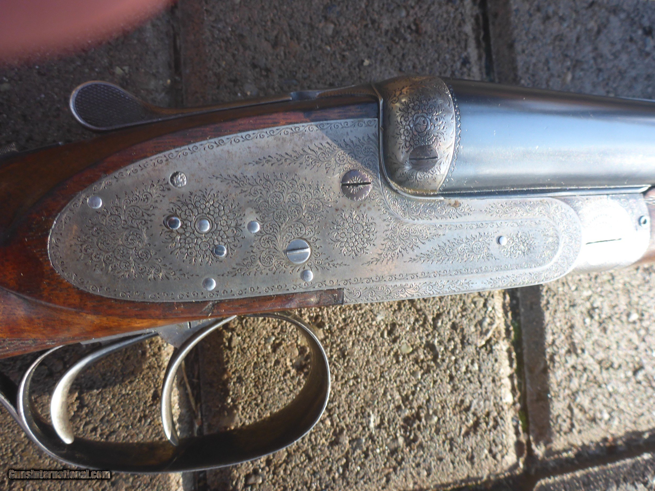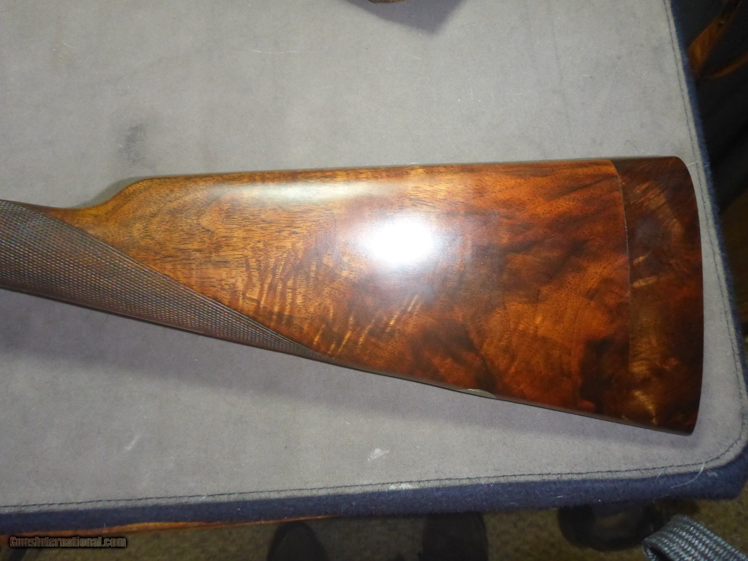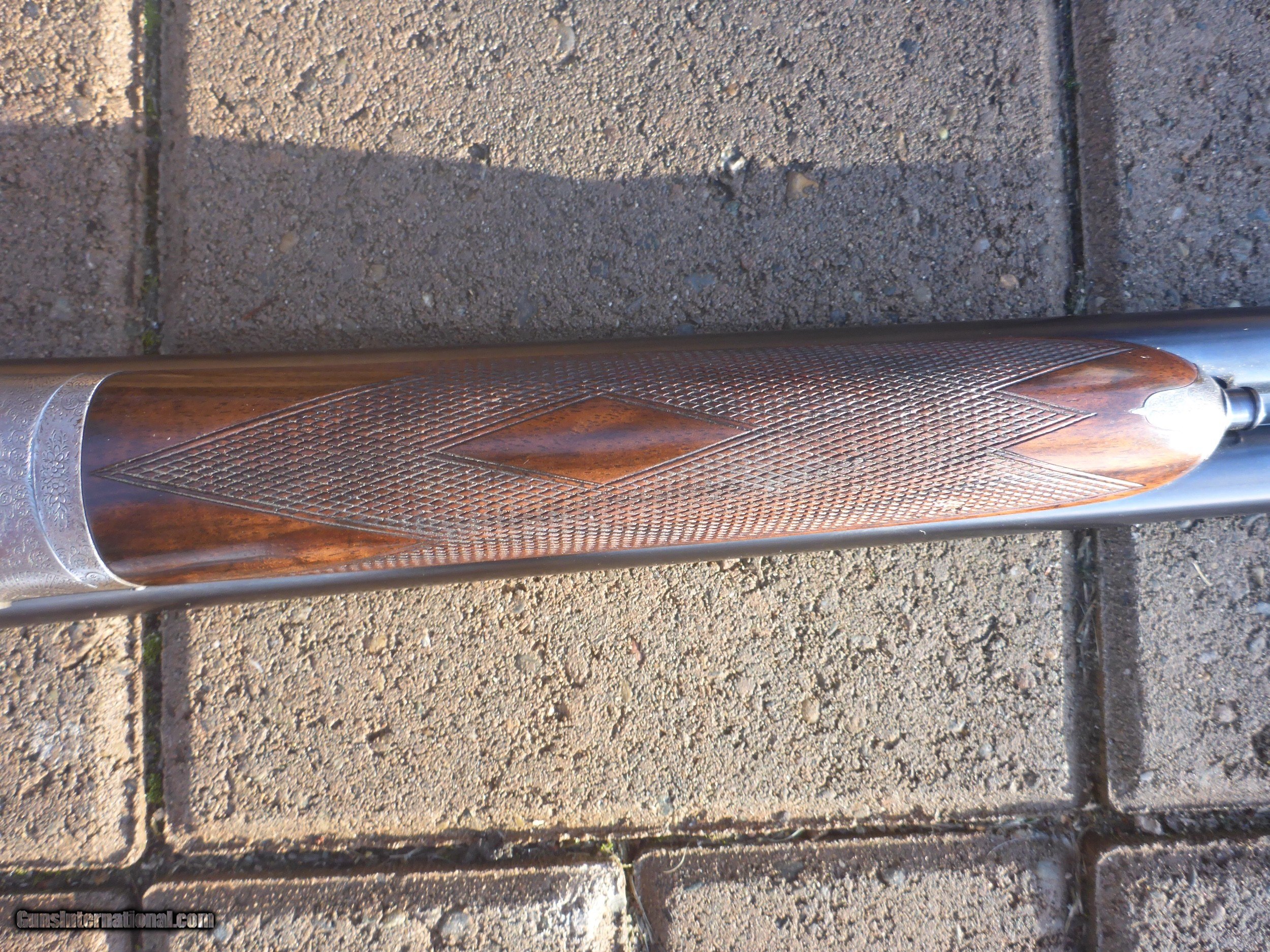 Description: N Guyot 16 gauge often called "The Purdey of Paris" . This is a very high quality gun that would sell for 2-3x if it had a London name ! It has a front articulated trigger . .Stock is nicely firgured French walnut with a 1 1/8" extention (this guns ONLY drawback!!)Barrels are Nitro Proofed for 2 3/4" shells and are in very good condition with 85% original bluing. They have good Wall thicknesses and are choked IC/MOD .Engraving is Purdey Style Rose & Scroll and is sharp except for trigger tang which is slightly worn as one would expect for a gun of this age (around 75 years old) I will include a $75 Galco slip-on recoil pad which will cover extention and give you a LOP of 15" if desired. There is another on GI in 12 Gauge just like this one for more than twice my price making this one a real bargain . Why would you pay 4K + for a Spanish gun that is engraved by a machine ? This 16 gauge would make a wonderfull Upland Gun ...don't let it get away !! Shipping $50 to your FFL. SOLD Shotgun Gauge: 16 Gauge Manufacturer: N Guyot Model: Sidelock Serial Number: 11296 Barrel Length: 27 1/2 Chambers: 2 3/4 Ejectors: Yes Condition: Very Good Metal Condition: Very Good Wood Condition: Very Good Bore Condition: Spotless Barrel Type: Double Action: Sidelock Triggers: Double Stock: French Walnut Stock Comb: 1 3/8 Stock Heel: 2 3/16 Stock Cast: 1/4" cast-off Fore End: Splinter Butt Pad: No LOP: 14 1/4 Rib: Game Rib Finish: Oil Weight: 5 lb 14 oz Sights: Single Brass bead Manufacture Date: Approx 1929 Choke Left: Lt Mod .012 Choke Right: IC .008 Engraving: Purdey Rose & Scroll Case: No Item Location: Montana Proof:Nitro: Yes Minimum Wall Thickness Left: .024 Minimum Wall Thickness Right: .021 |