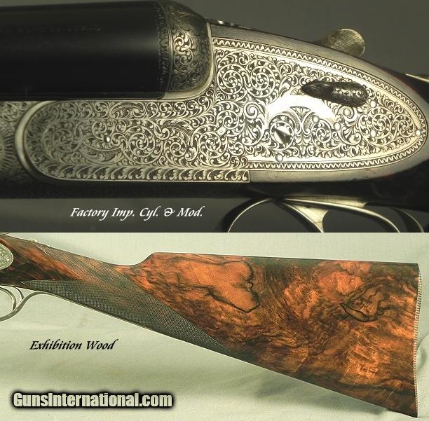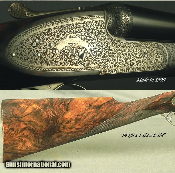 Description: #9539, Fratelli Piotti, Gardone Val Trompia, Brescia Italy, Best-Quality Model King Royal Hand Detachable Lock Bar Action Sidelock Ejector 16 Bore Made in 1999 that remains like new, 28” Chopper Lump barrels at 17mm = .672 .009 & .018 ( Imp.Cyl. & Mod.), 2 3/4”, KG 1,180 weight barrels, The action body made out of a solid block of Boehler steel, The locks completely made in house by the family lock maker Mr. Fabio Piotti, Matted concave top rib, Double triggers with the front articulated, "F.lli Piotti" in Gold on both locks, Rolled trigger guard edge for the right hand, Splinter game forend, Straight hand stock at 14 1/8 x 1 1/2 x 2 1/8” over a full face checkered butt, Slight cast-off for the right hand, Great game gun weight at 6 lbs. 4 oz., 99% coverage of gorgeous and superb H&H Royal Style engraving by Pantechini on a coin finished frame. It has nicely carved fences and a carved frame. It has absolute Upgraded Wood and has an Exhibition piece of European Walnut with excellent color & contrast of deep brown & black. This piece has 3 retainer screws which secure key screws on the trigger guard tang and forend iron. The whole is cased in the maker's leather trunk with a trade label. This very nice 16 Bore Game Gun remains totally original and in nearly new condition. The metal remains in 99% factory original condition and the wood certainly at 97%. The checkering remains at 99%. Here is another Classic Piotti game gun with the proper size action body and the neat weight of 6 Lbs. 4 Oz. for 16 Bore gunning by one of the leading gunmaking firms in the world. This is a treasure in the field and in the gun cabinet. SOLD |