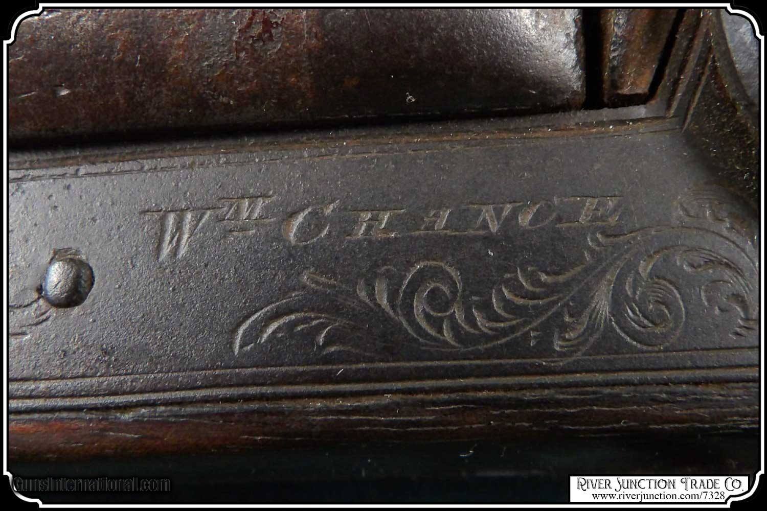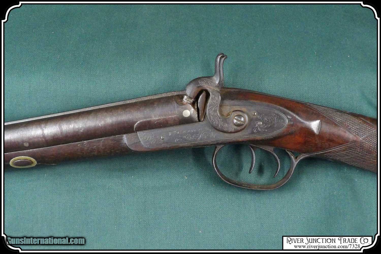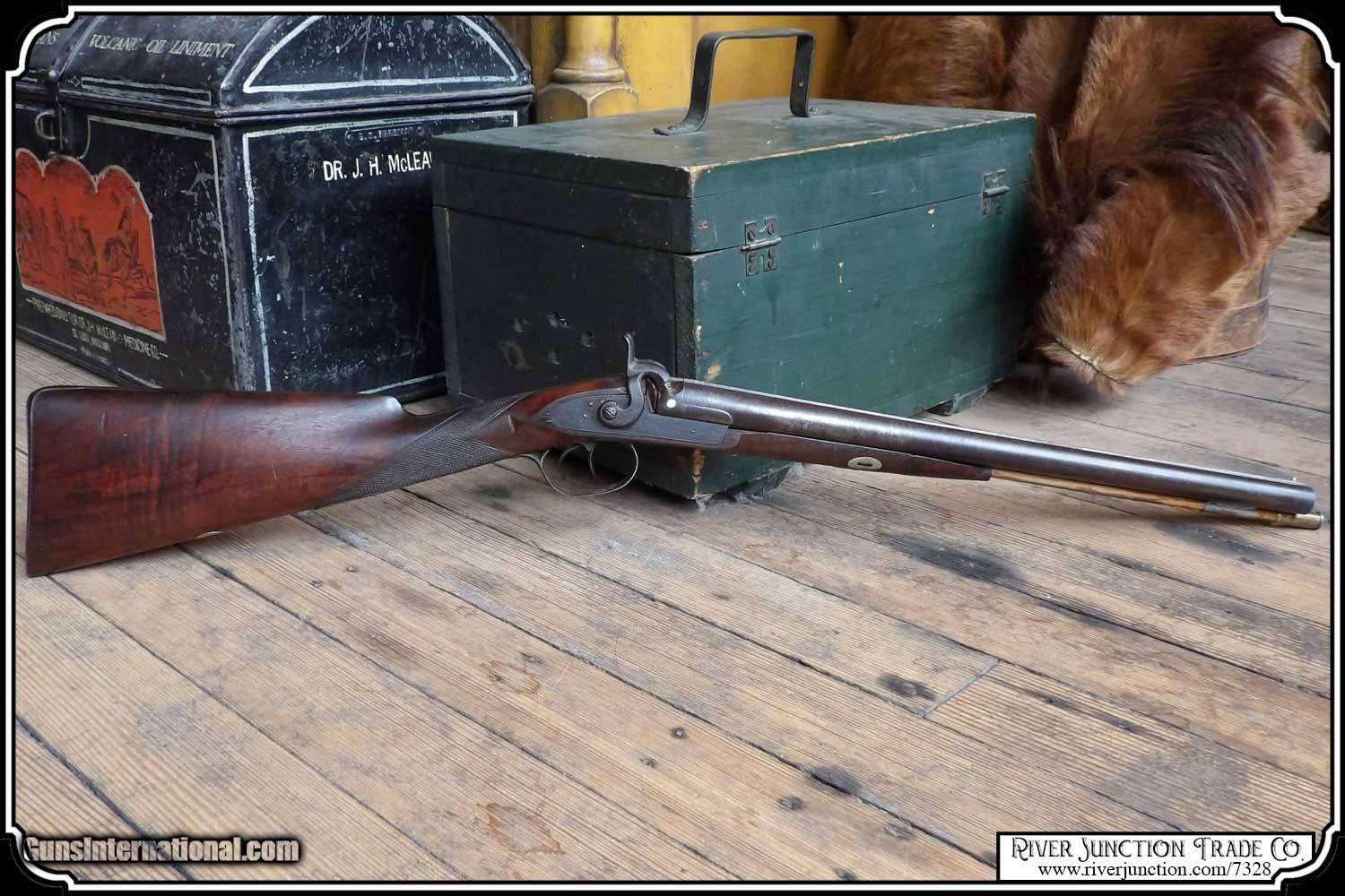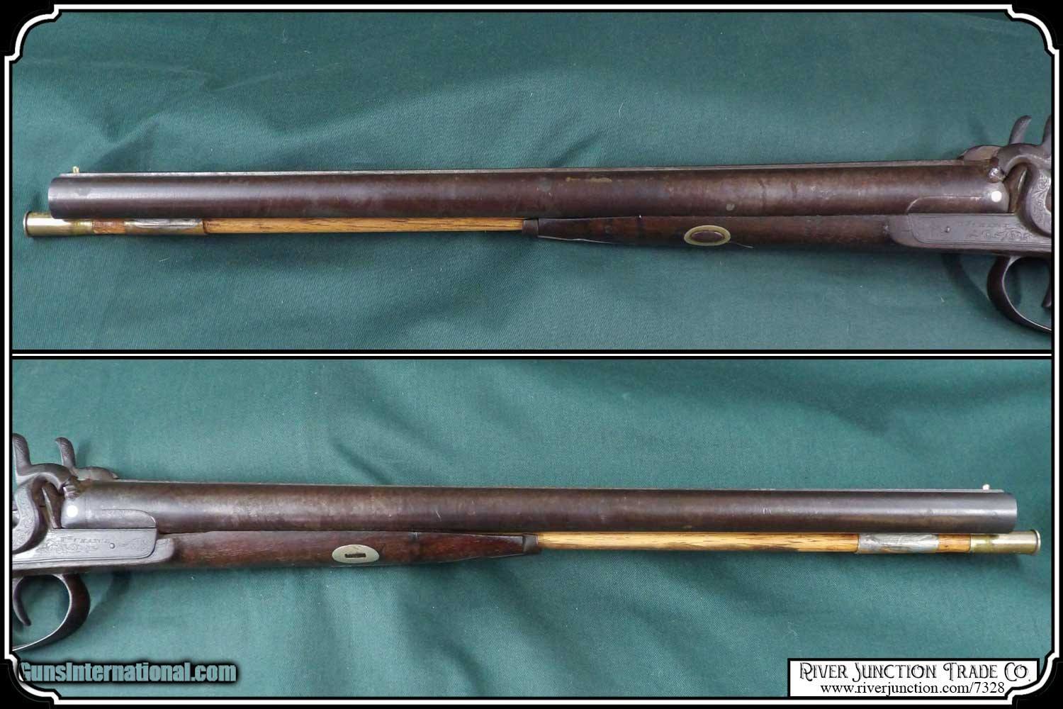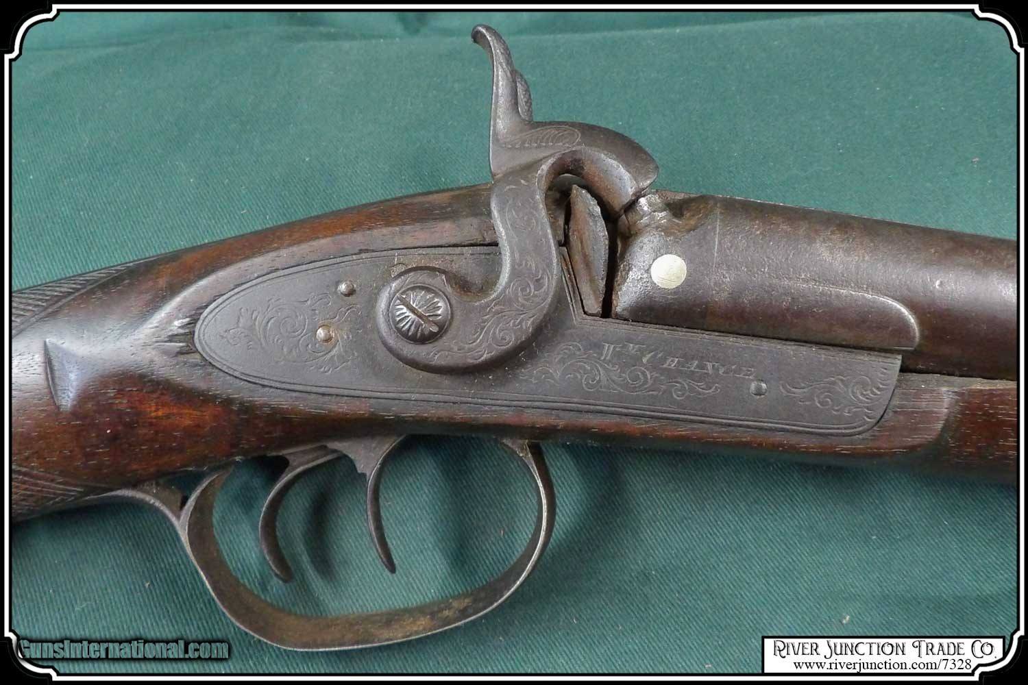 Description: A delightful, Sawed Off percussion Shotgun with 17 inch barrels. It has an overall length of 34 inches. The ramrod is longer than the barrels, (easier to get a hold of) . The wood has virtually all its original finish. It has a crack from the ramrod entry thimble to the barrel key, but it does not effect stability at all. Otherwise no significant chips and only minor dings. The locks, both left and right, function crisply. The gun has an even, pleasant, brown patina, which is smooth and uncleaned. The locks, hammers, trigger guard, butt plate, tang, etc. have a nice light engraving. The gun dates from the late 1850's to 1860 period. It is marked W.M. Chance on the lock plates and the top of the barrels is marked " London Fine Twist". It is of good sound solid quality. On the left side of the stock it has the letters "W R M F Jr" If you ever wanted an attractive, sawed off percussion shotgun to compliment your display, this is it. I don't have a clue as to the history of the gun. Could it be Confederate? Sure, or maybe an express agents gun or it might be a canoe gun, It sure is interesting. Price: $910.00 Buy Now Contact Seller |