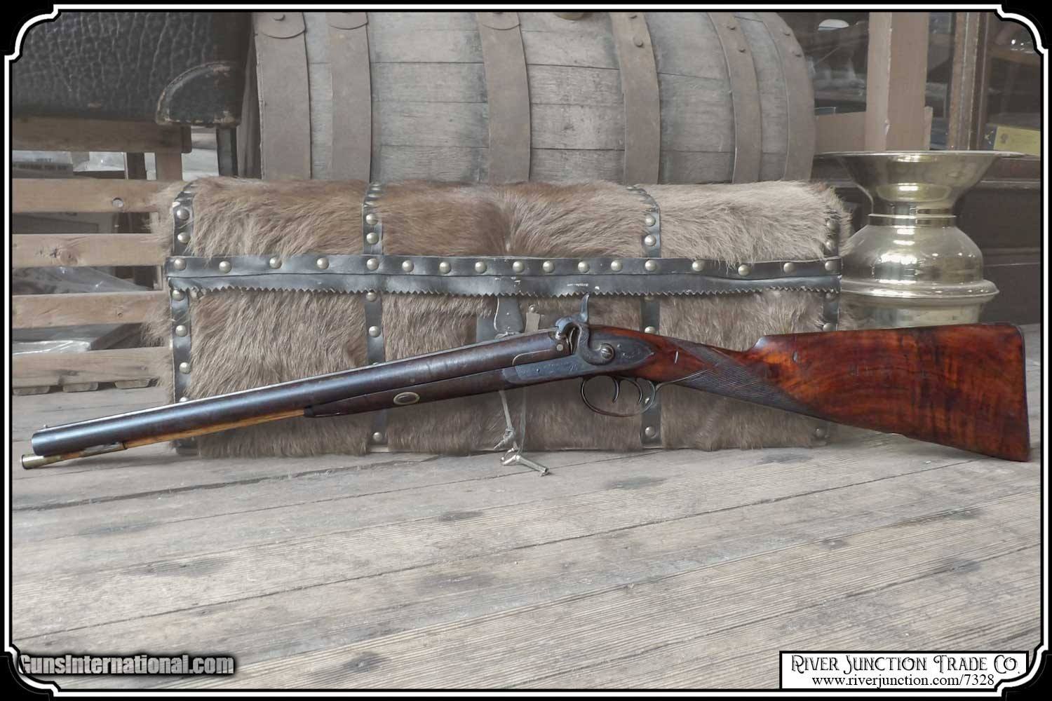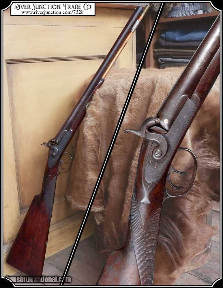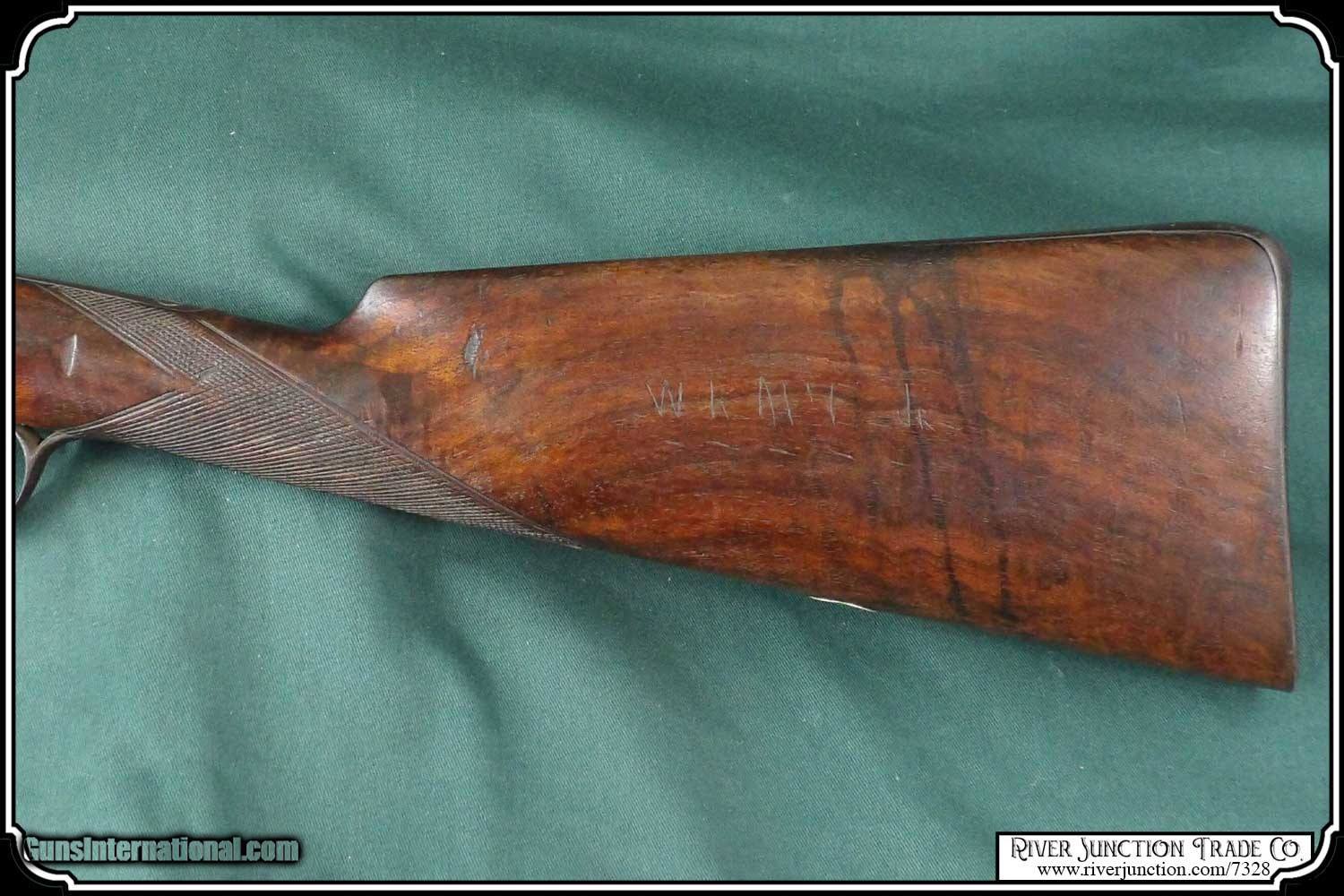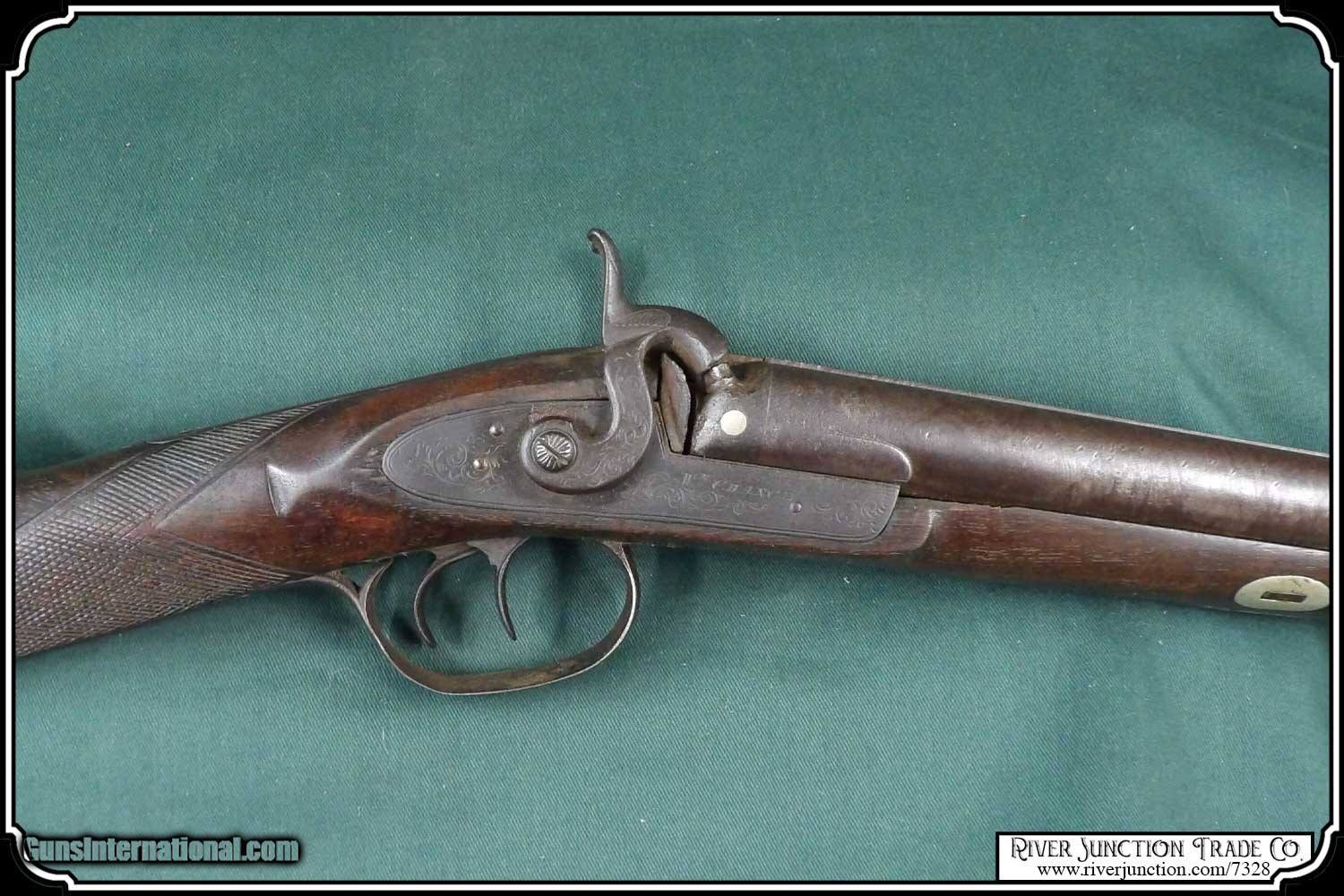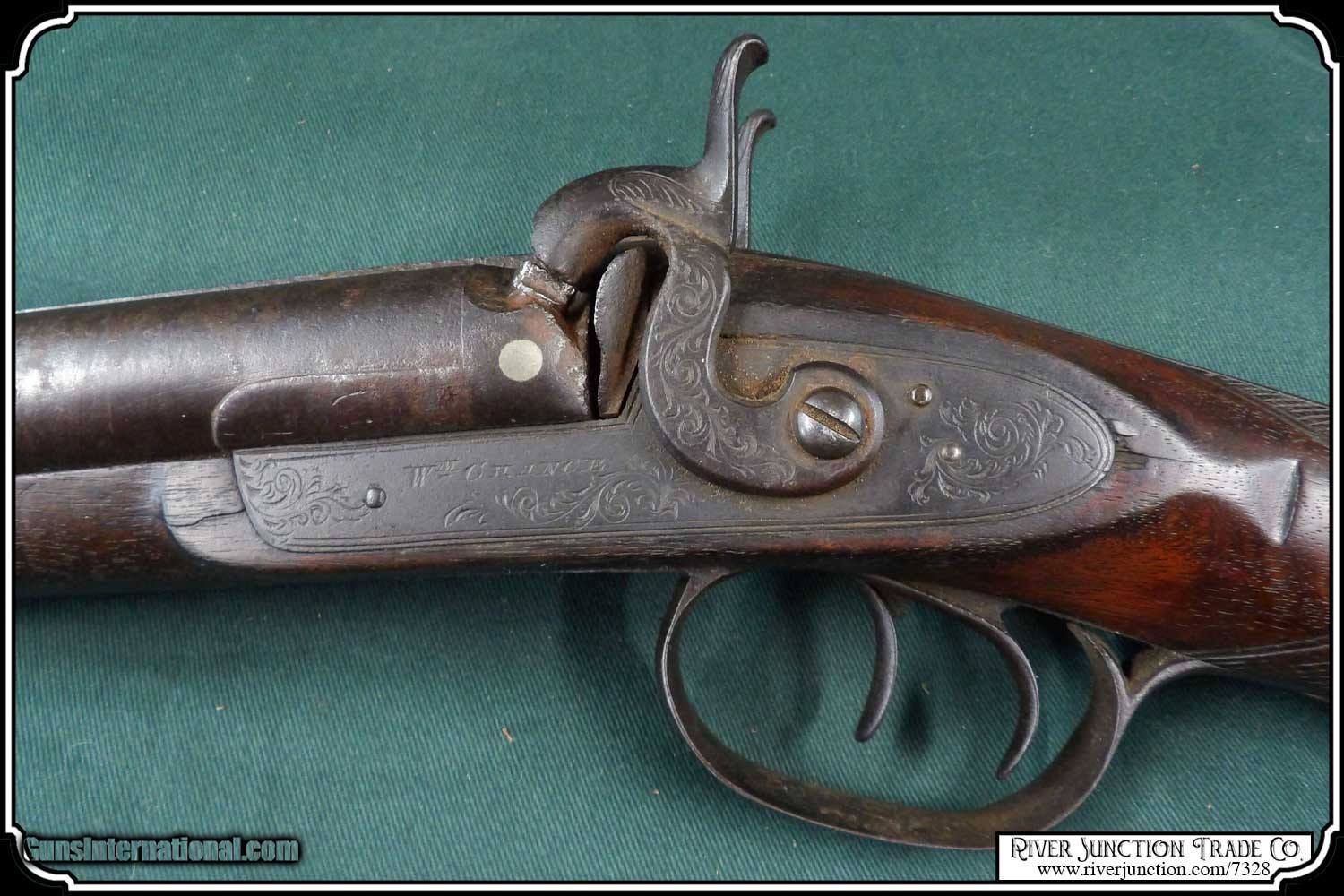 Description: A delightful, Sawed Off percussion Shotgun with 17 inch barrels. It has an overall length of 34 inches. The ramrod is longer than the barrels, (easier to get a hold of) . The wood has virtually all its original finish. It has a crack from the ramrod entry thimble to the barrel key, but it does not effect stability at all. Otherwise no significant chips and only minor dings. The locks, both left and right, function crisply. The gun has an even, pleasant, brown patina, which is smooth and uncleaned. The locks, hammers, trigger guard, butt plate, tang, etc. have a nice light engraving. The gun dates from the late 1850's to 1860 period. It is marked W.M. Chance on the lock plates and the top of the barrels is marked " London Fine Twist". It is of good sound solid quality. On the left side of the stock it has the letters "W R M F Jr" If you ever wanted an attractive, sawed off percussion shotgun to compliment your display, this is it. I don't have a clue as to the history of the gun. Could it be Confederate? Sure, or maybe an express agents gun or it might be a canoe gun, It sure is interesting. Price: $910.00 Buy Now Contact Seller |