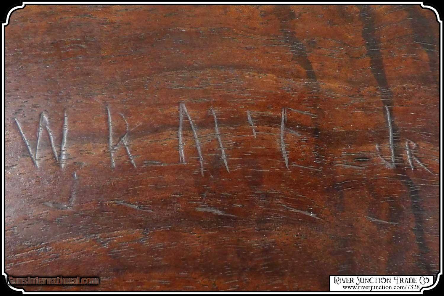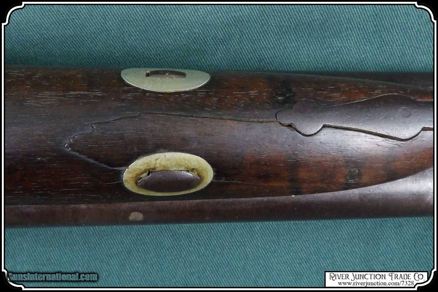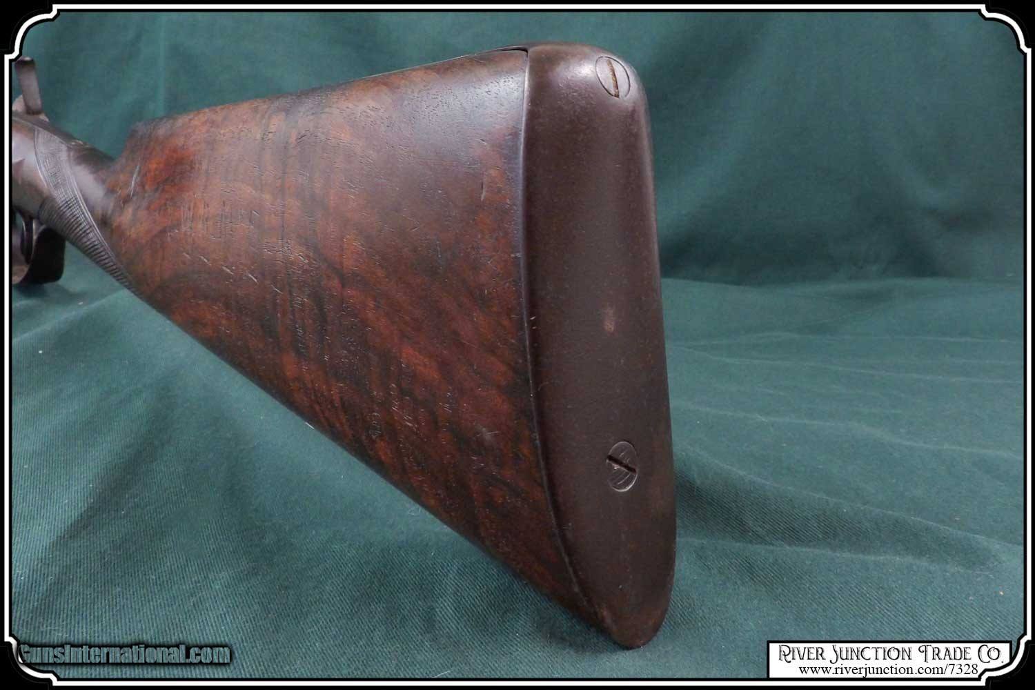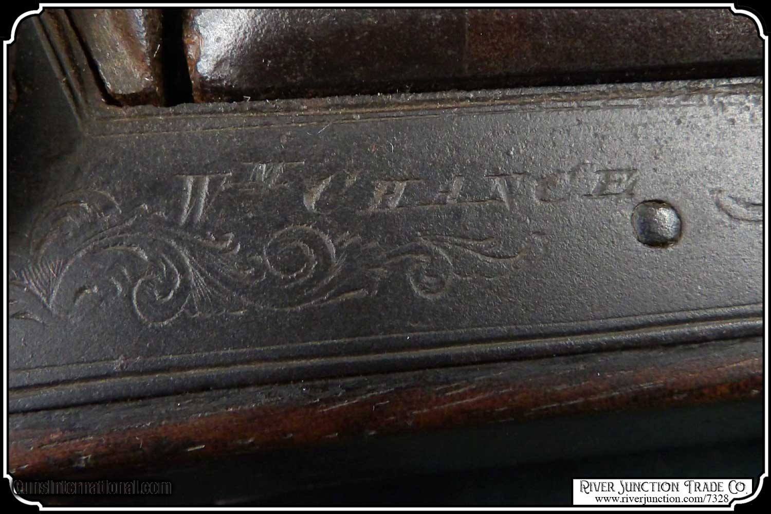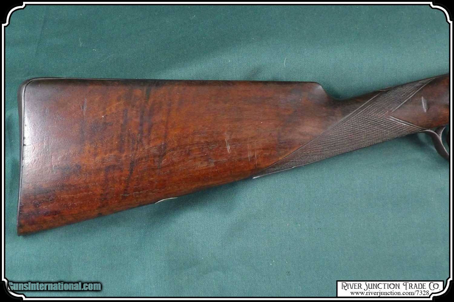 Description: A delightful, Sawed Off percussion Shotgun with 17 inch barrels. It has an overall length of 34 inches. The ramrod is longer than the barrels, (easier to get a hold of) . The wood has virtually all its original finish. It has a crack from the ramrod entry thimble to the barrel key, but it does not effect stability at all. Otherwise no significant chips and only minor dings. The locks, both left and right, function crisply. The gun has an even, pleasant, brown patina, which is smooth and uncleaned. The locks, hammers, trigger guard, butt plate, tang, etc. have a nice light engraving. The gun dates from the late 1850's to 1860 period. It is marked W.M. Chance on the lock plates and the top of the barrels is marked " London Fine Twist". It is of good sound solid quality. On the left side of the stock it has the letters "W R M F Jr" If you ever wanted an attractive, sawed off percussion shotgun to compliment your display, this is it. I don't have a clue as to the history of the gun. Could it be Confederate? Sure, or maybe an express agents gun or it might be a canoe gun, It sure is interesting. Price: $910.00 Buy Now Contact Seller |