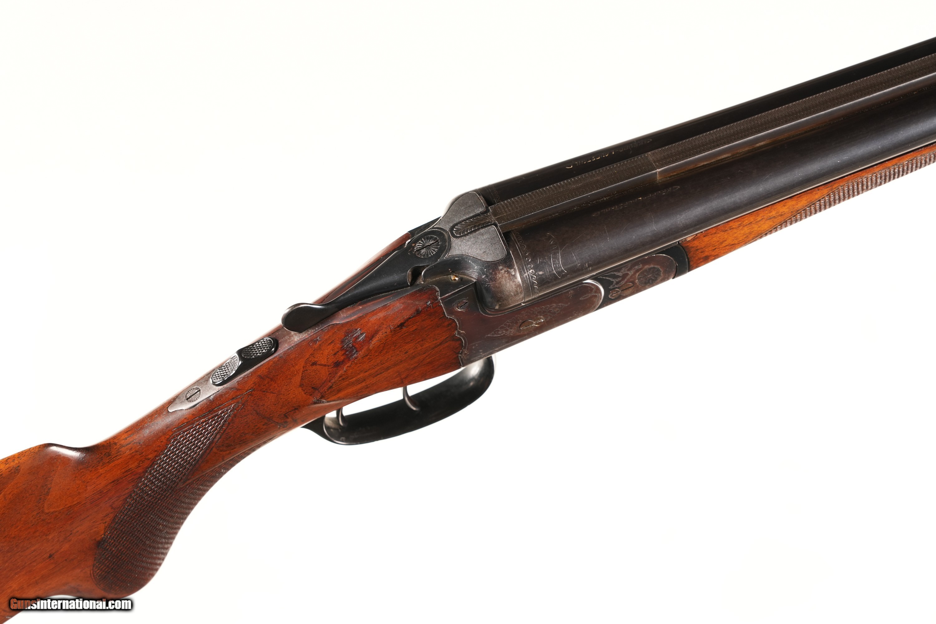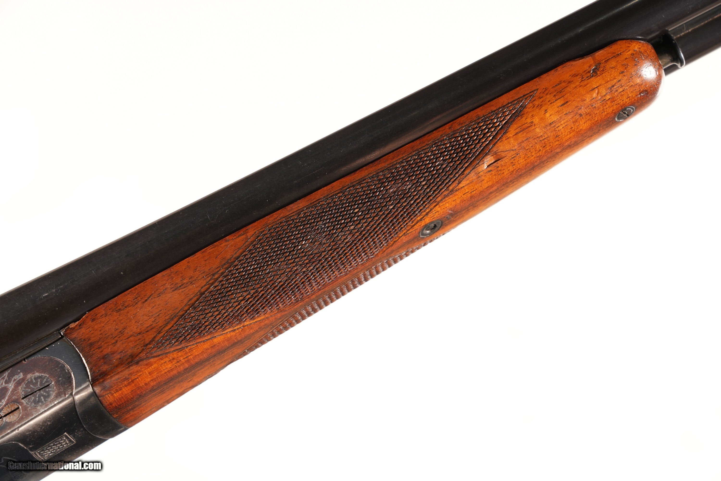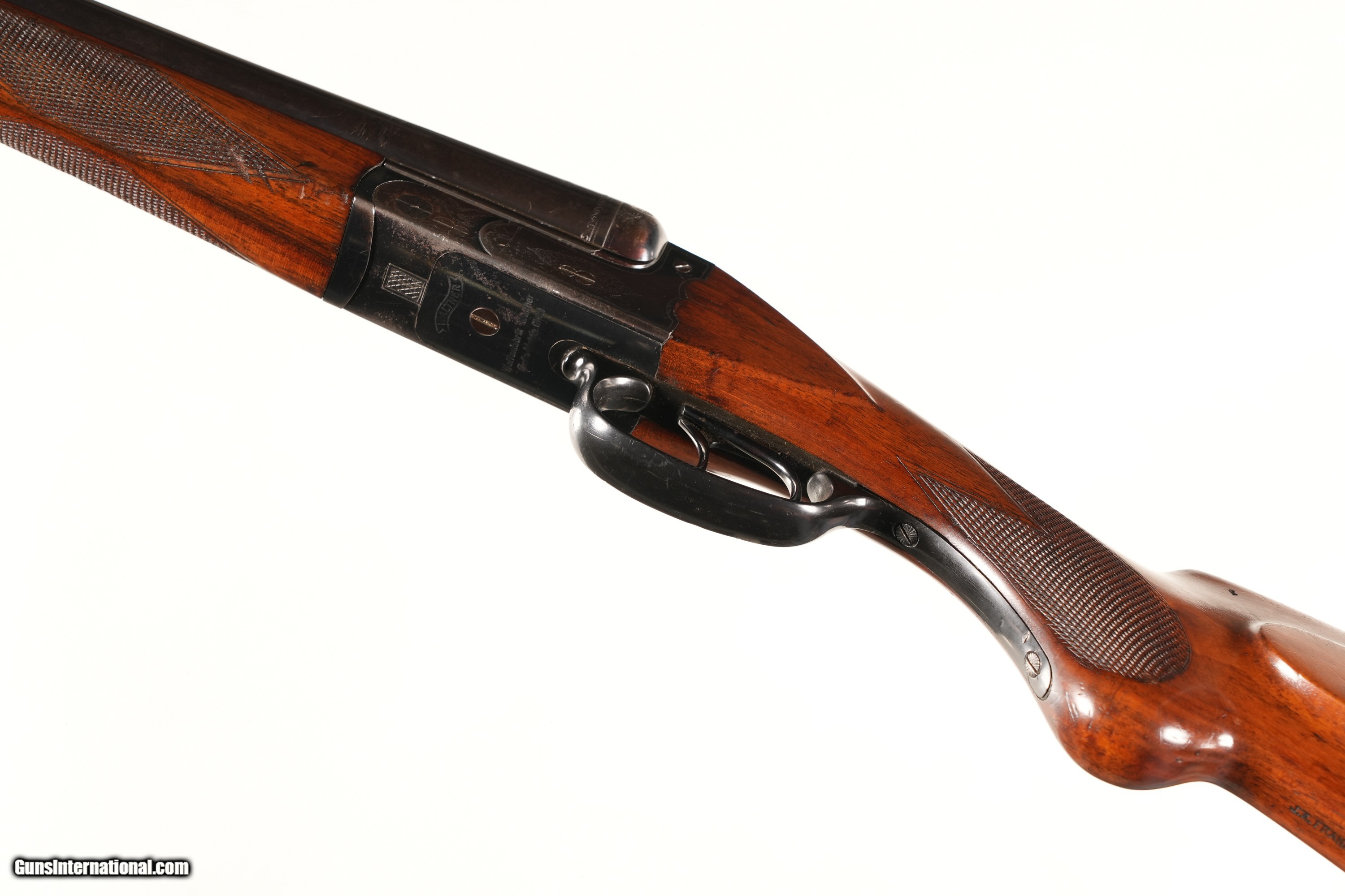 Step into German sporting heritage with this Walther Side-by-Side Shotgun in 16 Gauge, crafted by Walther in Zella-Mehlis, Germany, renowned for their quality doubles before WWII. The serial number 2696 suggests pre-war production, aligning with Walther's reputation for elegant, reliable field guns for upland hunting. This C&R-eligible shotgun, with 28 3/8" barrels and scalloped boxlock, is a collector’s gem for game birds or clays. This example is in Very good overall condition, with the game-scene, scroll & border engraved scalloped boxlock and Walther banner underside showcasing fine detail. The 28 3/8" barrels, choked Full and Improved Modified, are ideal for mid-range targets (20–40 yards), perfect for pheasant or partridge. The checkered walnut round-knob pistol-grip stock, with previous owner’s name neatly in the toe-line, shows light handling marks but remains solid. The double triggers, tang safety, crossbolt, and extractor operate mechanically excellent, with a tight lockup reflecting Walther’s robust craftsmanship. Don’t miss this Walther SxS—a Very good 16 Gauge side-by-side, perfect for upland hunters or collectors. Click “Buy It Now” or call 478-337-1000 to claim this fine shotgun today! Purchase Details: