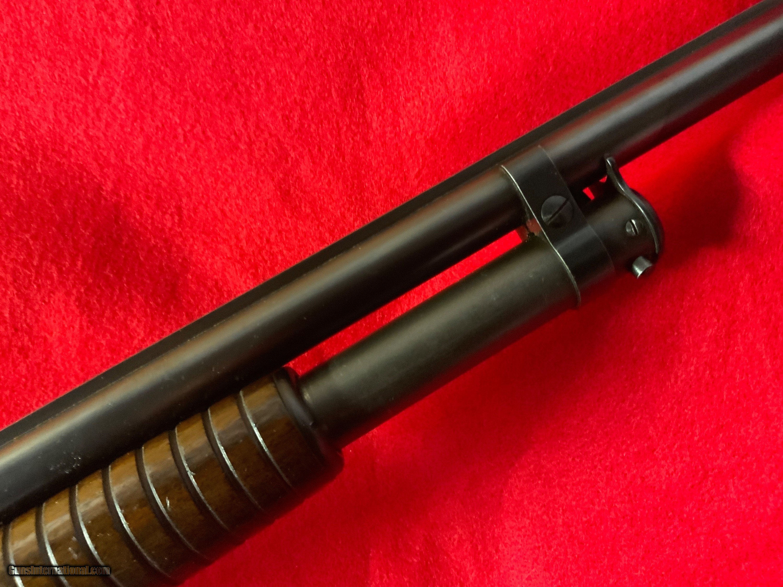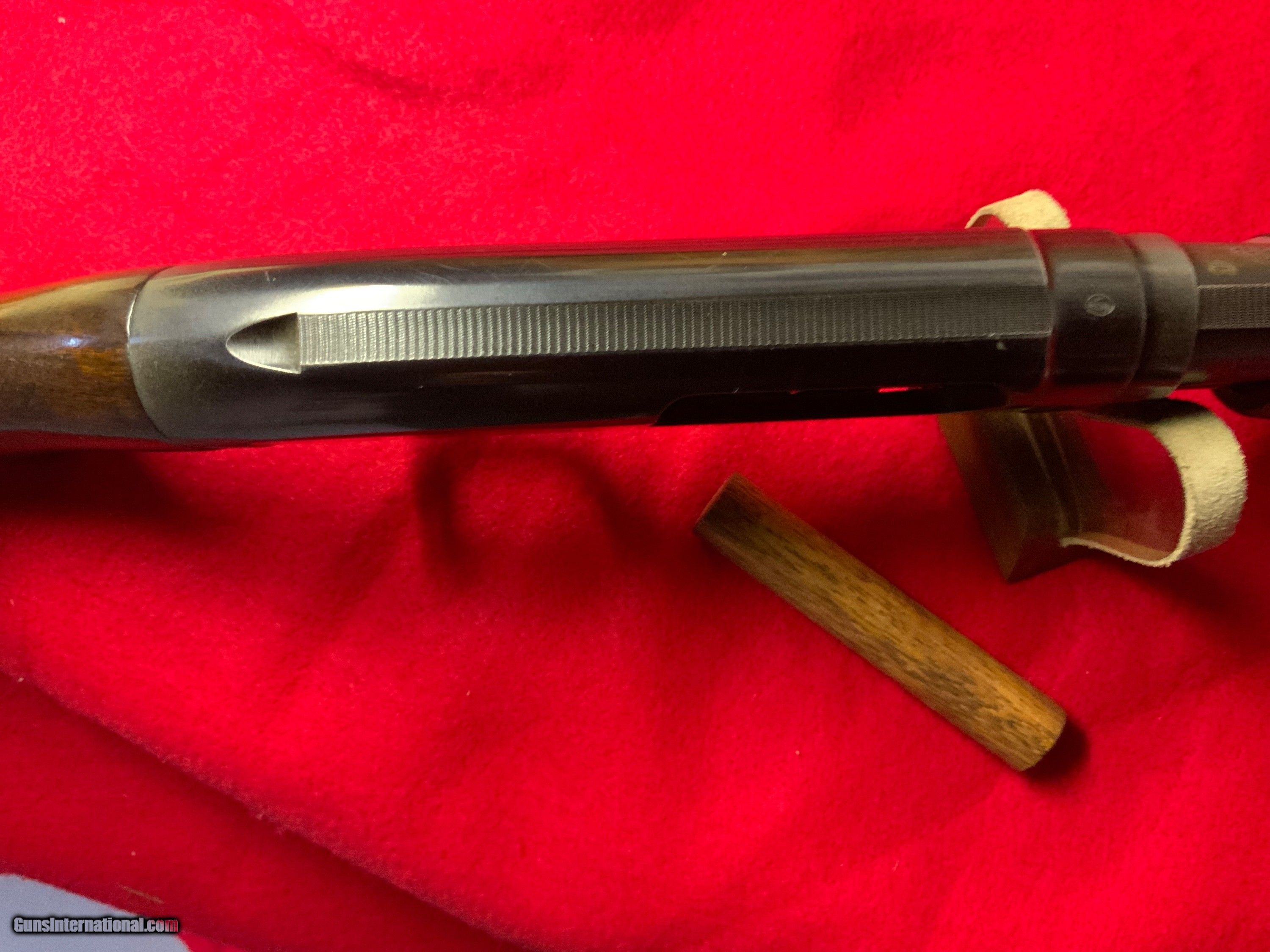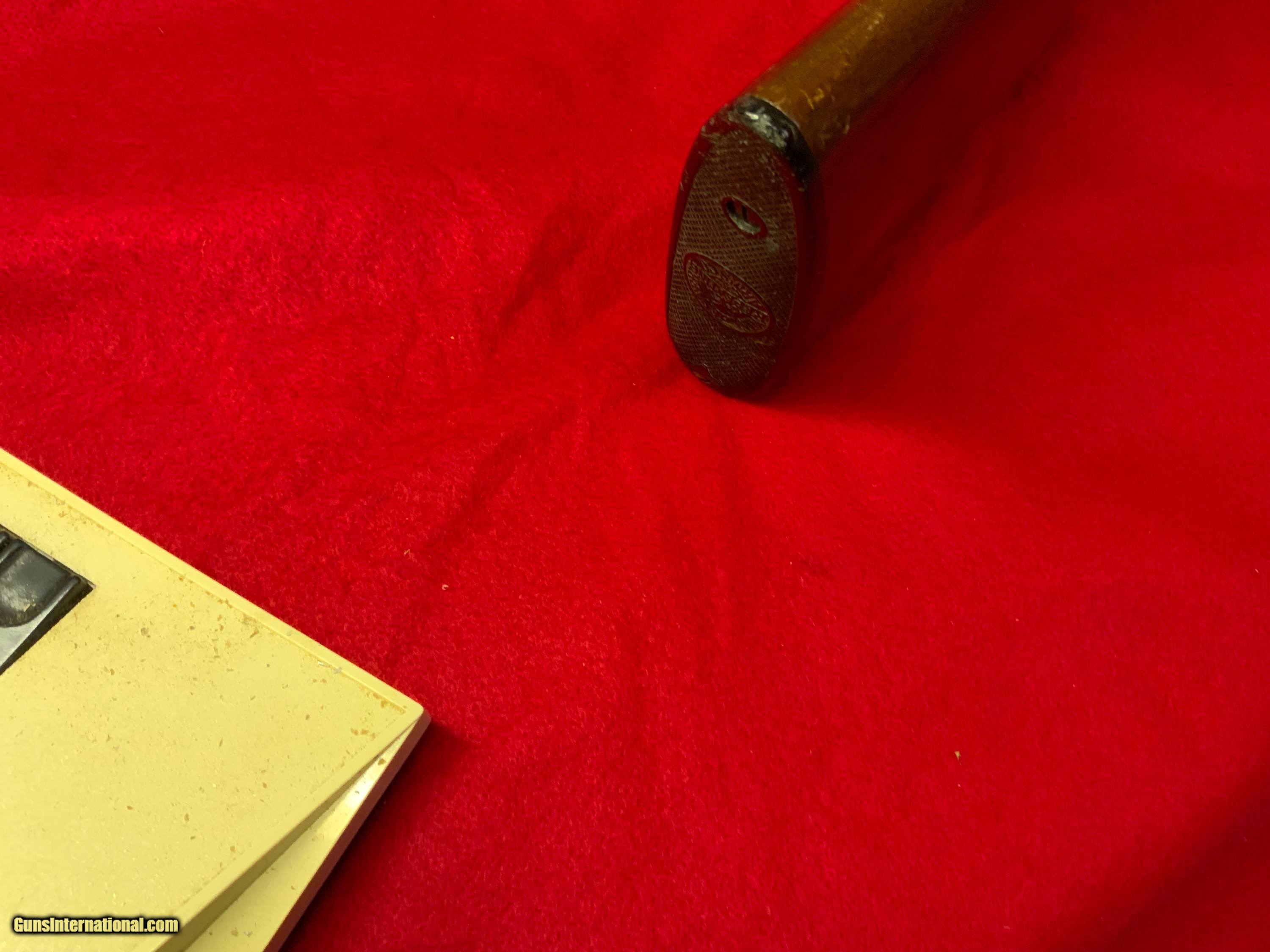Description: SOLD SN 909900 1942 Cal.16ga. With 26" choked modified.Solid rib brl. Grooved corn cob forearm.Blued receiver retaining 85% original blue. Plain walnut flat knob pistol grip buttstock which terminates with a Winchester HRBP. Weight 6lbs. 7 oz. 2 3/4' chambers. Very good to excellent field use.Barrel with about 90% original blue. Stock is very good with scattered impressions and handling marks. Bore is bright and shiny and mechanics are fine. Great upland game gun and excellent gun for young person starting out hunting. PRICE $1095.00. Buyer pays shipping at $35.00 SOLD Curio/Relic: Yes Shotgun Gauge: 16 Gauge Manufacturer: Winchester Model: 12 Serial Number: 909900 Barrel Length: 26” Bore: Smooth Chambers: 2 3/4 ‘ Ejectors: Yes Condition: Very good to excellent Metal Condition: 87% Wood Condition: 93% Bore Condition: Mirror Barrels: Single Barrel Type: Shotgun Action: Pump Triggers: Single Stock: Walnut Stock Cast: Straight Fore End: Corncob Butt Pad: No LOP: 14” Rib: Solid Weight: 6lbs 7oz Sights: Open Manufacture Date: 1942 |