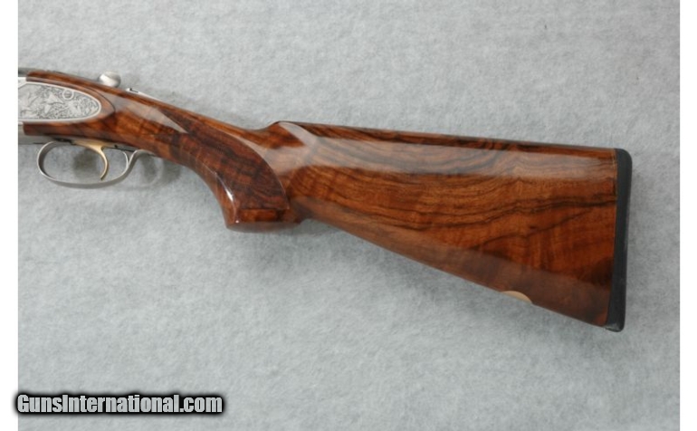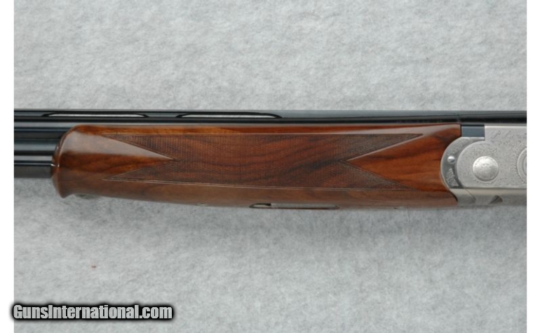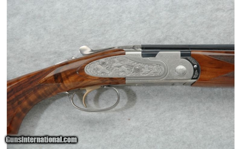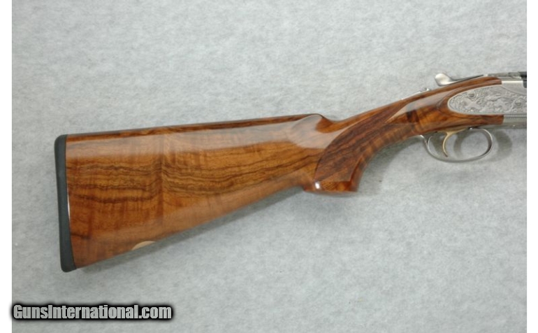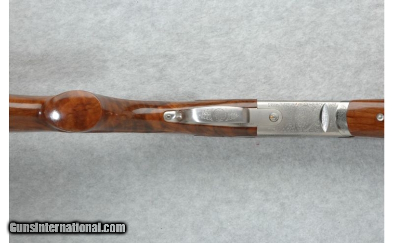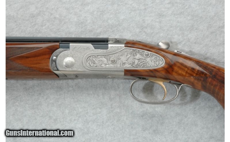 Description: Game scene deep relief engraving on sideplates on a nickel finish receiver which also includes scroll and border engraving. SOLD Caliber Info: 28 GA Chambers: 2 3/4 inch. Metal Condition: Excellent Wood Condition: Excellent with very light handling marks. Bore Condition: Very clean, bright and shiny. Barrels: 28 inches with a ventilated rib. Triggers: Single gold. Stock: Checkered high gloss deluxe walnut pistol grip. Stock Dimensions: 14 3/8 inches. Fore End: Checkered high gloss deluxe walnut Schnabel. Butt Pad: Beretta rubber pad. Weight: 6 lbs. 4 oz. Sights: Metal front bead. Chokes: Tubes Extras: With Box Item Location: Richfield, WI |