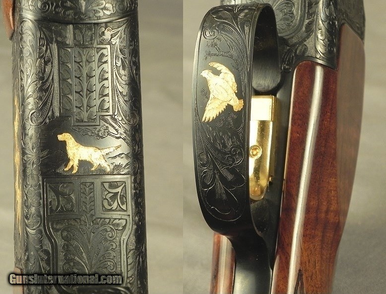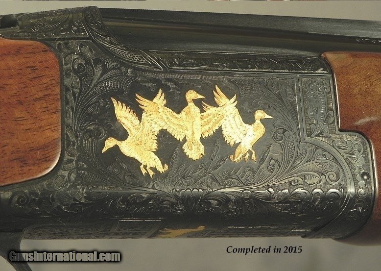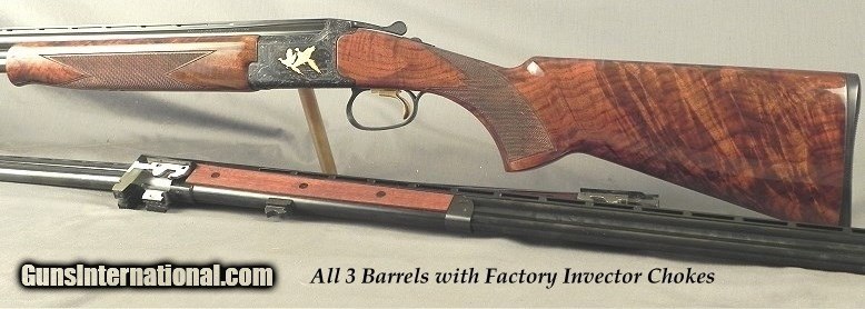 Description: #23143ZW131, Browning Citori 20 - 28 & 410 Model 425 Grade 6 American Sporter with 7 Gold Inlays, Made in 2015, A Sporting piece with all 3 barrels at 30" with vent ribs, All with flush factory Invector chokes, The barrels are not ported, The buttstock does not have the adjustable comb, Blued metal; The 20 bore is at .627" - .004 - .007 - .007 & .009" (Skt.I - Imp.Cyl. - Imp.Cyl. & Skt.II), 2 3/4" chambers; The 28 bore is at .552" .002 - .002 -.003 - .003 & .007" (Cyl. - Cyl. - Skt.I - Skt.I & Skt.II), 2 3/4" chambers; .410" .004 - .005 - .006 & .008" (Imp.Cyl. - Imp.Cyl. - Skt.II & Mod.), 3" chambers, Single selective trigger with 3 point adjustable trigger system with 2 extra trigger shapes and one has a checkered face, Game forend with a schnabel, Pistol grip stock at 14 1/4 x 1 7/16 x 2 1/8" over the Browning buttplate, It comes with a 1" Inflex Sporting pad that can be easily installed and will bring the LOP to 15", The 20 is 7 lbs. 6 oz. - The 28 is 7 lbs. 10 oz. - The 410 is 7 lbs. 7 oz.; Very nice Black Walnut with excellent color, contrast and nice feather; 98% coverage of floral engraving with 3 Gold Mallards, 2 Gold Pheasants, a Gold Setter on the bottom and a Gold Bobwhite Quail on the trigger guard, The original factory barrel blue on all 3 barrels is 99%, Original receiver blue at 100%, The wood is at 99%, The checkering is 100%, All the bores remain as new. The gun is cased in a very nice leather Browning trunk. This is almost like buying it new as it has 99.9% of its mechanical life left. There was a total of 21 sets made in this series with 3 barrels. SOLD |