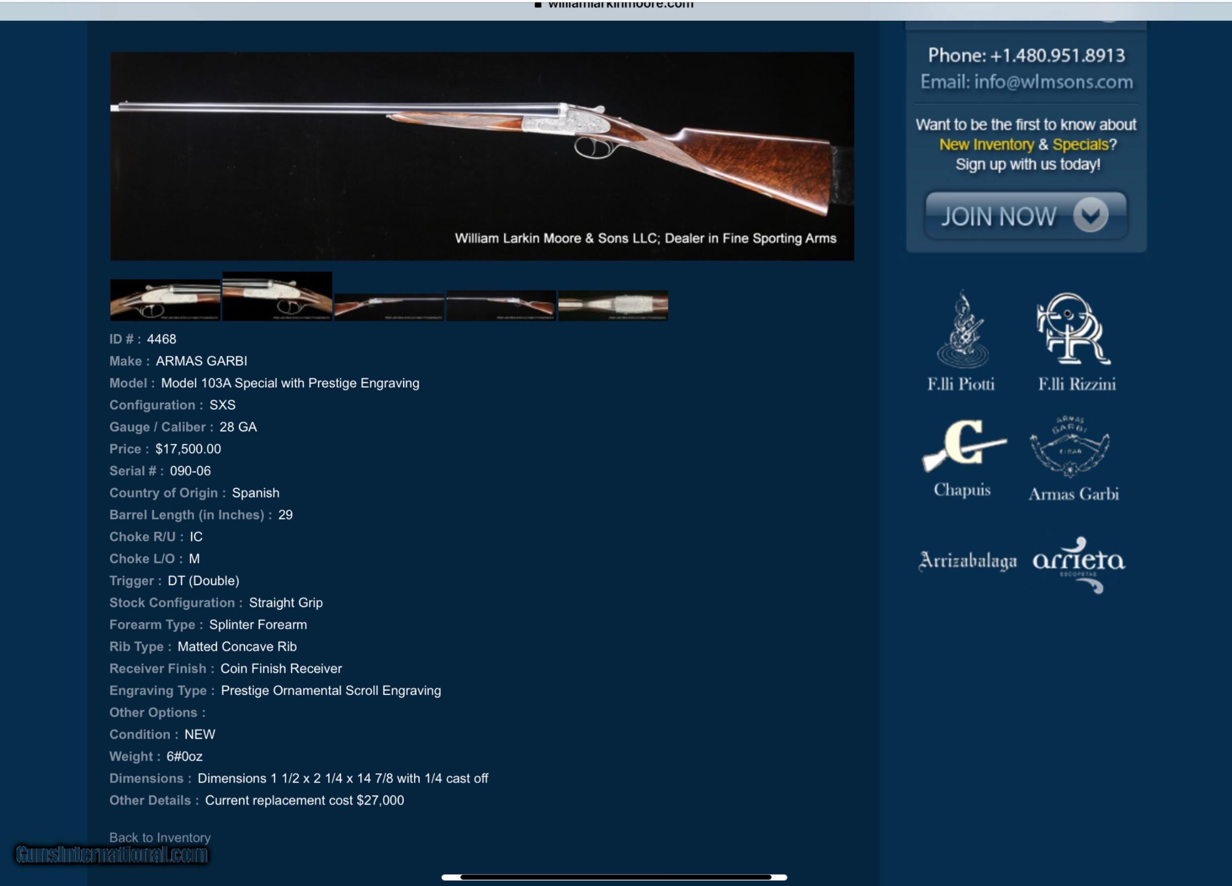Description: Hi all, I’m selling my 28 gauge Garbi 103A Special with 29” barrels. It has Prestige engraving which is a $6600 upgrade over the base 103. I’ve had it about a year and a half and have maybe 250 rounds through it. It’s just not getting the use it should. Below is a screenshot of the listing from the dealer when I got it new. I have included some pictures of some handling marks that are tough to see if you’re not looking for them. I’m asking $11,500 shipped to the CONUS and may consider a trade for a 20/28 combo sporter, Perazzi, Zoli, Beretta. Payment by Usps money order, Google Pay, Zelle or other as agreed. SOLD Shotgun Gauge: 28 Gauge Manufacturer: Garbi Model: 103A Special |