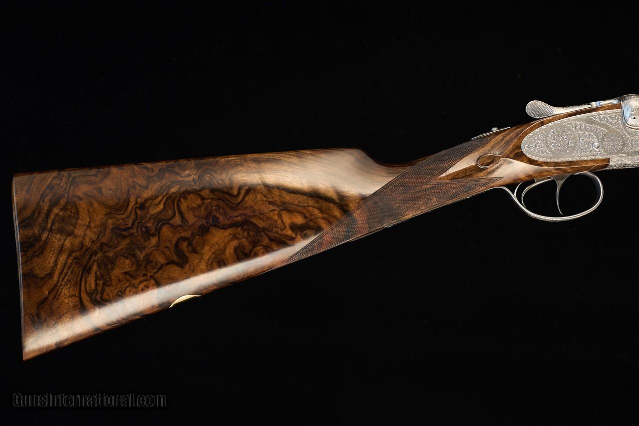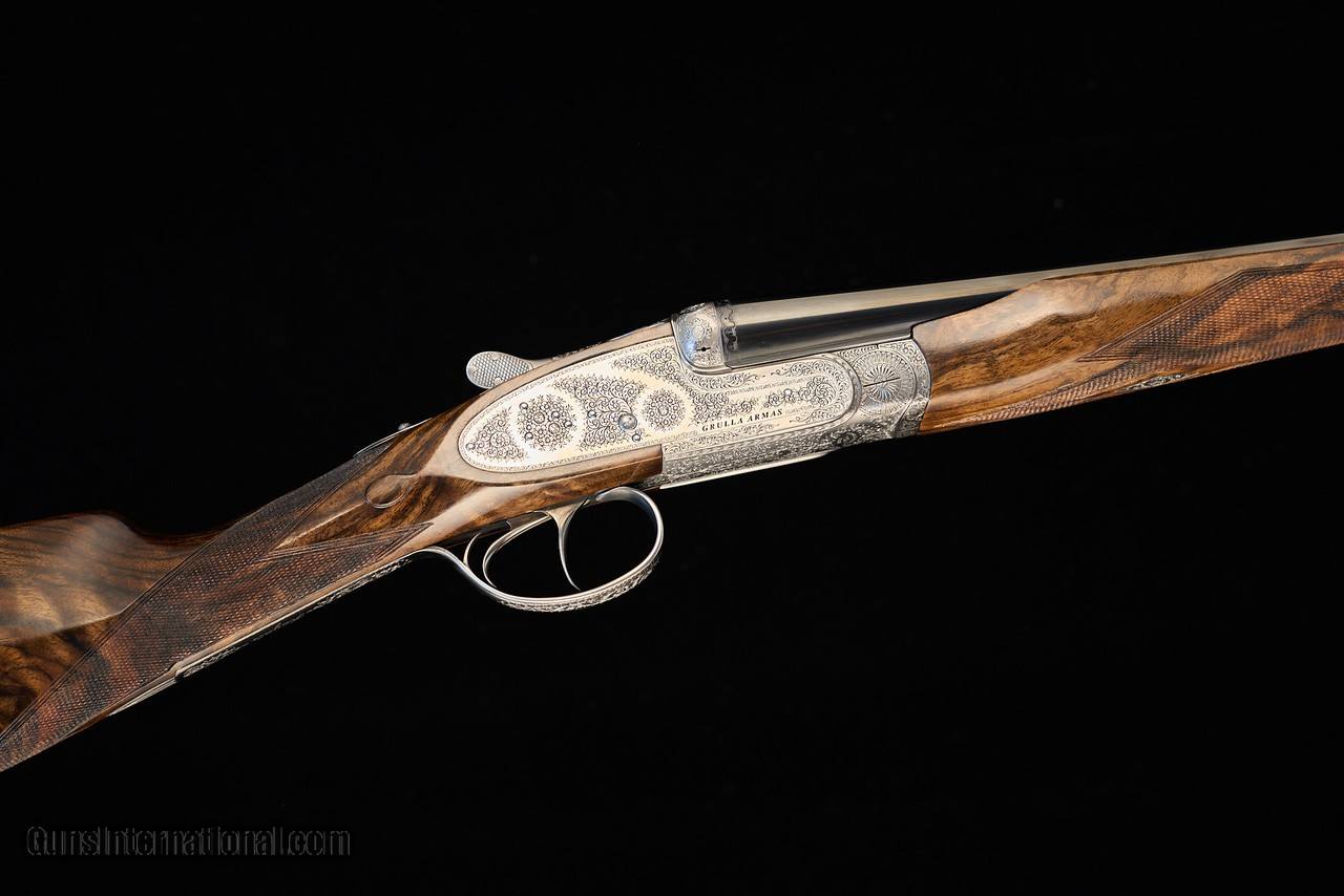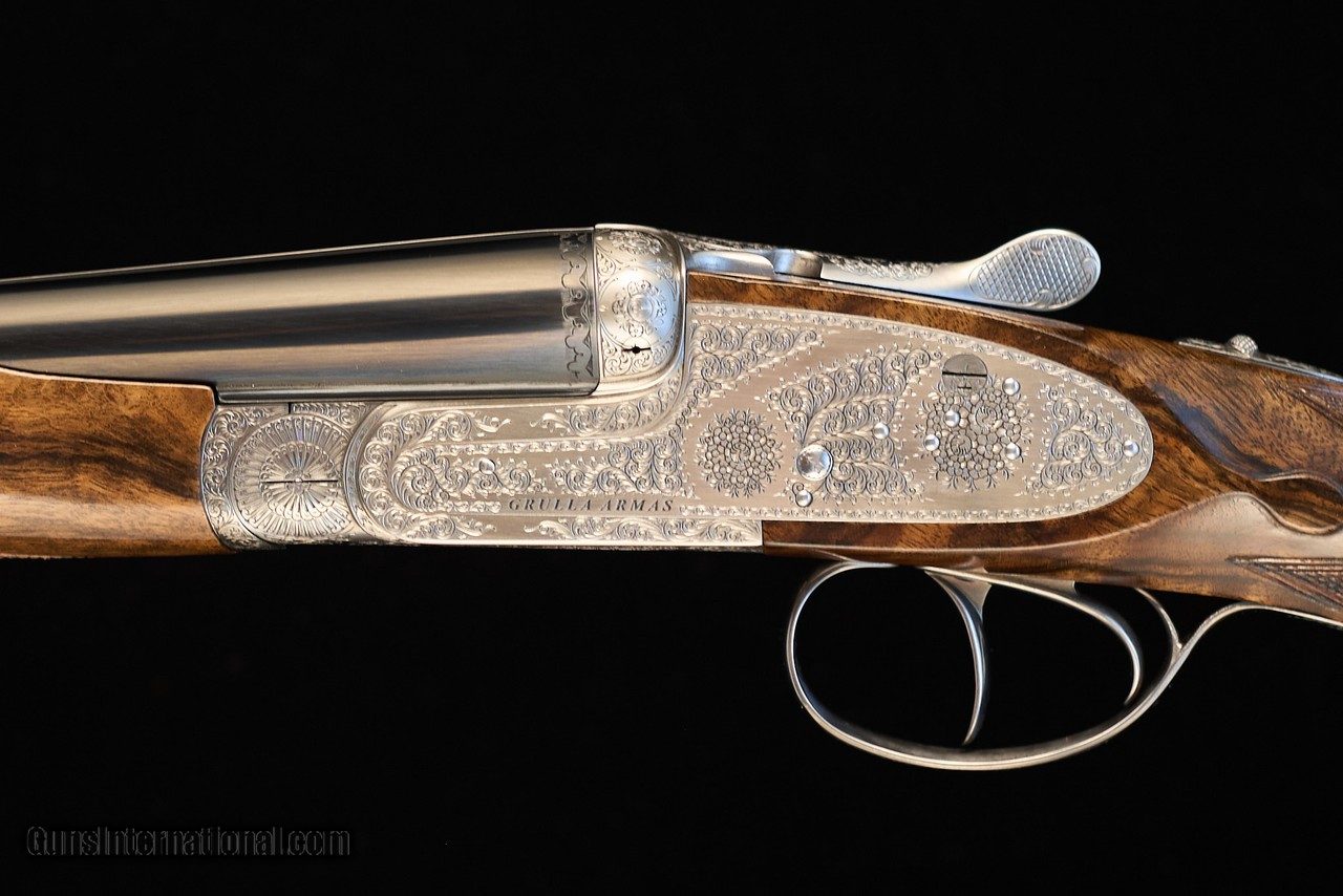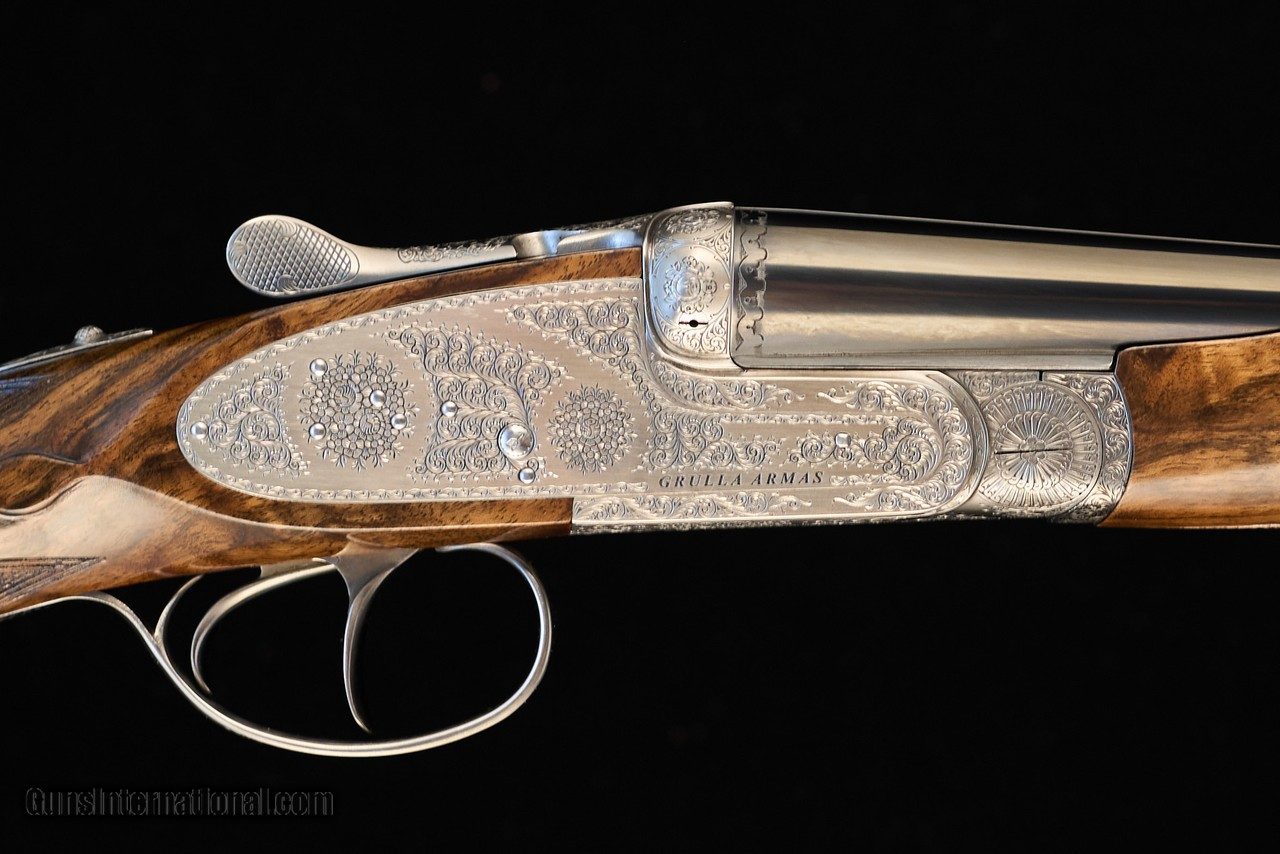 Brand new Grulla Royale 28ga/28” with coin finish over a square bar action engraved in the Purdey rose and scroll pattern. Locks are 7-pin in the Holland & Holland pattern. Beneath the forearm is an H&H style self-opening mechanism which automatically counters the force needed to recock the locks upon opening the gun. Stock is of gorgeously-figured, exhibition grade Turkish walnut with semigloss oil finish over a blank oval and checkered butt.
