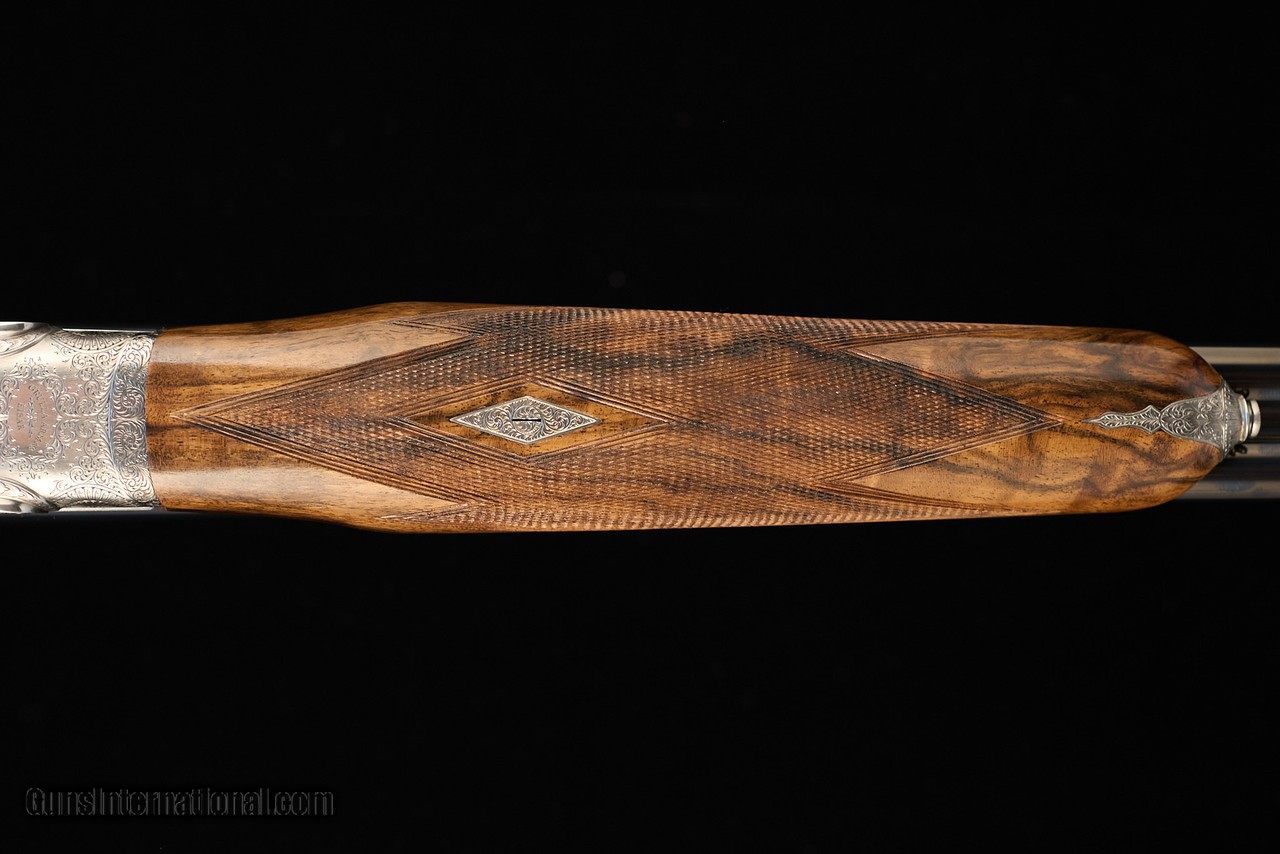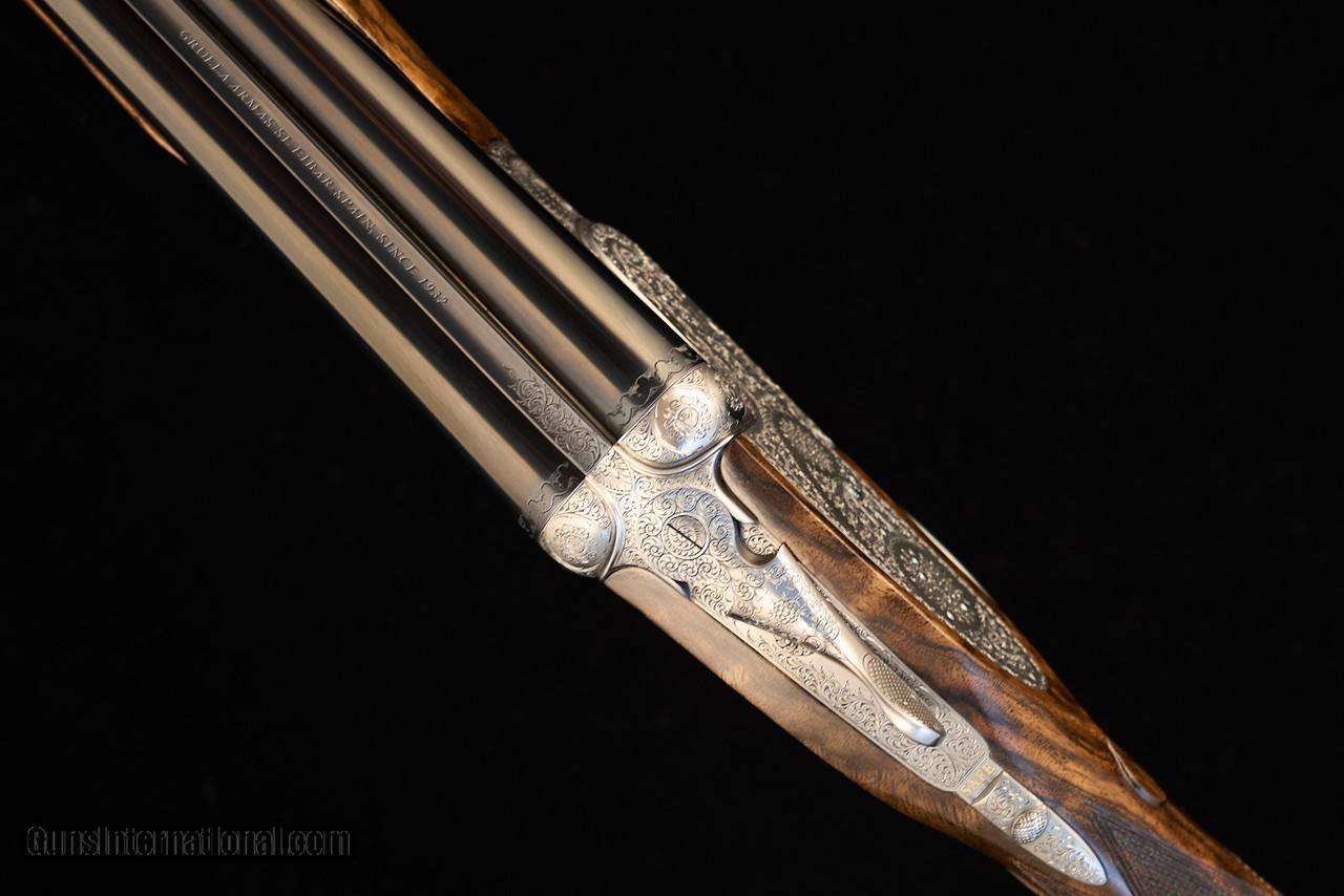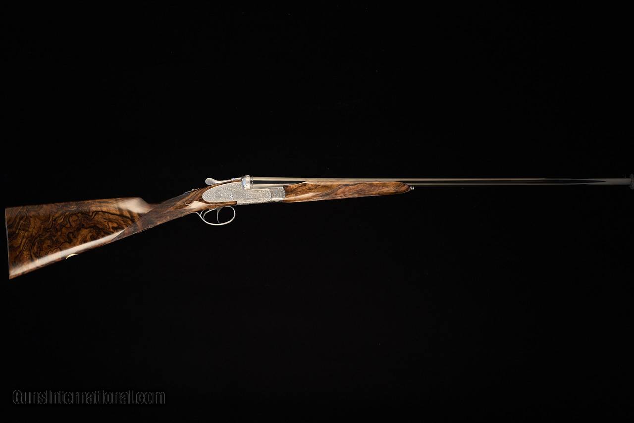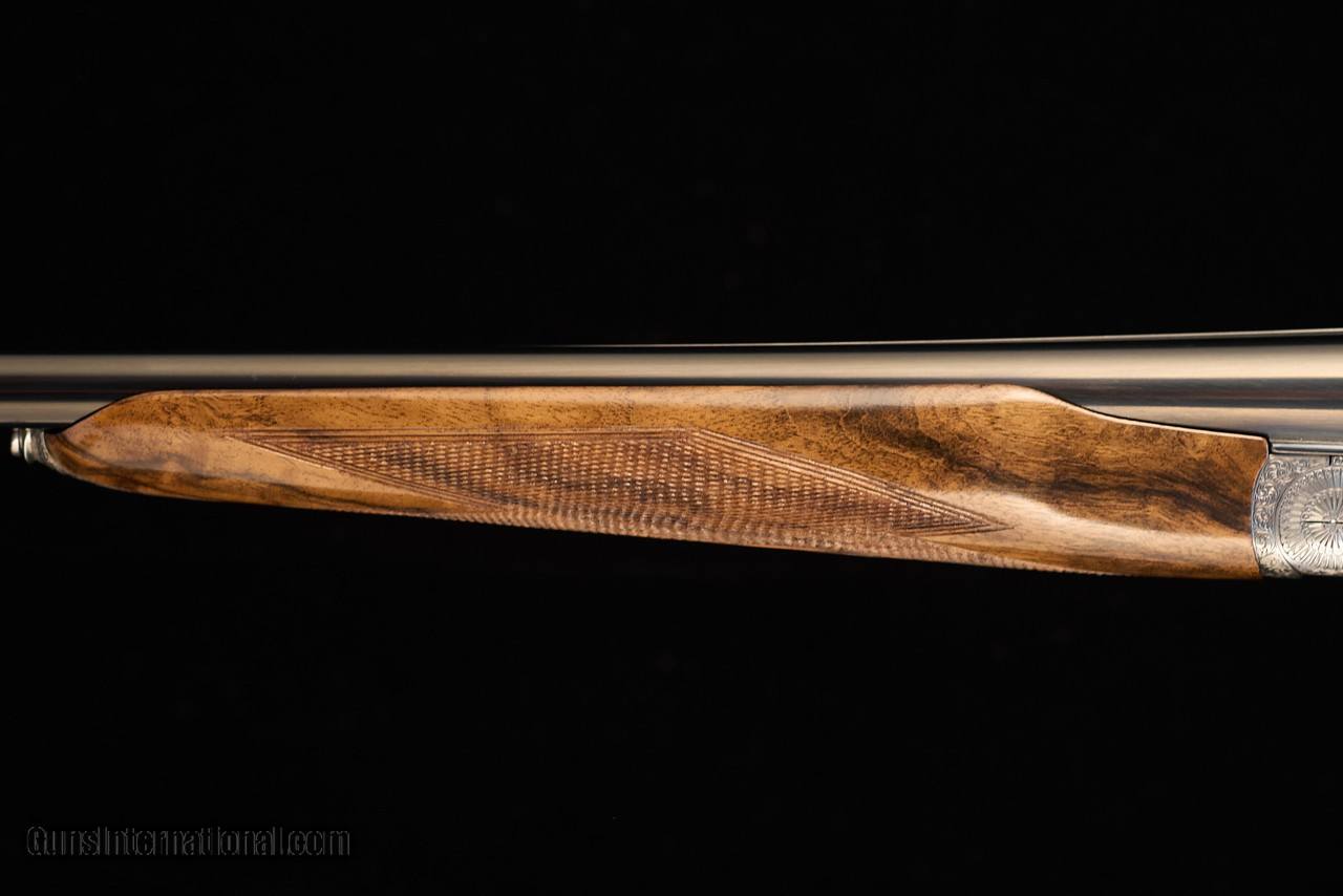Brand new Grulla Royale 28ga/28” with coin finish over a square bar action engraved in the Purdey rose and scroll pattern. Locks are 7-pin in the Holland & Holland pattern. Beneath the forearm is an H&H style self-opening mechanism which automatically counters the force needed to recock the locks upon opening the gun. Stock is of gorgeously-figured, exhibition grade Turkish walnut with semigloss oil finish over a blank oval and checkered butt.