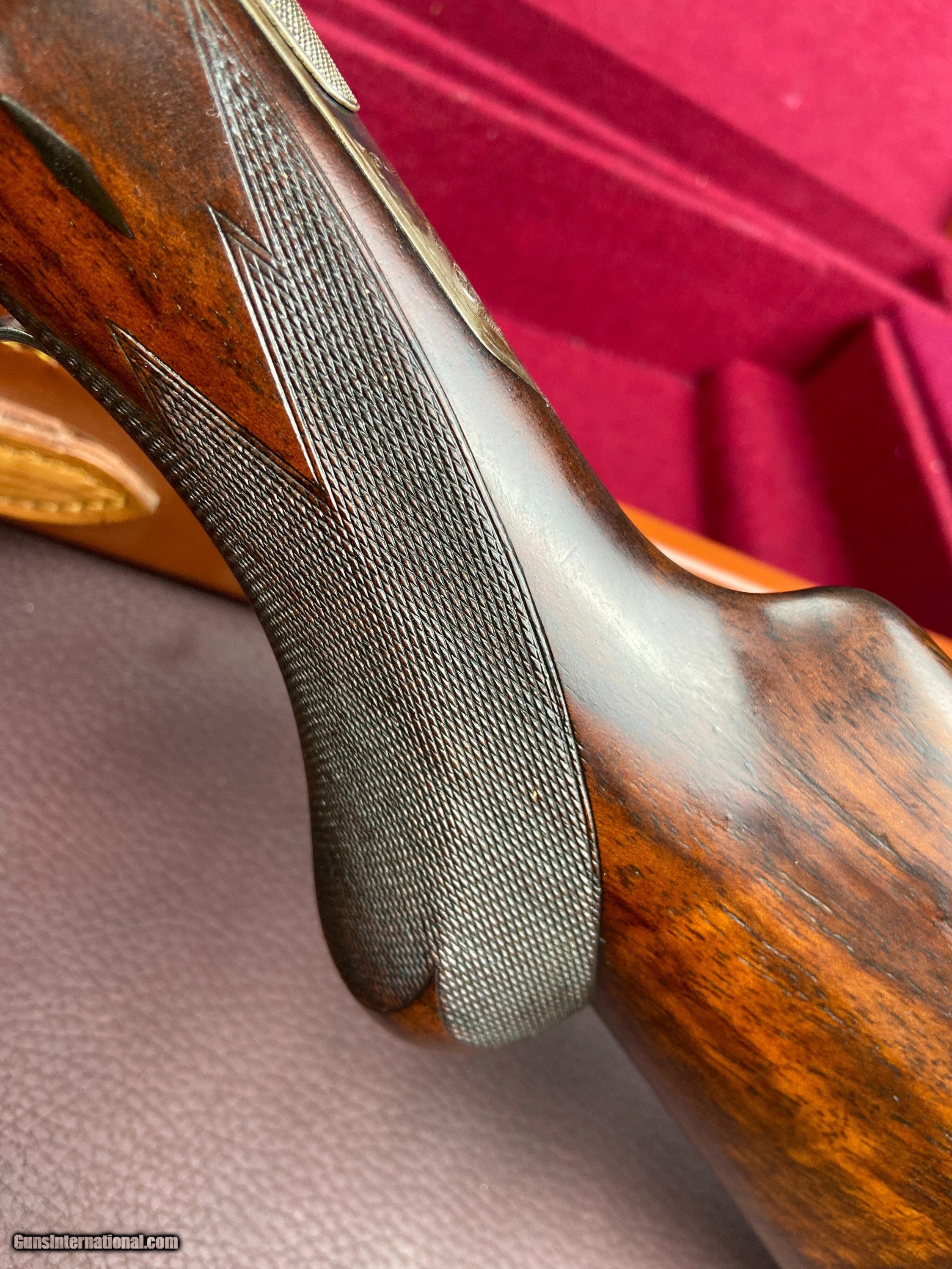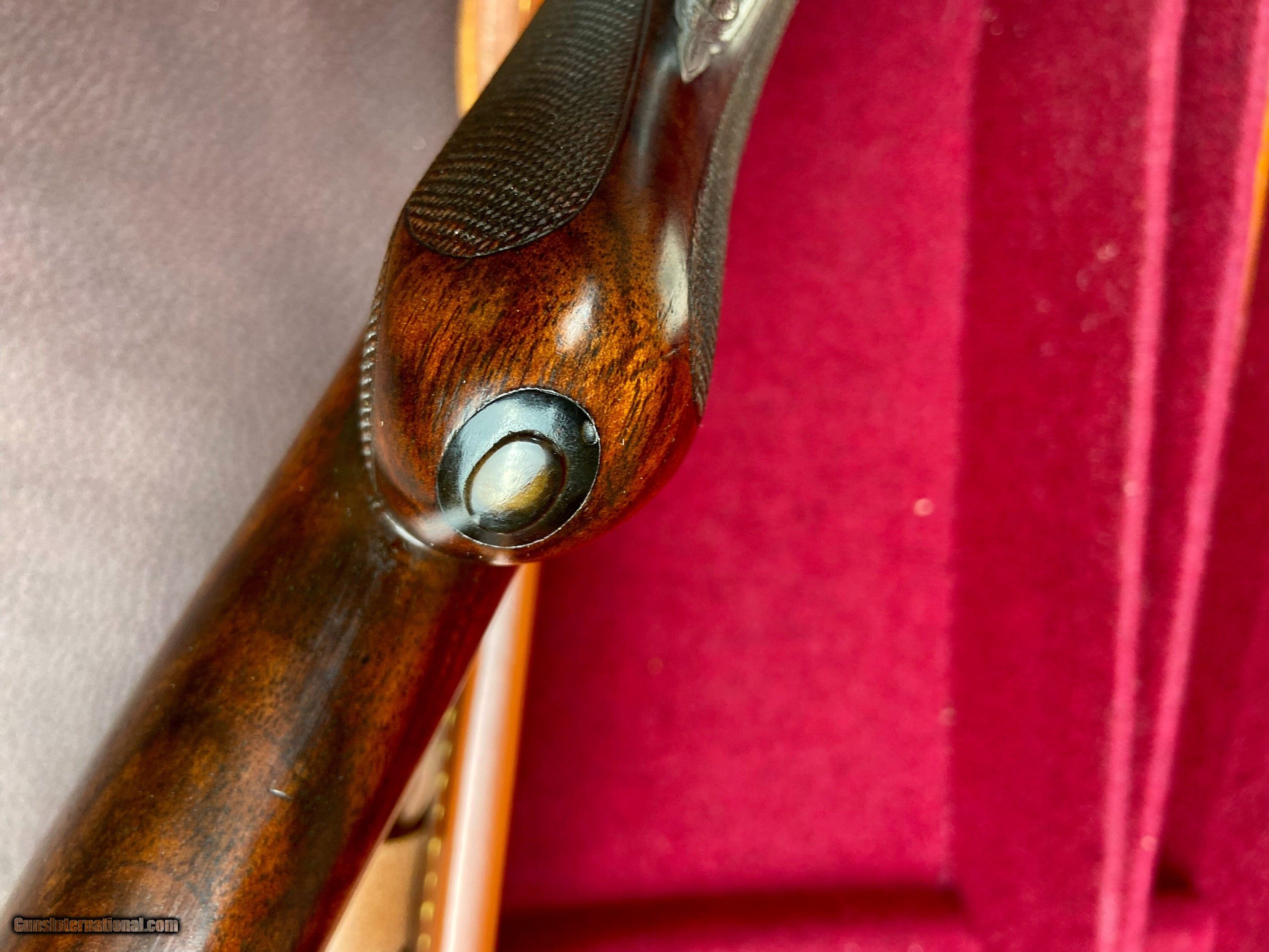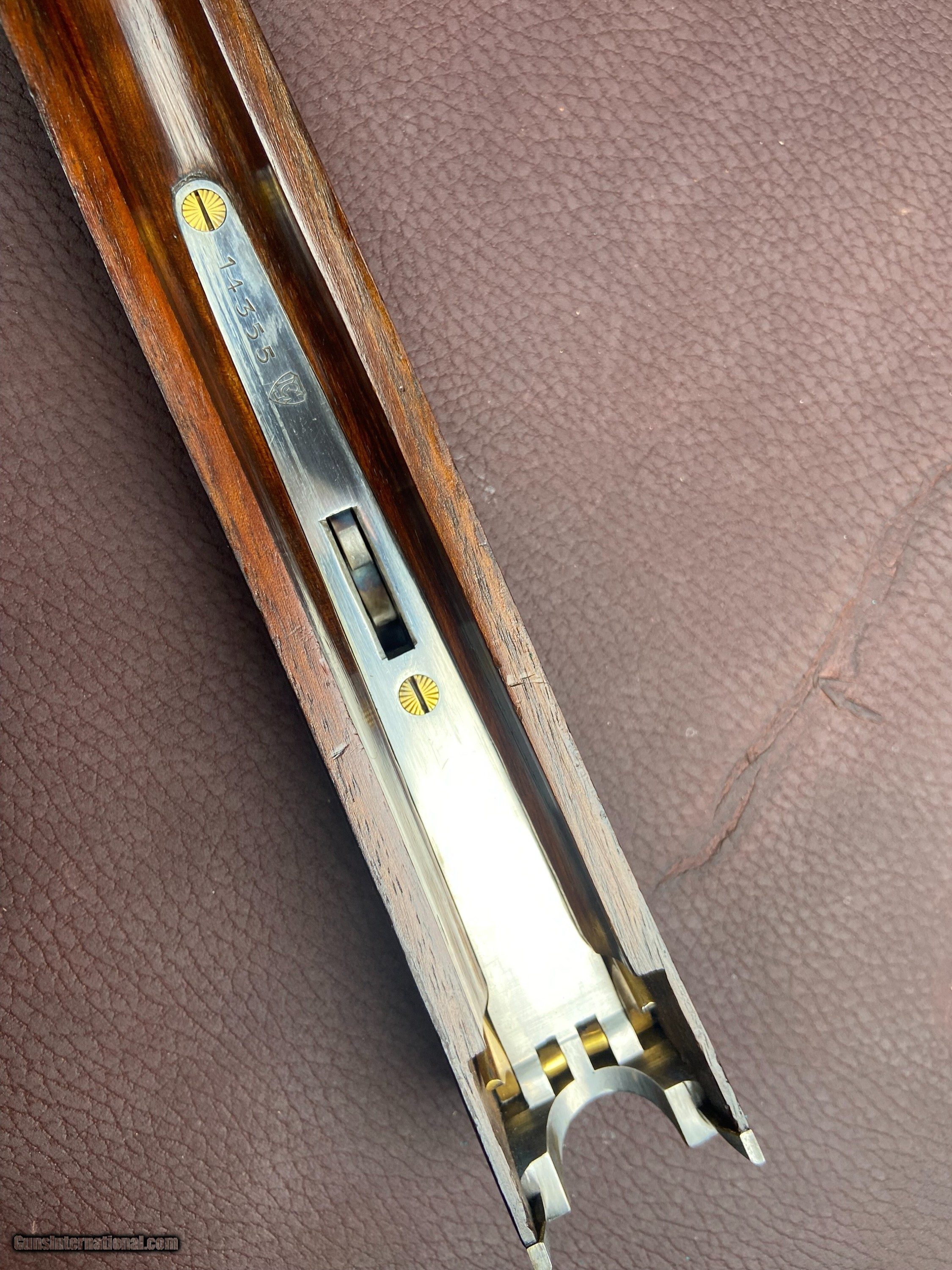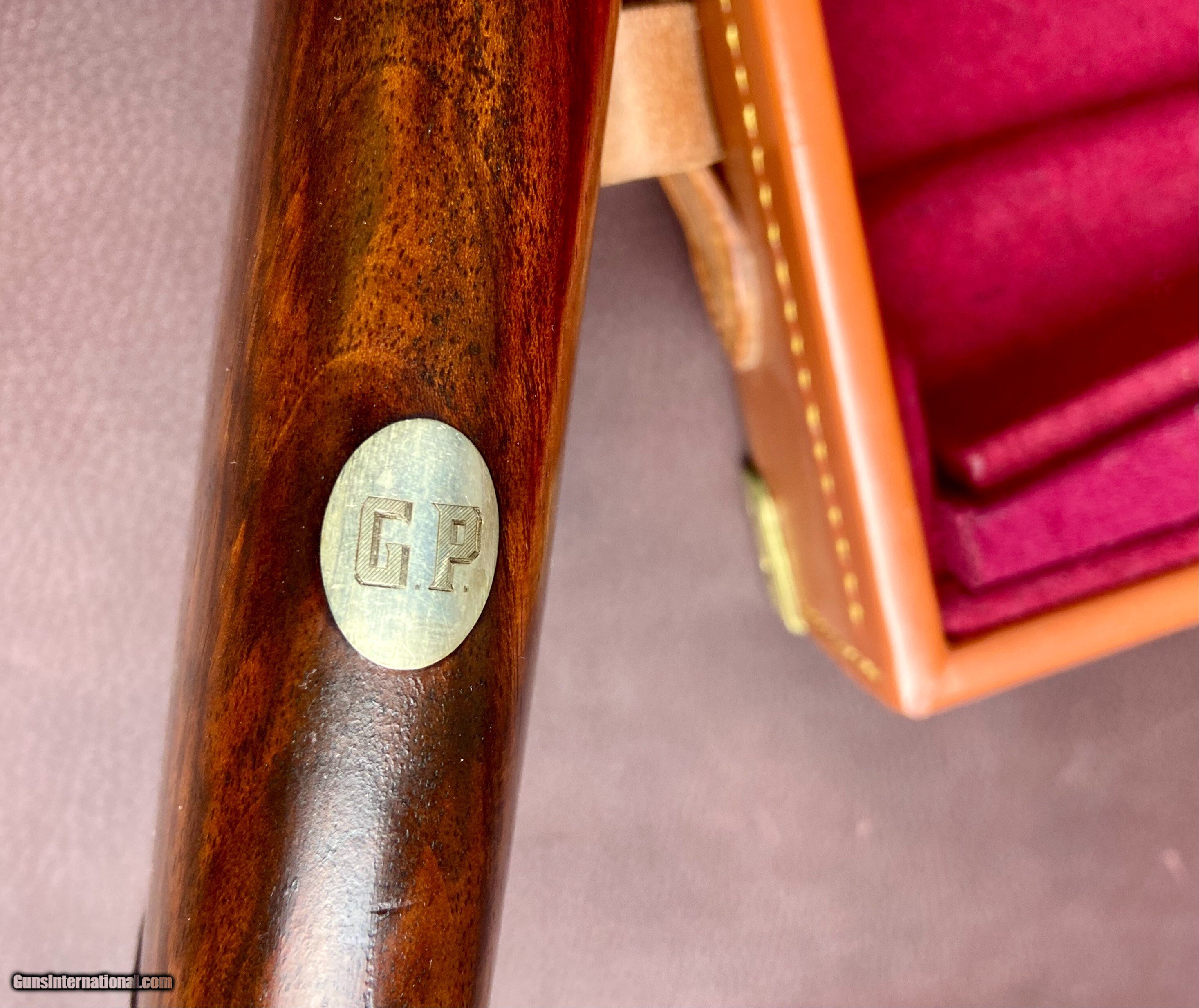 Description: BEAUTIFUL PRE-WAR MERKEL BROTHERS 0/U 28GA -- 28" CYL/IC -- EJECTORS -- SINGLE SELECTIVE TRIGGER -- GOLD WASHED INTERNALS AND EJECTORS -- POW GRIP WITH EBONY ACCENTS -- 3 PIECE FOREND -- SOLID RIB -- LEATHER CPOVERED SILVERS PAD WITH BEADING -- DEELY FOREND LATCH -- SPECIAL ORDERED BY A.F. STOEGER OF NEW YORK -- A FANTASTIC BEST QUALITY SUB SMALLBORE O/U THAT IS CASED AND REMAINS IN INCREDIBLE ORIGINAL CONDITION. Shotgun Gauge: 28 Gauge Manufacturer: MERKEL BROTHERS Barrel Length: 28 Ejectors: YES Condition: EXCELLENT Metal Condition: EXCELLENT ORIGINAL Wood Condition: EXCELLENT ORIGINAL Bore Condition: EXCELLENT Barrels: DEMI-BLOC Triggers: SINGLE SELECTIVE Stock Comb: 1 1/2 Stock Heel: 2 3/4 Fore End: 3 PIECE Butt Pad: LEATHER WITH BEADING LOP: 14 1/8 Weight: 5lbs 15oz Sights: 2 Choke Left: CYL (TOP) Choke Right: IC (BOTTOM) Case: YES -- FULL LEATHER WITH STOEGER OIL BOTTLE AND SNAP CAPS Price: $29,500.00 Contact Seller |