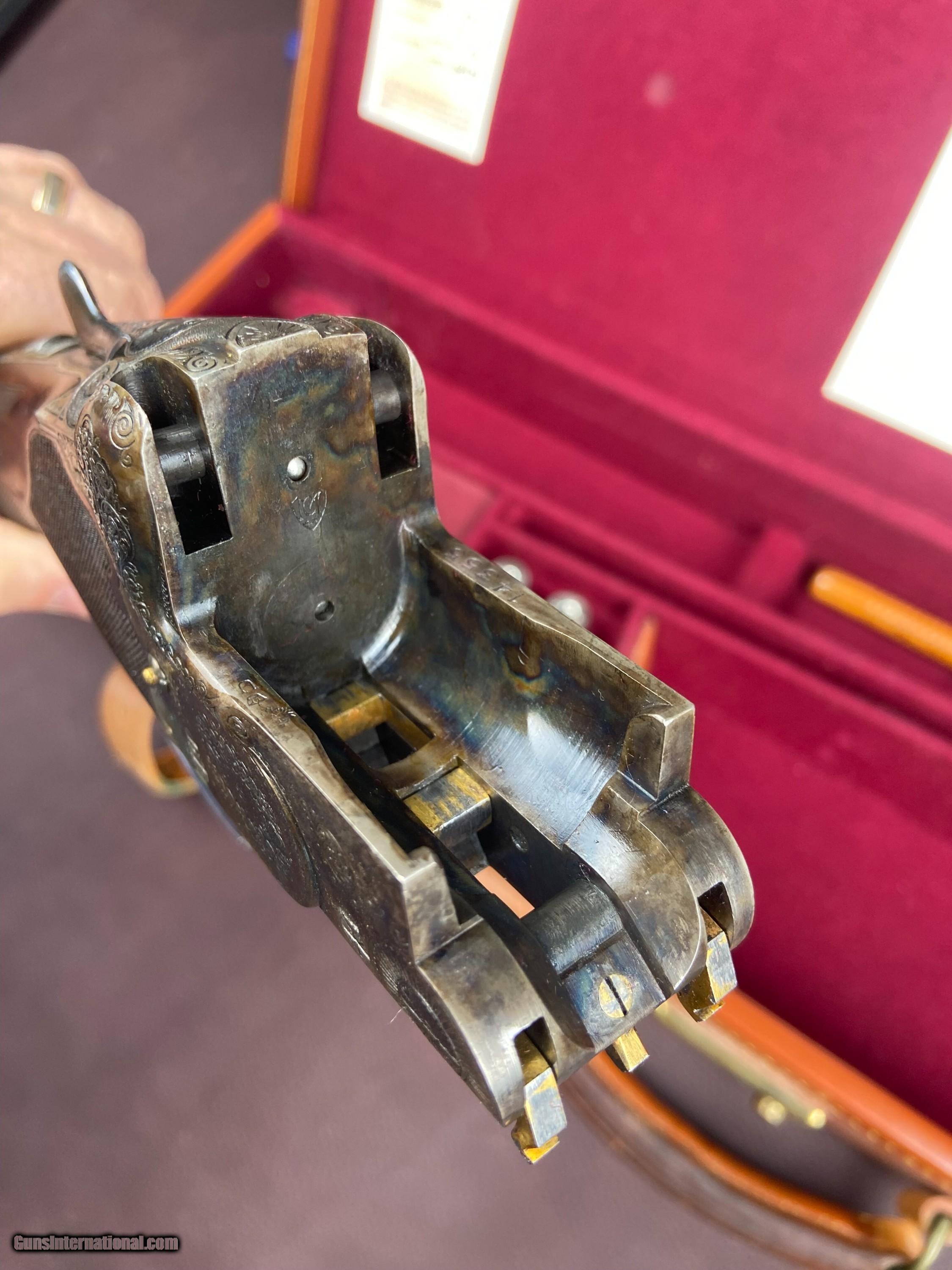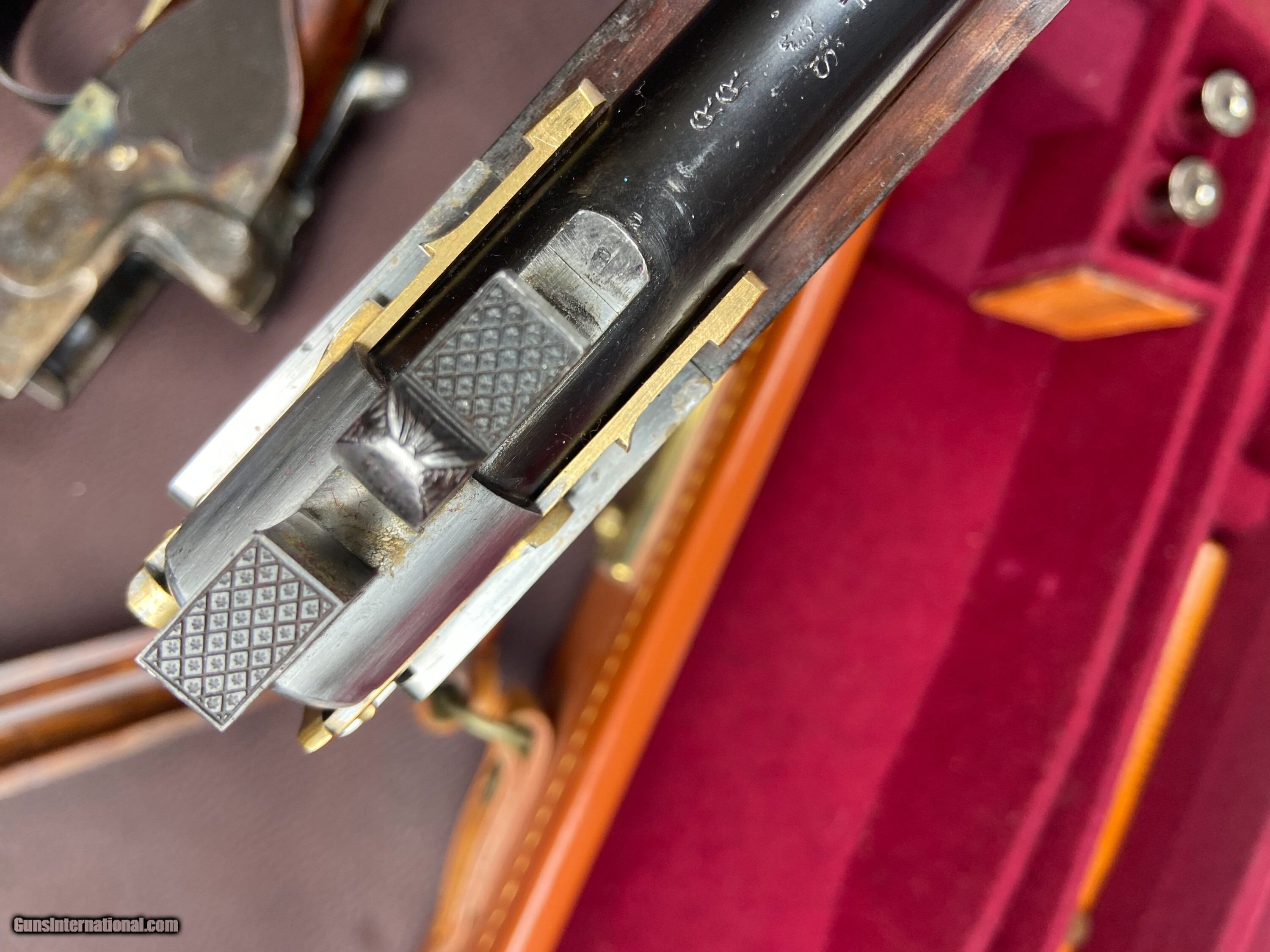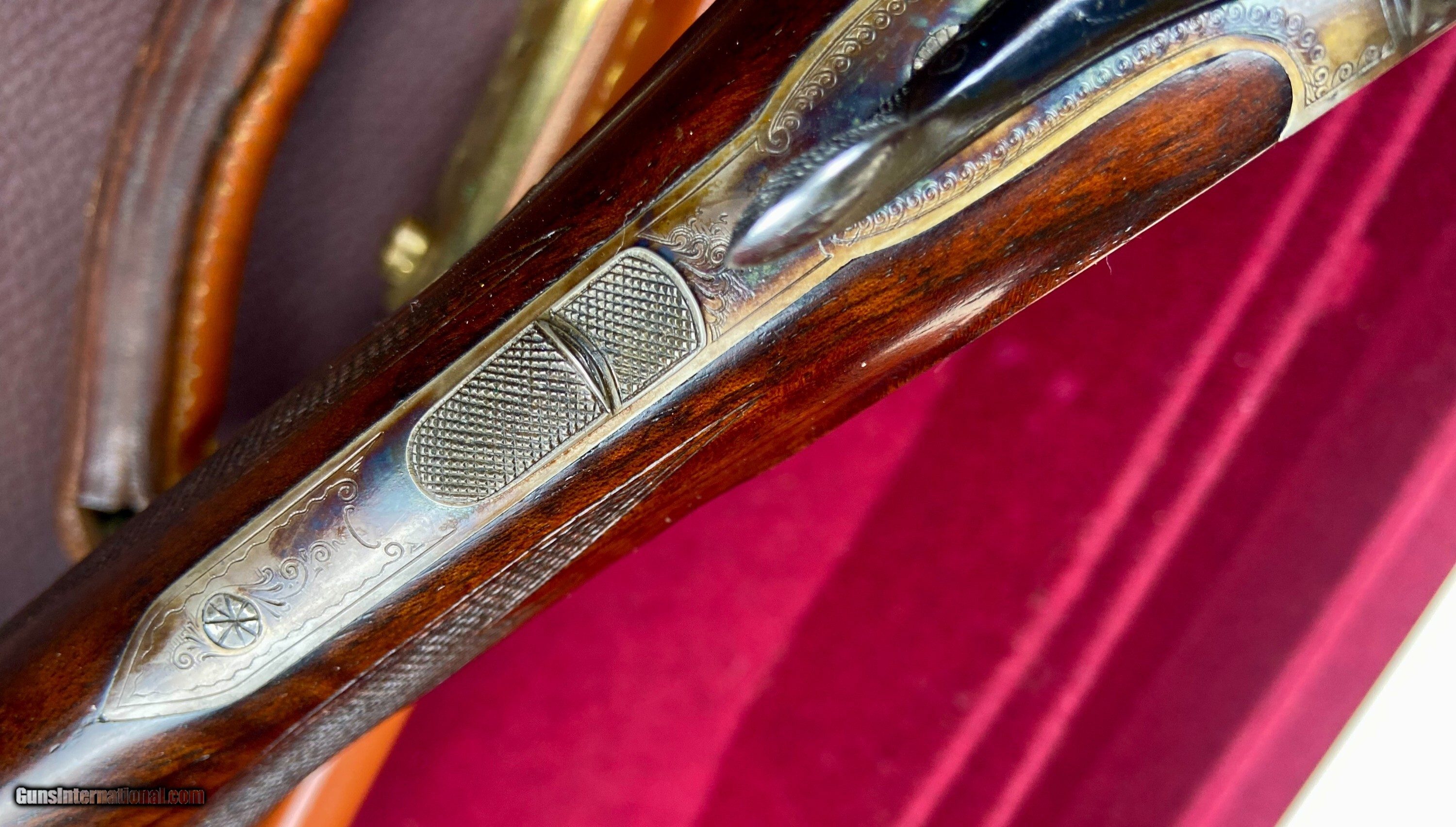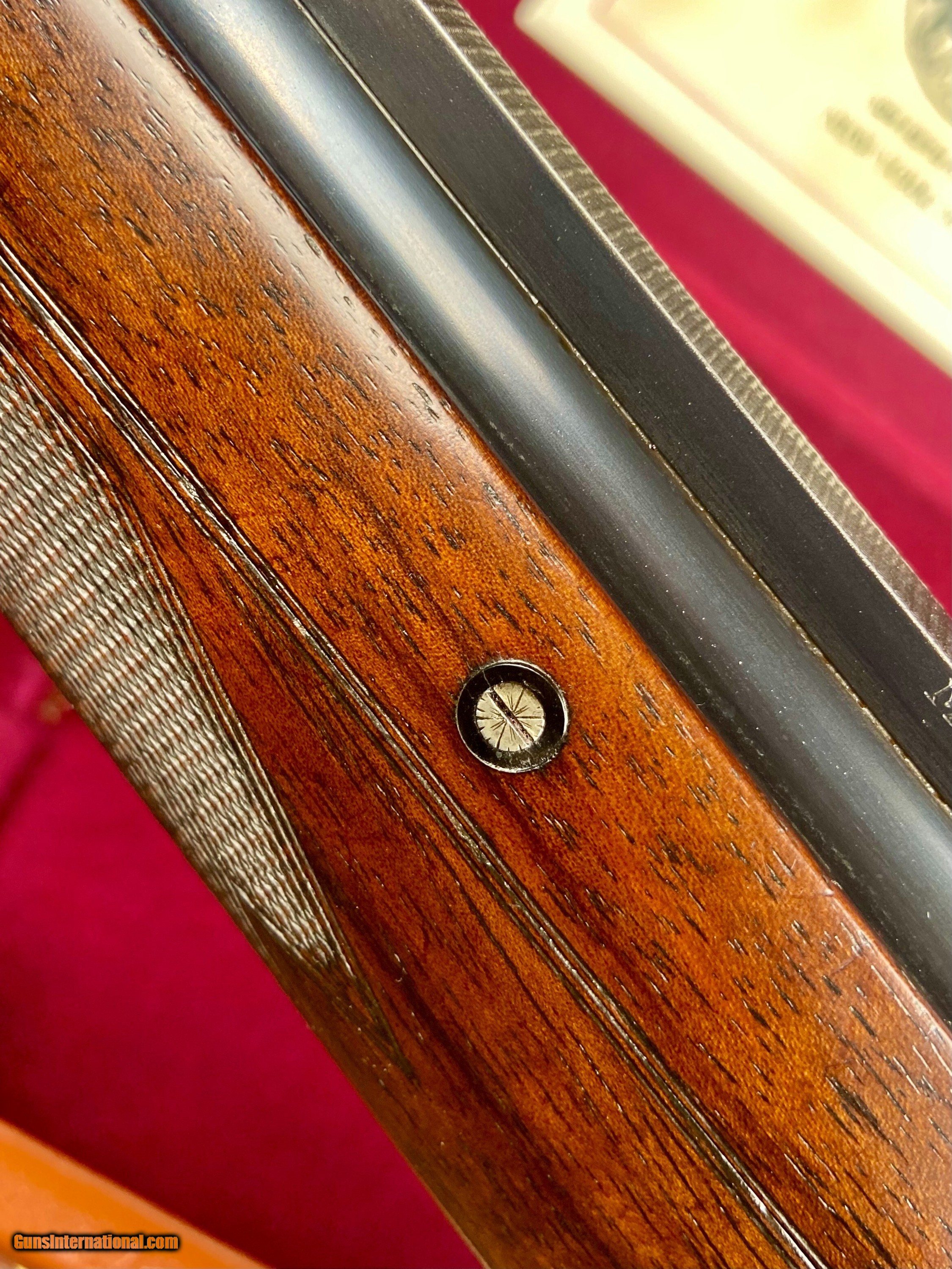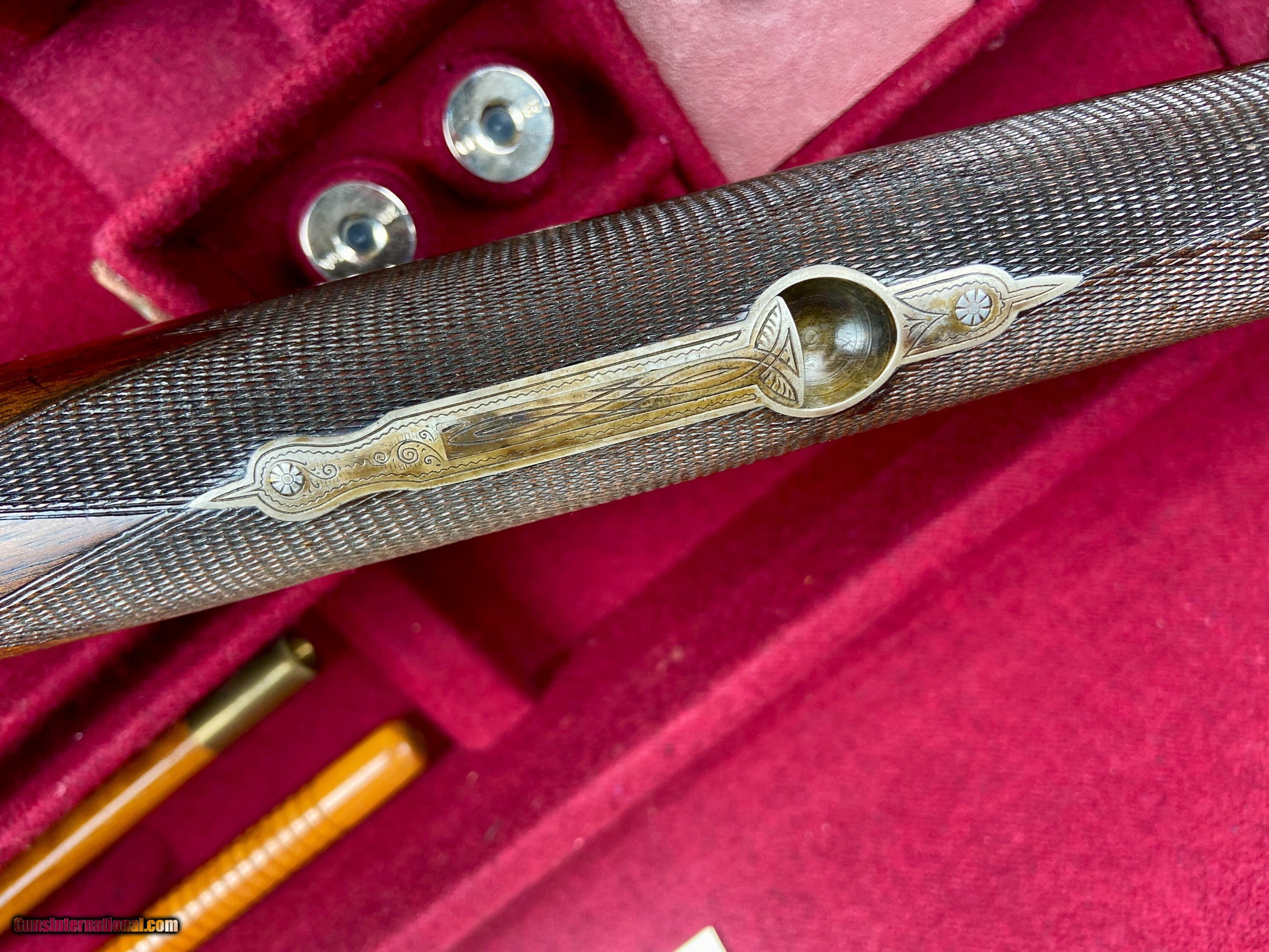 Description: BEAUTIFUL PRE-WAR MERKEL BROTHERS 0/U 28GA -- 28" CYL/IC -- EJECTORS -- SINGLE SELECTIVE TRIGGER -- GOLD WASHED INTERNALS AND EJECTORS -- POW GRIP WITH EBONY ACCENTS -- 3 PIECE FOREND -- SOLID RIB -- LEATHER CPOVERED SILVERS PAD WITH BEADING -- DEELY FOREND LATCH -- SPECIAL ORDERED BY A.F. STOEGER OF NEW YORK -- A FANTASTIC BEST QUALITY SUB SMALLBORE O/U THAT IS CASED AND REMAINS IN INCREDIBLE ORIGINAL CONDITION. Shotgun Gauge: 28 Gauge Manufacturer: MERKEL BROTHERS Barrel Length: 28 Ejectors: YES Condition: EXCELLENT Metal Condition: EXCELLENT ORIGINAL Wood Condition: EXCELLENT ORIGINAL Bore Condition: EXCELLENT Barrels: DEMI-BLOC Triggers: SINGLE SELECTIVE Stock Comb: 1 1/2 Stock Heel: 2 3/4 Fore End: 3 PIECE Butt Pad: LEATHER WITH BEADING LOP: 14 1/8 Weight: 5lbs 15oz Sights: 2 Choke Left: CYL (TOP) Choke Right: IC (BOTTOM) Case: YES -- FULL LEATHER WITH STOEGER OIL BOTTLE AND SNAP CAPS Price: $29,500.00 Contact Seller |