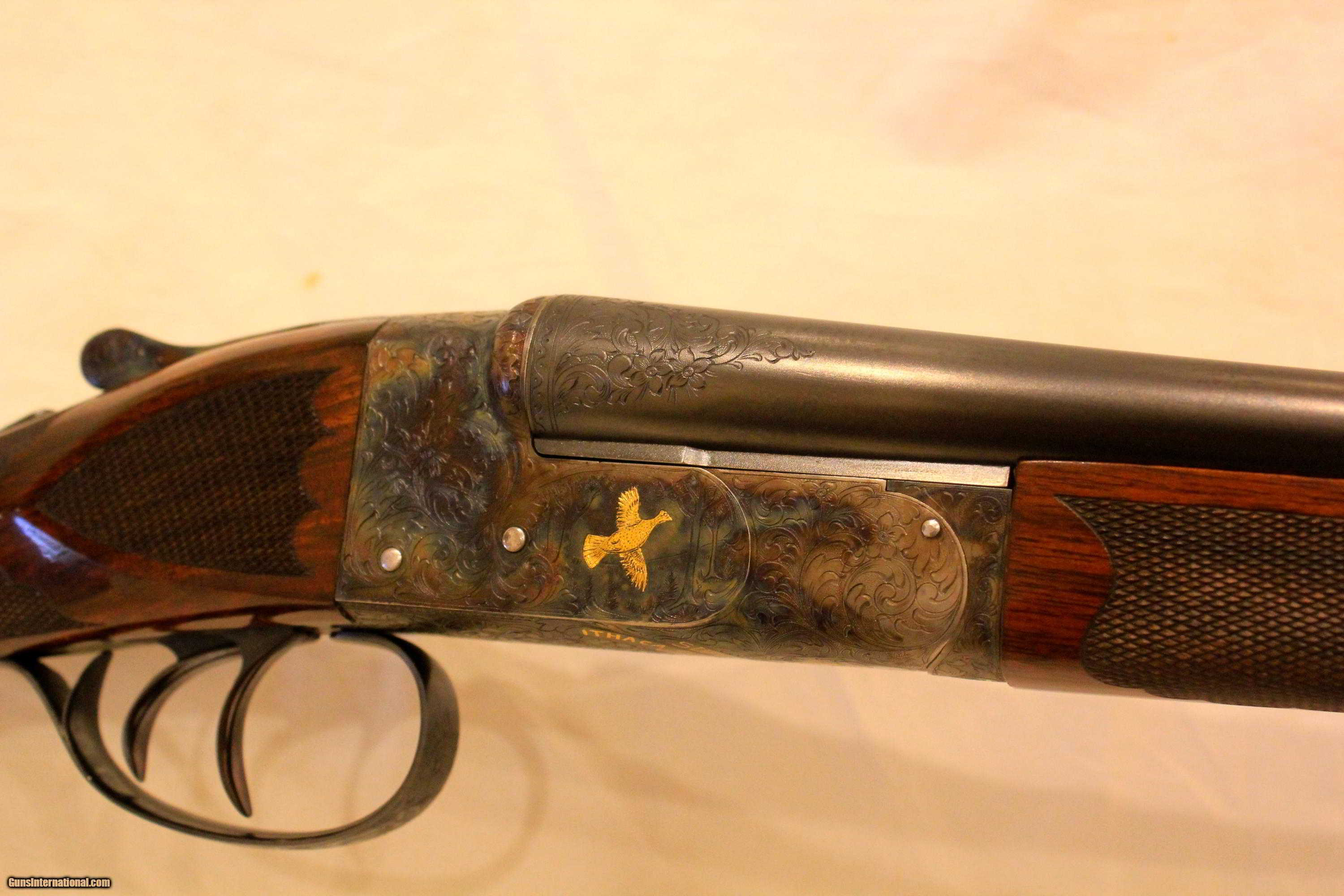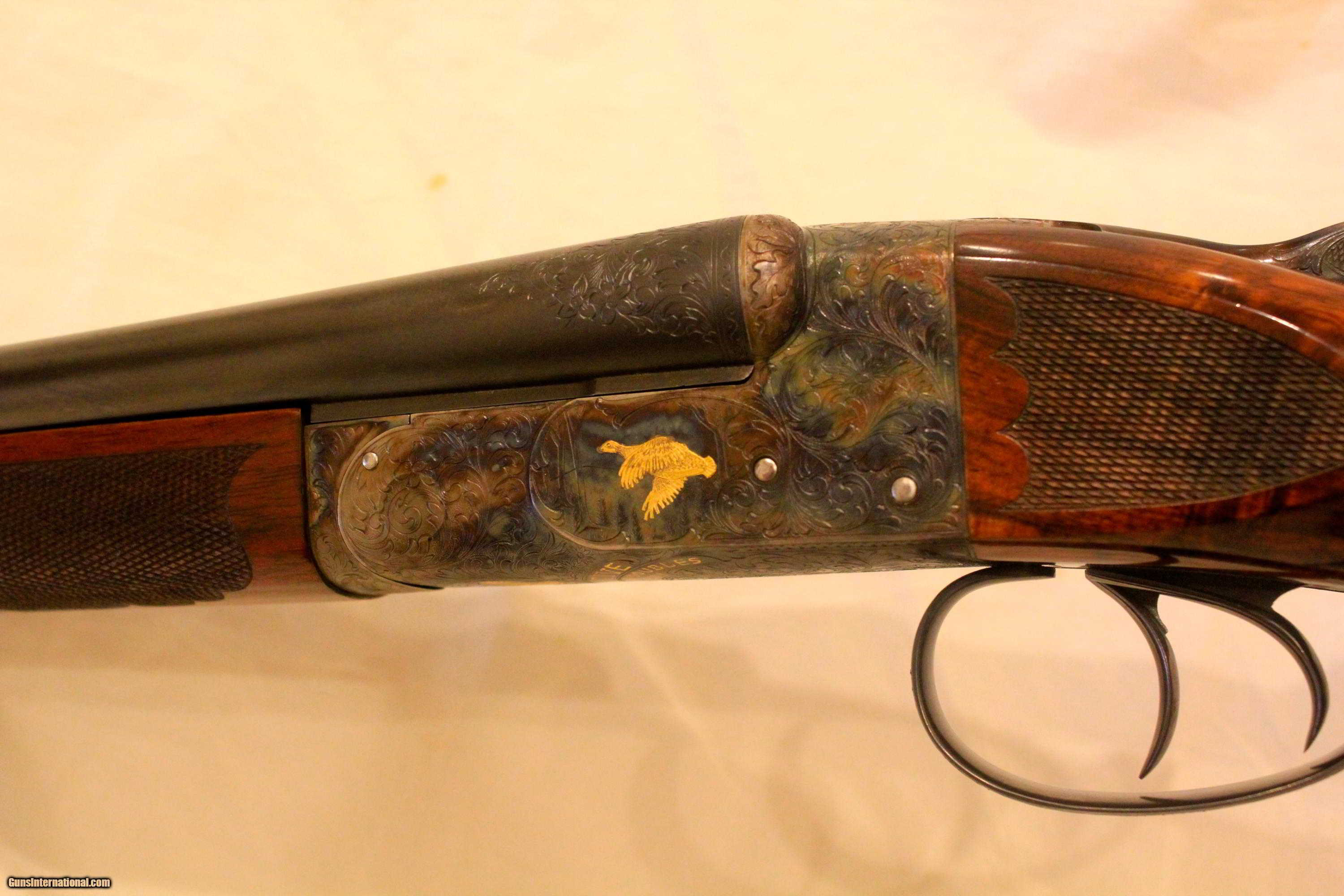 Description: a spectacular rare gun The only 28ga I have seen in the Superlative Model 28in Krupp Steel Barrels choked IM/F Beautiful wood straight english stock with a 14 1/2 LOP to a leather covered pad Double trigger gun is in overall excellent condition Cased SOLD |
