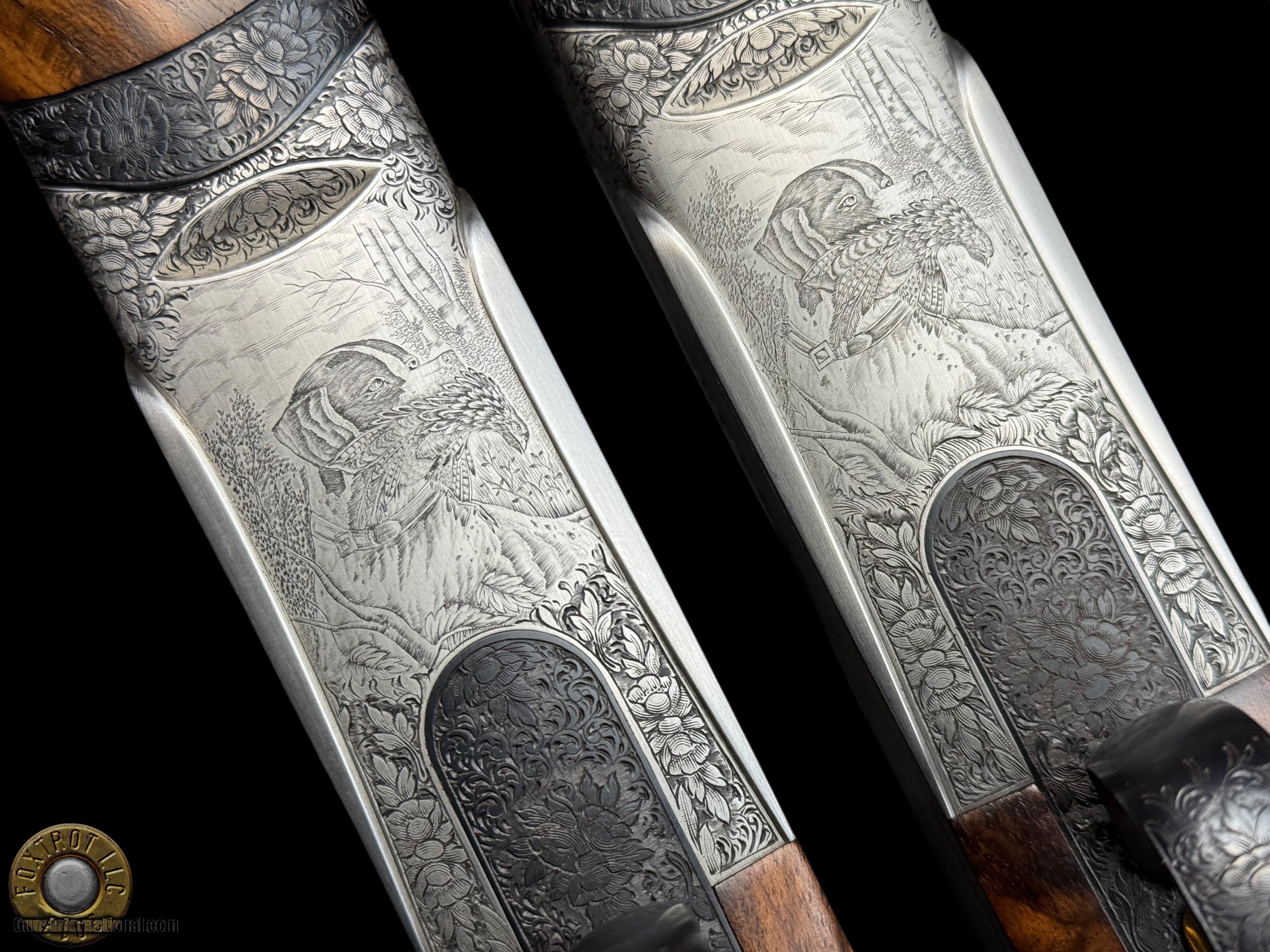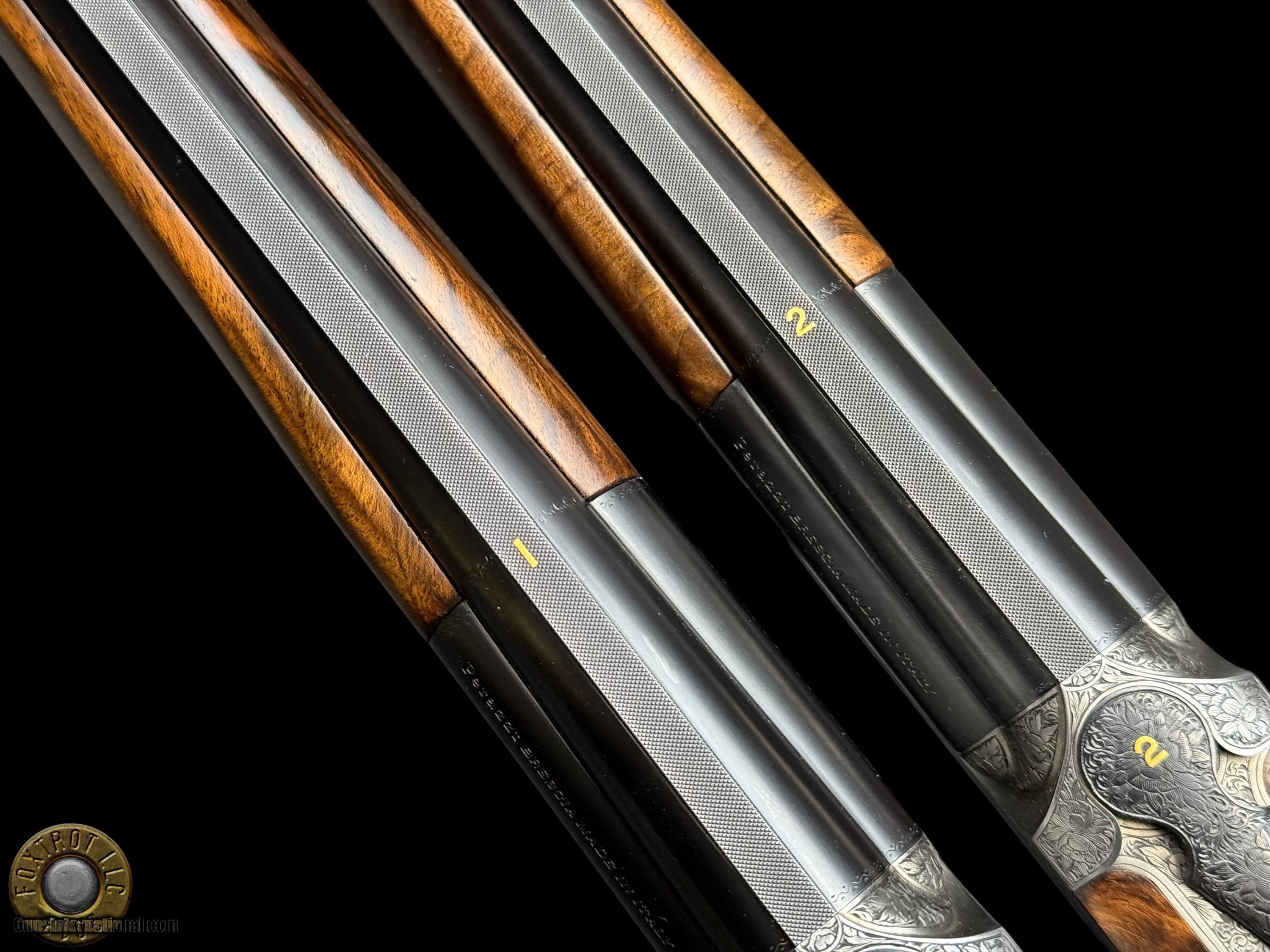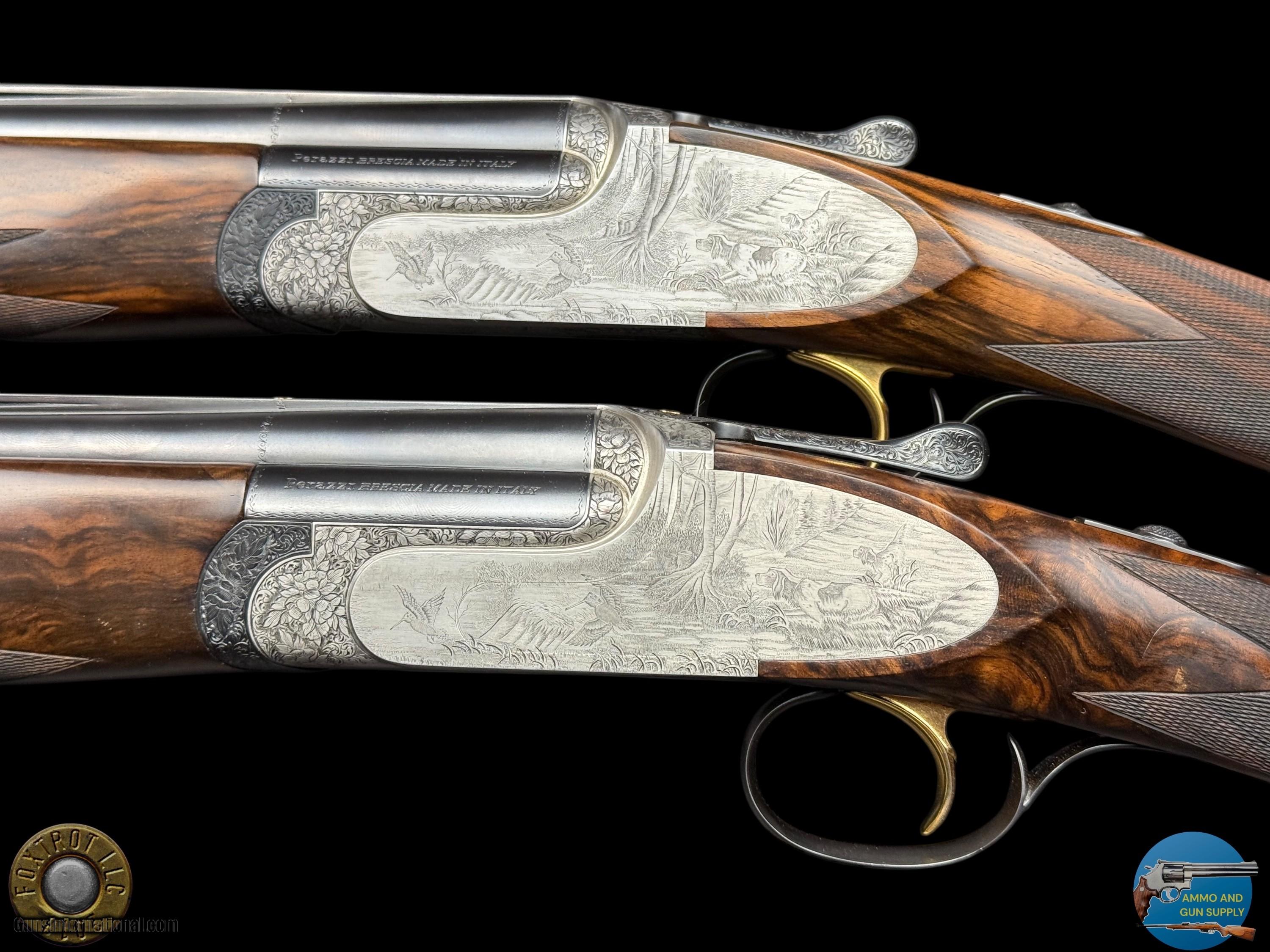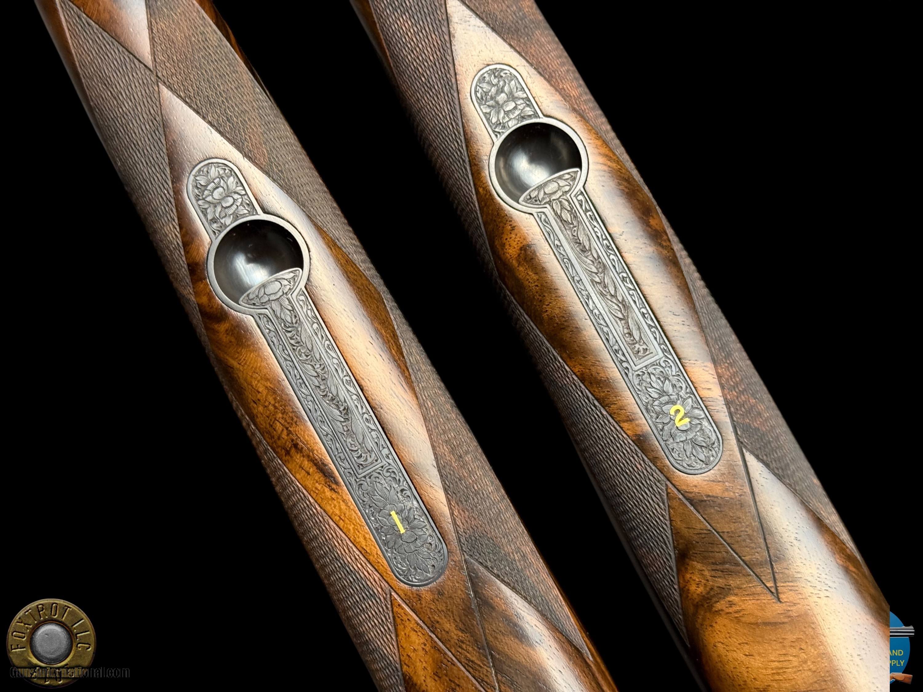 Description: PAIR PERAZZI - MX28 SCO/C - 28 GA 29.5" - 34-312-39 ENGRAVING SCENES BY PATELLI MANUFACTURER - PERAZZI - ITALY MODEL - SCO/C ACTION - SIDEPLATED NON-DETACHABLE TRIGGER GROUP ACTION WITH SINGLE SELECTIVE TRIGGER, EJECTORS AND NON-AUTO SAFETY SN - 120780 - 120781 GAUGE - 28 GAUGE 2.75" CHAMBERS BARREL LENGTH - 29.5" SOLID MID RIB BARRELS #1 CHOKED - MODIFIED .020" OF RESTRICTION / IMPROVED MODIFIED .032" OF RESTRICTION #2 CHOKED - MODIFIED .020" OF RESTRICTION / IMPROVED MODIFIED .027" OF RESTRICTION CAPACITY – 2 #1 DAC - 1.375" #1 DAH - 1.875" #1 LOP - 14.875" #1 WEIGHT - 6 LB 4.1 OZ #2 DAC - 1.375" #2 DAH - 1.625" #2 LOP - 14.875" #2 WEIGHT - 6 LB 2.3 OZ SIGHTS - MATTED VENT RIB WTIH SILVER FRONT BEAD PRODUCED - 2001 A truly rare opportunity for the discerning Perazzi collector and sub-gauge enthusiast—this is a matched pair of Perazzi MX28 SCO/C shotguns in 28 gauge, serial numbered 120780 & 120781, and built to the exacting standards that have made Perazzi synonymous with world-class competition and bespoke craftsmanship. Produced in 2001, both guns are fitted with beautifully balanced 29.5" solid mid-rib barrels and chambered for 2.75" 28 gauge, delivering the quick handling, smooth recoil impulse, and refined feel that makes the 28 gauge so addictive on the sporting course and in the field. Weights are ideal for long days of shooting—Gun #1 at 6 lb 4.1 oz and Gun #2 at 6 lb 2.3 oz—with both guns carrying the same 14.875" length of pull, making this pair perfectly suited for a consistent, seamless transition between guns. Chokes are set up for serious versatility and target work: both feature Modified (.020") as the first choke, paired with Improved Modified in the second barrel (.032" on Gun #1 and .027" on Gun #2), a highly effective combination for sporting clays, birds over dogs, and driven-style presentations where precision matters. The SCO/C sideplated actions showcase Perazzi’s unmistakable elegance, combining performance-driven design with genuine Italian artistry. These guns feature a non-detachable trigger group with a single selective trigger, strong ejectors, and a non-auto safety, providing a fast, competition-ready manual of arms with the reliability Perazzi is known for. Both shotguns are in excellent overall condition, showing only faint evidence of handling—bores are clear, triggers are crisp, the actions cycle smoothly, and both guns lock up tight, remaining mechanically excellent throughout. What truly elevates this pair into the collector-grade category is the engraving: the sideplated receivers are adorned with the highly desirable Perazzi engraving scenes—Left #34 / Right #29 / Bottom #312—executed by master engraver Patelli, and signed on the left sideplate, a level of provenance and craftsmanship that stands apart from standard production guns. The metal retains almost all of its original finishes, presenting with the refined look expected of a premium Perazzi pair. Completing the package are the stunning exhibition-grade straight-grip walnut stocks and matching forends on both guns, featuring dark, flowing grain patterns that are rich, bold, and exceptionally attractive—exactly what you want in a true matched set. The straight-grip configuration enhances elegance and fast handling while maintaining excellent control, especially in a lightweight 28 gauge platform that rewards quick mounting and natural pointing. This pair is housed in its original Perazzi leather ABS case, complete with manuals, making it a ready-to-own, ready-to-enjoy ensemble that checks every box: matched serials, premium engraving by a known master, excellent condition, ideal barrel length, and a gauge that delivers pure shooting pleasure. Matched Perazzi pairs like this do not surface often—especially in 28 gauge—and this set offers both the rarity collectors seek and the performance serious shooters demand. FLAT $100 S/H/I. 4%CREDIT CARD FEE APPLIES. FOXTROT IS A LICENSED FFL DEALER WITH MANY POSITIVE FEEDBACKS SO BUY WITH CONFIDENCE! Shotgun Gauge: 28 Gauge Price: $80,000.00 Contact Seller |