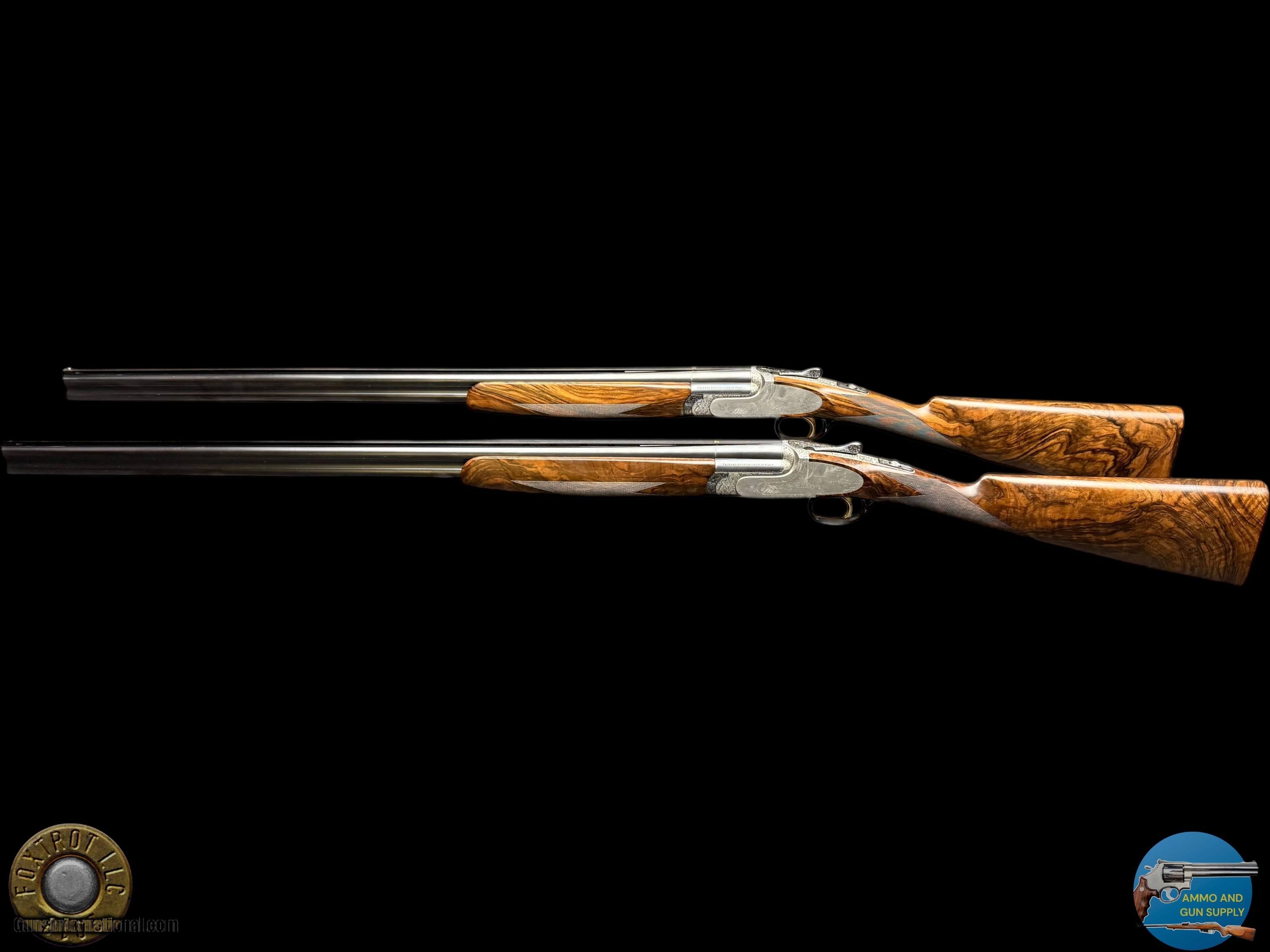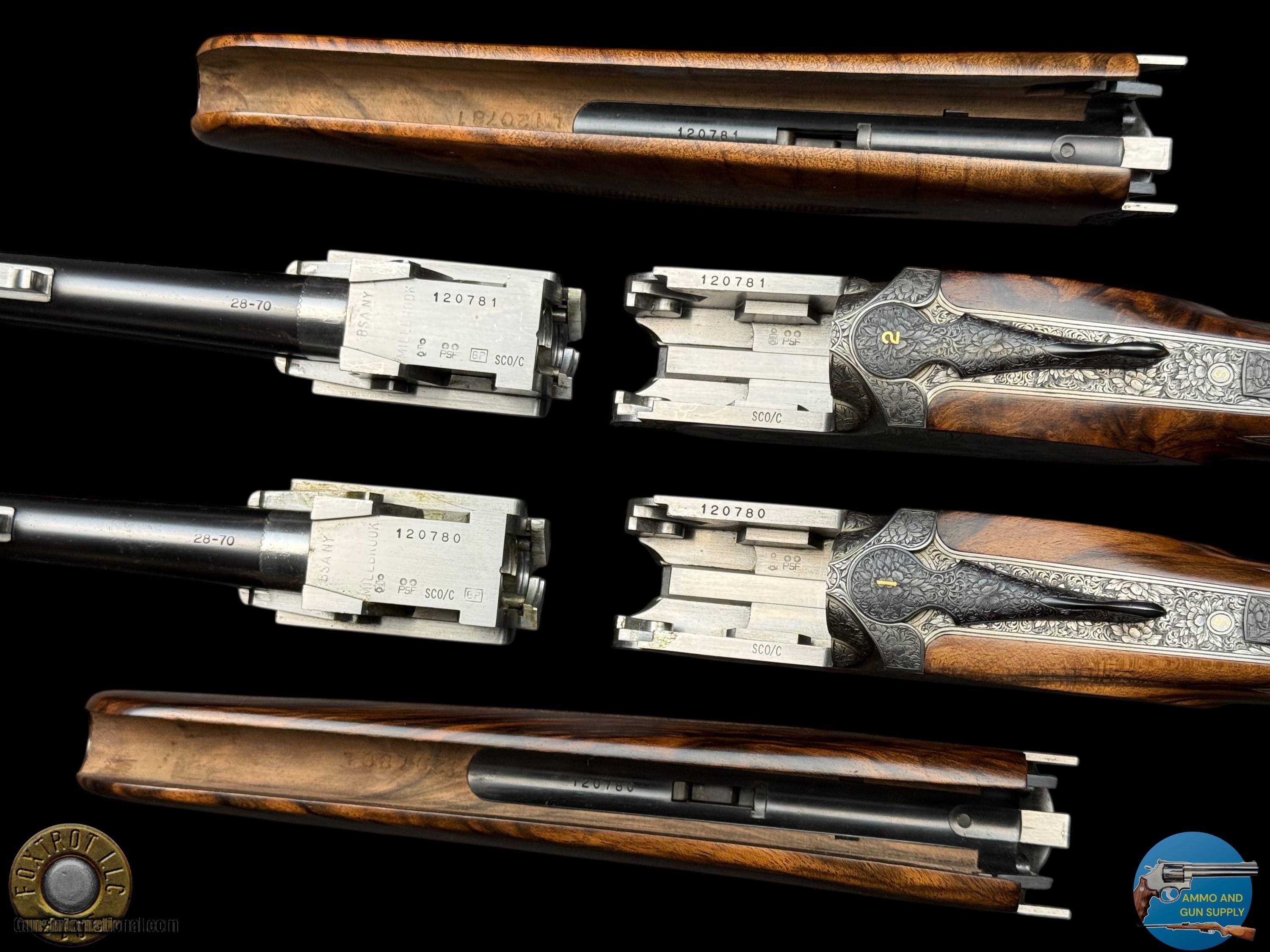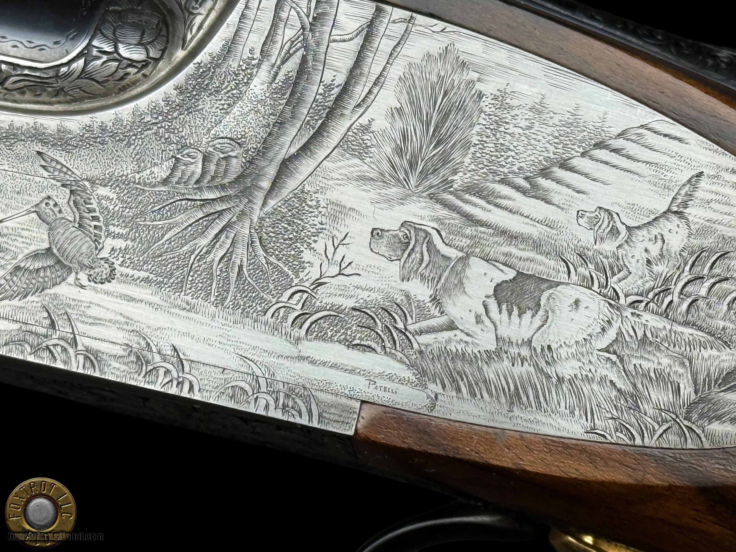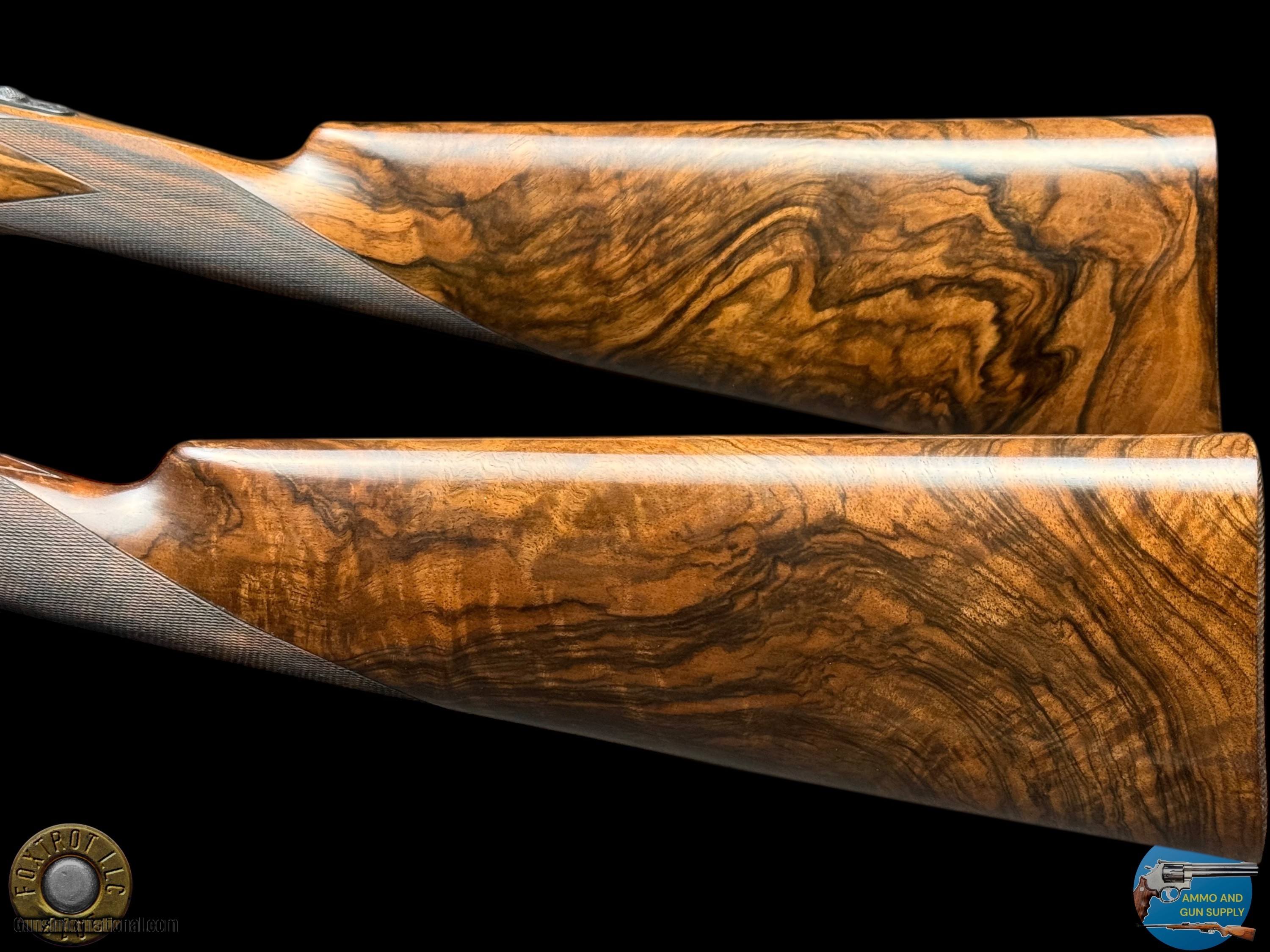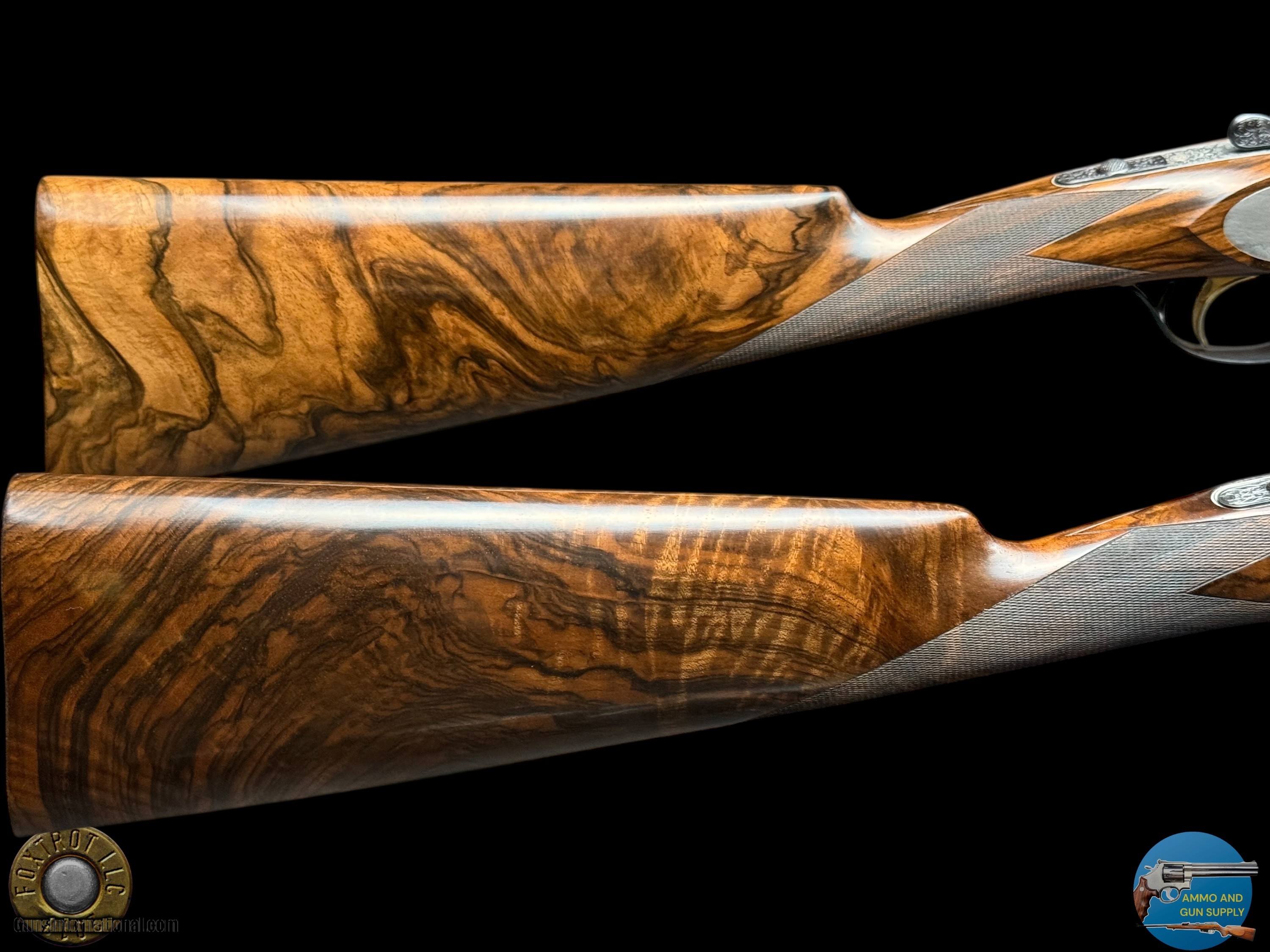 Description: PAIR PERAZZI - MX28 SCO/C - 28 GA 29.5" - 34-312-39 ENGRAVING SCENES BY PATELLI MANUFACTURER - PERAZZI - ITALY MODEL - SCO/C ACTION - SIDEPLATED NON-DETACHABLE TRIGGER GROUP ACTION WITH SINGLE SELECTIVE TRIGGER, EJECTORS AND NON-AUTO SAFETY SN - 120780 - 120781 GAUGE - 28 GAUGE 2.75" CHAMBERS BARREL LENGTH - 29.5" SOLID MID RIB BARRELS #1 CHOKED - MODIFIED .020" OF RESTRICTION / IMPROVED MODIFIED .032" OF RESTRICTION #2 CHOKED - MODIFIED .020" OF RESTRICTION / IMPROVED MODIFIED .027" OF RESTRICTION CAPACITY – 2 #1 DAC - 1.375" #1 DAH - 1.875" #1 LOP - 14.875" #1 WEIGHT - 6 LB 4.1 OZ #2 DAC - 1.375" #2 DAH - 1.625" #2 LOP - 14.875" #2 WEIGHT - 6 LB 2.3 OZ SIGHTS - MATTED VENT RIB WTIH SILVER FRONT BEAD PRODUCED - 2001 A truly rare opportunity for the discerning Perazzi collector and sub-gauge enthusiast—this is a matched pair of Perazzi MX28 SCO/C shotguns in 28 gauge, serial numbered 120780 & 120781, and built to the exacting standards that have made Perazzi synonymous with world-class competition and bespoke craftsmanship. Produced in 2001, both guns are fitted with beautifully balanced 29.5" solid mid-rib barrels and chambered for 2.75" 28 gauge, delivering the quick handling, smooth recoil impulse, and refined feel that makes the 28 gauge so addictive on the sporting course and in the field. Weights are ideal for long days of shooting—Gun #1 at 6 lb 4.1 oz and Gun #2 at 6 lb 2.3 oz—with both guns carrying the same 14.875" length of pull, making this pair perfectly suited for a consistent, seamless transition between guns. Chokes are set up for serious versatility and target work: both feature Modified (.020") as the first choke, paired with Improved Modified in the second barrel (.032" on Gun #1 and .027" on Gun #2), a highly effective combination for sporting clays, birds over dogs, and driven-style presentations where precision matters. The SCO/C sideplated actions showcase Perazzi’s unmistakable elegance, combining performance-driven design with genuine Italian artistry. These guns feature a non-detachable trigger group with a single selective trigger, strong ejectors, and a non-auto safety, providing a fast, competition-ready manual of arms with the reliability Perazzi is known for. Both shotguns are in excellent overall condition, showing only faint evidence of handling—bores are clear, triggers are crisp, the actions cycle smoothly, and both guns lock up tight, remaining mechanically excellent throughout. What truly elevates this pair into the collector-grade category is the engraving: the sideplated receivers are adorned with the highly desirable Perazzi engraving scenes—Left #34 / Right #29 / Bottom #312—executed by master engraver Patelli, and signed on the left sideplate, a level of provenance and craftsmanship that stands apart from standard production guns. The metal retains almost all of its original finishes, presenting with the refined look expected of a premium Perazzi pair. Completing the package are the stunning exhibition-grade straight-grip walnut stocks and matching forends on both guns, featuring dark, flowing grain patterns that are rich, bold, and exceptionally attractive—exactly what you want in a true matched set. The straight-grip configuration enhances elegance and fast handling while maintaining excellent control, especially in a lightweight 28 gauge platform that rewards quick mounting and natural pointing. This pair is housed in its original Perazzi leather ABS case, complete with manuals, making it a ready-to-own, ready-to-enjoy ensemble that checks every box: matched serials, premium engraving by a known master, excellent condition, ideal barrel length, and a gauge that delivers pure shooting pleasure. Matched Perazzi pairs like this do not surface often—especially in 28 gauge—and this set offers both the rarity collectors seek and the performance serious shooters demand. FLAT $100 S/H/I. 4%CREDIT CARD FEE APPLIES. FOXTROT IS A LICENSED FFL DEALER WITH MANY POSITIVE FEEDBACKS SO BUY WITH CONFIDENCE! Shotgun Gauge: 28 Gauge Price: $80,000.00 Contact Seller |
