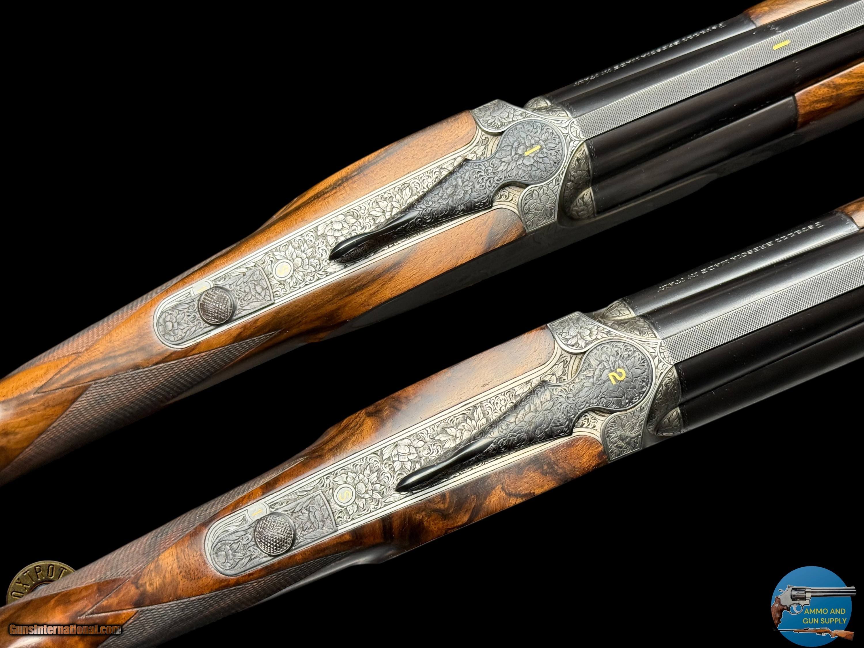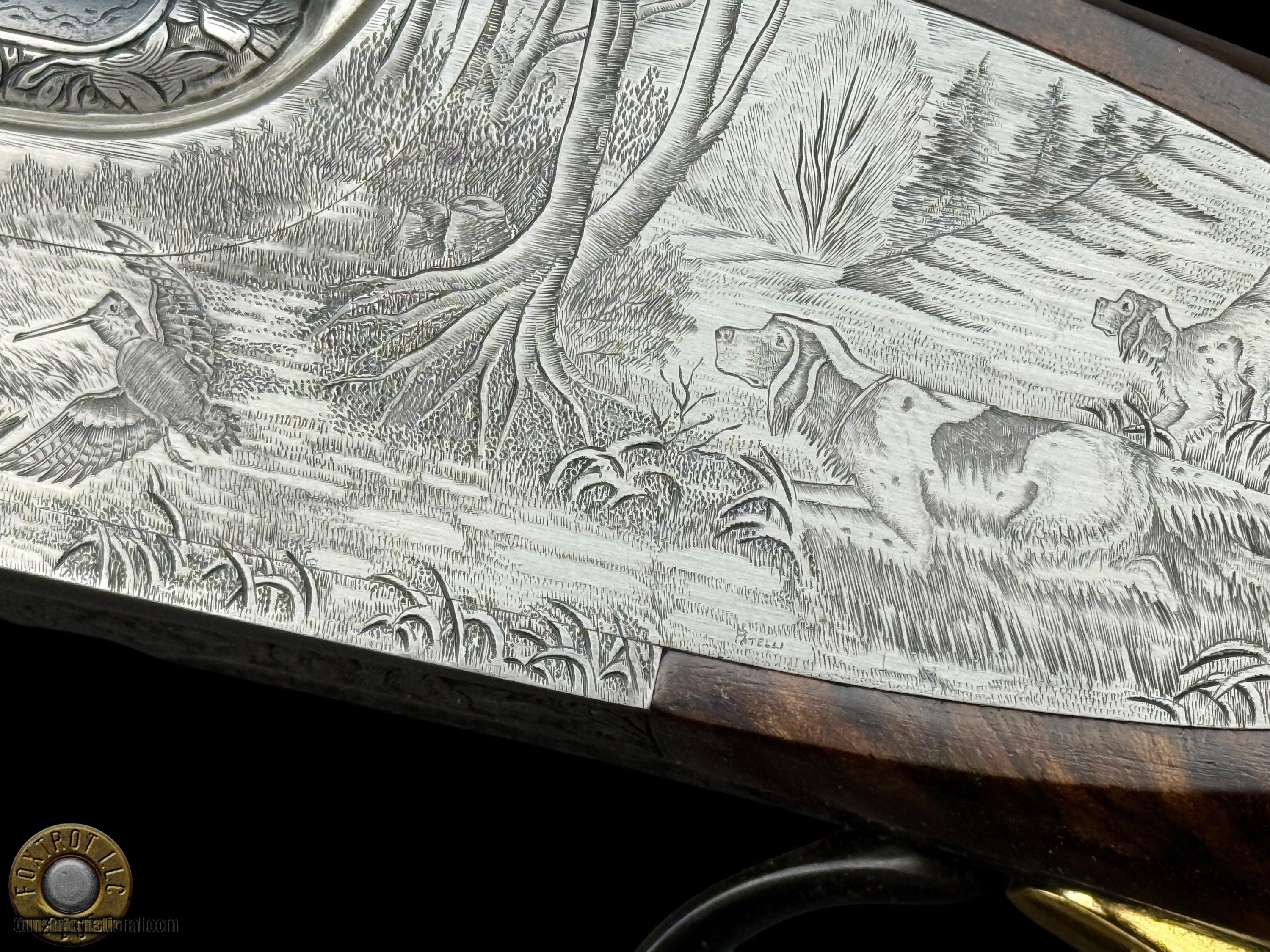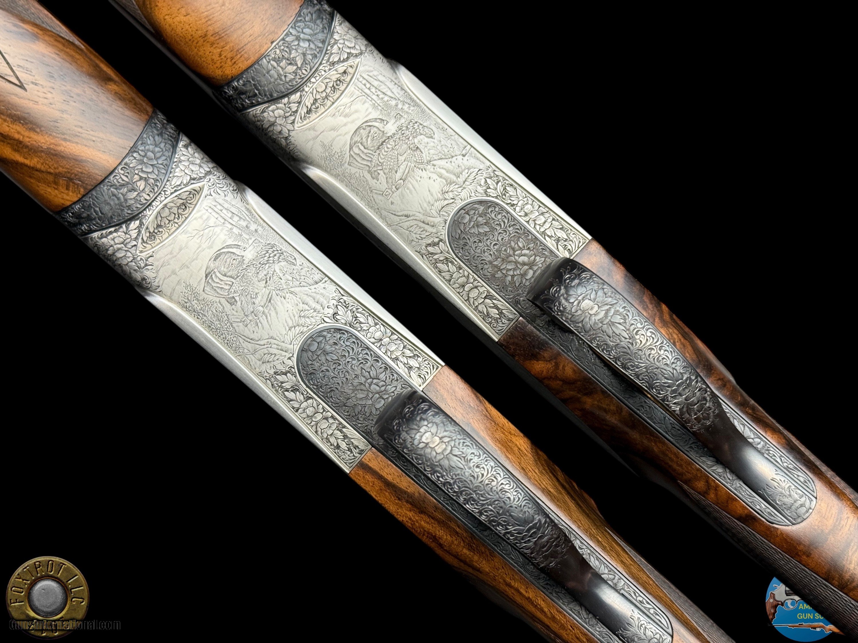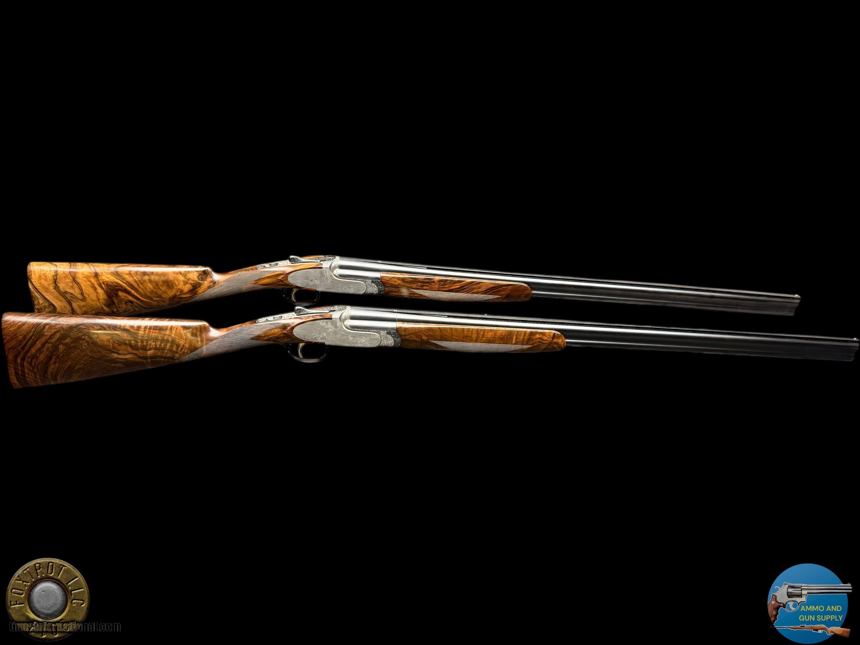 Description: PAIR PERAZZI - MX28 SCO/C - 28 GA 29.5" - 34-312-39 ENGRAVING SCENES BY PATELLI MANUFACTURER - PERAZZI - ITALY MODEL - SCO/C ACTION - SIDEPLATED NON-DETACHABLE TRIGGER GROUP ACTION WITH SINGLE SELECTIVE TRIGGER, EJECTORS AND NON-AUTO SAFETY SN - 120780 - 120781 GAUGE - 28 GAUGE 2.75" CHAMBERS BARREL LENGTH - 29.5" SOLID MID RIB BARRELS #1 CHOKED - MODIFIED .020" OF RESTRICTION / IMPROVED MODIFIED .032" OF RESTRICTION #2 CHOKED - MODIFIED .020" OF RESTRICTION / IMPROVED MODIFIED .027" OF RESTRICTION CAPACITY – 2 #1 DAC - 1.375" #1 DAH - 1.875" #1 LOP - 14.875" #1 WEIGHT - 6 LB 4.1 OZ #2 DAC - 1.375" #2 DAH - 1.625" #2 LOP - 14.875" #2 WEIGHT - 6 LB 2.3 OZ SIGHTS - MATTED VENT RIB WTIH SILVER FRONT BEAD PRODUCED - 2001 A truly rare opportunity for the discerning Perazzi collector and sub-gauge enthusiast—this is a matched pair of Perazzi MX28 SCO/C shotguns in 28 gauge, serial numbered 120780 & 120781, and built to the exacting standards that have made Perazzi synonymous with world-class competition and bespoke craftsmanship. Produced in 2001, both guns are fitted with beautifully balanced 29.5" solid mid-rib barrels and chambered for 2.75" 28 gauge, delivering the quick handling, smooth recoil impulse, and refined feel that makes the 28 gauge so addictive on the sporting course and in the field. Weights are ideal for long days of shooting—Gun #1 at 6 lb 4.1 oz and Gun #2 at 6 lb 2.3 oz—with both guns carrying the same 14.875" length of pull, making this pair perfectly suited for a consistent, seamless transition between guns. Chokes are set up for serious versatility and target work: both feature Modified (.020") as the first choke, paired with Improved Modified in the second barrel (.032" on Gun #1 and .027" on Gun #2), a highly effective combination for sporting clays, birds over dogs, and driven-style presentations where precision matters. The SCO/C sideplated actions showcase Perazzi’s unmistakable elegance, combining performance-driven design with genuine Italian artistry. These guns feature a non-detachable trigger group with a single selective trigger, strong ejectors, and a non-auto safety, providing a fast, competition-ready manual of arms with the reliability Perazzi is known for. Both shotguns are in excellent overall condition, showing only faint evidence of handling—bores are clear, triggers are crisp, the actions cycle smoothly, and both guns lock up tight, remaining mechanically excellent throughout. What truly elevates this pair into the collector-grade category is the engraving: the sideplated receivers are adorned with the highly desirable Perazzi engraving scenes—Left #34 / Right #29 / Bottom #312—executed by master engraver Patelli, and signed on the left sideplate, a level of provenance and craftsmanship that stands apart from standard production guns. The metal retains almost all of its original finishes, presenting with the refined look expected of a premium Perazzi pair. Completing the package are the stunning exhibition-grade straight-grip walnut stocks and matching forends on both guns, featuring dark, flowing grain patterns that are rich, bold, and exceptionally attractive—exactly what you want in a true matched set. The straight-grip configuration enhances elegance and fast handling while maintaining excellent control, especially in a lightweight 28 gauge platform that rewards quick mounting and natural pointing. This pair is housed in its original Perazzi leather ABS case, complete with manuals, making it a ready-to-own, ready-to-enjoy ensemble that checks every box: matched serials, premium engraving by a known master, excellent condition, ideal barrel length, and a gauge that delivers pure shooting pleasure. Matched Perazzi pairs like this do not surface often—especially in 28 gauge—and this set offers both the rarity collectors seek and the performance serious shooters demand. FLAT $100 S/H/I. 4%CREDIT CARD FEE APPLIES. FOXTROT IS A LICENSED FFL DEALER WITH MANY POSITIVE FEEDBACKS SO BUY WITH CONFIDENCE! Shotgun Gauge: 28 Gauge Price: $80,000.00 Contact Seller |