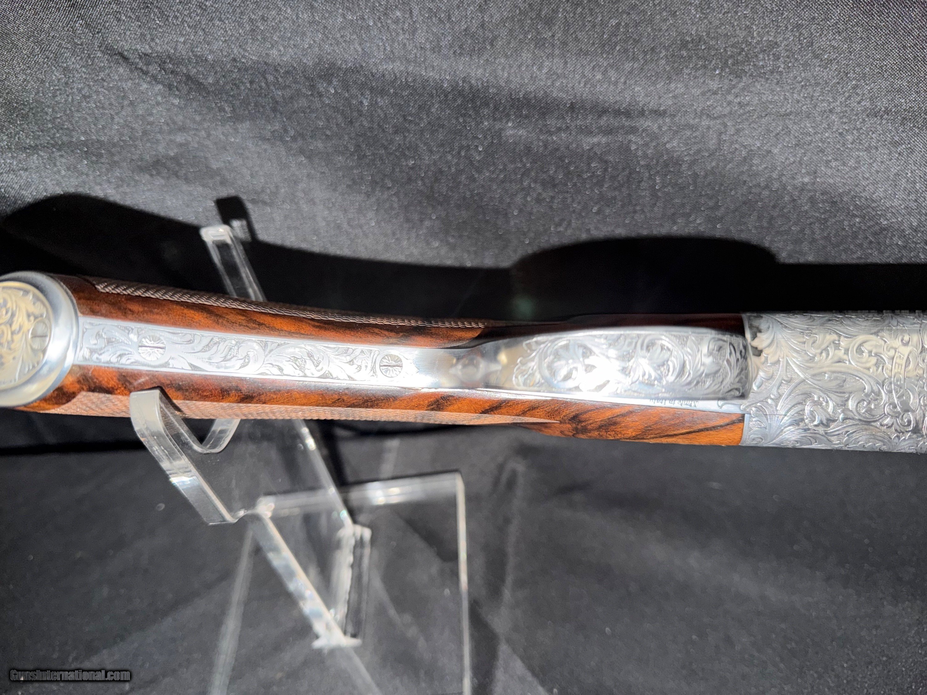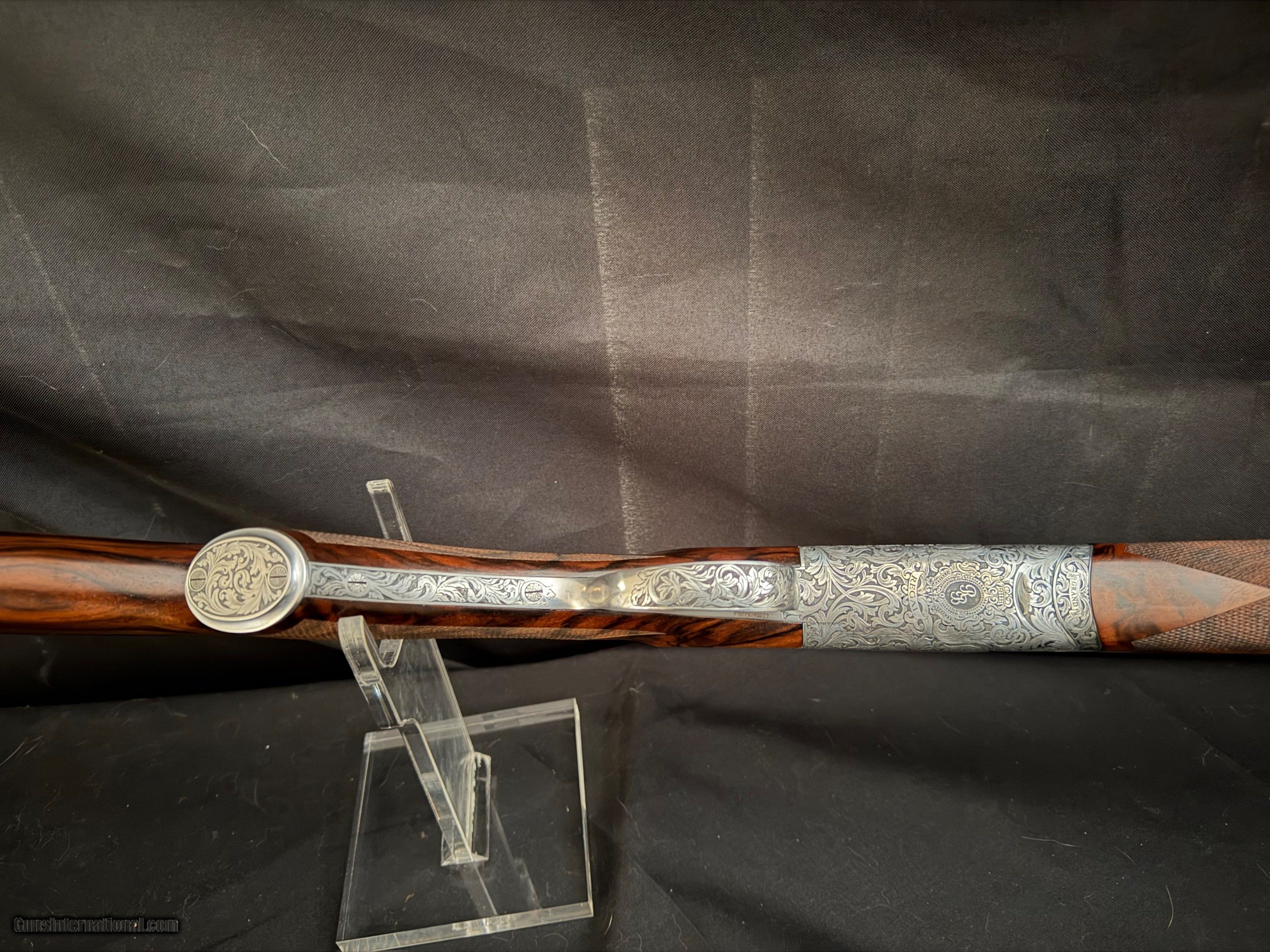 Description: RIzzini Grand Regal Deluxe, 28 gauge, 29.5 inch choke tube barrel, solid rib, NEW IN BOX! UNFIRED. THis gun is gourgeous. Top notch highly figured highly grained furniture. Deep Chiseled hand chased engraving. From the round bodied reciever to the heavily engraved flutes adjoining the forend to the full length trigger guard that conclude in the attached knob cover the metal work is astounding. This gun has incredible balance and handling characteristics. The reciever is low profile giving the gun a lively feeling in your hands. This gun retails for close to $14,000.00. It is brand new in the box. You can buy this one for $12,500.00. Shotgun Gauge: 28 Gauge Manufacturer: Rizzini Model: Grand Regal Deluxe Barrel Length: 29.5 Chambers: 3 Condition: NEW IN BOX Metal Condition: Perfect Wood Condition: Perfect Bore Condition: Perfect Stock Comb: 1.5 Stock Heel: 2.125 Butt Pad: WOOD checkered LOP: 14.75 Weight: 6 Chokes: Choke tubes Case: Factory Negrini Price: $12,500.00 Buy Now Contact Seller |