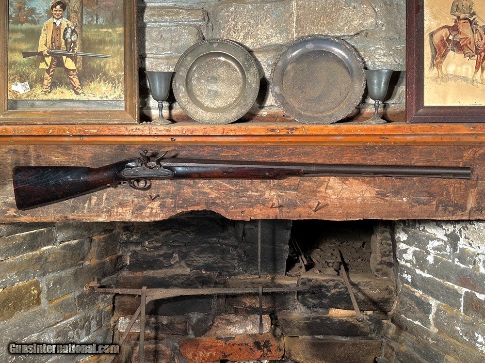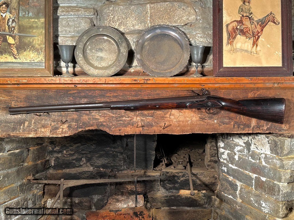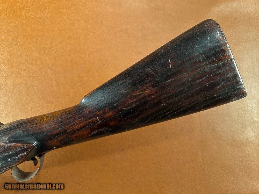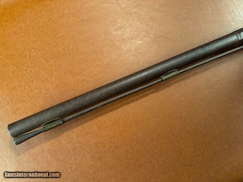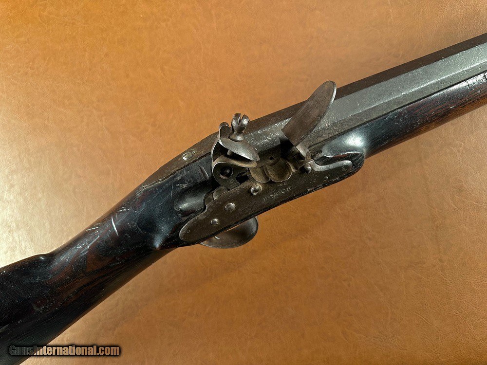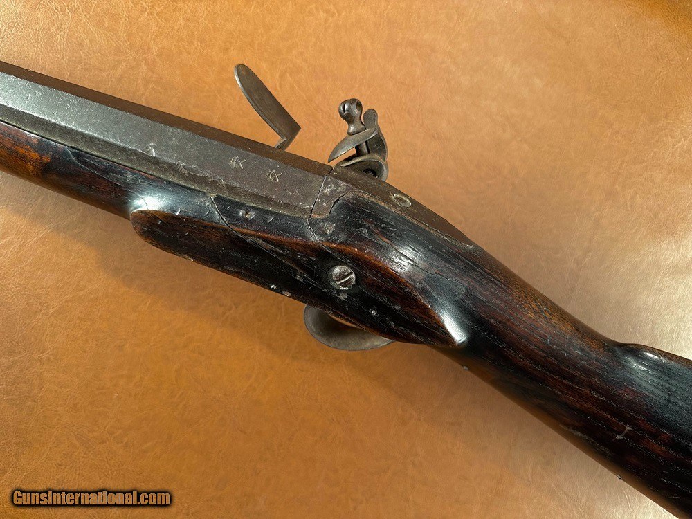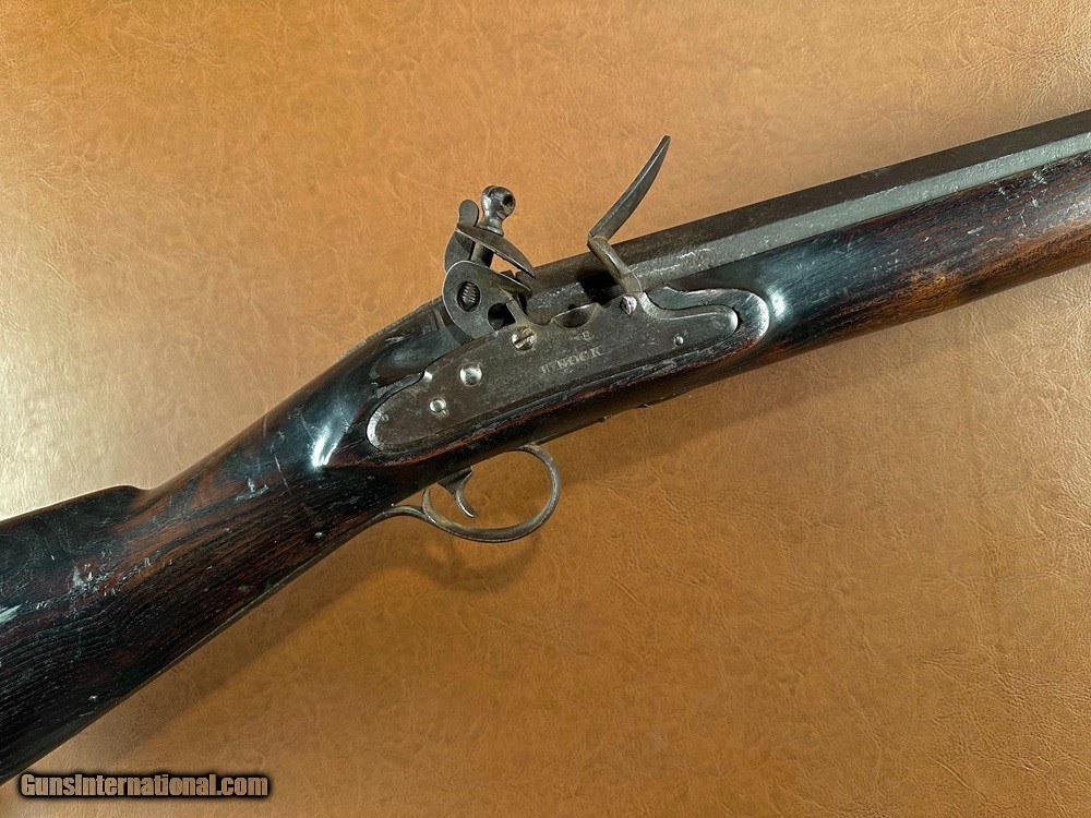 Description: Rare & Massive Flintlock Punt/Market Gun with Henry Nock Screwless Lock, 8 GA, mfg. circa first quarter 19th century. This is a realy neat and unusual market gun which has been a part of my big-bore collection for many years now and I am convinced it is unique as I have never seen another fowling piece constructed with a rare Nock screwless lock. Large-bore shotguns and punt guns were the weapons of choice for commercial market hunters who needed to harvest as much waterfowl as possible on a daily basis for resale to local hotels and markets. This example was made in the upper New England/Canadian coastal region and has survived in wonderful original condition. The Birmingham proofed barrel measures 39 3/16" long and over 1 5/8" wide across the breech. Inside diameter of the bore at the muzzle is approximately .840" and there is no provision for a front sight. The first 20" of the barrel, over half it's length, is octagon transitioned to round at a wedding band turning. Legendary British ordnance maker Henry Nock, perhaps most famous for his seven-barreled Naval volley gun, patented his enclosed screwless lock in 1786 and the design enjoyed much success throughout the early Napoleonic era. This innovative design keeps all of the parts enclosed within the lock which is riveted together without the use of screws. The lock built into this gun would have been salvaged from a British military pistol or small carbine and remains original excepting for two rivets which have been replaced with screws during the gun's working life (one screw head damaged). The lock is clearly marked “H NOCK” below the British ordnance broad arrow. Touch hole is likewise original and unaltered. Overall the metal has a dark plum/gray patina with fine surface pitting scattered throughout. The heavy hardwood stock is of massive proportions having a 2 ½" tall wrist and measuring 2 ¾" wide across the barrel tang. The wood shows heavy, smooth wear overall with a lovely untouched blackened patina. There is a stable old 4" crack on the left side of the butt, a 2" crack on the right side, and a few stable 2 ½" cracks opposite the lock ahead of the lock bolt. One very tight old worn 5" crack under the forearm. Made without a buttplate as was common for big guns from this region it is fitted with an iron triggerguard and two barrel wedges. Original iron ramrod with turned brass pipes. The action is smooth and secure and functions flawlessly. Frizzen tightly shuts and opens perfectly. The gun weighs a hefty 13 lbs 5 oz. A fantastic and very unusual early market gun - you will not see another! Jeremiah Johnson Trading sells antique arms manufactured prior to 1899 and muzzleloading blackpowder reproductions only. For the purpose of these conditions the term "antique arms" will also include muzzleloading blackpowder reproductions. Buyers must be 21 years of age or older and have no felony convictions to purchase antique arms. Antique arms do not require Federal licensing and may be shipped directly to the buyer with the following exceptions. No antique arms will be shipped to Washington D. C. or any of the five boroughs of New York City (or residents thereof). Some restrictions may apply to antique firearms shipped to California and will be noted in the item description if applicable. Any antique arm shipped to New Jersey or Ohio must ship to a licensed FFL holder, no exceptions. Any muzzleloading blackpowder reproduction rifle, shotgun, or handgun shipped to Illinois must ship to an FFL holder. Items containing antique ivory will not be sold or shipped to residents of California, Hawaii, Illinois, Nevada, New Hampshire, New Jersey, New York, Oregon, or Washington. Antique muzzleloaders and antiques which fire obsolete cartridges may be shipped internationally however it is the responsibility of the buyer to know and abide by their local laws and provide proof that the antique arm is legal to receive and own. Payment can be made by money order, banker's check, personal check, credit card (no additional fees), or bank wire. Please allow 7-10 business days for clearance on personal checks. If paying by credit card please call us directly to process your order. Items are professionally packed and shipped USPS Priority Mail with insurance coverage for the sale price and signature required for delivery. Items valued over $5,000.00 are shipped Registered Mail. Buyer pays actual shipping costs with no added charge for packing materials or handling. We describe items accurately and thoroughly. If an item has been misrepresented or significant defect overlooked you may return it for a full refund (minus return shipping costs) within 3 days of having received it. This timeframe begins once the package is delivered by the carrier. Buyer's remorse or concerns over issues noted in the description and/or pictures is not a valid excuse for return. Returned items must be received in the same condition as originally shipped - cleaning, disassembly, alteration, or damage of any kind will void inspection privileges. Occasionally a post-1898 firearm from my personal collection may be sold under this account and any such transaction is a personal sale in no way affiliated with Jeremiah Johnson Trading. Any such arm will be shipped to a licensed FFL or C&R holder in accordance with Federal law. All antique arms are sold as collector's items and are not warranted safe for shooting. Please consult a competent gunsmith prior to shooting any firearm. SOLD Antique: Yes Shotgun Gauge: 8 Gauge Barrel Length: 39 3/16 Weight: 13 lbs 5 oz Manufacture Date: 1800-1825 |