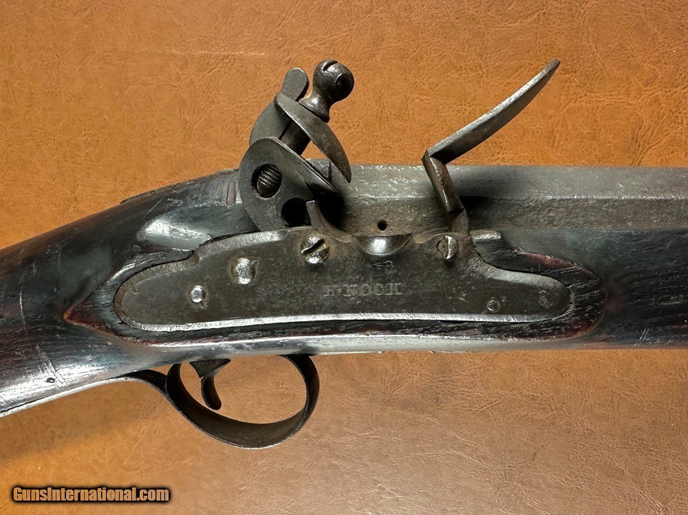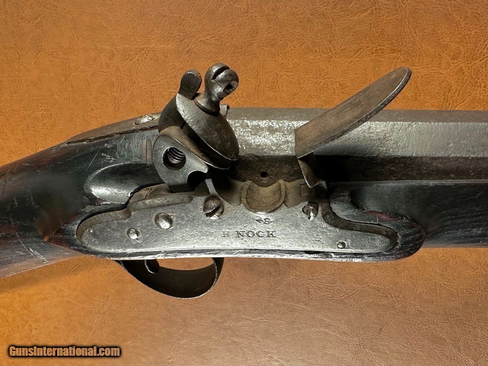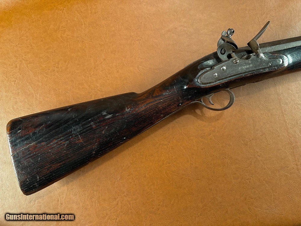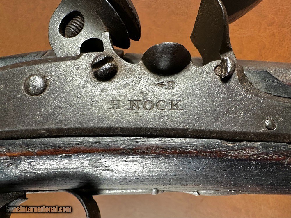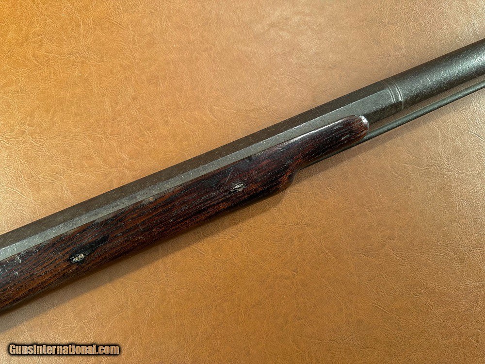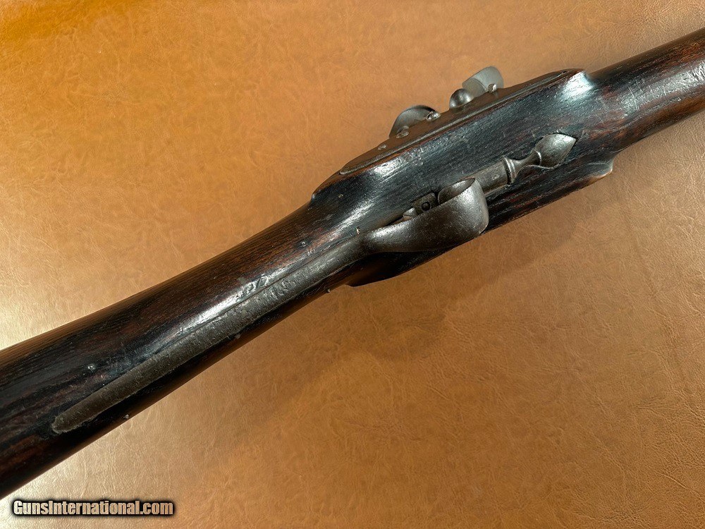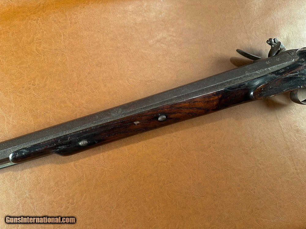 Description: Rare & Massive Flintlock Punt/Market Gun with Henry Nock Screwless Lock, 8 GA, mfg. circa first quarter 19th century. This is a realy neat and unusual market gun which has been a part of my big-bore collection for many years now and I am convinced it is unique as I have never seen another fowling piece constructed with a rare Nock screwless lock. Large-bore shotguns and punt guns were the weapons of choice for commercial market hunters who needed to harvest as much waterfowl as possible on a daily basis for resale to local hotels and markets. This example was made in the upper New England/Canadian coastal region and has survived in wonderful original condition. The Birmingham proofed barrel measures 39 3/16" long and over 1 5/8" wide across the breech. Inside diameter of the bore at the muzzle is approximately .840" and there is no provision for a front sight. The first 20" of the barrel, over half it's length, is octagon transitioned to round at a wedding band turning. Legendary British ordnance maker Henry Nock, perhaps most famous for his seven-barreled Naval volley gun, patented his enclosed screwless lock in 1786 and the design enjoyed much success throughout the early Napoleonic era. This innovative design keeps all of the parts enclosed within the lock which is riveted together without the use of screws. The lock built into this gun would have been salvaged from a British military pistol or small carbine and remains original excepting for two rivets which have been replaced with screws during the gun's working life (one screw head damaged). The lock is clearly marked “H NOCK” below the British ordnance broad arrow. Touch hole is likewise original and unaltered. Overall the metal has a dark plum/gray patina with fine surface pitting scattered throughout. The heavy hardwood stock is of massive proportions having a 2 ½" tall wrist and measuring 2 ¾" wide across the barrel tang. The wood shows heavy, smooth wear overall with a lovely untouched blackened patina. There is a stable old 4" crack on the left side of the butt, a 2" crack on the right side, and a few stable 2 ½" cracks opposite the lock ahead of the lock bolt. One very tight old worn 5" crack under the forearm. Made without a buttplate as was common for big guns from this region it is fitted with an iron triggerguard and two barrel wedges. Original iron ramrod with turned brass pipes. The action is smooth and secure and functions flawlessly. Frizzen tightly shuts and opens perfectly. The gun weighs a hefty 13 lbs 5 oz. A fantastic and very unusual early market gun - you will not see another! Jeremiah Johnson Trading sells antique arms manufactured prior to 1899 and muzzleloading blackpowder reproductions only. For the purpose of these conditions the term "antique arms" will also include muzzleloading blackpowder reproductions. Buyers must be 21 years of age or older and have no felony convictions to purchase antique arms. Antique arms do not require Federal licensing and may be shipped directly to the buyer with the following exceptions. No antique arms will be shipped to Washington D. C. or any of the five boroughs of New York City (or residents thereof). Some restrictions may apply to antique firearms shipped to California and will be noted in the item description if applicable. Any antique arm shipped to New Jersey or Ohio must ship to a licensed FFL holder, no exceptions. Any muzzleloading blackpowder reproduction rifle, shotgun, or handgun shipped to Illinois must ship to an FFL holder. Items containing antique ivory will not be sold or shipped to residents of California, Hawaii, Illinois, Nevada, New Hampshire, New Jersey, New York, Oregon, or Washington. Antique muzzleloaders and antiques which fire obsolete cartridges may be shipped internationally however it is the responsibility of the buyer to know and abide by their local laws and provide proof that the antique arm is legal to receive and own. Payment can be made by money order, banker's check, personal check, credit card (no additional fees), or bank wire. Please allow 7-10 business days for clearance on personal checks. If paying by credit card please call us directly to process your order. Items are professionally packed and shipped USPS Priority Mail with insurance coverage for the sale price and signature required for delivery. Items valued over $5,000.00 are shipped Registered Mail. Buyer pays actual shipping costs with no added charge for packing materials or handling. We describe items accurately and thoroughly. If an item has been misrepresented or significant defect overlooked you may return it for a full refund (minus return shipping costs) within 3 days of having received it. This timeframe begins once the package is delivered by the carrier. Buyer's remorse or concerns over issues noted in the description and/or pictures is not a valid excuse for return. Returned items must be received in the same condition as originally shipped - cleaning, disassembly, alteration, or damage of any kind will void inspection privileges. Occasionally a post-1898 firearm from my personal collection may be sold under this account and any such transaction is a personal sale in no way affiliated with Jeremiah Johnson Trading. Any such arm will be shipped to a licensed FFL or C&R holder in accordance with Federal law. All antique arms are sold as collector's items and are not warranted safe for shooting. Please consult a competent gunsmith prior to shooting any firearm. SOLD Antique: Yes Shotgun Gauge: 8 Gauge Barrel Length: 39 3/16 Weight: 13 lbs 5 oz Manufacture Date: 1800-1825 |