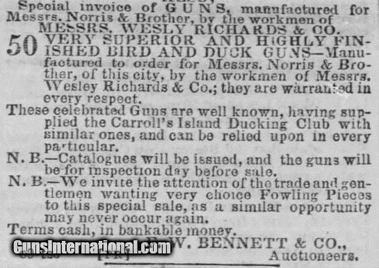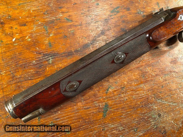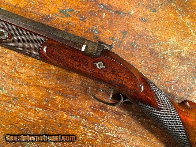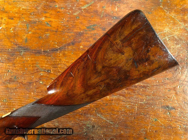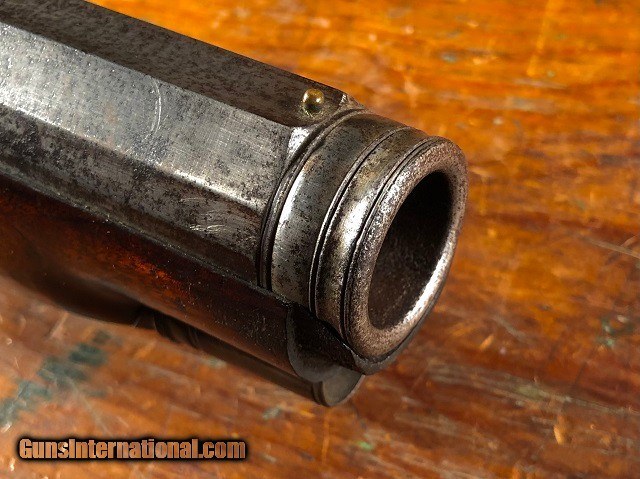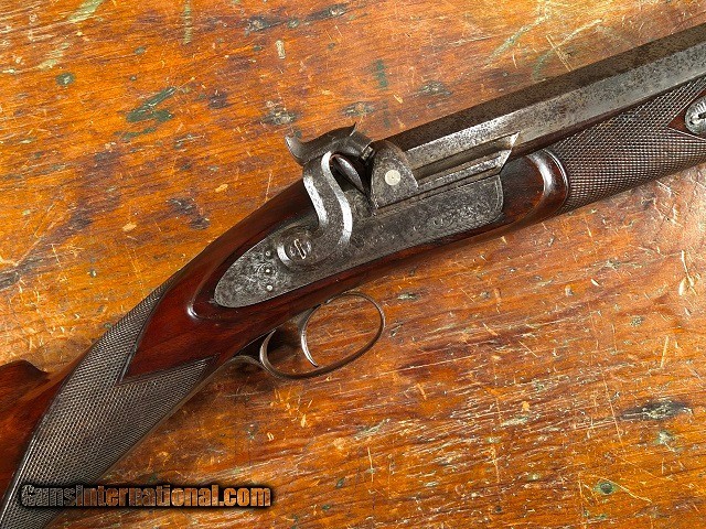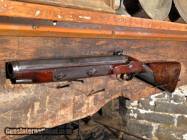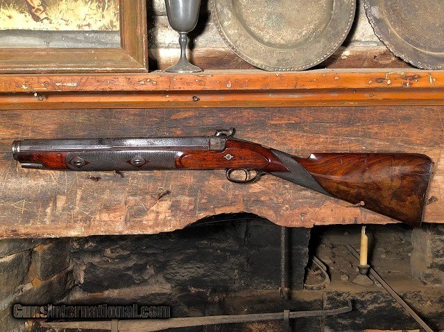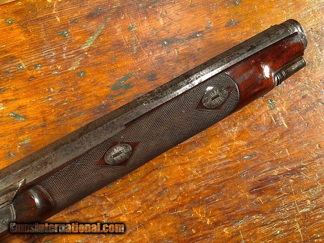 Description: *SALE PENDING* Extremely Rare & Fine Norris & Brother, Baltimore, Maryland, Engraved 6 Gauge Percussion Coach Shotgun, 6 Ga, mfg. circa 1850's. This menacing hand cannon comes directly from my long time collection of big bore shotguns and is a totally unique one of a kind piece. Picture's really don't do justice to it's size, quality, and condition. Originally the gun would have been made to order for a very wealthy Southern sportsman for long range goose hunting however early on in it's life the barrel, which probably measured 40" or more in length, was professionally shortened to just 15" and the butt correspondingly weighted so that the gun is perfectly balanced and can be wielded with one hand. Given the type of person who would have owned a gun like this I can only surmise that it was modified either for family coach guard or perhaps a wealthy lad on horseback going off to fight in the Civil War. Regardless it is definitely a self defense weapon no longer meant for hunting waterfowl. Norris & Brother are one of the more obscure Baltimore gun makers yet when specimens do surface they are consistently found to be of best quality. An ad printed in the Baltimore Sun dated October 12, 1858 may shed light on the true origins of their work as it suggests that Norris & Brother guns were in fact made to order for the firm by none other than Westley Richards who was and is still considered to be one of the world's premier gunmakers. In spite of measuring just 31 1/8" long overall the gun weighs a hefty 10 lbs 13 oz. The barrel has been shortened at the leading edge of the wedding band turning flush with the tip of the forearm and the inside diameter of the bore measures .937". The muzzle is perfectly crowned and brass sighting bead centered with all work professionally done in period. The top of the barrel is inscribed "NORRIS & BROTHER MAKERS BALTIMORE" with "NORRIS & BROTHER" inscribed on the lock and serial number "163" marked on the lower tang. The breech is fitted with a platinum blow plug and the gun is beautifully engraved throughout with exceptional scrollwork. The metal has a mottled salt & pepper color overall which in spite of what the photos may imply is actually quite smooth. The stock is nicely figured and features a very finely checkered wrist and forearm with a nickel silver nameplate escutcheon. The checkering is sharp and the wood retains much of it's original varnish with an attractively toned dark color. Aside from a 4" long sliver missing along the edge of the forearm forward the lock and a tight 2" grain check on the left side of the butt the wood has survived in excellent condition with no further issues. Engraved iron buttplate, triggerguard, barrel tang, wedge escutcheons, and ramrod entry pipe with silver lock screw escutcheon and breech plate. The ramrod is absent and the forend cap was likely discarded at the time of alteration. The tip of the hammer spur has broken away and missing. The action is perfectly crisp and functions flawlessly. The nipple is a perfect original. Clean and smooth bore with only minimal blackpowder frosting. A very special and most impressive big bore American shotgun. You will never see another like it! Jeremiah Johnson Trading sells antique firearms manufactured prior to 1899 and muzzleloading blackpowder reproductions only. For the purpose of these conditions the term "antique firearm" will hence include muzzleloading blackpowder reproductions. Buyers must be 21 years of age or older and have no felony convictions to purchase antique firearms. Antique firearms do not require Federal licensing and may be shipped directly to the buyer with the following exceptions. No antique firearms will be shipped to Washington D. C. or any of the five boroughs of New York City (or residents thereof). Some restrictions may apply to antique firearms shipped to California and will be noted in the item description if applicable. Any handgun (antique or muzzleloading blackpowder reproduction) shipped to New Jersey must ship to a licensed FFL holder. Any muzzleloading blackpowder reproduction rifle, shotgun, or handgun shipped to Illinois must ship to an FFL holder. No international sales of antique firearms which may fire conventional metallic cartridges or any reproductions regardless of ignition. Antique muzzleloaders, or antiques which fire obsolete cartridges, may be shipped internationally however it is the responsibility of the buyer to know and abide by their local laws and provide proof that the antique arm is legal to receive and own. Payment can be made by money order, banker's check, personal check, or credit card (no fees). Please allow 7-10 business days for clearance on personal checks. If paying by credit card please call us directly to process your order. If not satisfied with an item within 3 days of receiving it, simply return the item in the same condition as shipped for a full refund, minus return shipping costs. Cleaning, disassembly, or altering of a firearm in any way will void inspection privileges. Layaway may be allowed upon negotiation, but will void inspection privileges. Buyer pays actual shipping & insurance costs. Occasionally a post-1898 firearm from my personal collection may be sold under this account however it will be noted that any such transaction is a personal sale in no way affiliated with our business. Any such arm will be shipped to a licensed FFL or C&R holder in accordance with Federal law. All firearms are sold as collector's items and are not warranted safe for shooting. Please consult a competent gunsmith prior to shooting any firearm. Message or call with any questions about this firearm, or any of our other items at 860-873-1092 (office) or 860-345-2100 (shop). SOLD Antique: Yes Manufacturer: Norris & Brother Serial Number: 163 Barrel Length: 15 Bore: 6 Gauge Weight: 10 lbs 13 oz Manufacture Date: Circa 1850's Engraving: Yes |