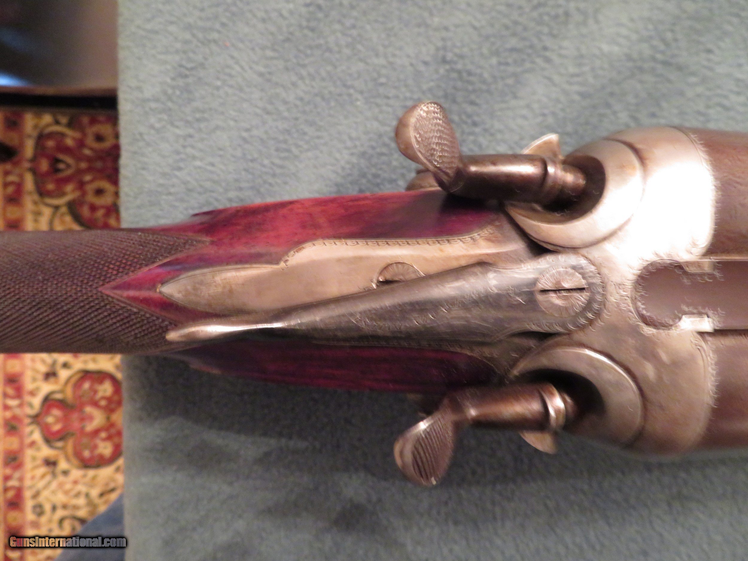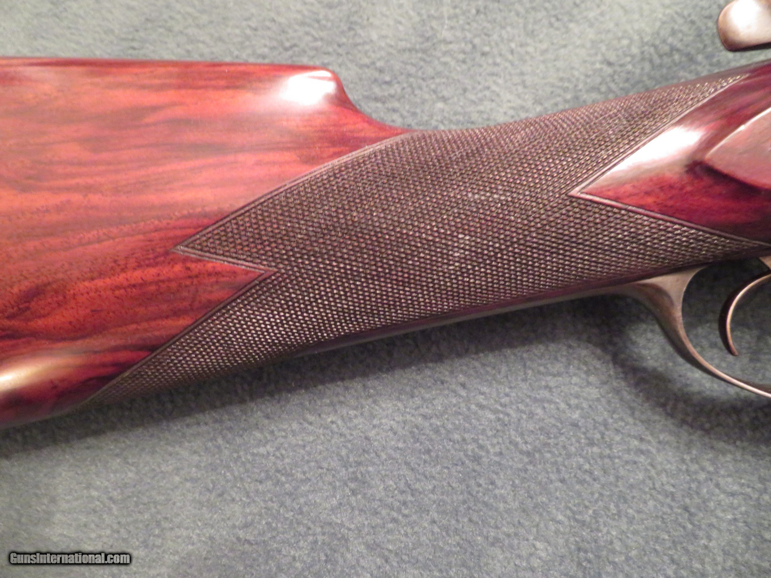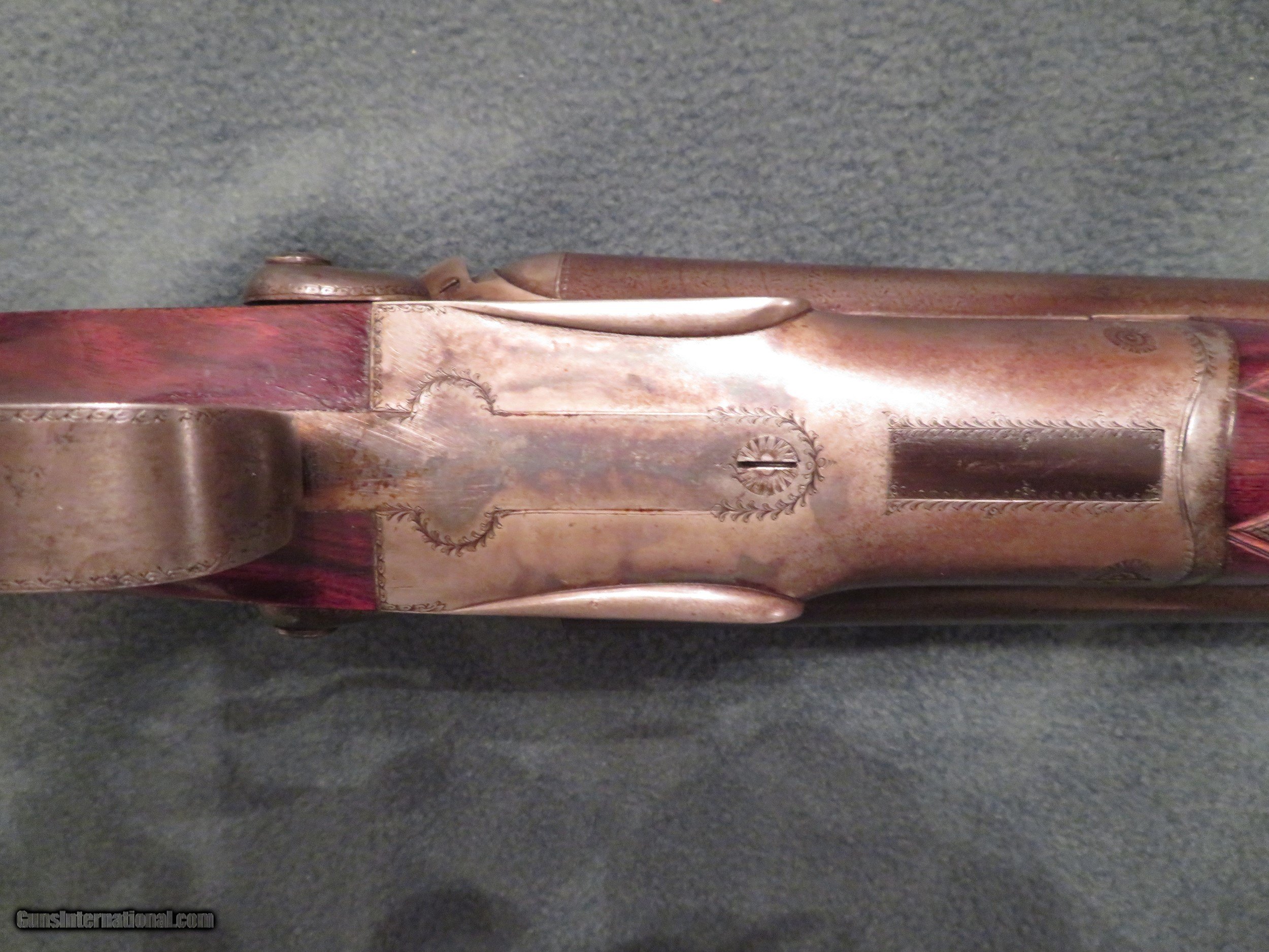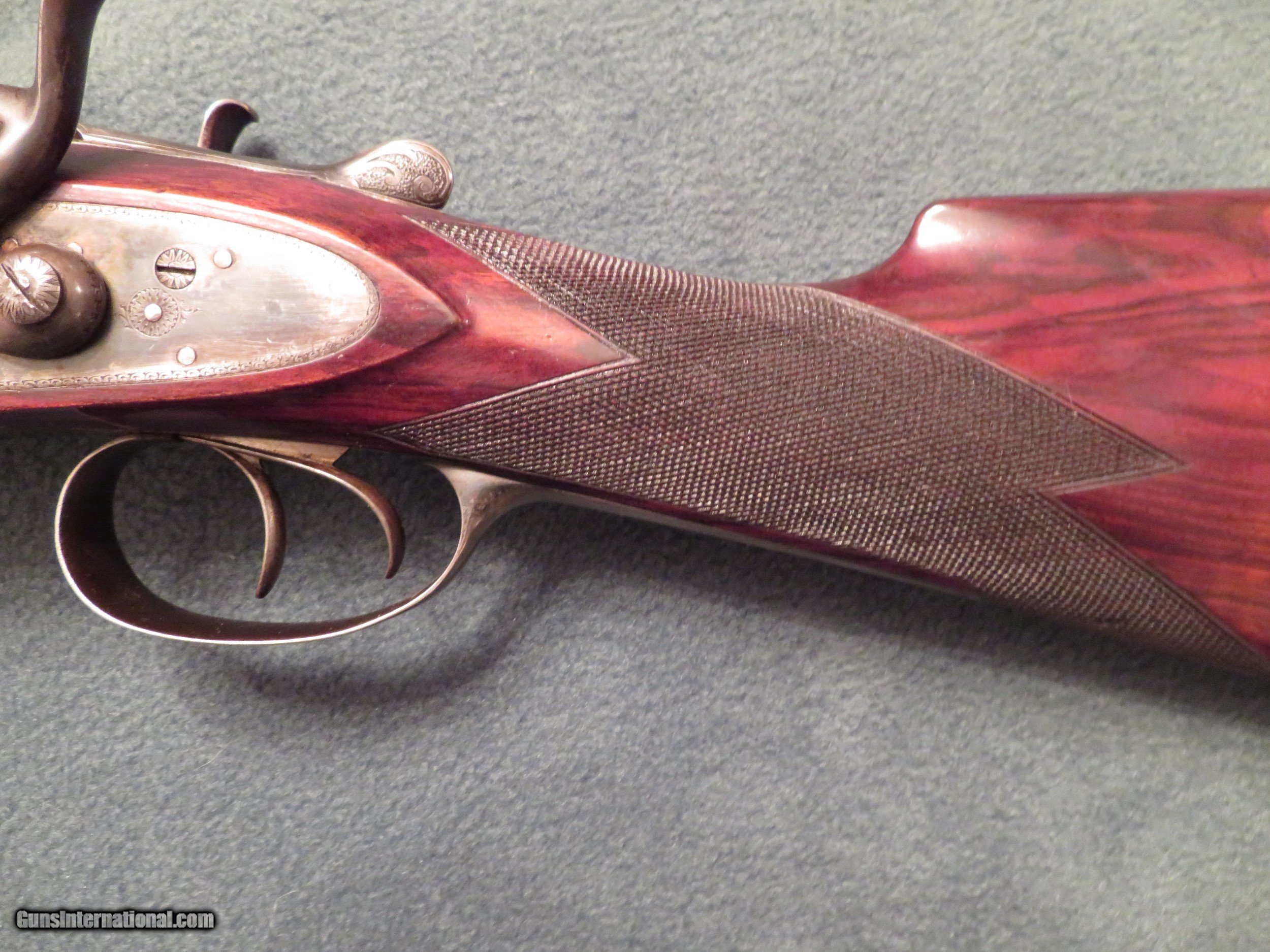 Description: W&C. Scott 8 bore "Heavy Wildfowl" Gun.this is one of the finest guns I have ever had in over 40 years of collecting Scott guns. The majority of l arge bore doubles made by Scott did not carry their name. The big guns retailed by. J.W. Tolley, R.B. Rodda, E.M. Reilly, WM. Evans and dozens of others were made by Scott. The gun was made in 1881. The second set of bbls (10 bore) was made and fitted by Scott between 1881 and 1897. Both sets have the London address at Regent Circus St. Both are stamped serial number 29486. The 10 ga set is not stamped with the "not for ball" marking. They are choked cyl & cyl. Length is a bit over 32 inches. This 10 ga set weighs a "wopping" six and one/half pounds! The wall thickness at the breech is over 1/4 inces thick! The 8 bore barrels are 36 inches long. I do not know what the ckokes .are. The 8 bore set has the early style wedge type fore end release. The 10 bore set has the later Scott lever type. Both sets of bbls are tight on the face. Bores are bright and shiny. This gun has received a "sensitive restoration. The barrels were re-browned in the correct "black & white" type by Brad Batchelder. The stock received a fresh oil finish and a new recoil pad by Keith Kearcher, Case coloring is original, fading but strong in some areas. This gun has a massive frame and yet the overall look of the gun puts it all in proportion. I have priced this gun reasonably, neverheless I am willing to listen to "reasonable" offers. Price is $6900. I will be happy to answer any questions you may have. Call Jim at (248) 266-6494 (This gun is sold pending funds.) SOLD Antique: Yes Manufacturer: W&C. Scott & Sons. Model: Heavy Wildfowl Serial Number: 29486 Bore: 8 Chambers: 3 &1/4 Ejectors: no Condition: Excellent Metal Condition: Excellent Wood Condition: Excellent Bore Condition: Excellent Barrel Type: Damascus Action: Sidelock Triggers: 2 Gauge Info: 8 Butt Pad: Recoil LOP: 14&1/2 inches Rib: Concave Weight: 10 pounds Manufacture Date: 1881 Choke Left: Cylinder Choke Right: Cylinder Engraving: NO Case: No Item Location: MI Proof:Black: Black |