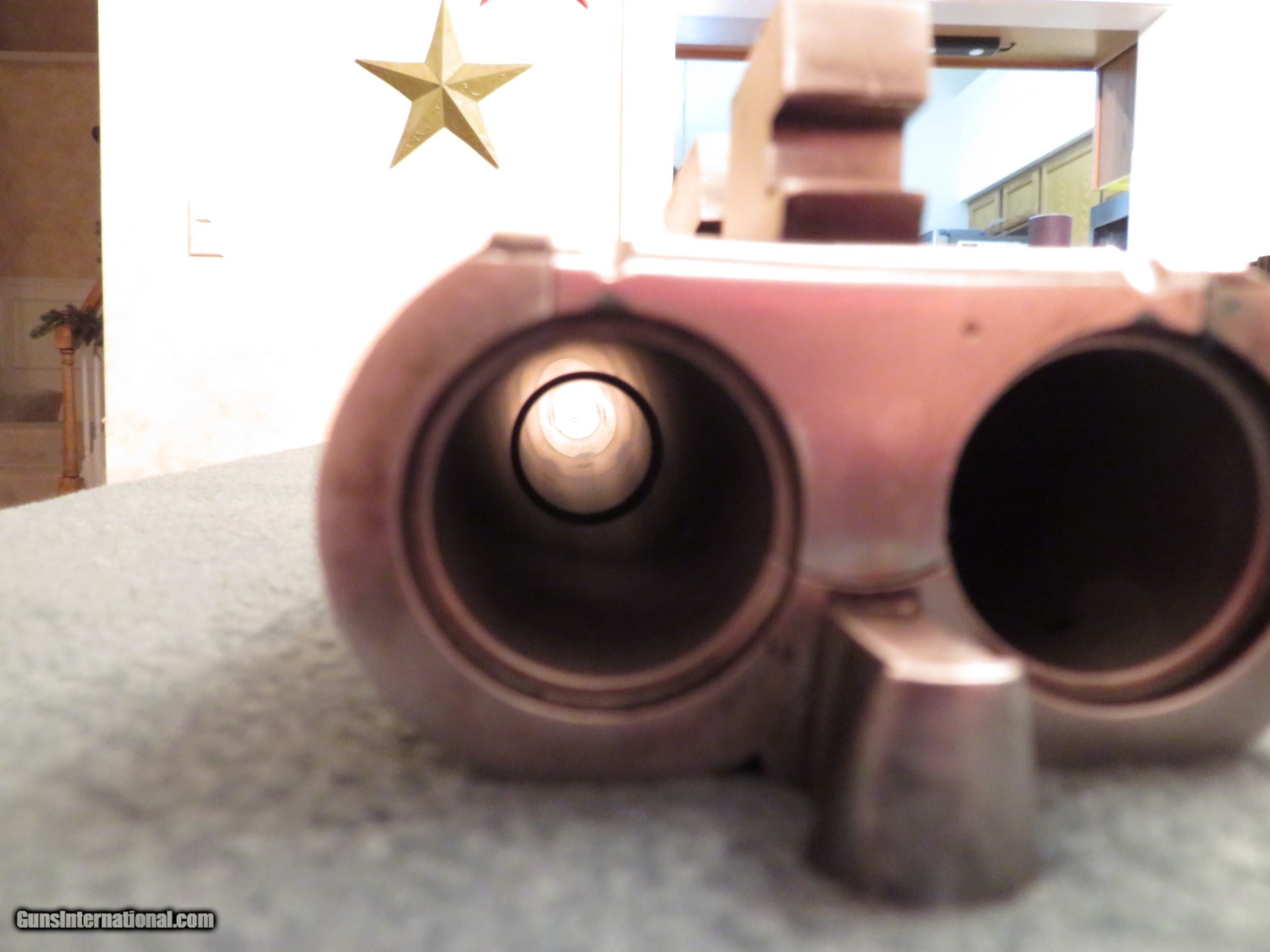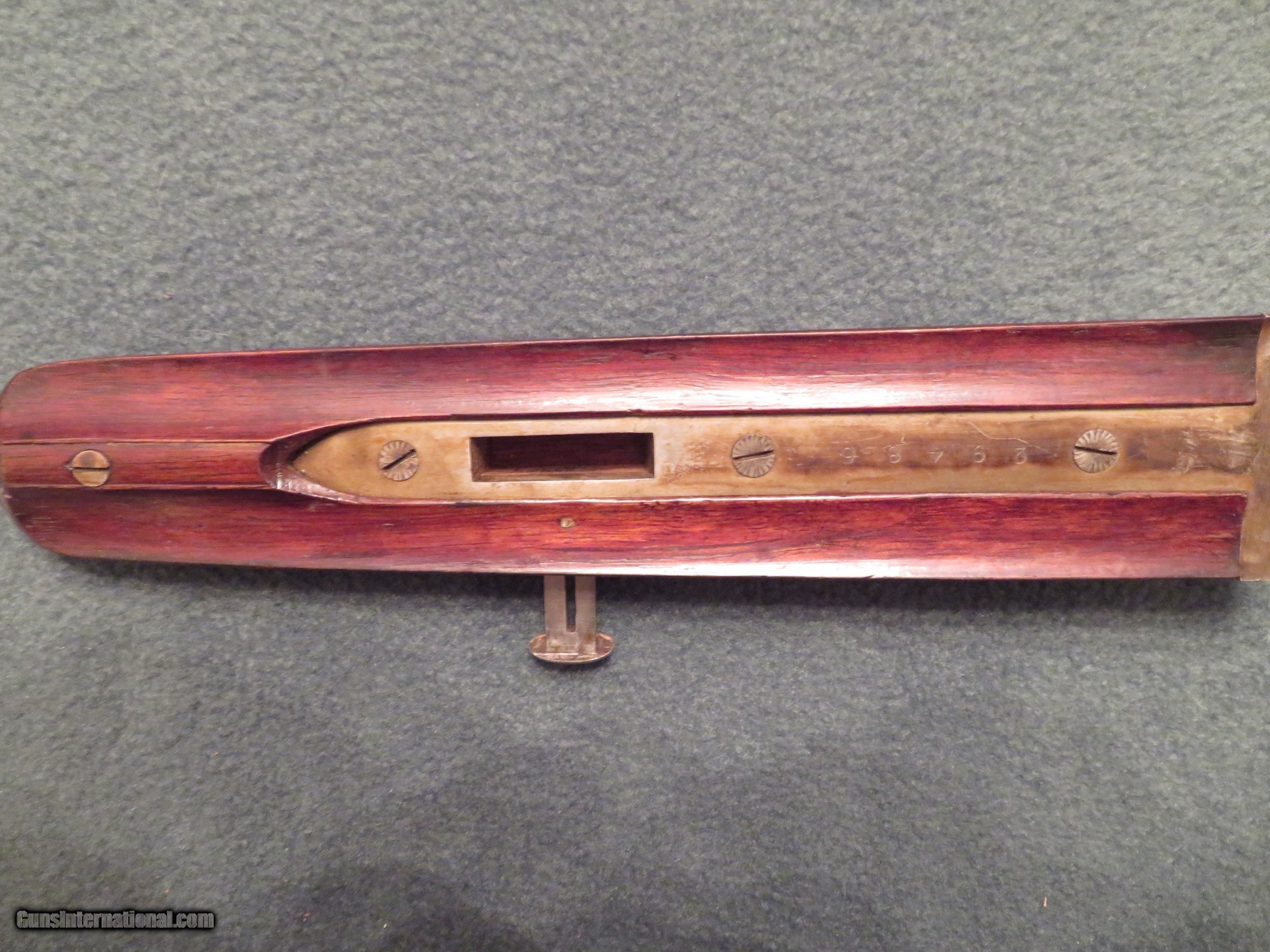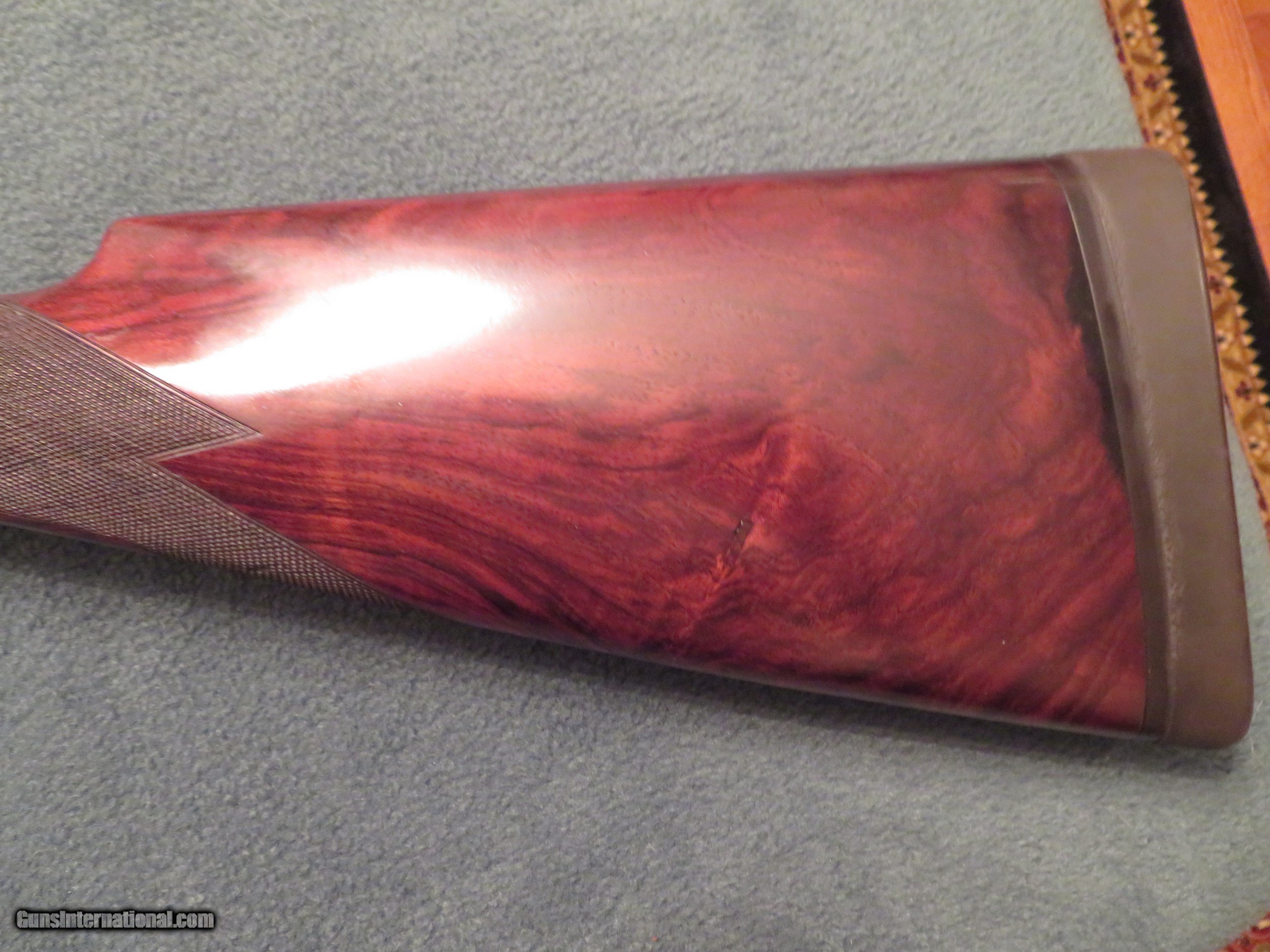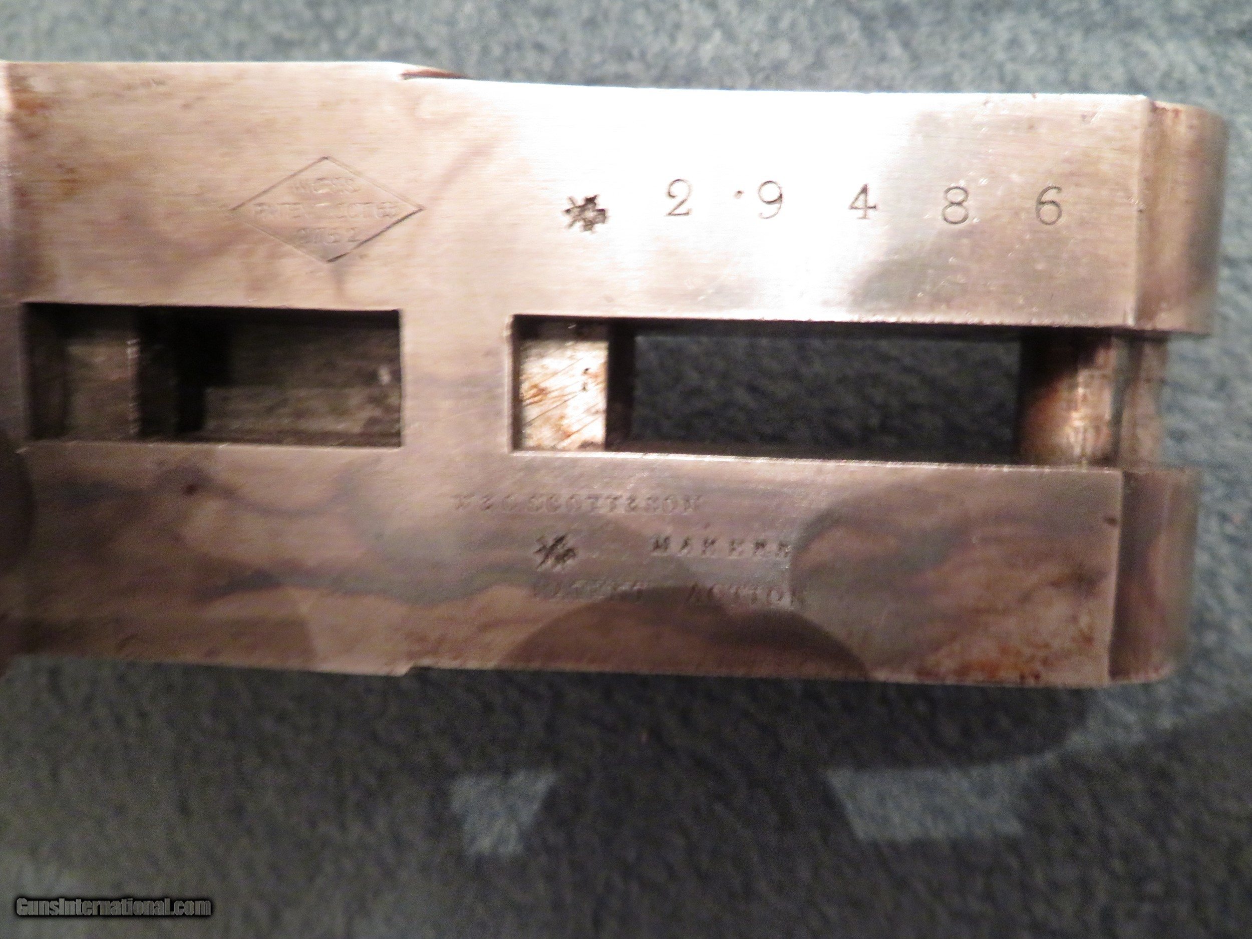 Description: W&C. Scott 8 bore "Heavy Wildfowl" Gun.this is one of the finest guns I have ever had in over 40 years of collecting Scott guns. The majority of l arge bore doubles made by Scott did not carry their name. The big guns retailed by. J.W. Tolley, R.B. Rodda, E.M. Reilly, WM. Evans and dozens of others were made by Scott. The gun was made in 1881. The second set of bbls (10 bore) was made and fitted by Scott between 1881 and 1897. Both sets have the London address at Regent Circus St. Both are stamped serial number 29486. The 10 ga set is not stamped with the "not for ball" marking. They are choked cyl & cyl. Length is a bit over 32 inches. This 10 ga set weighs a "wopping" six and one/half pounds! The wall thickness at the breech is over 1/4 inces thick! The 8 bore barrels are 36 inches long. I do not know what the ckokes .are. The 8 bore set has the early style wedge type fore end release. The 10 bore set has the later Scott lever type. Both sets of bbls are tight on the face. Bores are bright and shiny. This gun has received a "sensitive restoration. The barrels were re-browned in the correct "black & white" type by Brad Batchelder. The stock received a fresh oil finish and a new recoil pad by Keith Kearcher, Case coloring is original, fading but strong in some areas. This gun has a massive frame and yet the overall look of the gun puts it all in proportion. I have priced this gun reasonably, neverheless I am willing to listen to "reasonable" offers. Price is $6900. I will be happy to answer any questions you may have. Call Jim at (248) 266-6494 (This gun is sold pending funds.) SOLD Antique: Yes Manufacturer: W&C. Scott & Sons. Model: Heavy Wildfowl Serial Number: 29486 Bore: 8 Chambers: 3 &1/4 Ejectors: no Condition: Excellent Metal Condition: Excellent Wood Condition: Excellent Bore Condition: Excellent Barrel Type: Damascus Action: Sidelock Triggers: 2 Gauge Info: 8 Butt Pad: Recoil LOP: 14&1/2 inches Rib: Concave Weight: 10 pounds Manufacture Date: 1881 Choke Left: Cylinder Choke Right: Cylinder Engraving: NO Case: No Item Location: MI Proof:Black: Black |