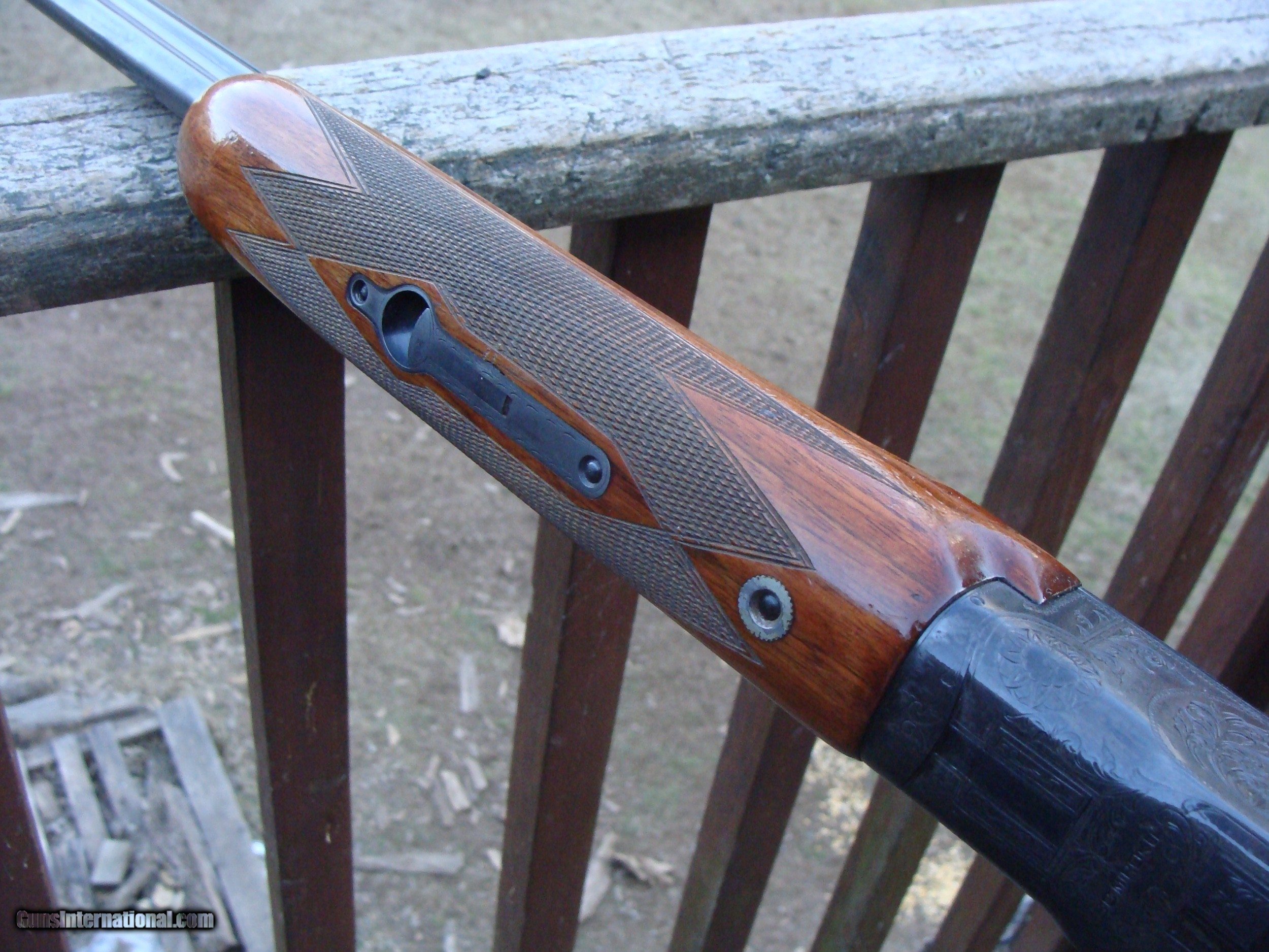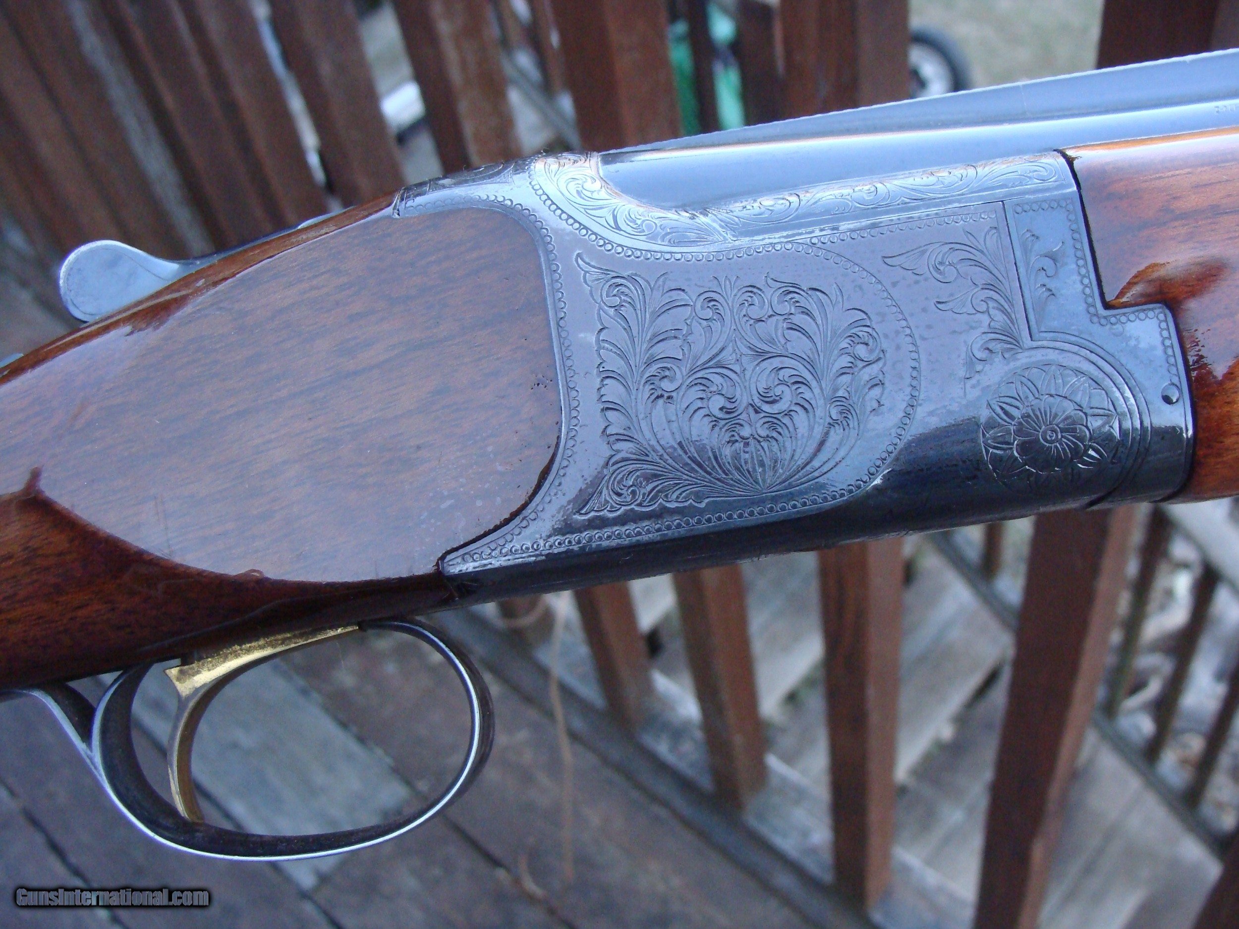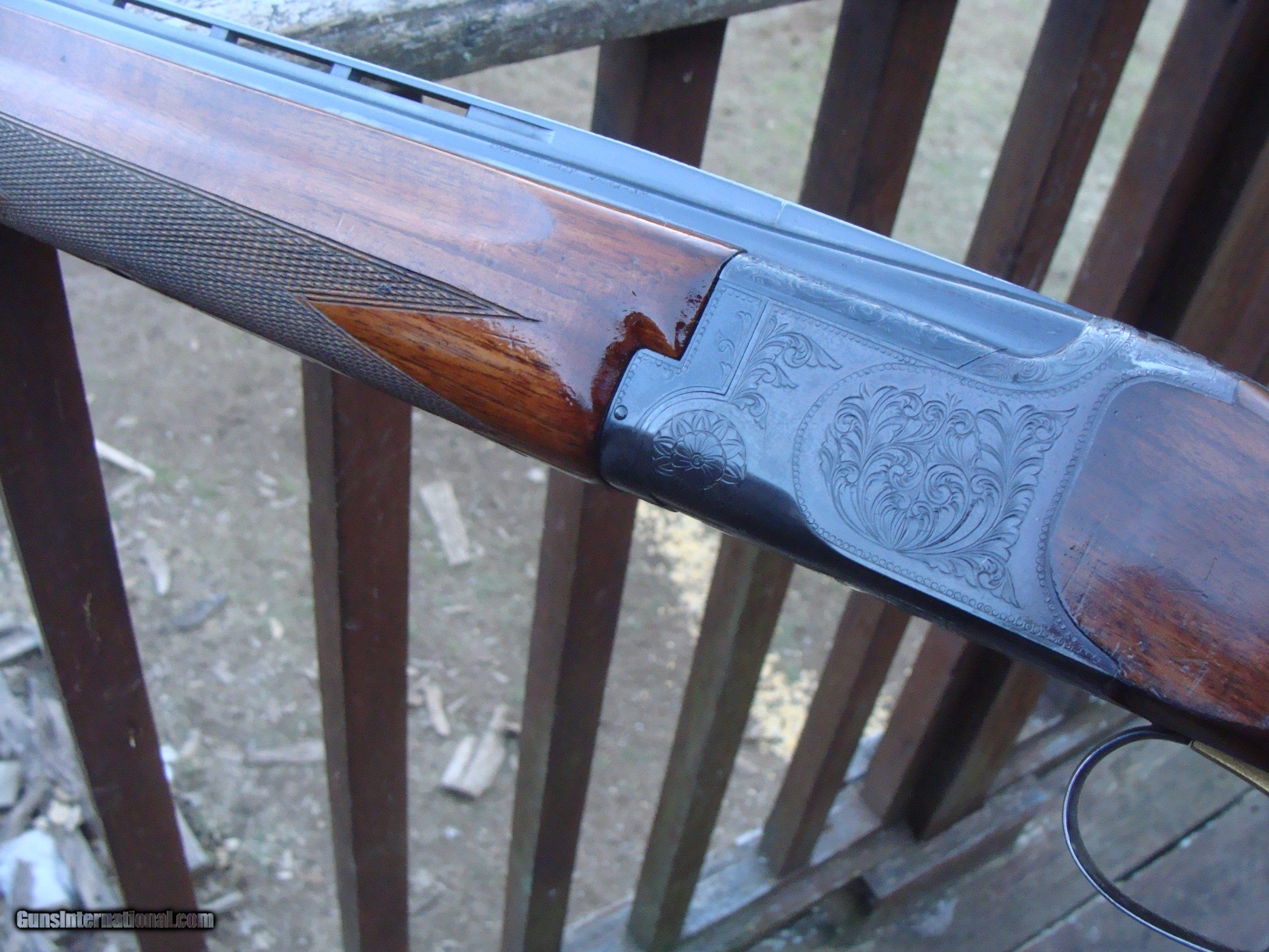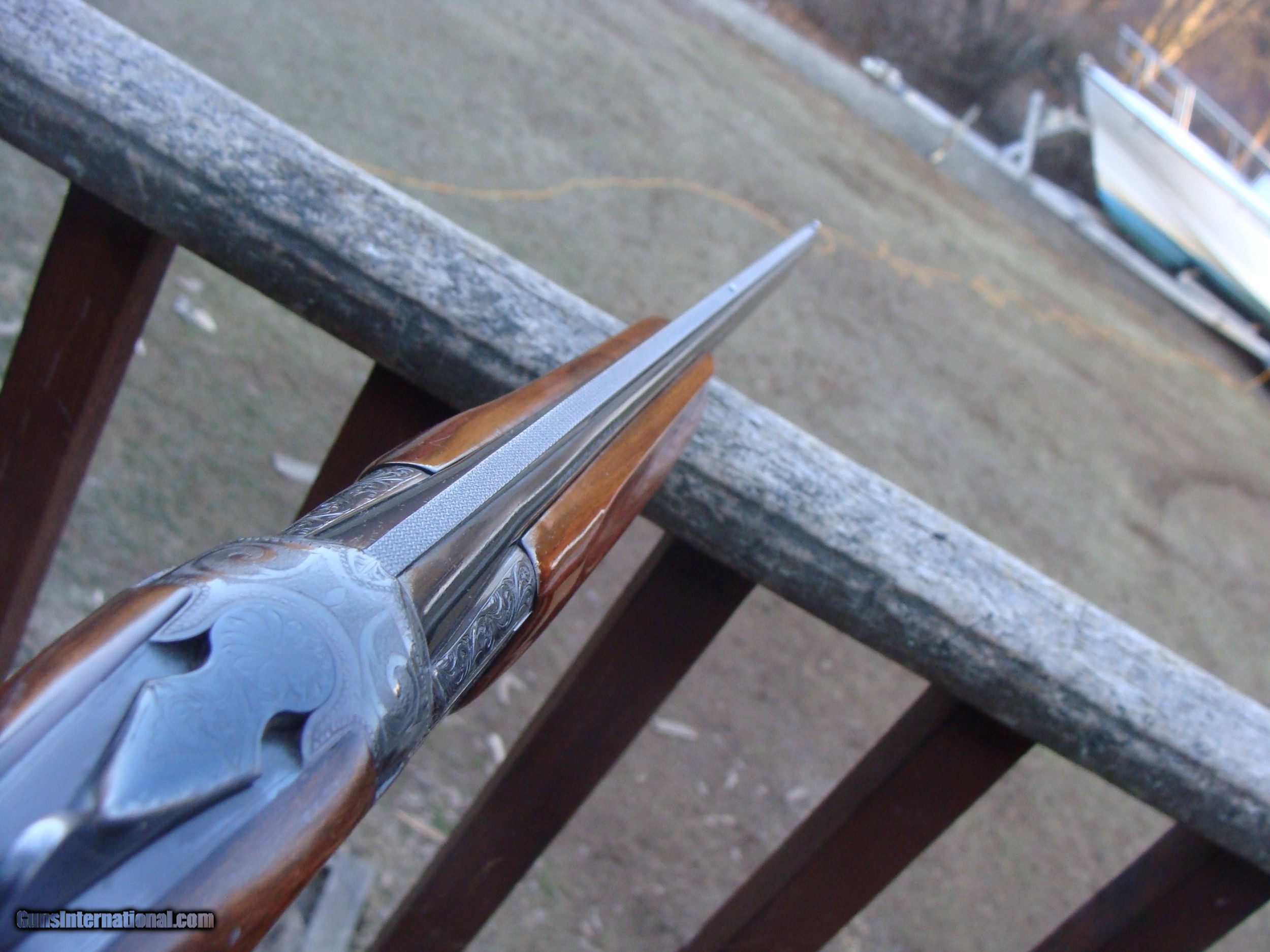 Description: We are a small gun business in the Northeast. I like these litle guns so much i own 3 of them! Although made in the same plant as almost all of the Browning Over and Unders and the BSS side by sides, they more closely resemble the early Winchester 101's with deep relief engraving, well executed checkering and of high quality. They point and handle about exactly like a Belgian Superposed which in 410 would cost today approx 5k. This gun is being offered for a fraction of that and is approx 1000.00 less than ones exactly like it are being sold for. It was a quail gun and was hunted but well cared for. It has a number of compression marks on the handsom stock set, but few if any have penetrated the finish. There have been no repairs, or damaged and there are no non factory modifications. There is some light frosting at the muzzle end of the lower barrels and other small imperfections associted with a field gun that has been used. This area is pictured in the last photo....it is the set of barrels at the top of the picture (gun is upside down such that the barrel at the top of the pic is the underside of the lower barrel) As a classic field gun it is choked (markings indicate) M&F chokes (not common in 410's) Vented rib barrels are 26" and stock LOP is 14 approx. Blue is 85 to 90%. It locks up very tightly and the lever is centered. It has a single selective trigger and H safety exactly like the Superposed and Citori's. This would be a magnificent little gun to hunt over pointing dogs with and on a skeet field. NOTE: WE WILL BE SELLING A 2D GUN SIMILAR SHORTLY..A FEW PICS SHOWING BOTH ARE INCLUDED BUT ONLY THE GUN DEPICTED HERE IS FOR SALE AT THIS MOMENT. IT IS EASY TO IDENTIFY THE DIFFERENCE AS THE FOREARMS ARE DIFFERENT AS IS THE ENGRAVING. THE 2D GUN HAS A ROUND KNOB WE ARE AN FFL 01 IN THE NORTHEAST WHERE MANY FINE US MADE GUNS WERE PRODUCED AND WE OFTEN GET SOME FAIRLY HARD TO FIND UNIQUE AND HARDLY USED GUNS. WE HAVE OVER 1500 SALES ON ALL SITES WITH AN A+ RATING ON ALL (WE ALSO KEEP AN INVENTORY OF OLDER PERIOD CORRECT SCOPES; CALL WITH NEEDS) WE MOSTLY PICK VERY CLEAN GUNS, PRICE THEM FAIRLY AND WORK WITH MODEST MARGINS WE ARE HAPPY TO TAKE CONSIGNMENT GUNS AND COLLECTIONS OR WILL BUY YOURS OUTRIGHT. WE SOMETIMES ARE EMPLOYED FOR ESTATE PURPOSES AND VALUATIONS. CT RESIDENTS MUST CONTACT US TO UNDERSTAND OUR IN STATE TRANSFER POLICIES. WE CAN TAKE A CREDIT CARD HOWEVER THERE IS A 3% ADD ON BASED ON THE TOTAL FOR USE OF A CARD. IT IS ALWAYS THE BUYERS RESPONSIBILITY TO GET US A COPY OF YOUR RECEIVING FFL'S LIC AND WE REQUIRE A COPY OF YOUR PHOTO ID BEFORE THE GUN SHIPS YOU MUST CALL YOUR FFL.WE DO NOT CALL FOR YOU. LAYAWAY'S OK WITH MOST OF OUR GUNS (INQUIRE) SHIPPING IS $ 45.00 TO MOST LOCATIONS SHIPPED PRIOIRITY SOLD |
