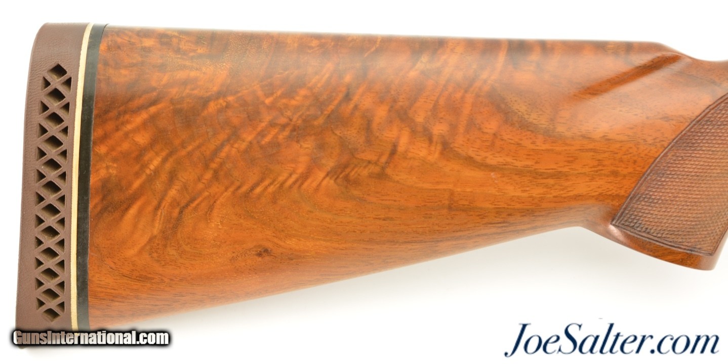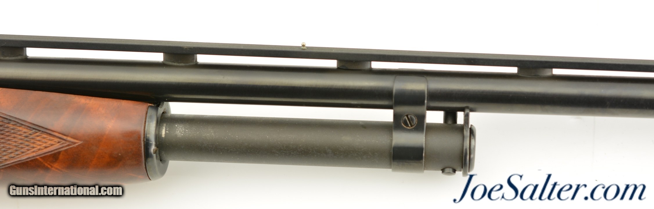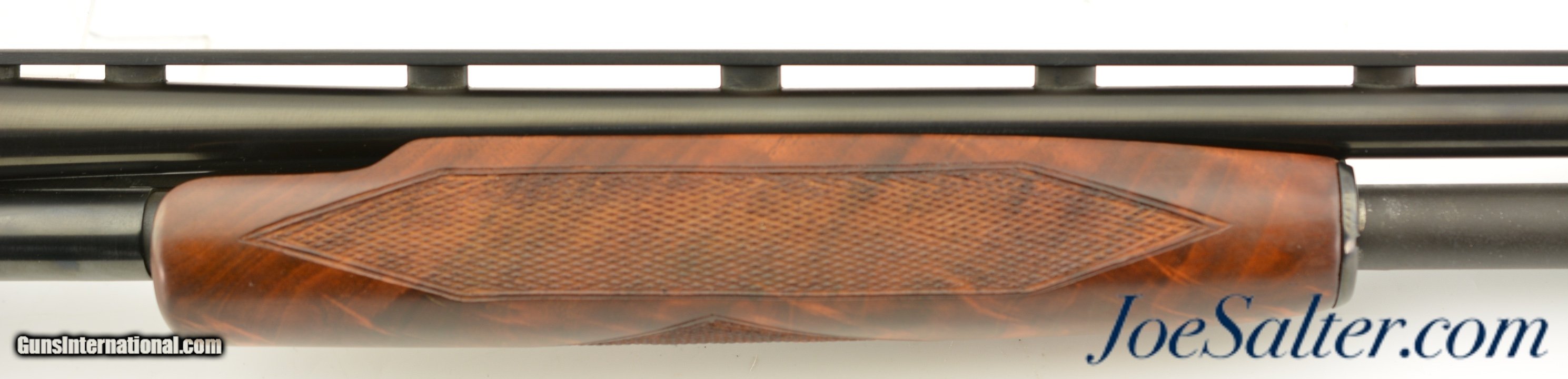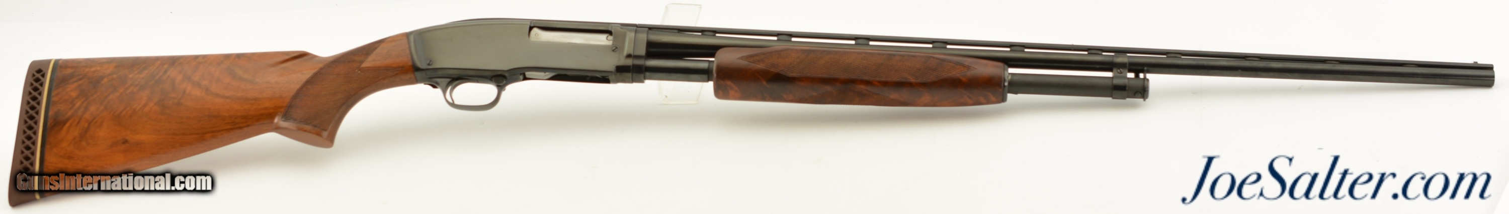 Description: Serial #81779, .410 Gauge (3 inch chamber), 28 inch vent rib barrel with a bright, excellent bore choked modified. This is a model 42 Winchester pump shotgun manufactured in 1949 that has been professionally restored and now features the last type oval post vent rib marked "SIMMONS GUN SPECIALTY CO., KANSAS CITY, MO" which covers the Winchester proof. It also features beautiful deluxe checkered walnut stocks with the single center diamond pattern. In excellent plus condition as refinished the barrel and frame have about 97-99% blue finish with several small marks on the barrel and two tiny blemishes on the right side of the receiver with some finish loss on the magazine tube. The full figured walnut stock and forearm rate excellent with crisp checkering. The LOP is 14 inches over a Pachmayr White Line rubber recoil pad. A beautiful model 42 that would be a pleasure to shoot and will turn a few heads at the range or in the field. FFL or C&R; SOLD Curio/Relic: Yes |