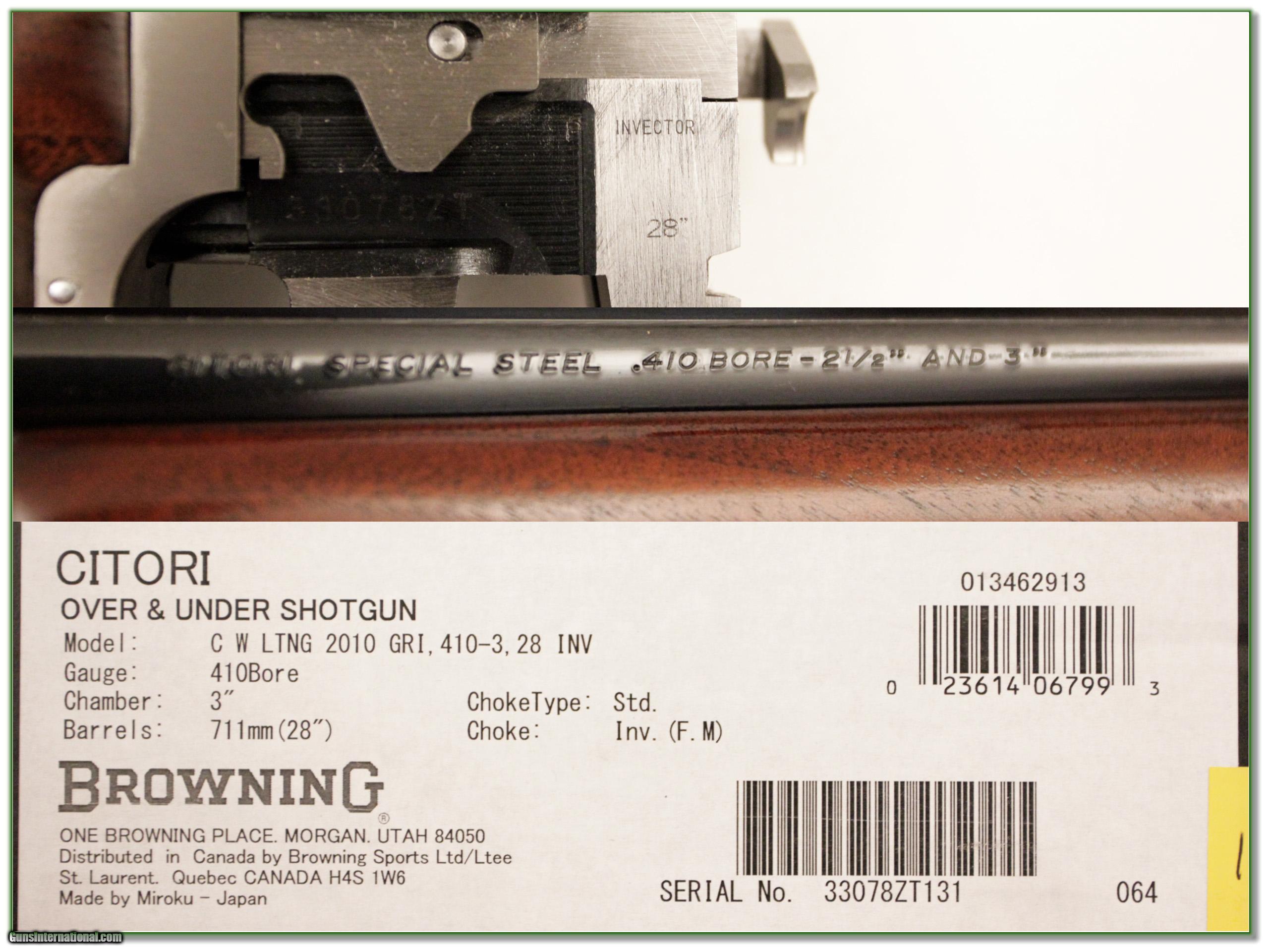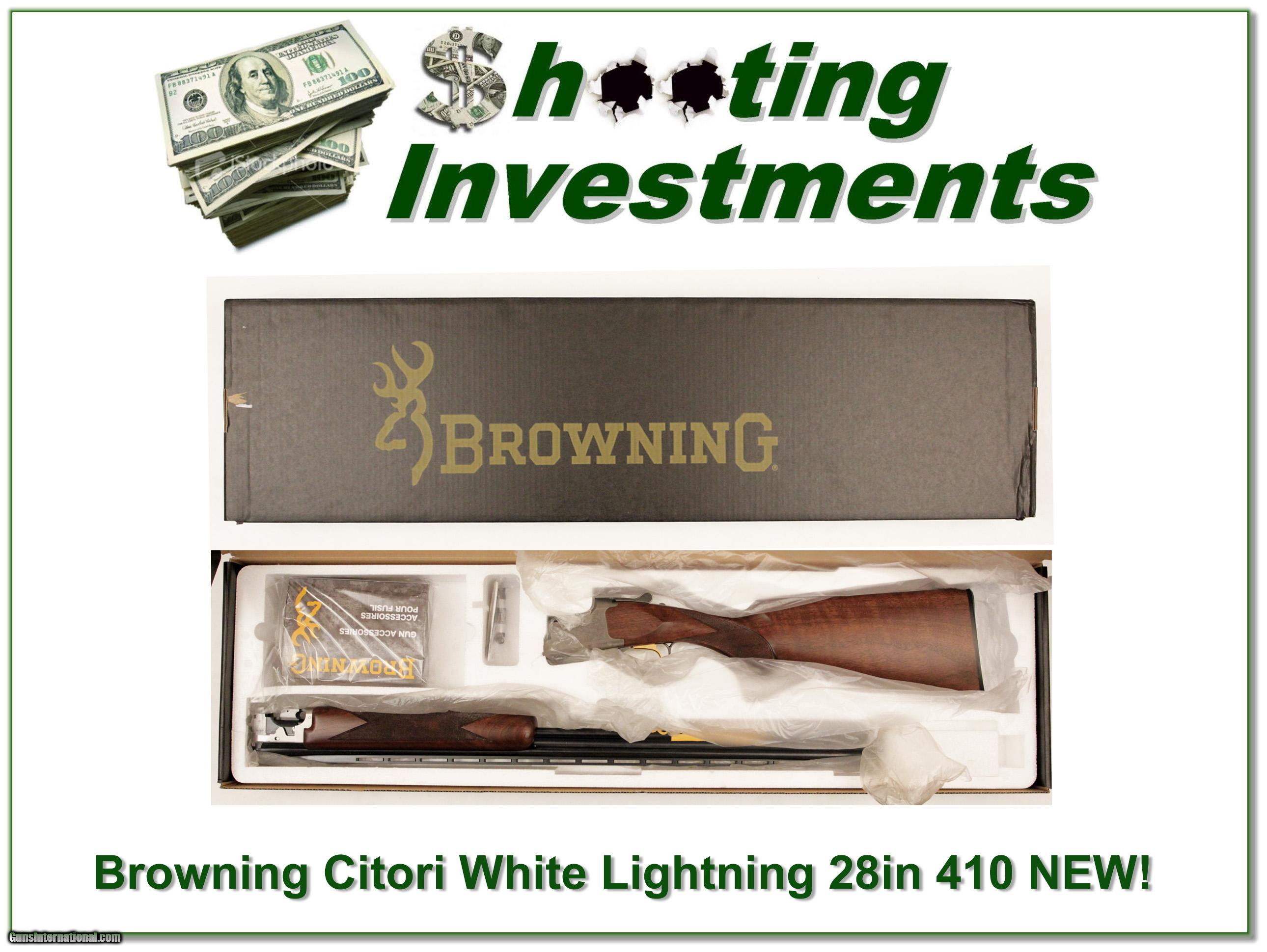 Description: This is a very hard to find 28in 410 Browning Citori White Lightning. It is factory new and perfect! Shipping and insurance is $35 or $15 more if you want it shipped in a new Plano hard case. Please email me with any questions or larger pictures. (I now consign quality firearms only 10%! Let me know if you have any you would like to sell!) [16-0346] Payment: Payment is by Money Order, Cashiers Check or Personal Check. I can now also accept MasterCard and Visa with a 3% convenience fee. PayPal can be used for some items but never firearms. Please let us know if you would like to pay via PayPal. Shipping: The shipping charge will be listed in each description. It is $35 for most guns. Some heavy guns or those insured for over $2000 will be higher. Shipments to Alaska and Hawaii are higher because air shipment is required. Most firearms are shipped within 5 days of receipt of payment. We prefer shipping at the beginning of the week to avoid firearms in transit over weekends. We package all shipments carefully and insure them for the full purchase price, rounded up to the next $100. In the unlikely event that damage occurs, it is important that you save all packaging material for the claims process. Optics are shipped Priority Mail and most other non-firearm shipments are shipped First Class. Returns: Our return policy is simple. If for any reason you are not pleased with your purchase, you may return your item for a refund. The only exception is ammunition, it cannot be returned. It is important to us that you are happy. Guns cannot be fired or dissembled before returning them and must be returned in the same condition as received. Notification of a return must occur with-in 3 days of receipt at your dealer. Shipping, convenience and dealer fees are not refundable and are the responsibility of the buyer. Lay-a-way: If needed, we offer a 60 day lay-a-way option on most firearms. It is 1/3 now, 1/3 in 30 days and 1/3 in 60 days. Lay-a-way firearm sales are final. Consigning your firearms with Shooting Investments: We will help you get top dollar for your firearms. While most local guns shops charge 20% or more, our fee is only 10% with a minimum of $50. At your local gun shop it might take months to sell. Selling on-line provides instant access to thousands of interested buyers. You won’t find any other on-line dealer willing to sell your firearms for only 10% or listing every gun on 4 separate s. Selling through an House typically costs the seller 15% and the buyer an addition 15% (so 30%) and you have to wait several months to sell and longer to receive funds. If properly priced, we will sell your firearms in a week or two. Send us an email or give us a call and we’ll explain how easy it is for you to get top dollar. Trading: We collect guns and usually just trade for guns we want to add to our collections. We often sell guns for others wanting to purchase one of ours. We find this the most fair to both of us. Our Commission is only 10% and we hold the gun you want until yours sells. Please contact us if you want to sell one of yours to buy one of ours. Help for California Buyers: We are happy to ship to California. It is the buyer’s responsibility to make sure any item you buy is legal in your state. We are also happy to help with your purchase of a firearm from someone other than us. If you see a gun you would like to buy but the seller can’t or won’t ship to California we can help. You buy the gun and have it shipped to us. We’ll then ship it to your California dealer. The cost for this service is only $30 + shipping. Let me know if we can help! SOLD |