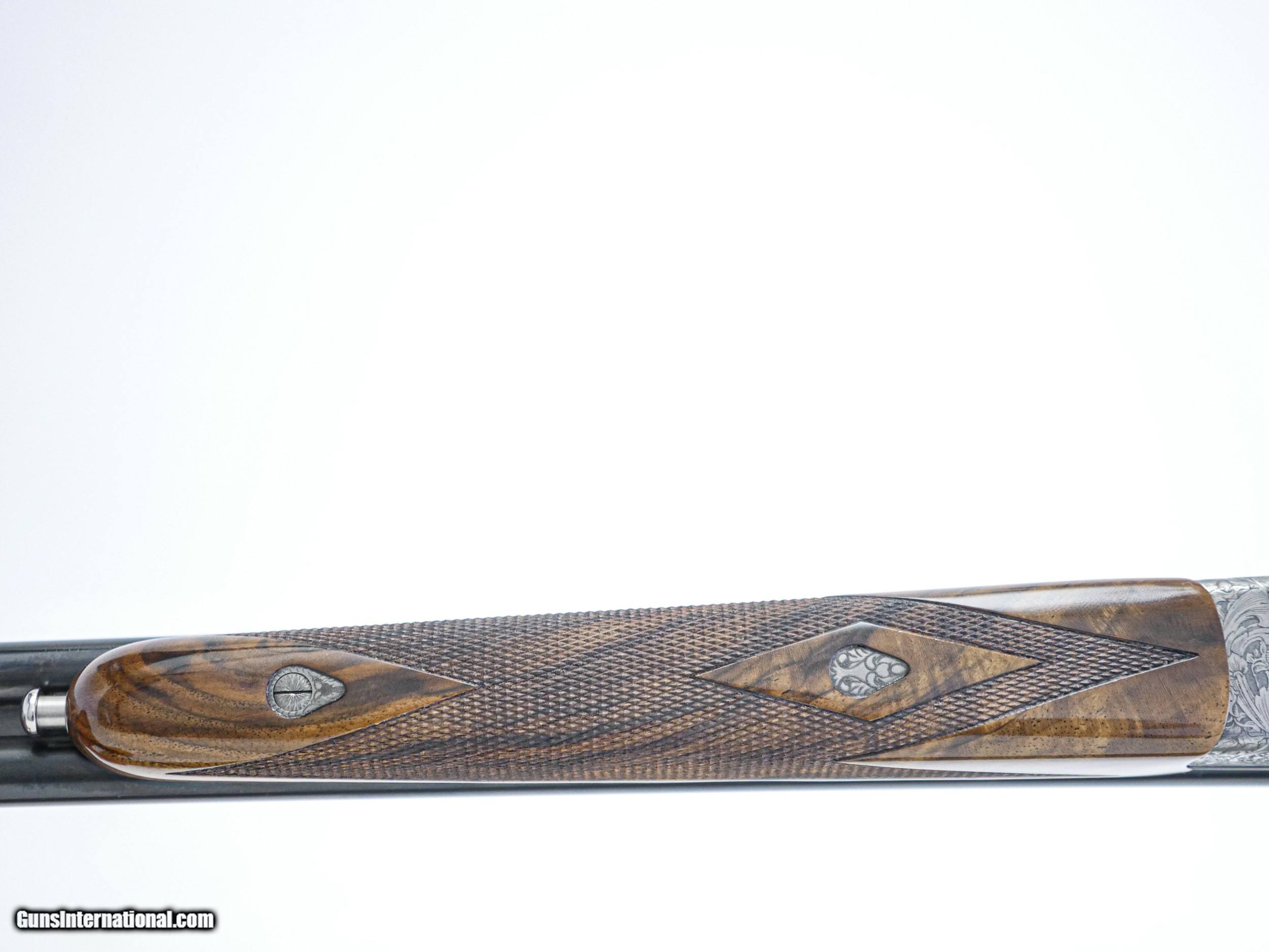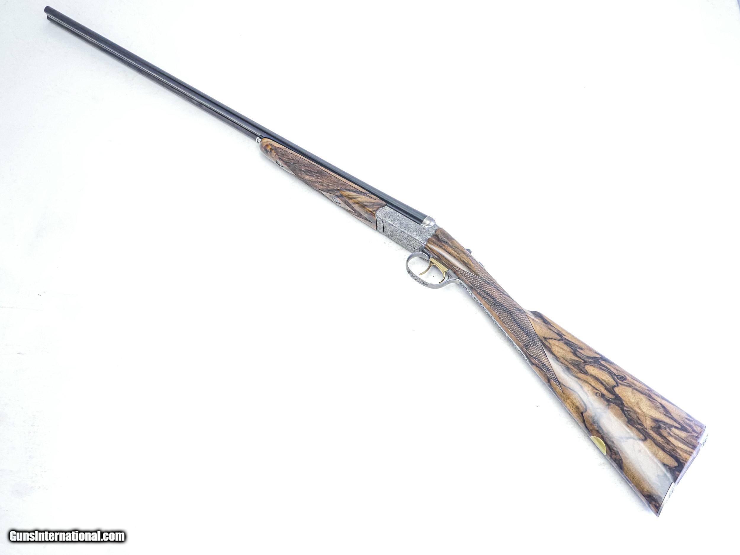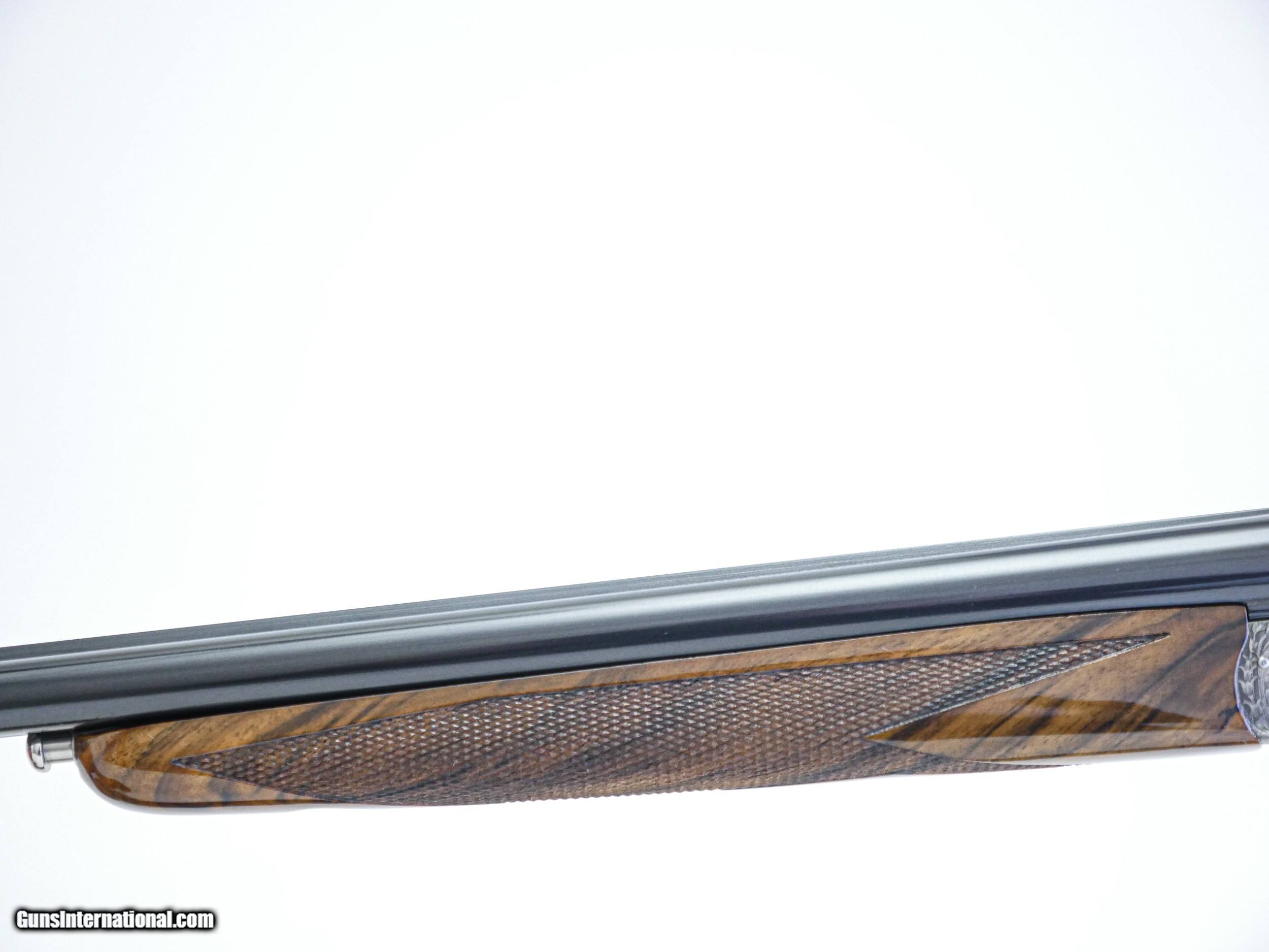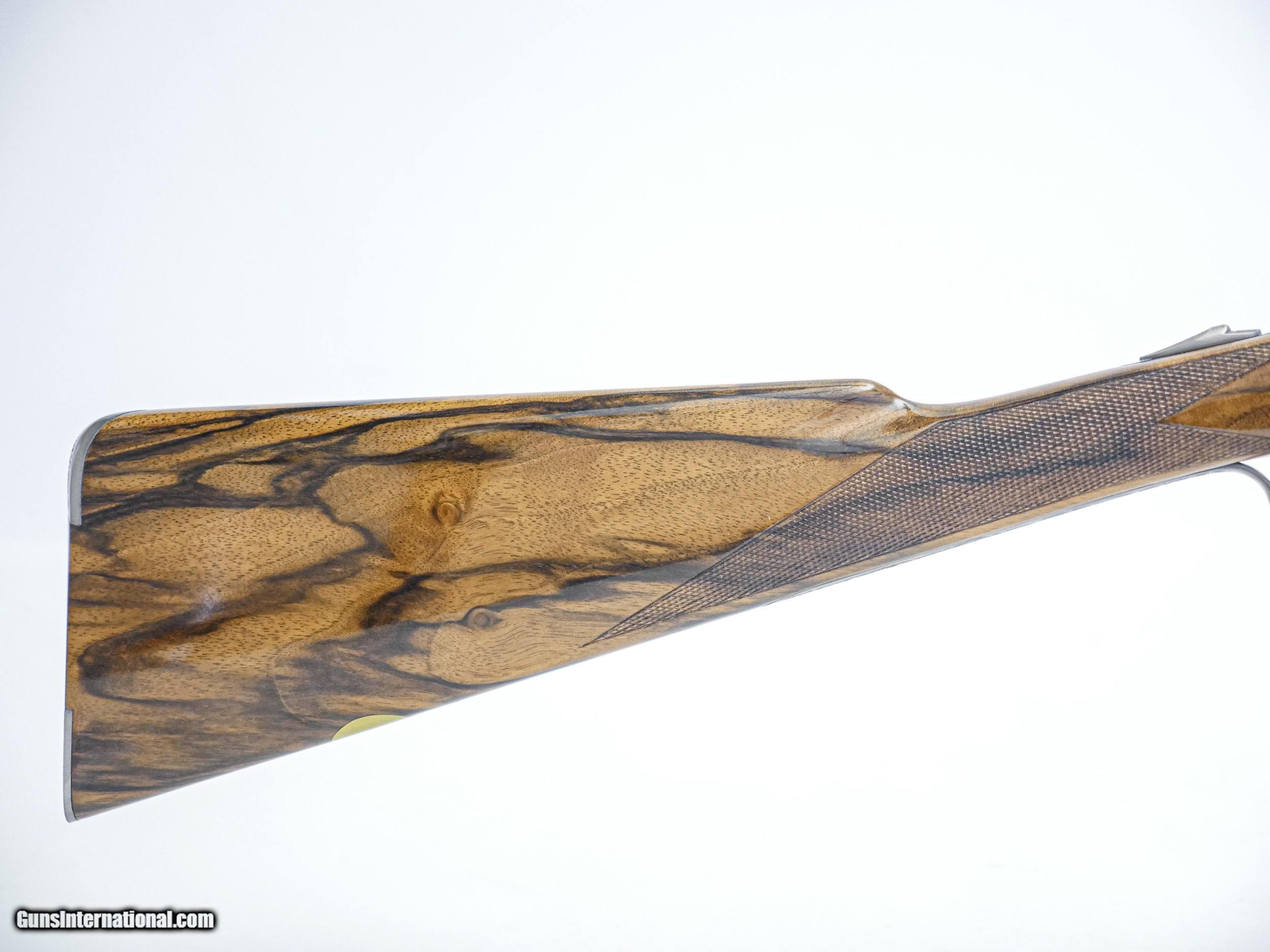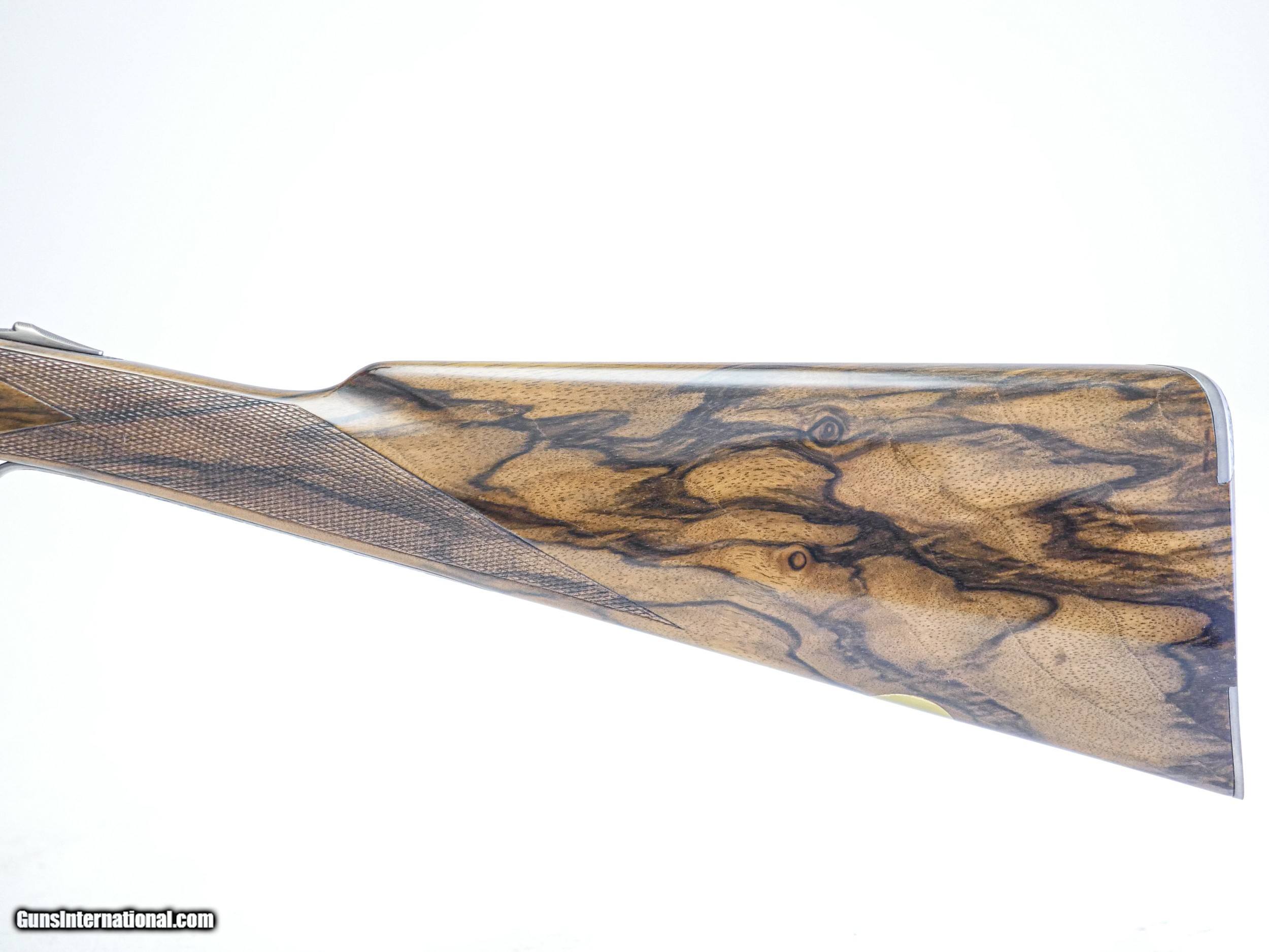 Description: Christian Hunter - .410ga. 28” Barrels Choked F/F. The chokes can be opened up to customer specifications, highly marblecaked exhibition Turkish walnut straight grip stock, long tang trigger guard, heel and toe plates, Tru-oil finish, receiver features a detachable floor plate for inspection, lubricating and cleaning, scalloped receiver, gold oval, small splinter forend, game rib, automatic ejectors, double triggers, Magnificently executed full coverage ornamental deep scroll engraving over a coined finish, perfectly proportioned and diminutive gun weighing only 5 lb., 0 oz., this gun comes with a lifetime warranty to the original owner, factory cased, available for immediate delivery. Inv: 41591 5 lbs. 0 oz. 14 3/4” X 1 1/2” X 2 1/4” $16,799.00 SOLD |