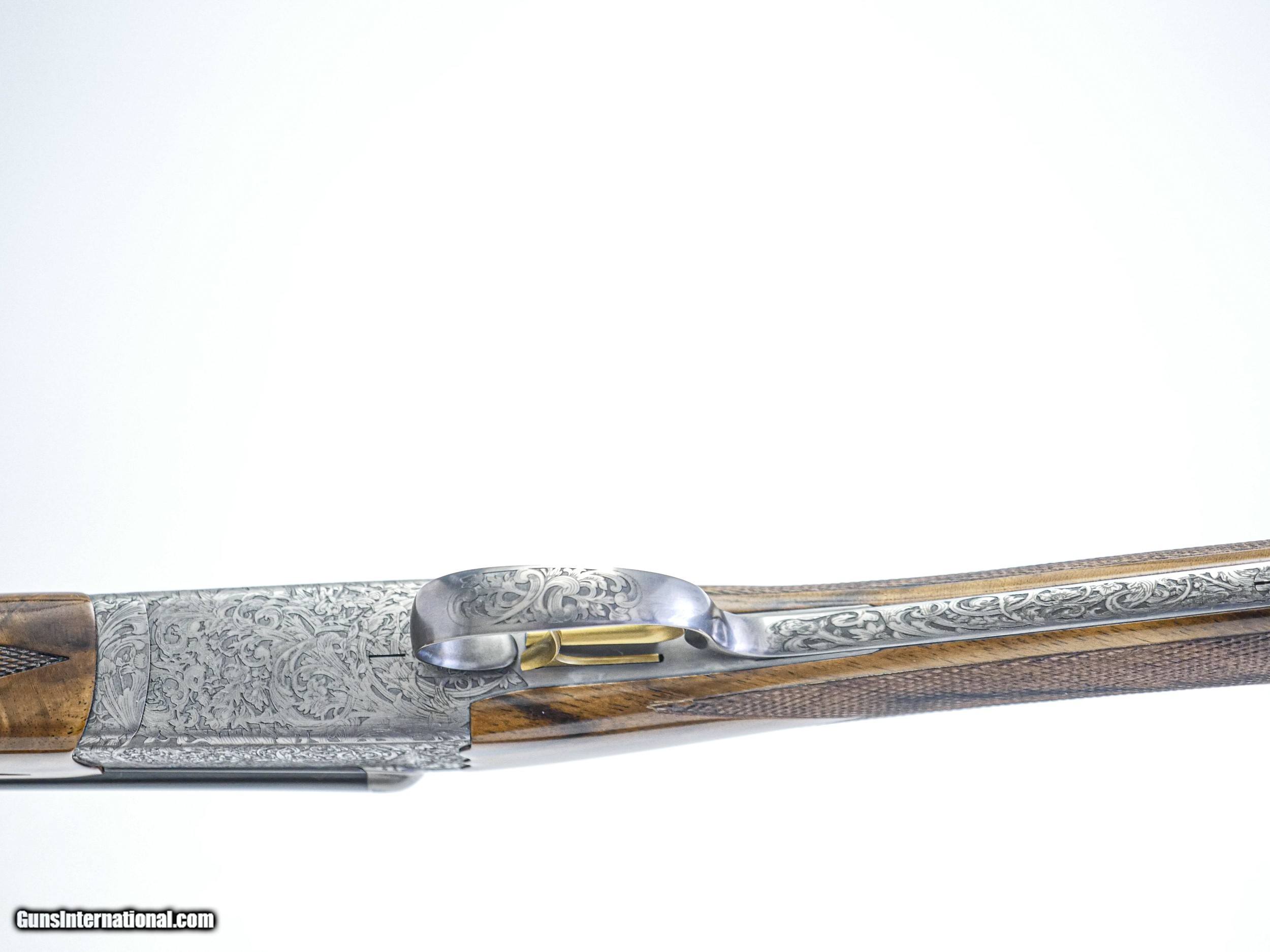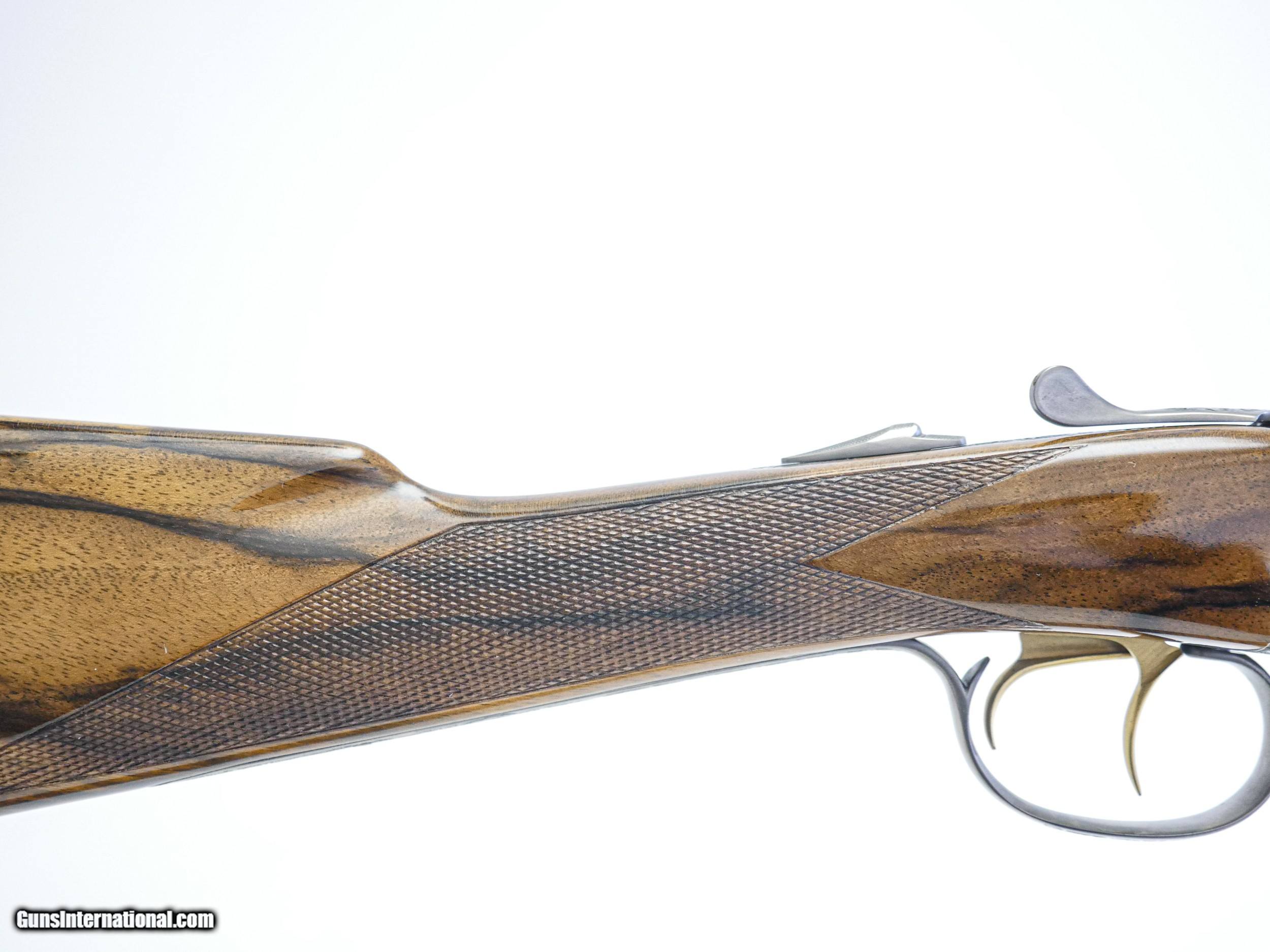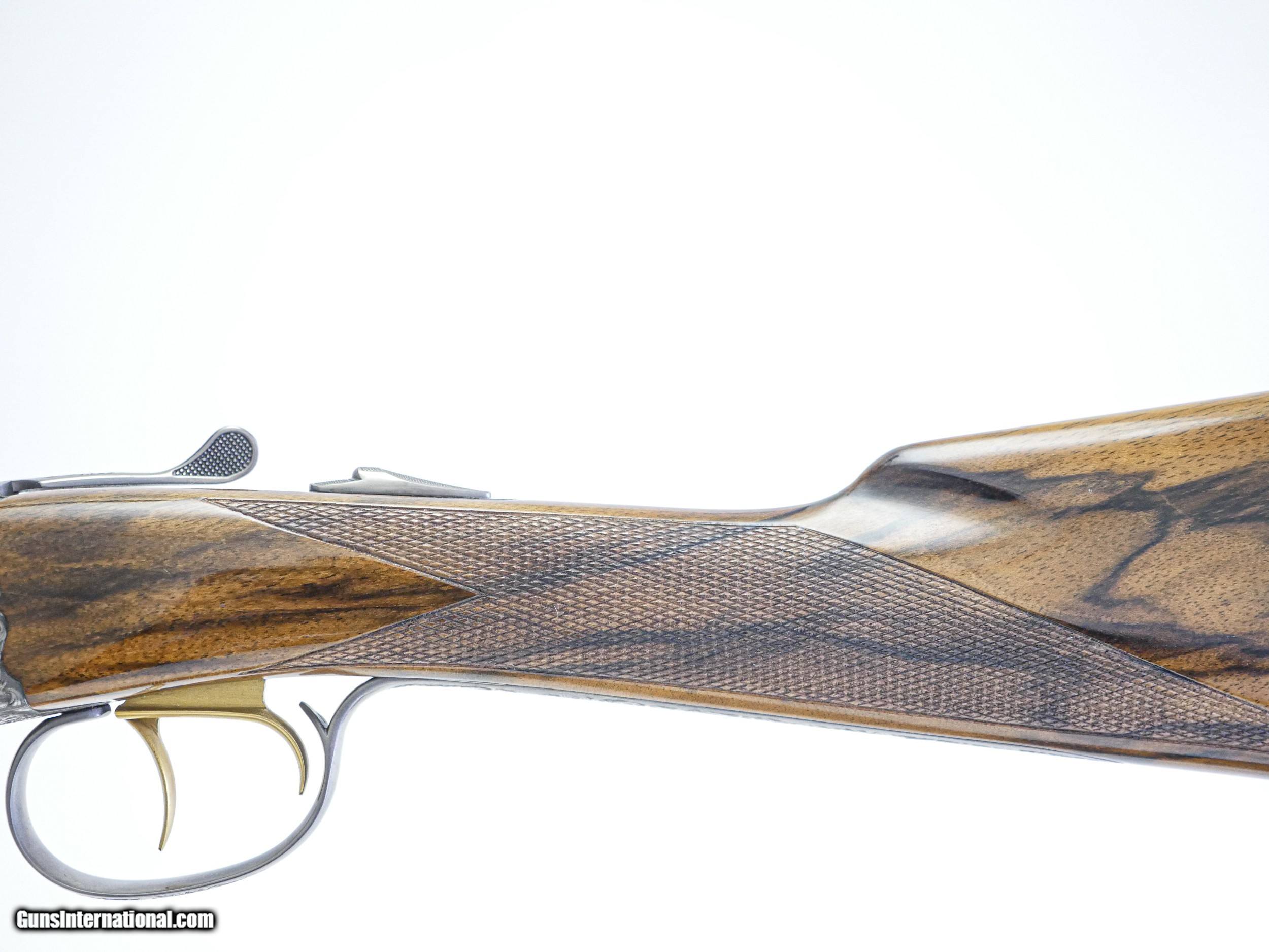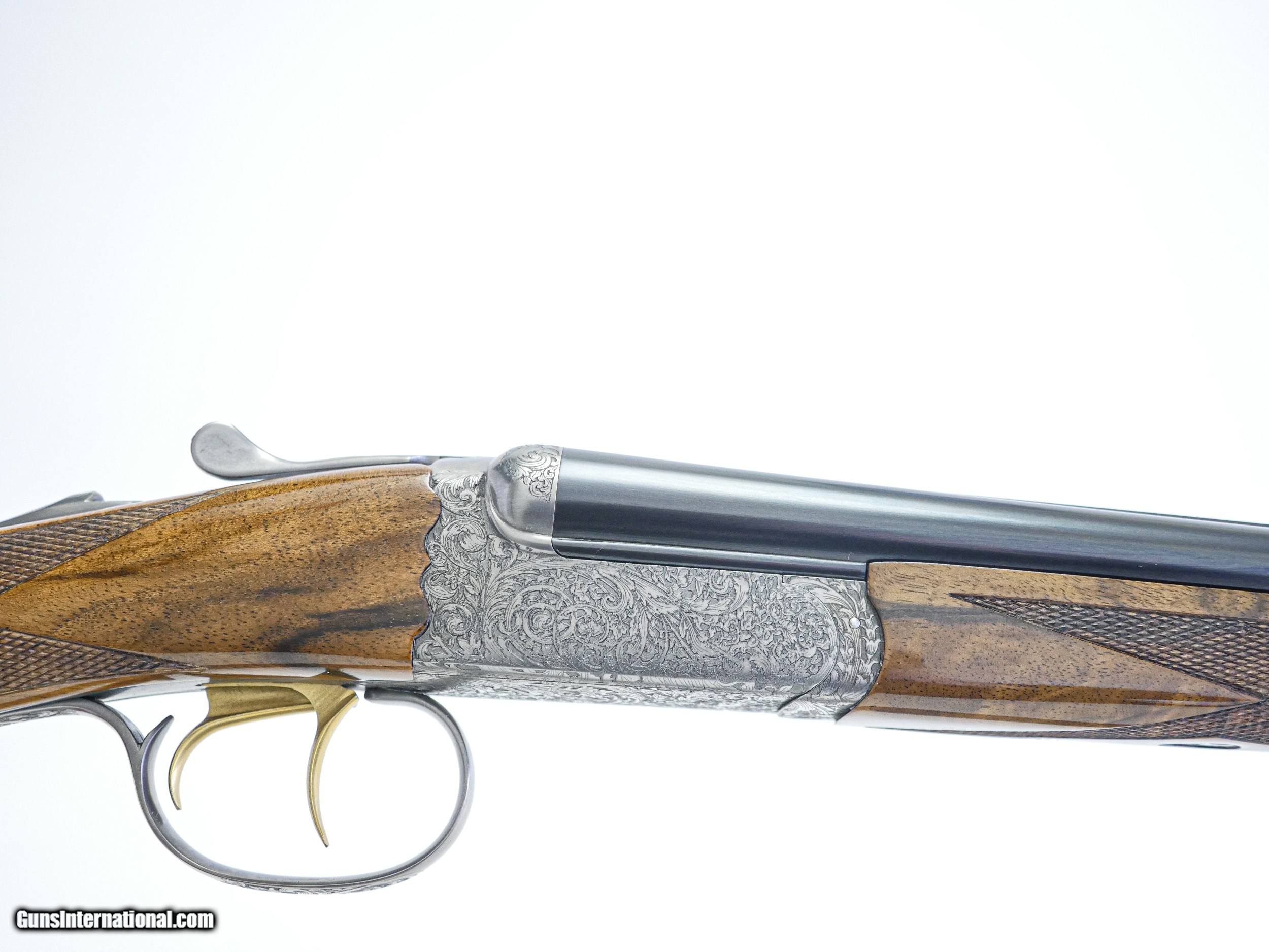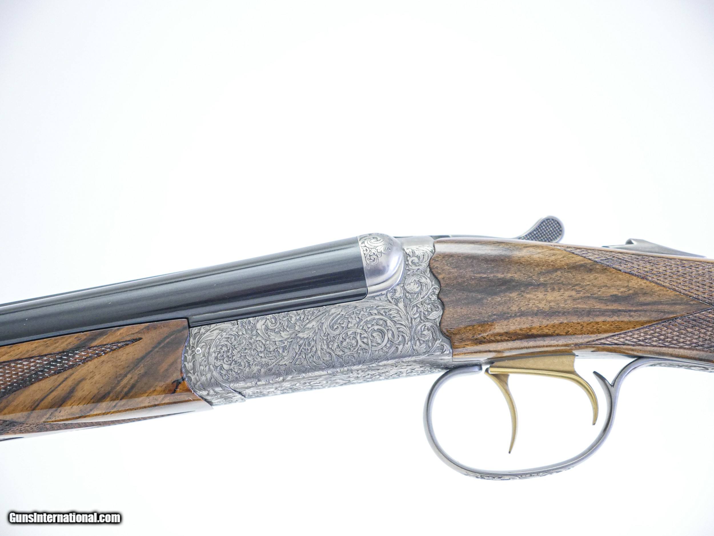 Description: Christian Hunter - .410ga. 28” Barrels Choked F/F. The chokes can be opened up to customer specifications, highly marblecaked exhibition Turkish walnut straight grip stock, long tang trigger guard, heel and toe plates, Tru-oil finish, receiver features a detachable floor plate for inspection, lubricating and cleaning, scalloped receiver, gold oval, small splinter forend, game rib, automatic ejectors, double triggers, Magnificently executed full coverage ornamental deep scroll engraving over a coined finish, perfectly proportioned and diminutive gun weighing only 5 lb., 0 oz., this gun comes with a lifetime warranty to the original owner, factory cased, available for immediate delivery. Inv: 41591 5 lbs. 0 oz. 14 3/4” X 1 1/2” X 2 1/4” $16,799.00 SOLD |