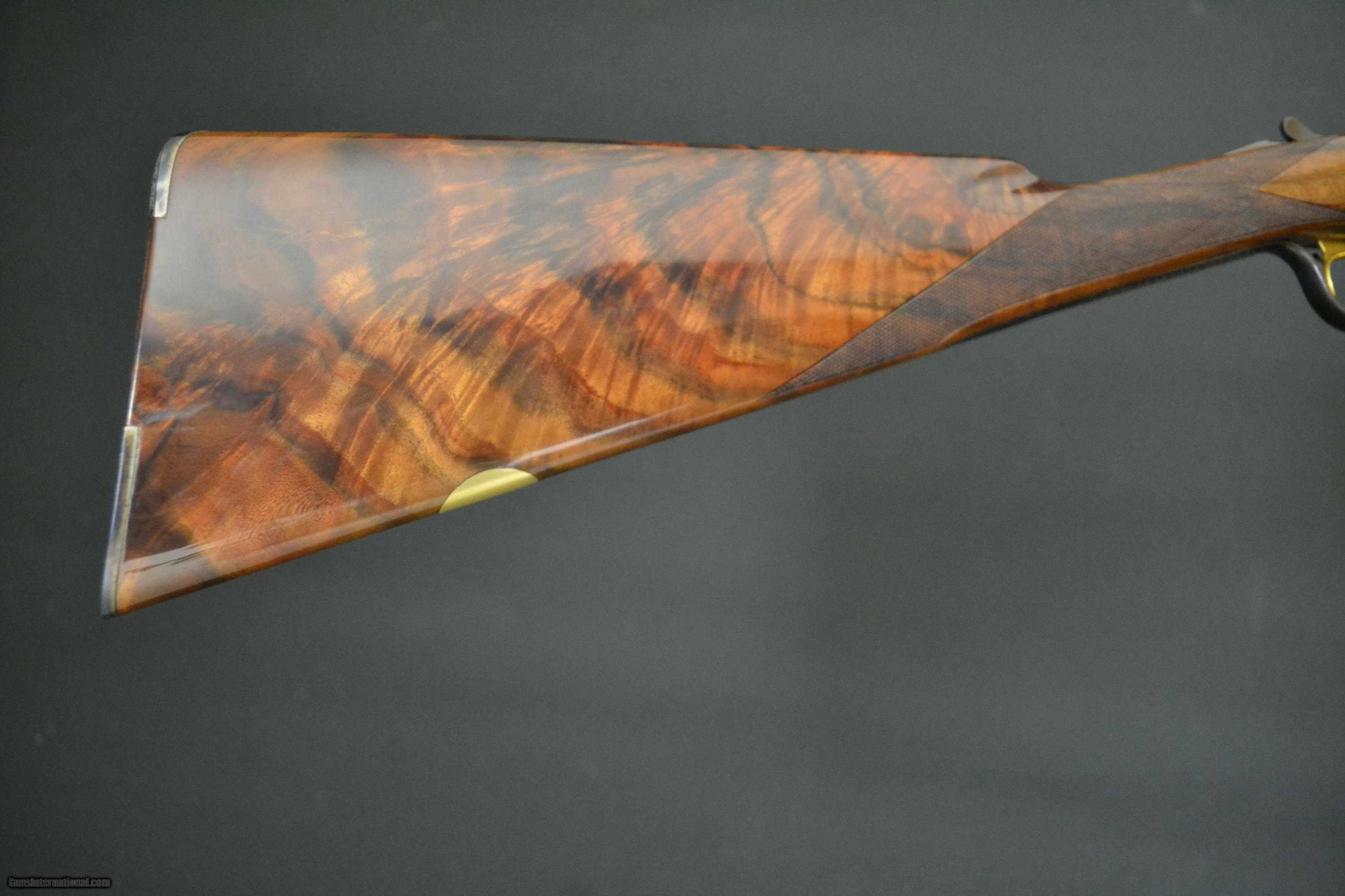 Description: CSMC Christian Hunter .410, 26” barrels choked F/F. This is a special scalloped small dedicated baby frame .410 with a detachable floor plate. Straight grip heel & toe plates, gold oval, splinter forend. Magnificently executed miniature Rose & Scroll engraving that has bulino details that is just at the highest level of very intricate Rose & Scroll pattern. Mind blowing piece of fully engulfed old growth black American walnut, feather crotch. Double Trigger, Auto Ejector, 3” chamber. This gun comes with a lifetime warranty designed and built by CT shotgun. Based on the true Anson & deeley system without any modern methods. This is a true high grade, handmade shotgun. Inventory # 33162 15 3/8 x 1 ¼ x 2 5Lbs 4 oz $14,850.00 SOLD |