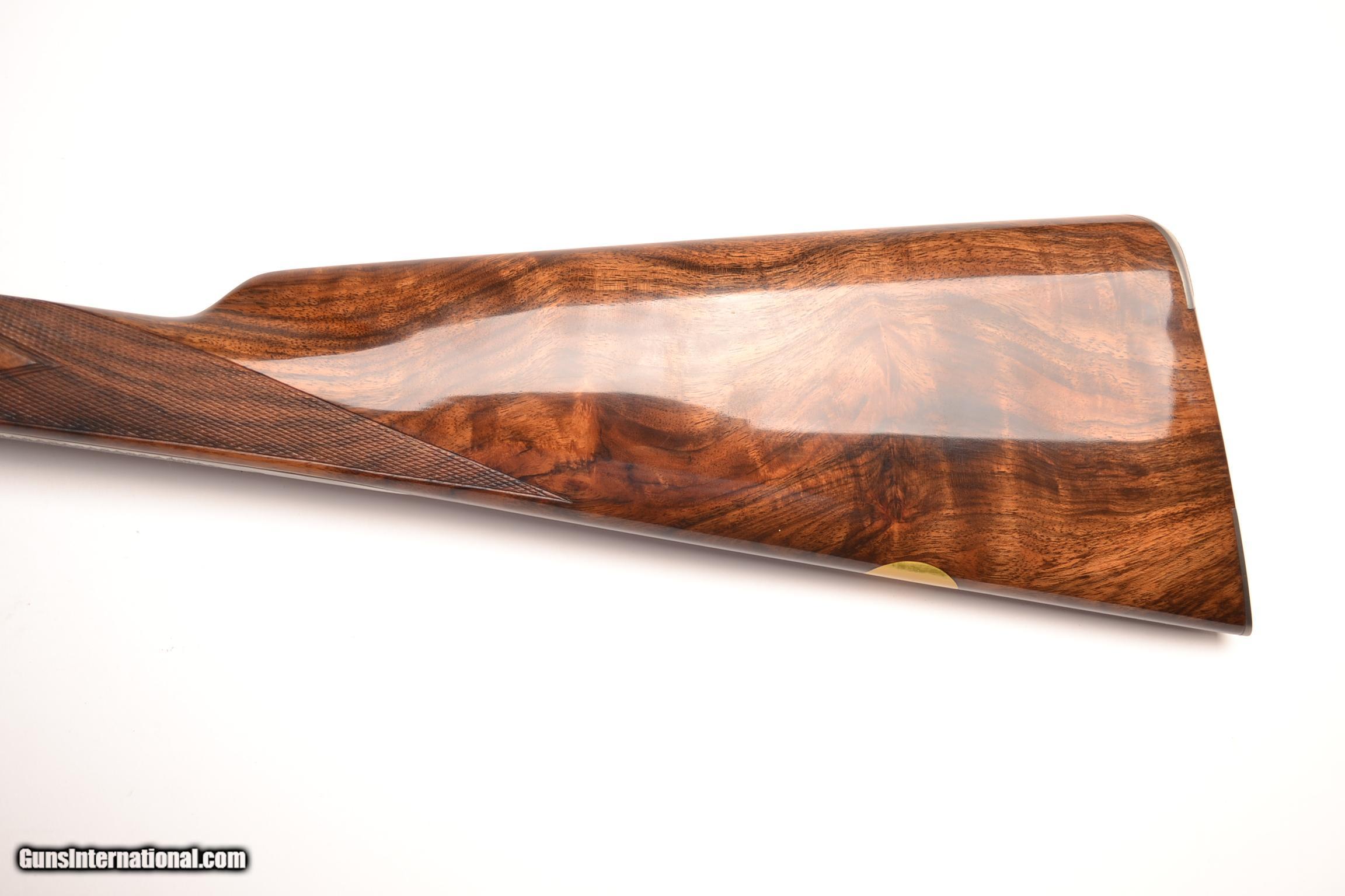 Description: CSMC Christian Hunter, .410 28” barrels choked F/F, will open chokes to specifications. The very finest Turkish circassian walnut, straight grip stock to metal heel and toe plates. English drop points, small slender beavertail forend, single selective trigger, auto ejector, concave rib, gold oval, Platinum engraving pattern of Quail with Labrador on bottom. This shotgun comes with a lifetime warranty, it is new and unfired and comes in makers case. This is the smallest, slenderest .410 on the market. Inventory # 39645 14 ½” x 1 ½” x 2 ¼” 5 lbs 4 oz. Price - $24,995 SOLD |