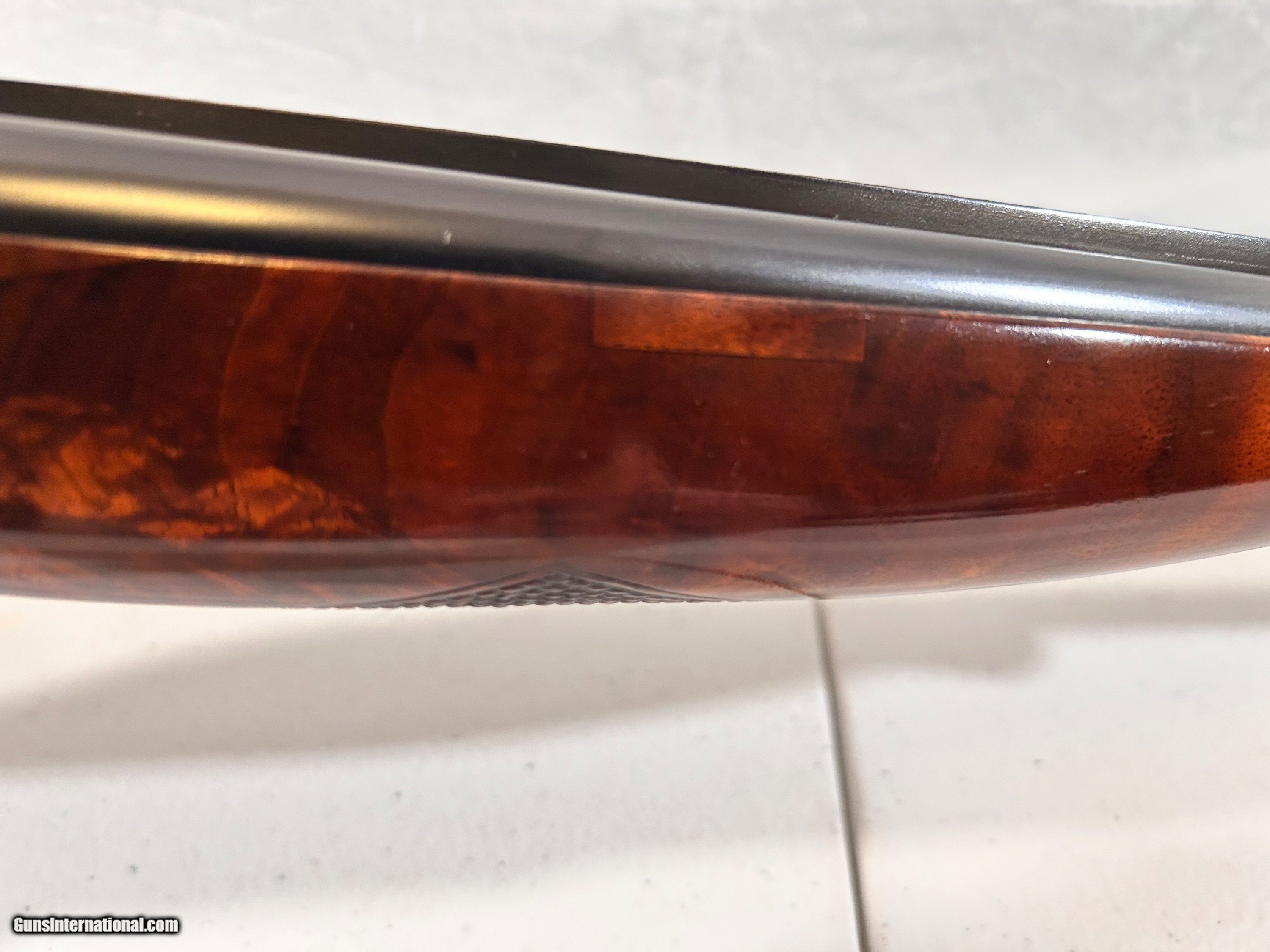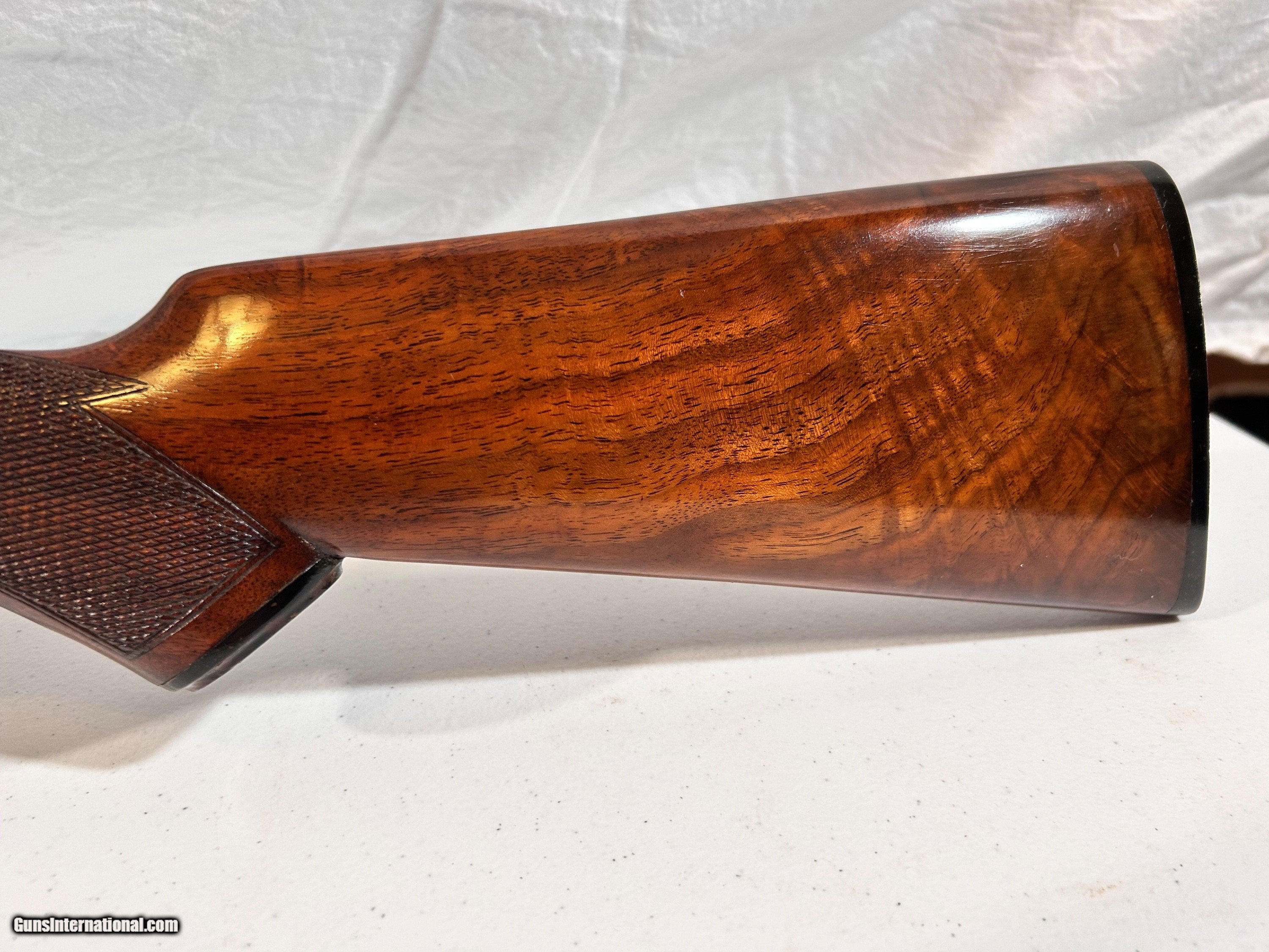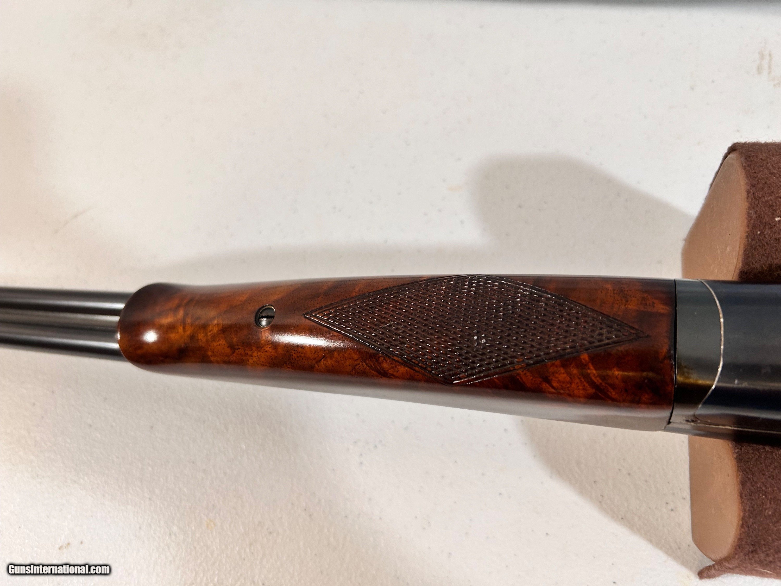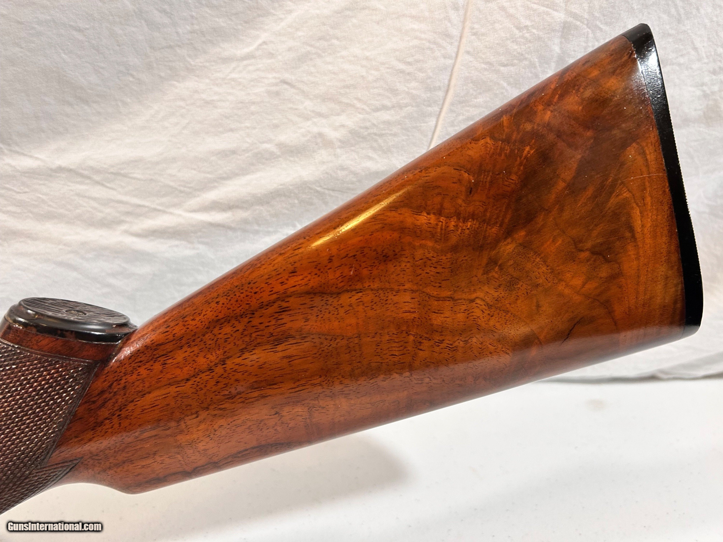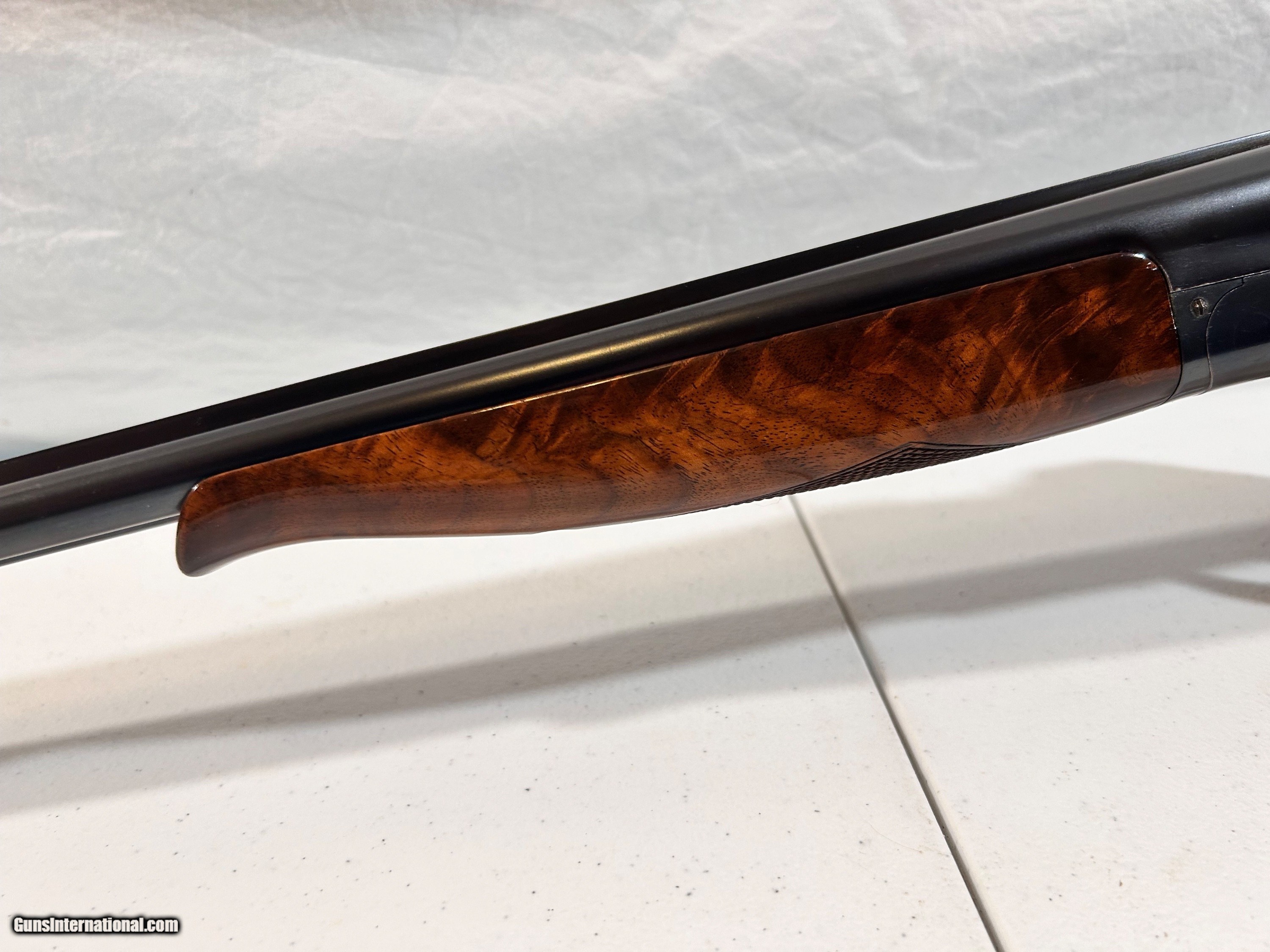 Description: A Beautiful Skeeter which appears to seen little use retaining 98% original Blue. The checkered deluxe American walnut stock with splinter forend with very nice feathercrotch figure throughout remains in excellent condition with a small repair on the right side of the forearm. See photo #5. The 28in. Bbl is choked modified and full. 14in lop drops of 1 1/2in. and 2 1/2in. This is a very attractive little 410. Collector Quality. Please add 75$ S/H. Be sure to "click on see all of Fitzgerald's Fine Guns Curio/Relic: Yes Shotgun Gauge: .410 Gauge Manufacturer: Iver Johnson Model: Skeeter Serial Number: 25092 Barrel Length: 28in. Condition: Very Fine Metal Condition: Excellent Wood Condition: Very Nice Bore Condition: Excellent LOP: 14in. Rib: Solid rib Price: $4,750.00 Buy Now Contact Seller |