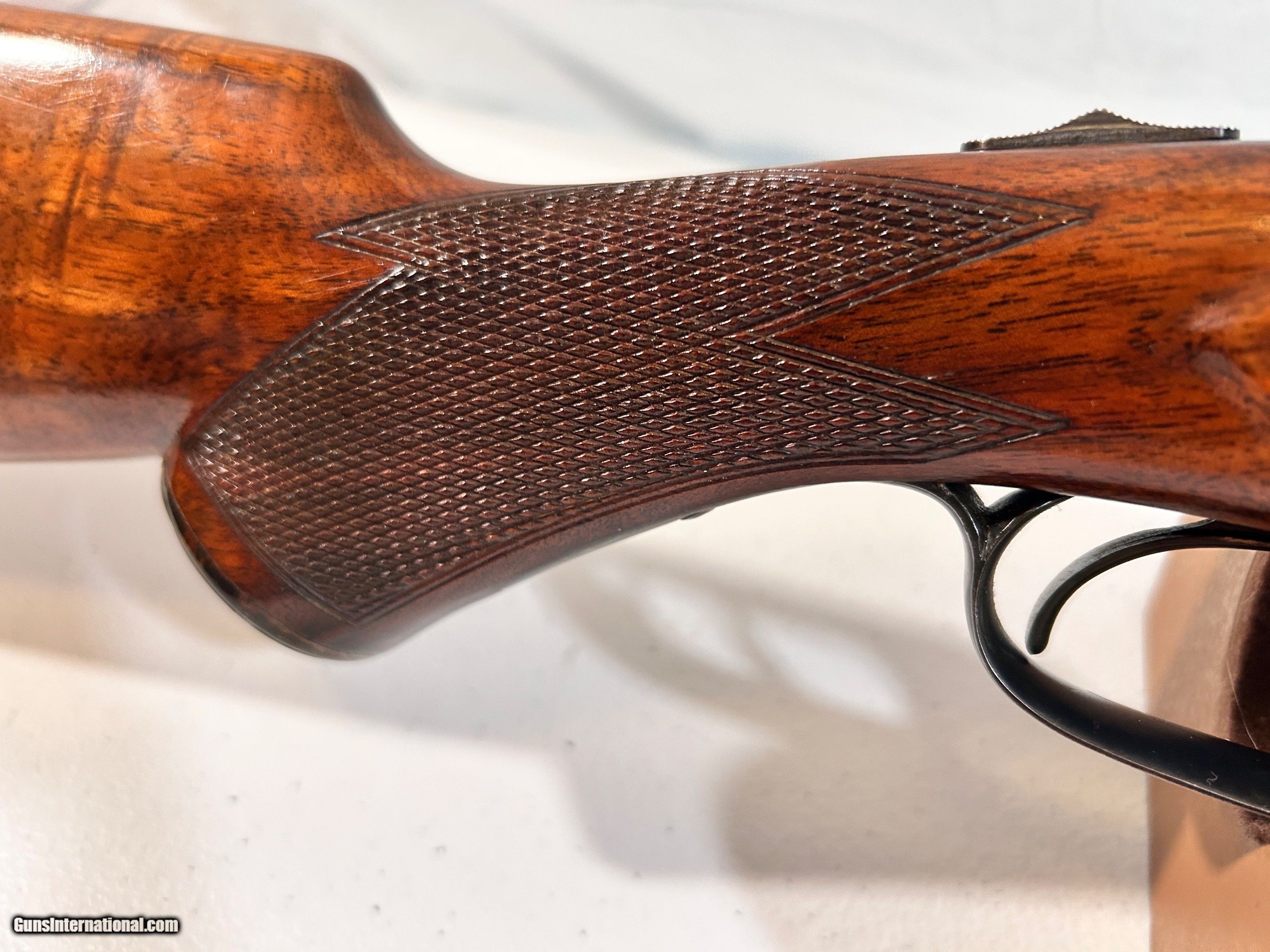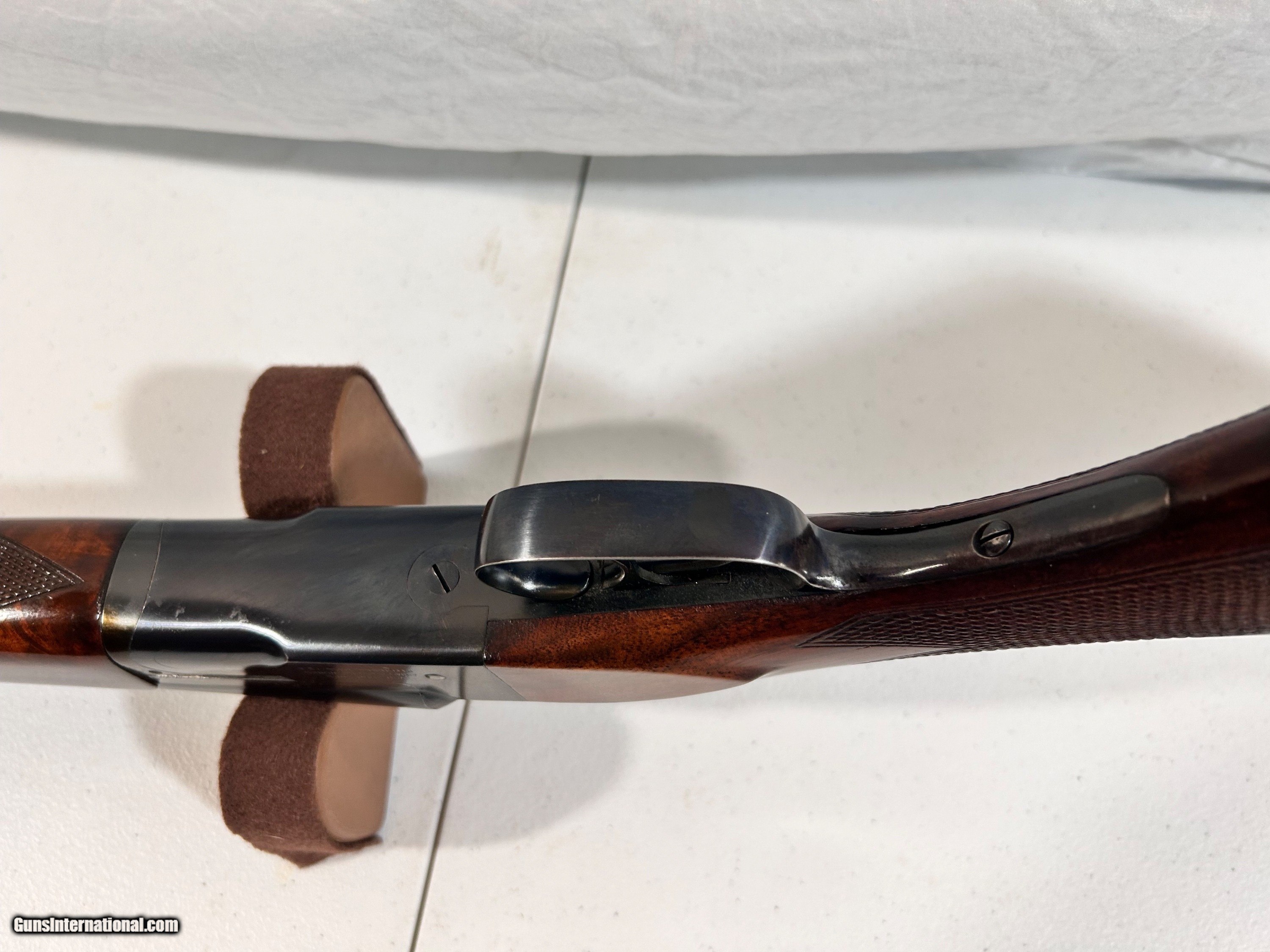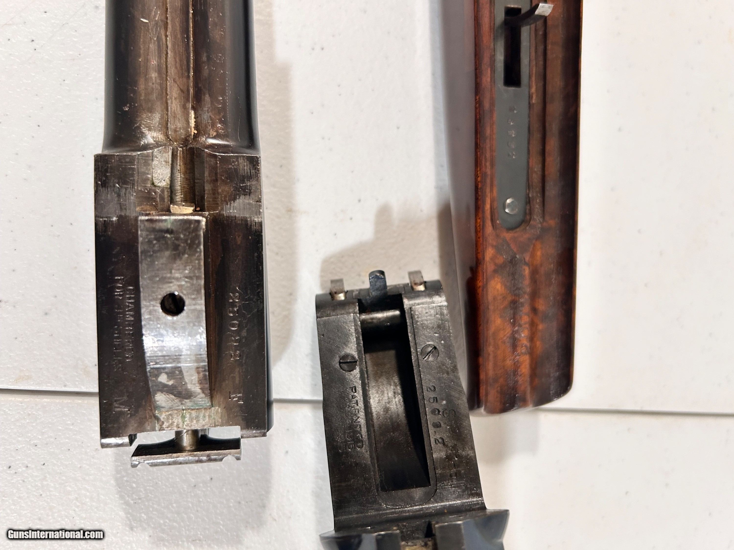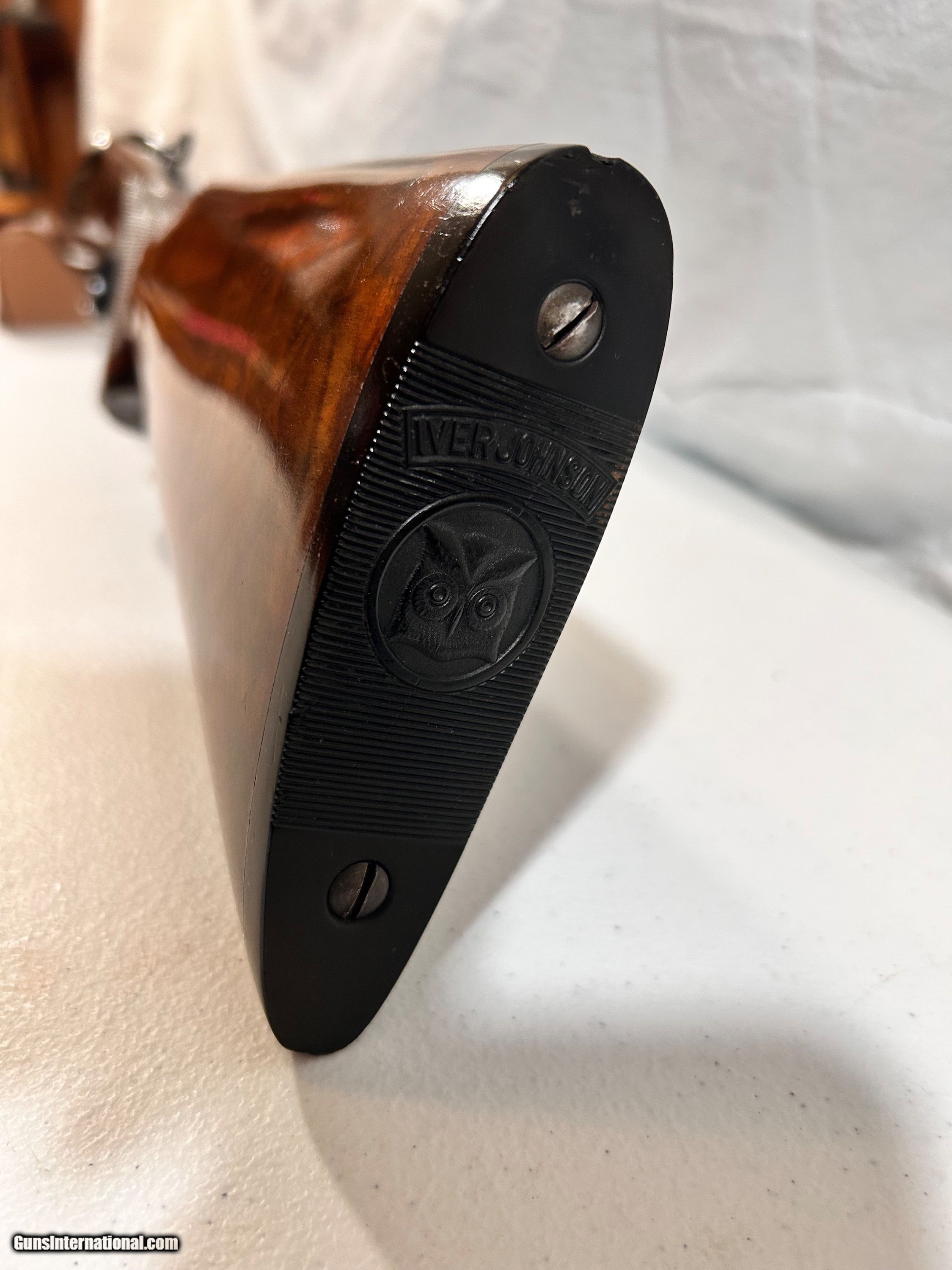Description: A Beautiful Skeeter which appears to seen little use retaining 98% original Blue. The checkered deluxe American walnut stock with splinter forend with very nice feathercrotch figure throughout remains in excellent condition with a small repair on the right side of the forearm. See photo #5. The 28in. Bbl is choked modified and full. 14in lop drops of 1 1/2in. and 2 1/2in. This is a very attractive little 410. Collector Quality. Please add 75$ S/H. Be sure to "click on see all of Fitzgerald's Fine Guns Curio/Relic: Yes Shotgun Gauge: .410 Gauge Manufacturer: Iver Johnson Model: Skeeter Serial Number: 25092 Barrel Length: 28in. Condition: Very Fine Metal Condition: Excellent Wood Condition: Very Nice Bore Condition: Excellent LOP: 14in. Rib: Solid rib Price: $4,750.00 Buy Now Contact Seller |