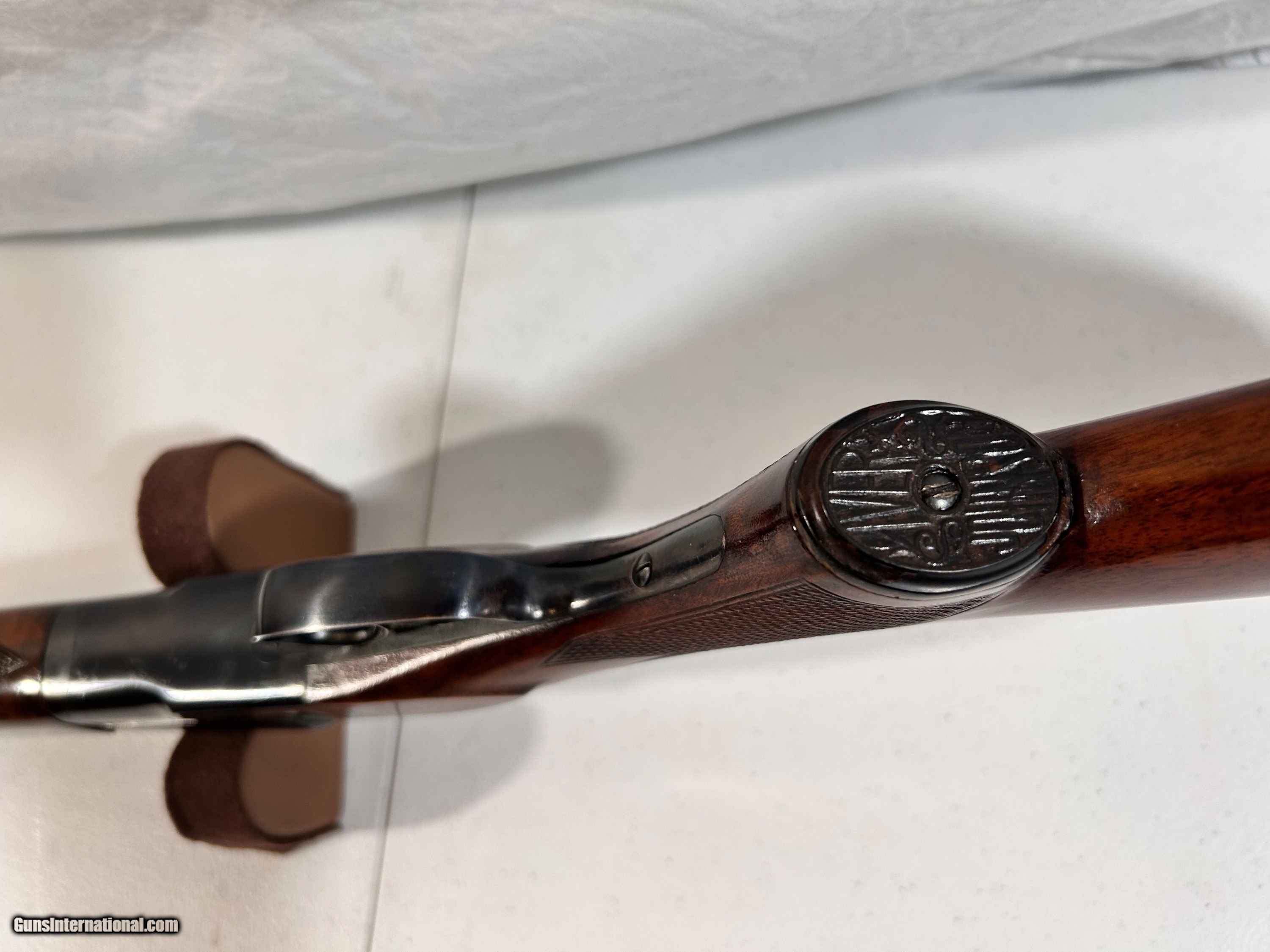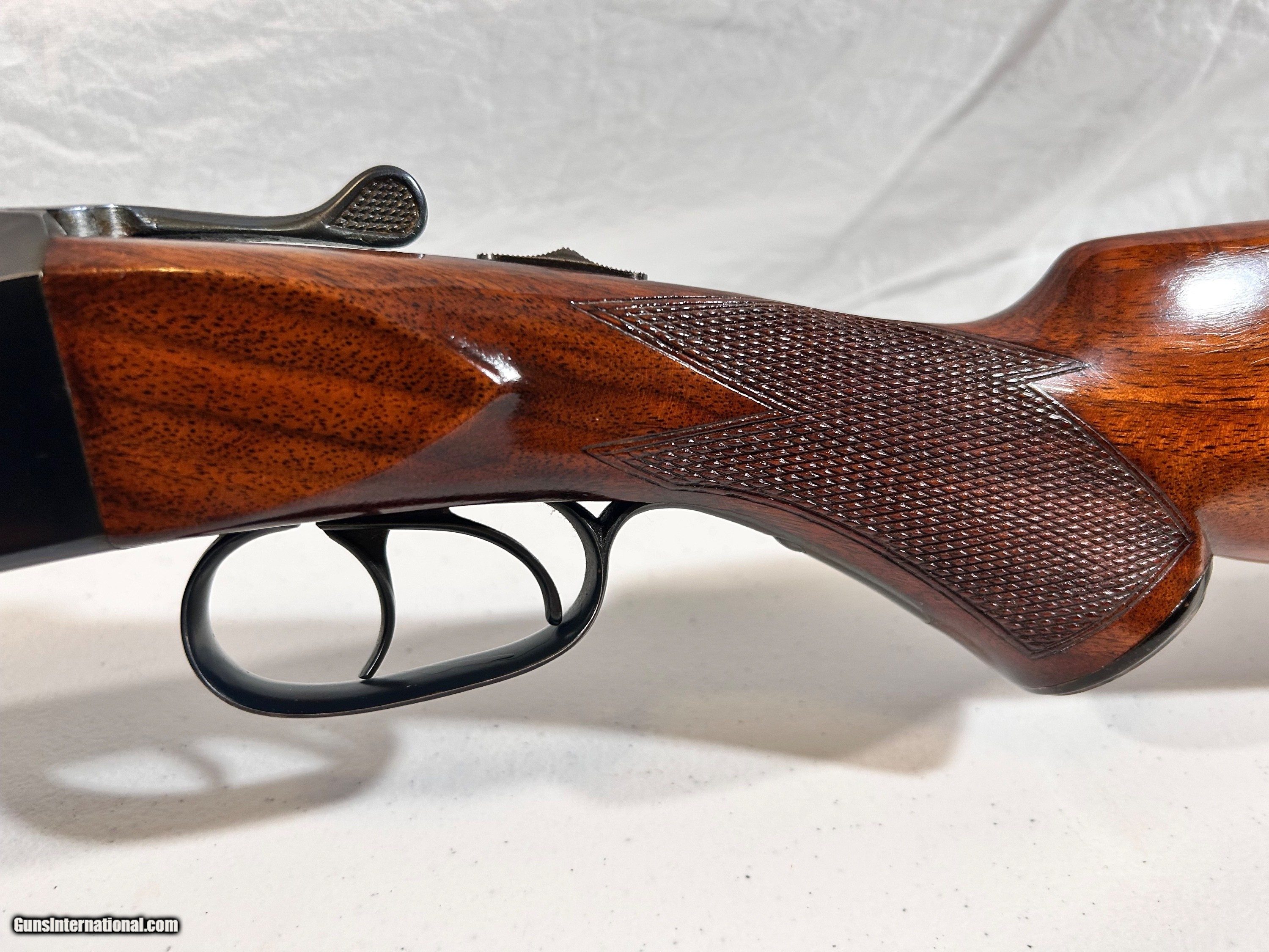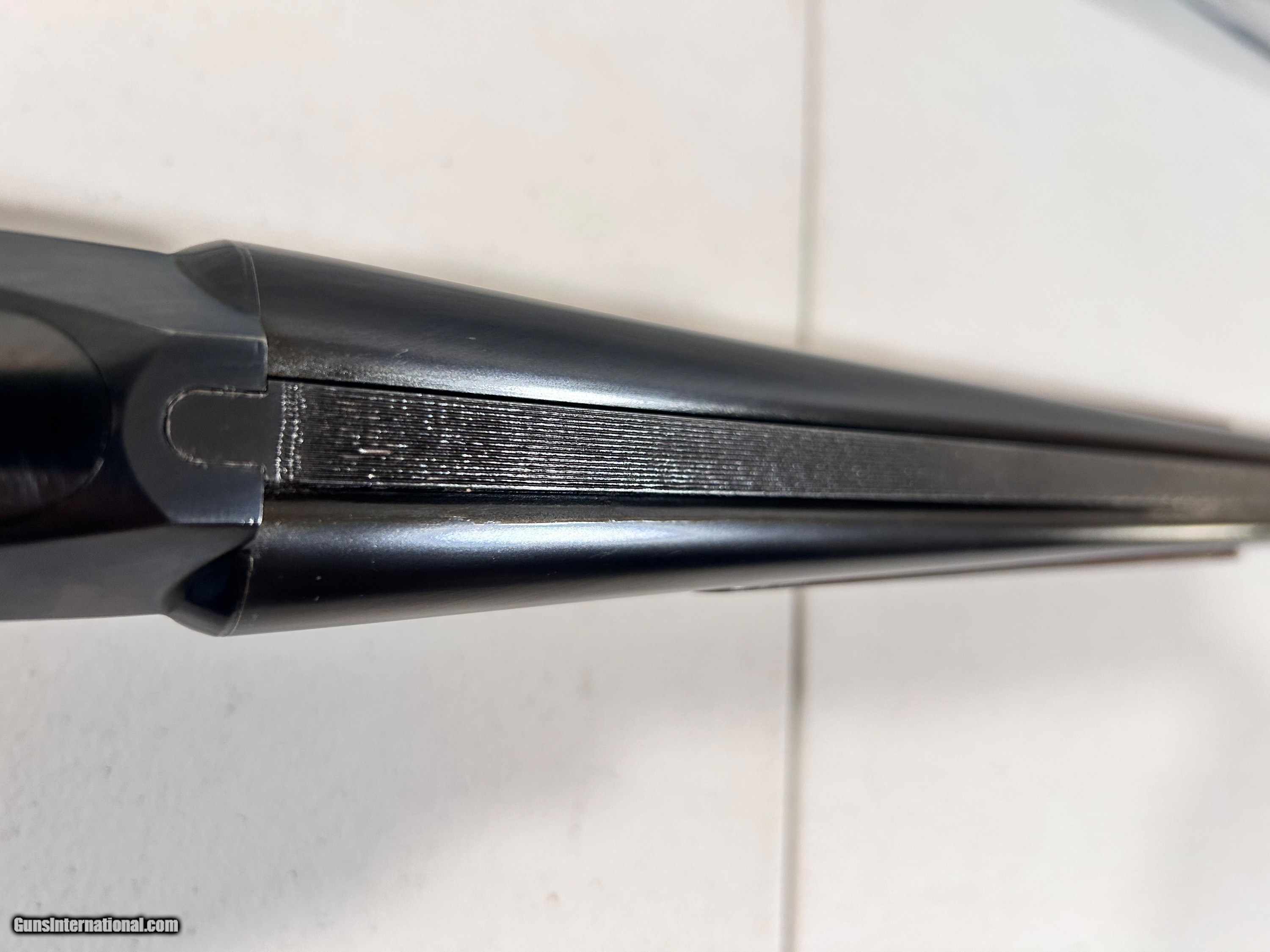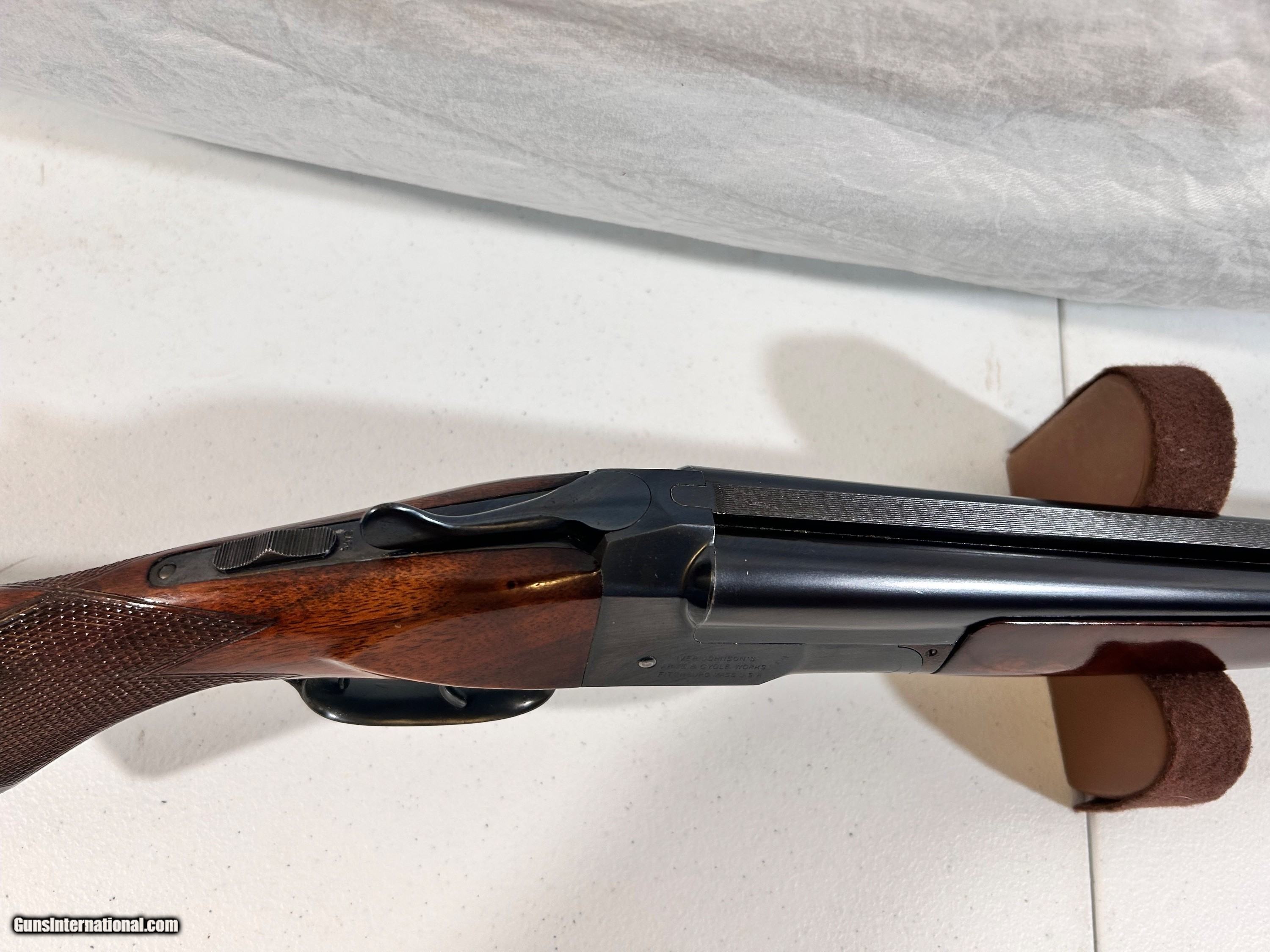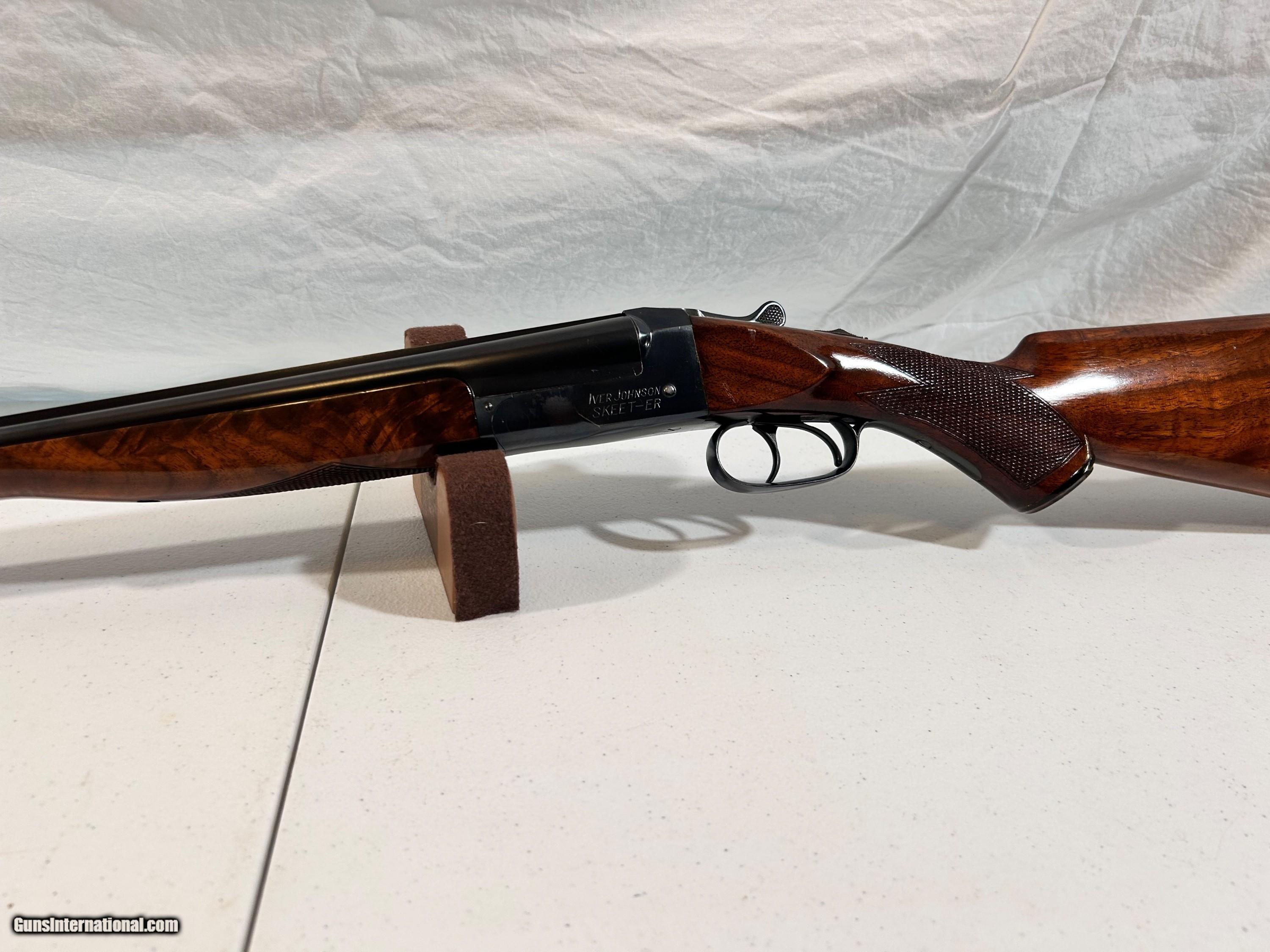Description: A Beautiful Skeeter which appears to seen little use retaining 98% original Blue. The checkered deluxe American walnut stock with splinter forend with very nice feathercrotch figure throughout remains in excellent condition with a small repair on the right side of the forearm. See photo #5. The 28in. Bbl is choked modified and full. 14in lop drops of 1 1/2in. and 2 1/2in. This is a very attractive little 410. Collector Quality. Please add 75$ S/H. Be sure to "click on see all of Fitzgerald's Fine Guns Curio/Relic: Yes Shotgun Gauge: .410 Gauge Manufacturer: Iver Johnson Model: Skeeter Serial Number: 25092 Barrel Length: 28in. Condition: Very Fine Metal Condition: Excellent Wood Condition: Very Nice Bore Condition: Excellent LOP: 14in. Rib: Solid rib Price: $4,750.00 Buy Now Contact Seller |