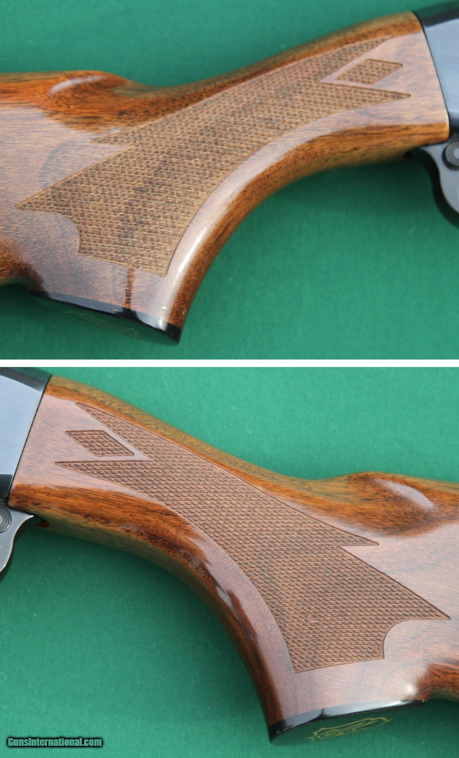 Description: Remington 870 Wingmaster, .410 bore pump shotgun with a satin finish on its American walnut stock and forend, a 25-inch, modified-choke barrel with a 3-inch chamber, high-polished blued barrel and receiver, and a ventilated rib with mid-barrel and muzzle beads. The length of pull is 14 inches. The drop at the comb is about 1¾ inches. The drop at the heel is 2¼ inches. Date of manufacture is May, 1999 (based on barrel code KT). Other accessories include the original cardboard box with styrofoam inserts and original documents package envelope with Instruction Book, The Safe Use and Care of Your New Firearm brochure, Remington Museum & Country Store brochure, Remington Shotshell Ammunition brochure, Firearm Warranty Registration card (not filled out, nor filed), Authorized Worldwide Repair Stations brochure, and yellow plastic Build To tag. The barrel is labeled on the left side with “.410 BORE 3” ONLY”. The barrel is labeled on the right side with “REMINGTON ARMS Co. ILION, NY”. The receiver is adorned on both side with hunting scenes. The left side features a field with a pointer on three quail taking flight; "Remington Model 870" is on a scroll beneath the hunting scene. The right side of the receiver features woods and a field with a woodcock in flight. Both scenes are set in the midst of a floral pattern. The condition of the gun is 99 percent. The finish on metal and walnut wood is all original. The barrel is 100 percent, with no marks or other blemishes of any type. There are a few marks on the magazine tube due to pumping action. The receiver and trigger guard are also 100 percent, with no marks or blemished. The forearm is excellent condition. There are two small dents (one about 1/8 inch and the other about ¼ inch) on the left side of the forend, about four inches from the rear of the forend. Neither have penetrated the finish. There is a 1/3 inch dent line just to the rear of the dents and at the top of the forend (near the barrel). It is also not through the finish. The right side and bottom of the forend are unblemished. There are no marks to the forearm checkering; it is deep, crisp, and unmarred. The checkering on the pistol grip is also deep, crisp, and unmarred. The stock is in excellent condition. The left side of the stock has five tiny dents that are hardly noticeable and one that is about 1/8 x 1/8 inch that appears to have penetrated the finish and very slightly into the wood. The right side has a couple bumps that are hardly noticeable. The top and belly of the stock are unblemished. The butt plate has a few scratches at the toe and a couple on the right side, about half way between the heal and toe. The butt plate bears the Remington crest. The photos are high resolution, so zoom to see details. Contact me for additional photos of any area you would like to see or see better. The buyer pays USPS Priority mail ($40) and insurance ($16.55). Insurance is calculated from the USPSsite - $10.35 for the first $600 of insurance, plus $1.55 for each additional $100 of insurance (rounded up) above the first $600 dollars. The fastest way to get this gun is to pay with a USPS (U.S. Postal Service) money orders, as they are like cash. I will ship the gun immediately upon receipt of a USPS money order and an FFL. I will also accept a personal check and other types of money orders, as well as bank checks and cashier's checks; however, I will hold the gun until it clears my bank; this includes bank checks and cashier’s checks. I do not accept credit cards, debit cards, or PayPal. Check or money order must be made out to Jerry Pownall. SOLD |