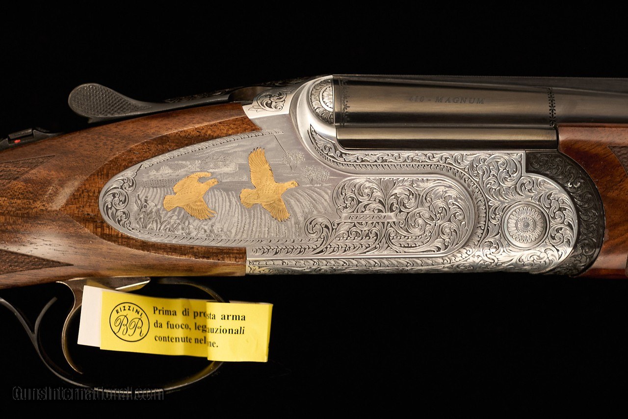 Brand new Rizzini Artemis Deluxe, .410 with 29” barrels and screw chokes, is the further upgraded version of the already quite nice Artemis. The coin-finished action with sideplates bear finer and more intricate full-coverage scroll engraving, by Bottega Geovanelli, framing a pair of golden gamebird motifs on each sideplate. The stock and forearm are made from gorgeously-figured Turkish walnut with rounded grip and semi-gloss oil finish over a checkered butt. Barrel selector for the single trigger is top-mounted on the safety in the usual Italian style.