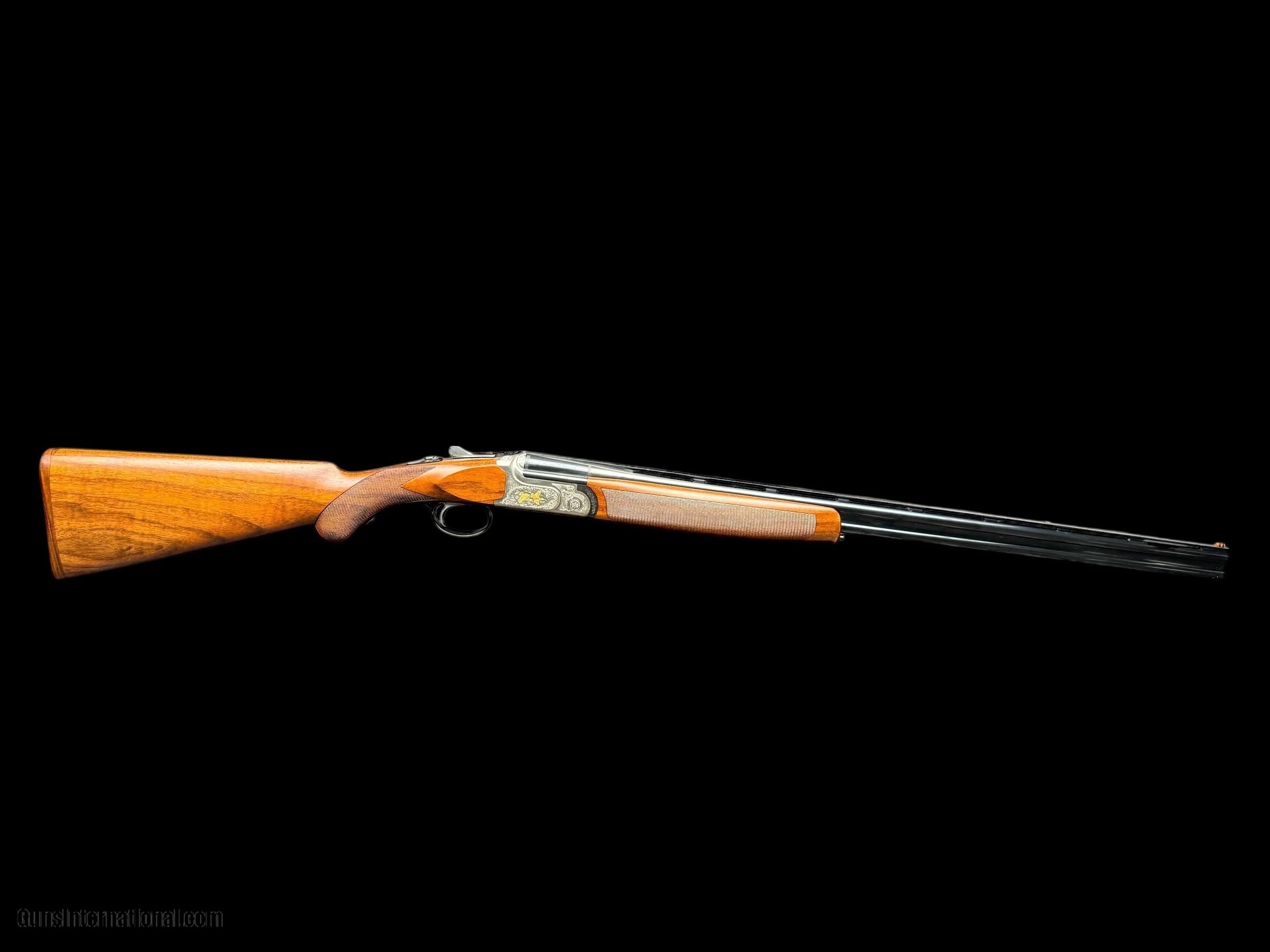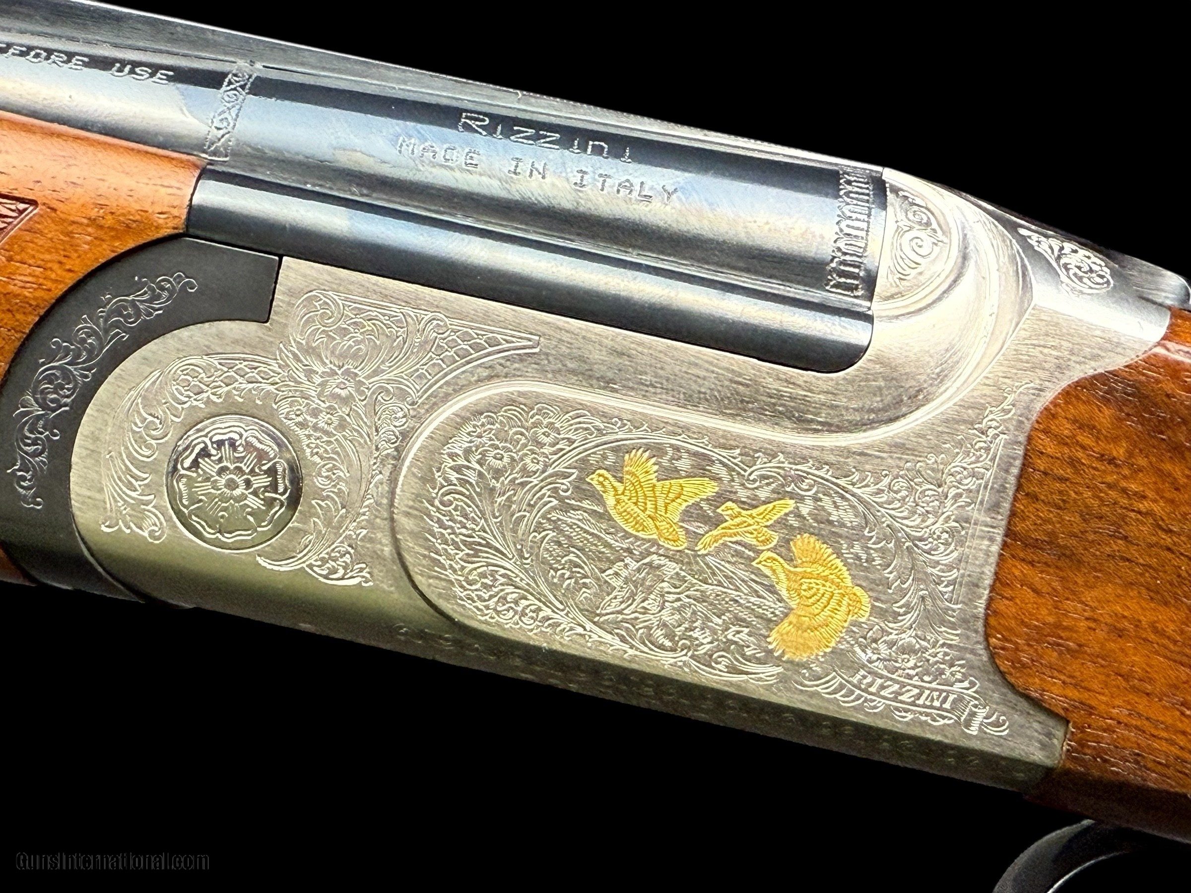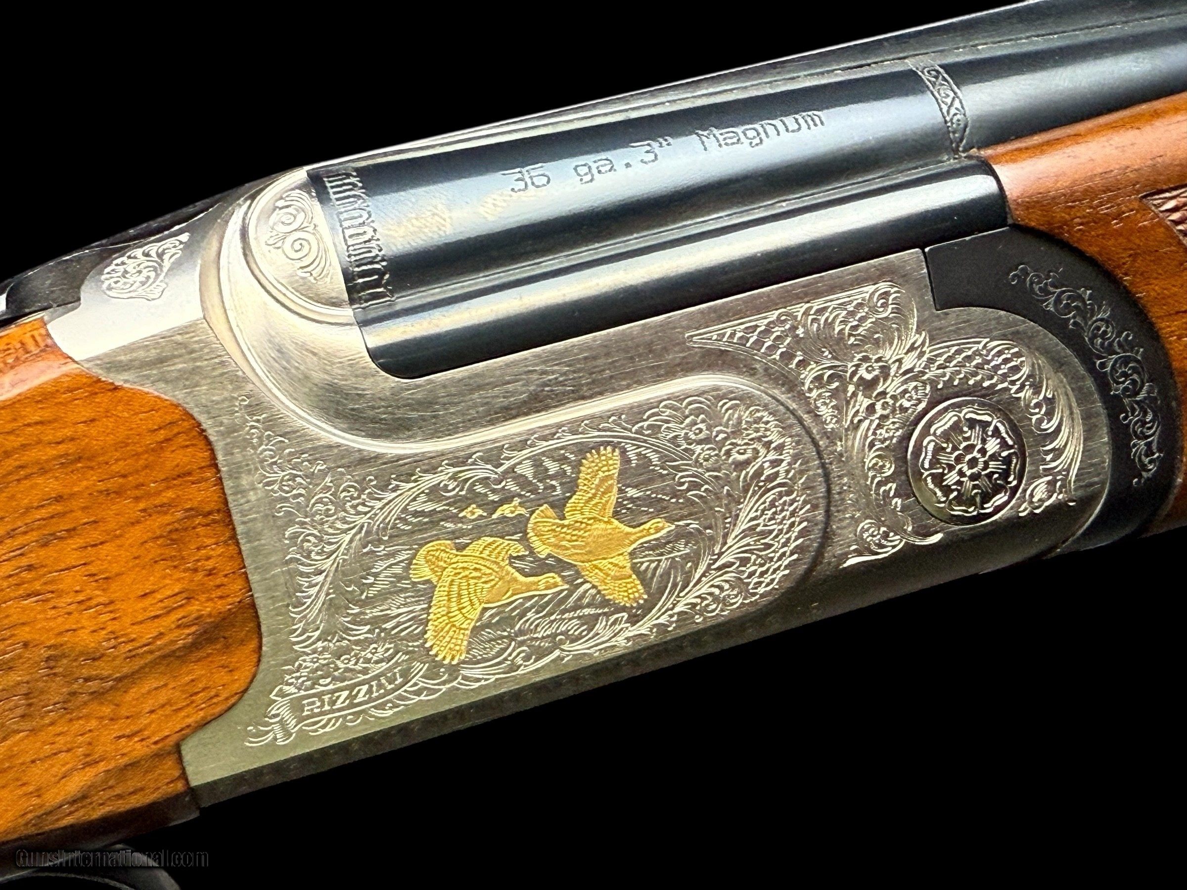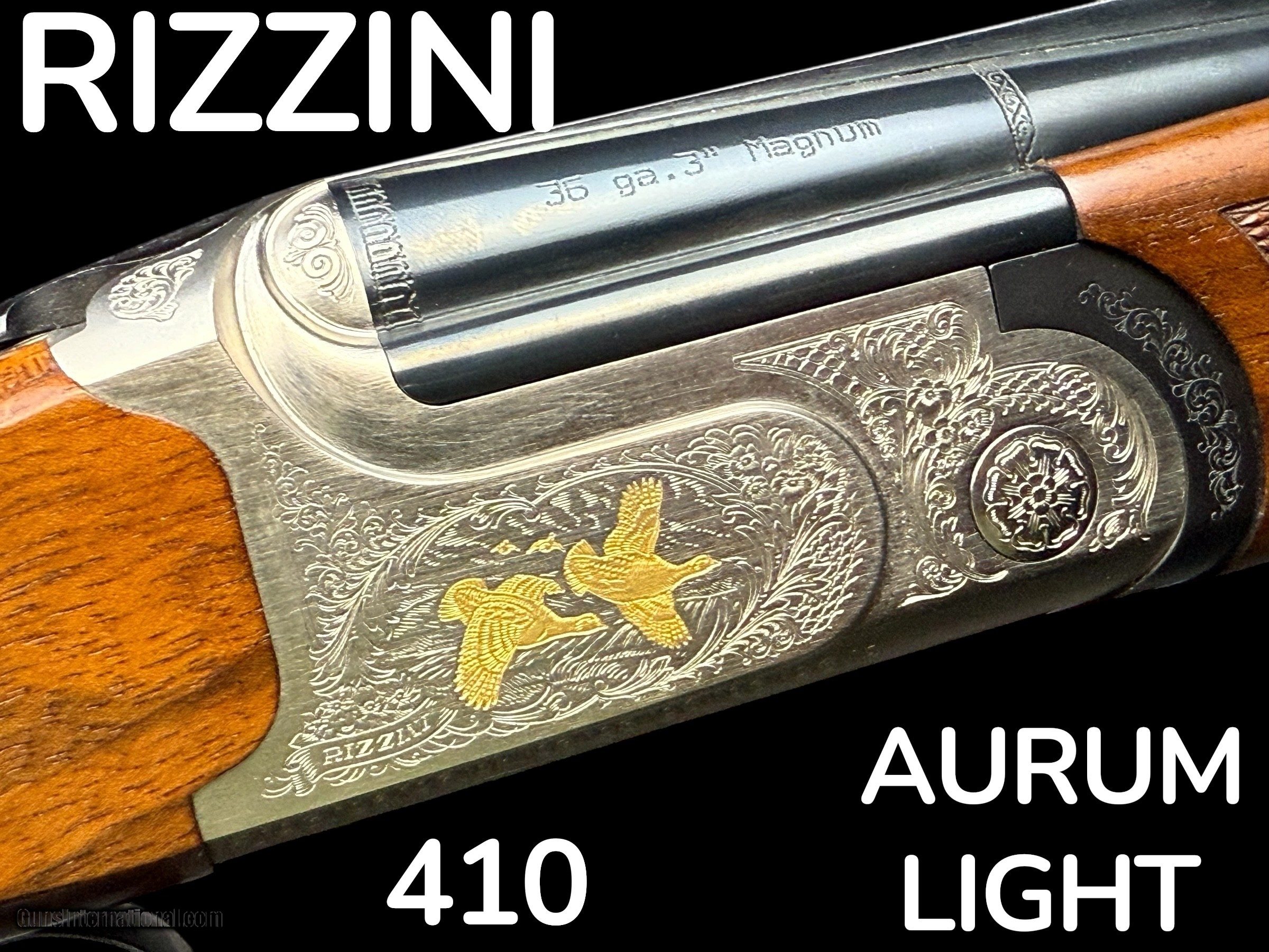Description: B. RIZZINI - ITALY - MODEL: AURUM LIGHT O/U GAME GUN - COIN FINISHED SCROLL AND GOLD GAME SCENE ENGRAVED - 410 - 3" CHAMBERS - 26.5" VENT RIB BARRELS - CHOKES: IC/MOD - EJECTORS - SINGLE SELECTIVE GOLD TRIGGER - NICELY FIGURED STRAIGHT GRAIN WALNUT SEMI-PISTIL GRIP STOCK W/ POINT PATTERN CHECKERING - WALNUT BUTTPLATE - DIMS: LOP: 14 5/8" | DAC: 1 1/2" | DAH: 2 1/4" - WEIGHT: 4LBS 13OZ CONDITION: GUN IS IN EXCELLENT, LIKE NEW CONDITION SHOWING LITTLE SIGNS OF USE - GENTLEMEN, THIS IS A BEAUTIFUL LIGHTWEIGHT GAME GUN. YOU WILL KIKE THIS GUN! PLEASE CALL NOW! FFL REQUIRED - FLAT $50 S/H/I CARD FEE APPLIES Shotgun Gauge: .410 Gauge Manufacturer: RIZZINI Model: AURUM LIGHT Serial Number: 47654 Barrel Length: 26.5 Chambers: 3" - 76MM Ejectors: YES Condition: MINT Metal Condition: MINT Wood Condition: MINT Bore Condition: MINT Action: BOXLOCK EJECTOR Triggers: SINGLE SELECTIVE Price: $2,950.00 Contact Seller |