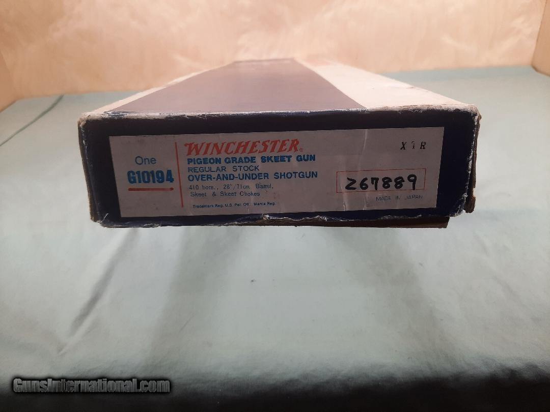 Description: This listing is for an absolutely Beautiful Model 101 Winchester Pigeon Grade Skeet 410 gauge Shotgun. The original box numbered to the shotgun and paperwork are included in the listing. The Shotgun is in as new in the box condition. All of the blocking is inside the box to hold the barrel set and buttstock properly. The serial number is included on the box end picture and is 267889. Shipping will be calculated according to the buyers location. NO CALIFORNIA SALES SOLD PENDING FUNDS 8/9/22 SOLD |