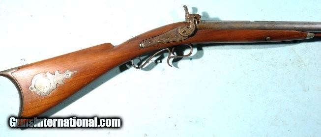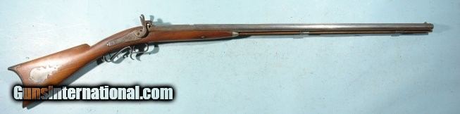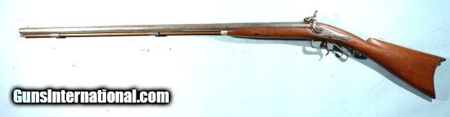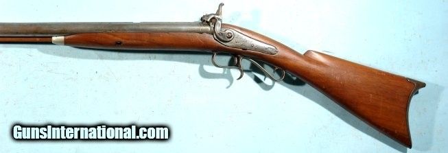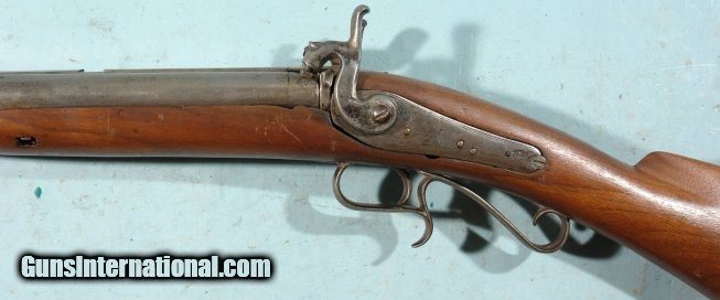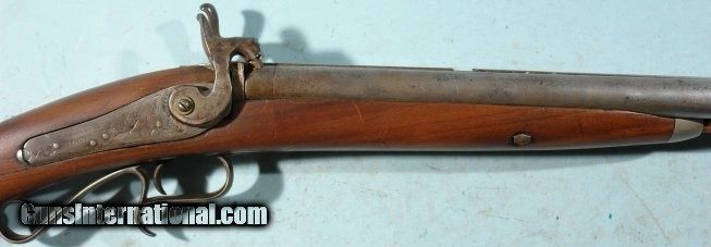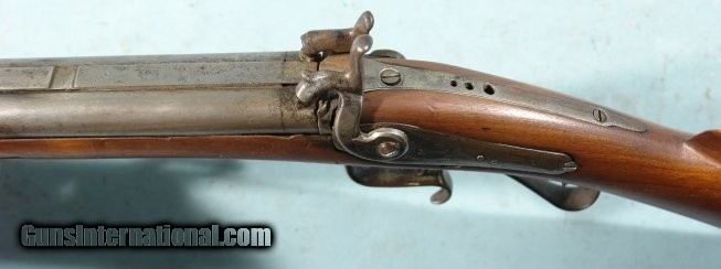 Description: NEW YORK CITY PERCUSSION SIDE BY SIDE COMBINATION RIFLE/SHOTGUN SIGNED MOORE CIRCA 1850’S. 49” o/a with 33” barrels. Right barrel .40 caliber rifled. Left barrel .20 gauge smoothbore. Tang sight and rear barrel sight missing and replace brass blade front.Both lock plates signed “MOORE”. Walnut stock with iron mounts and patch box. Good overall with worn metal and refinished wood. Right hammer broken and repaired. Locks not holding on cock and bores lightly pitted. Probably William Moore of Rochester. SOLD Antique: Yes |