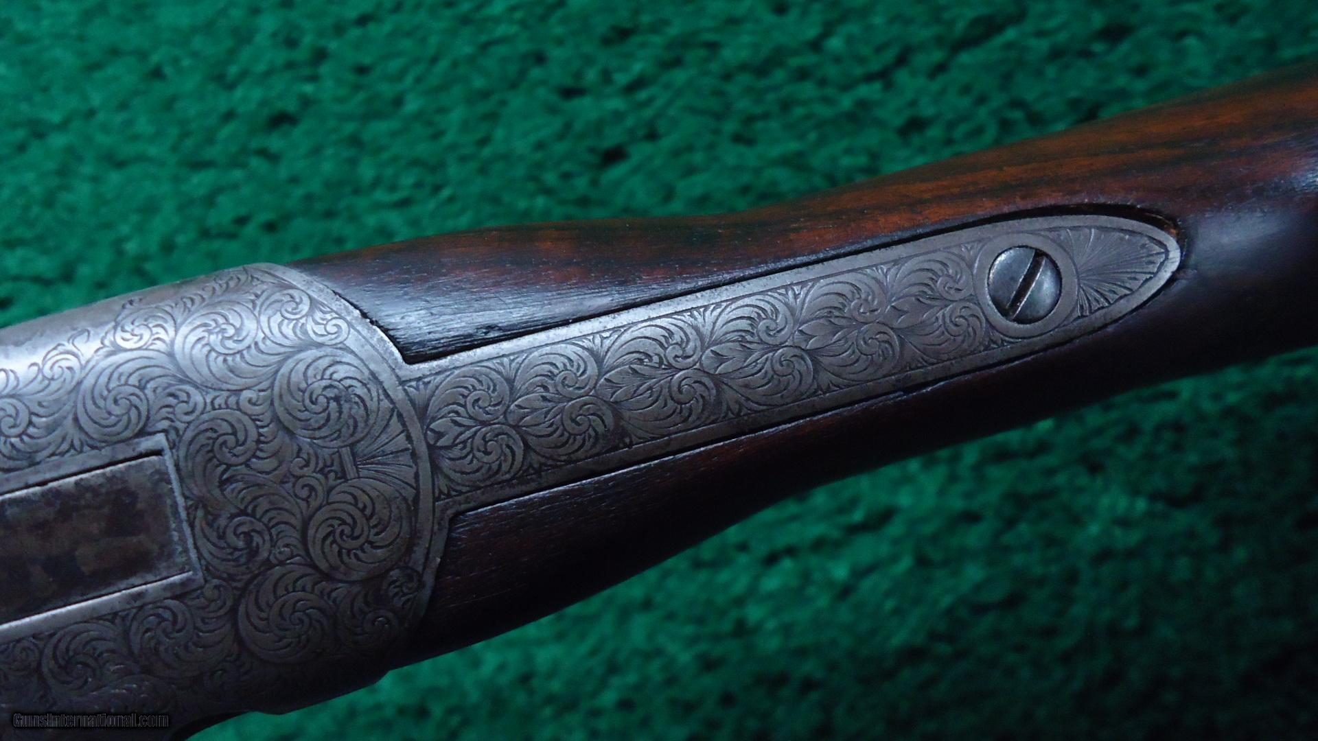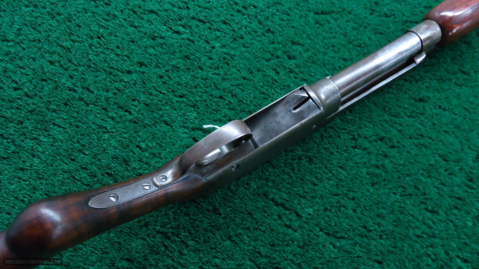 Description: 12 gauge. 28" Damascus bbl with bead front sight and good markings. Bbl is mostly a brown color with a light Damascus pattern still visible. Frame and action bars are covered in a tight scroll engraving with small panel hunting scenes on each side of bars as well scenes at the rear frame border. Trigger guard also has an engraving of two ducks in flight with a hunter in a boat. Pistol grip buttstock has been refinished and has a repair on the left side at the wrist. Overall wood condition is good. Checkered forend has had some sort of thick brown finish applied. Deluxe engraved Spencer shotguns are seldom encountered. Leroy Merz Antique Firearms specializes in antique and vintage Winchesters and other fine American firearms. Since 1965 Mr. Merz has taken part in the world of firearms and has been a contributor to many well known reference books. Just recently we mailed the 127th edition of our privately-published catalog. We have hundreds of additional guns in every price range at our home online. Search for Merz Antiques in google. SOLD Antique: Yes |