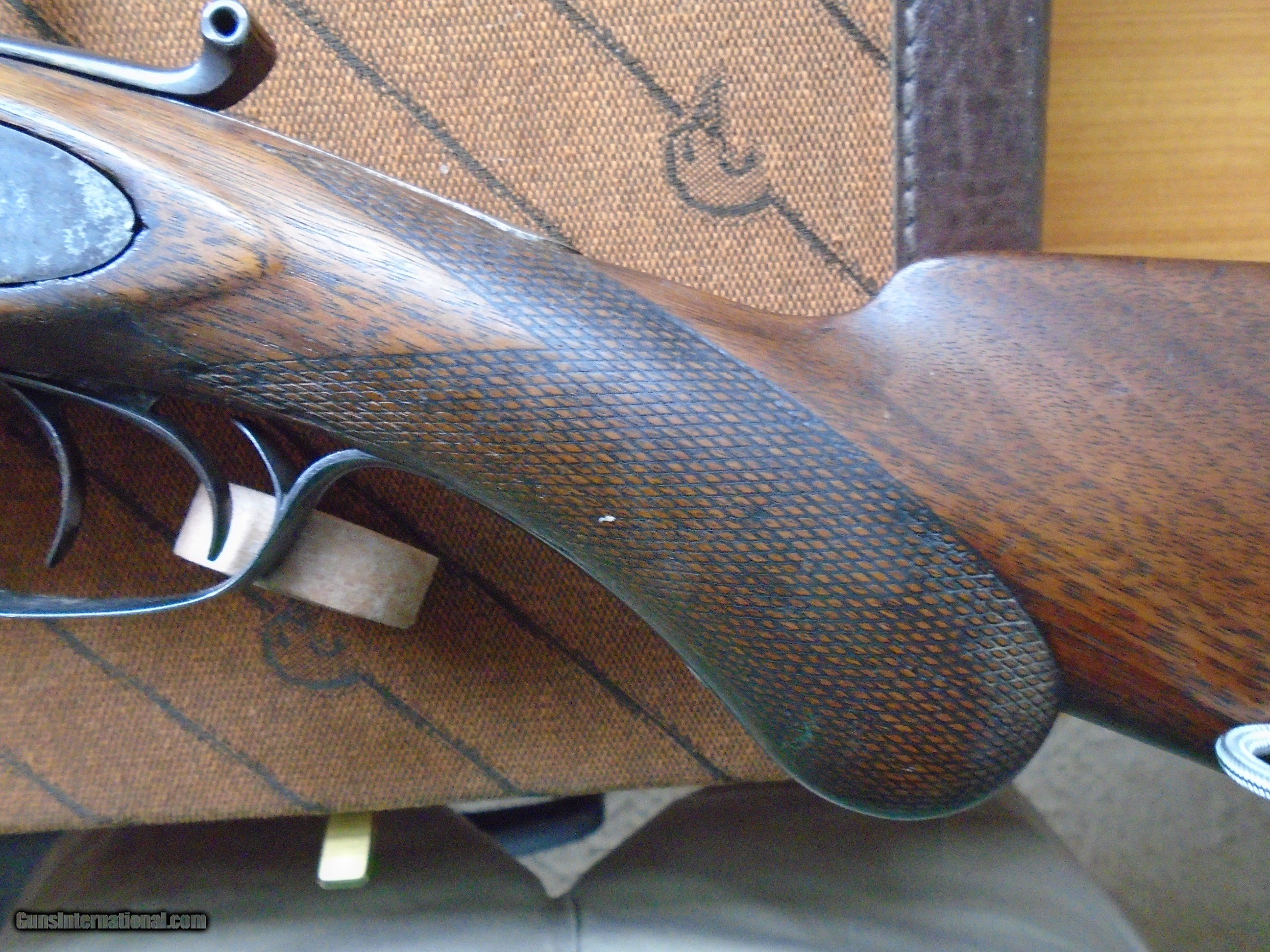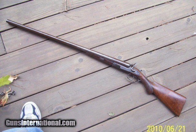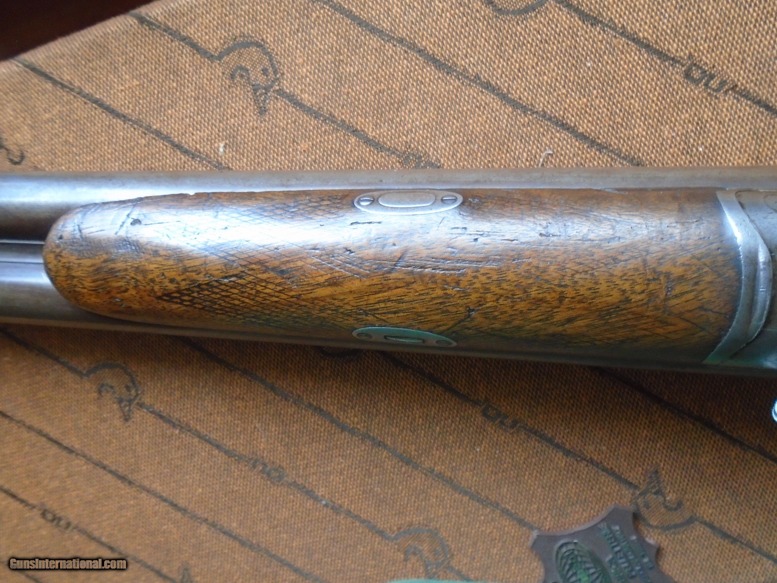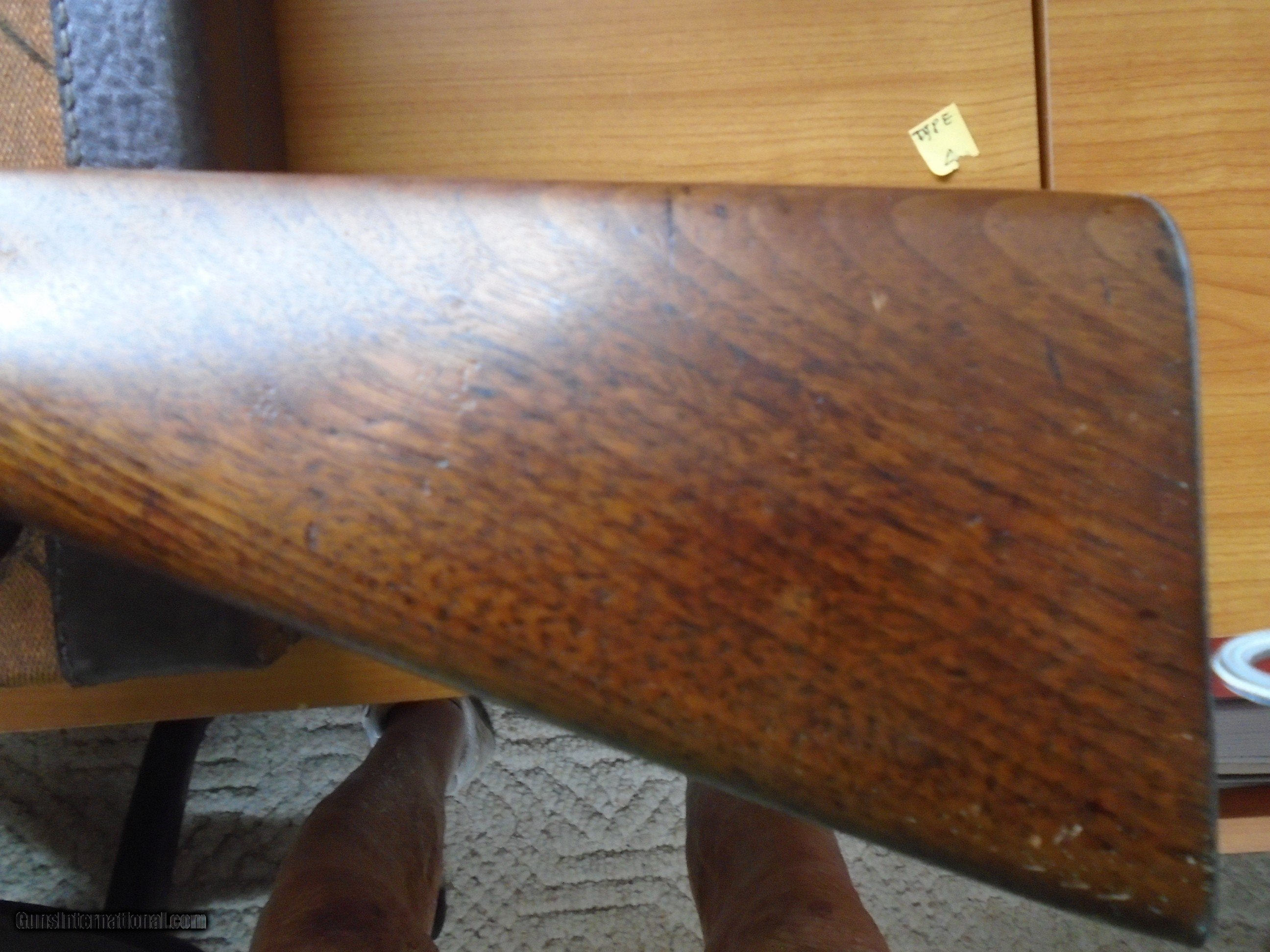 Description: Remington Lifter Action Model 1876 Grade 1. Serial No. 5046.: Marked on the top rib “E. Remington & Sons, Ilion, N.Y.” 12 gauge, 2 3/4" chambers, 30" fluid steel barresls, chokes full and full. There are no dents in the barrels and the bores are lightly pitted but still quite shootable. About 0.005" would clean them up. Since it was made in 1877 it is an antique and requires no FFL for transfer. This is actually a transition gun form model 1876 to 1878. The serial number is in the M ’76 range with all that model’s standard characteristics (lifter action, pinned forend, Hepburn’s 1875 patent locks, flat hammer faces, and non-sliding top plate on the action between the balls). However, like on the Model 1878 there are no vestigial flash shields. It is a 12 gauge with 30” full choke bored barrels. The gun is mechanically excellent and cosmetically an even patina with no rust. Bores are lightly pitted. You can get them cleaned up to like new at Skeet's gun shop (918-456-4749) foir about $250. I have reduced the price accordingly.The stock has the original steel butt plate, has been cleaned, and a minor professional repair made to the head. Checkering is worn but clear. This is a difficult model to find and would make a fine addition to your collection of early American Shotguns and it is ready to shoot. SOLD Antique: Yes Manufacturer: Remington Arms Co. Model: 1876 Serial Number: 5046 Barrel Length: 30 Chambers: 2 3/4 Ejectors: none Condition: Very good Metal Condition: good Wood Condition: good Bore Condition: Lightly pitted Action: sidelock outside hammers Triggers: double Stock: walnut Stock Comb: 2 1/4 Stock Heel: 3 Butt Pad: Steel Butt Plate LOP: 13 7/8 Weight: ca. 8 lbs Manufacture Date: 1877 Choke Left: Full Choke Right: Full Item Location: CA Proof:Black: yes |